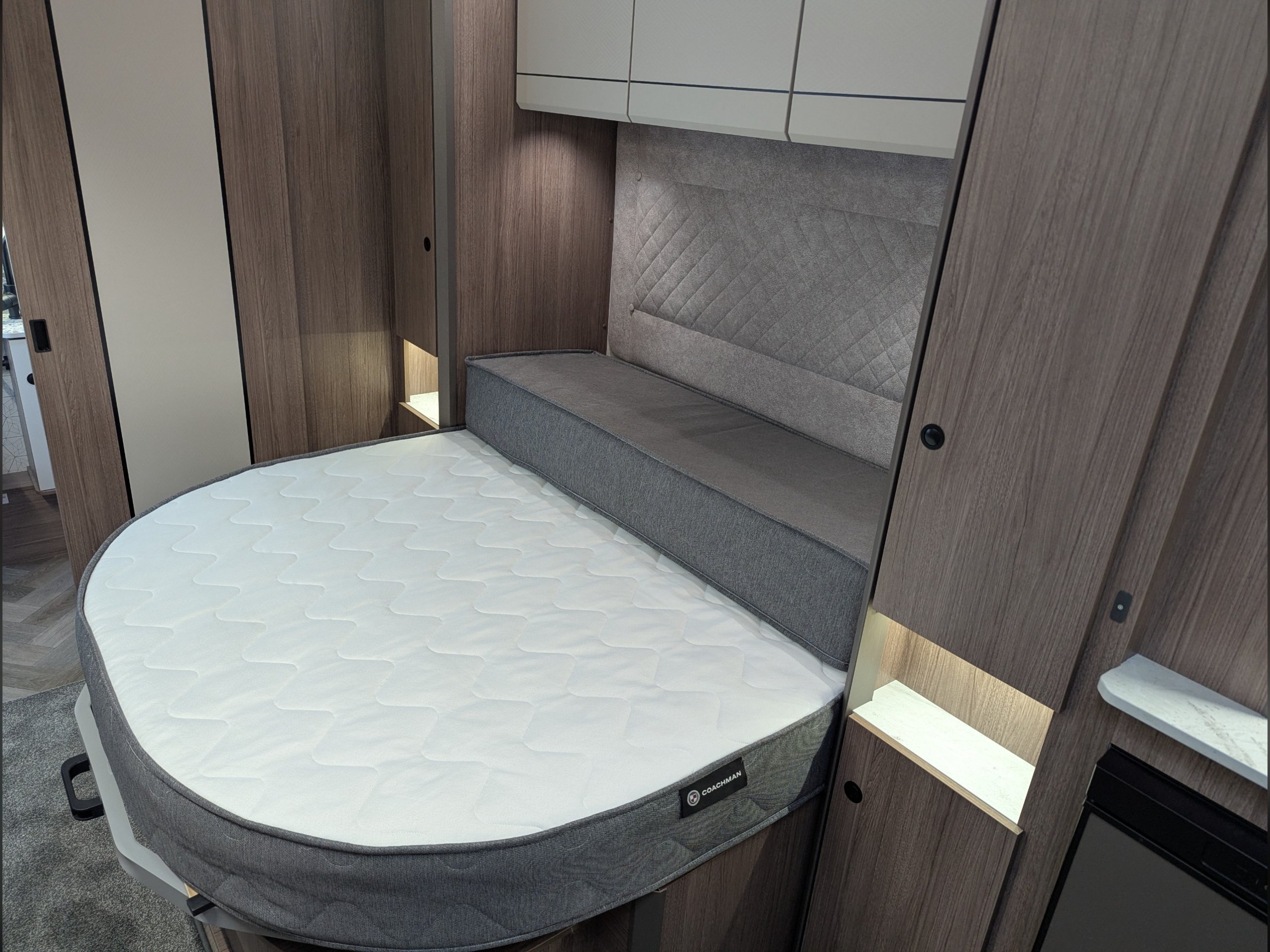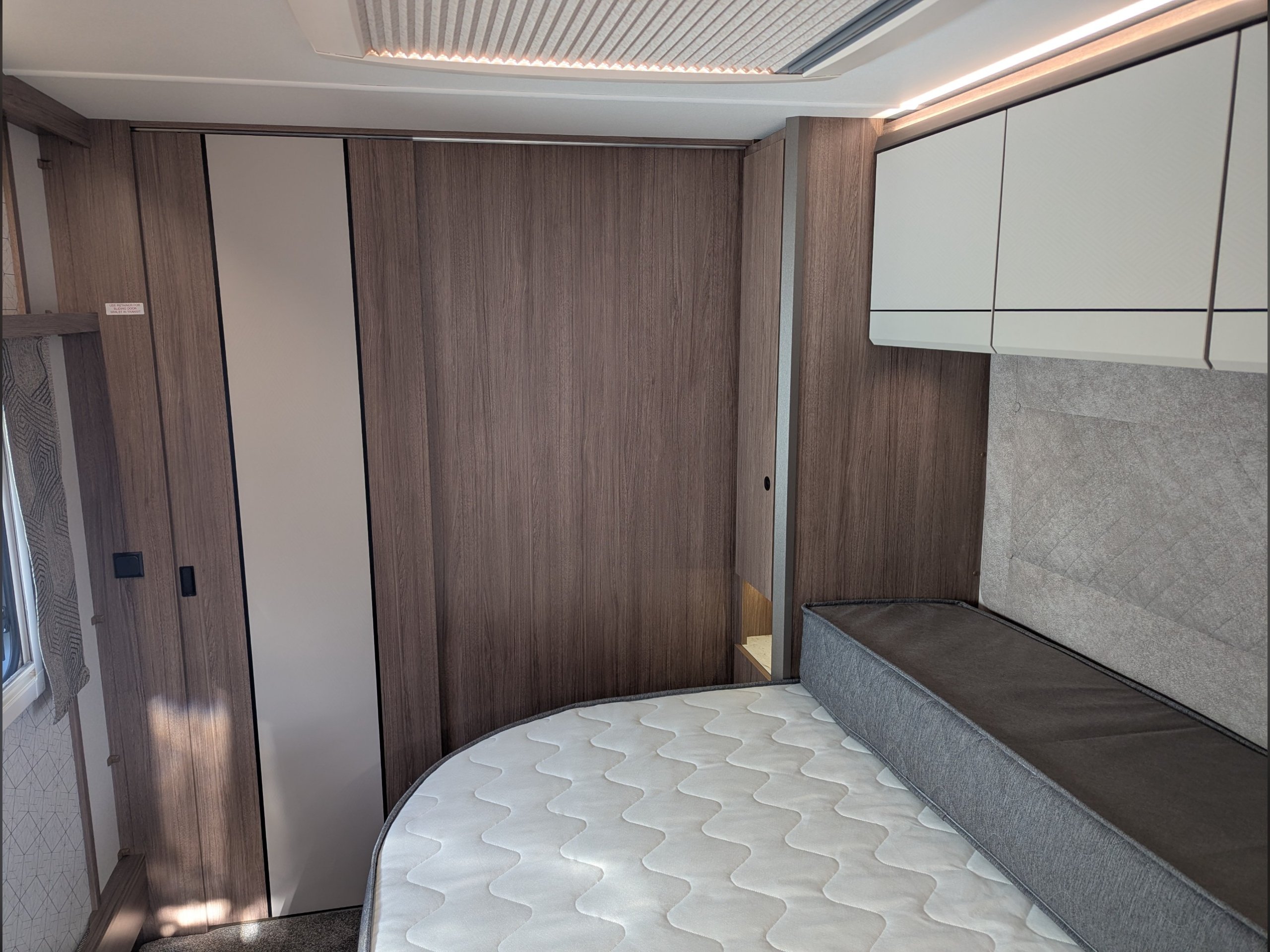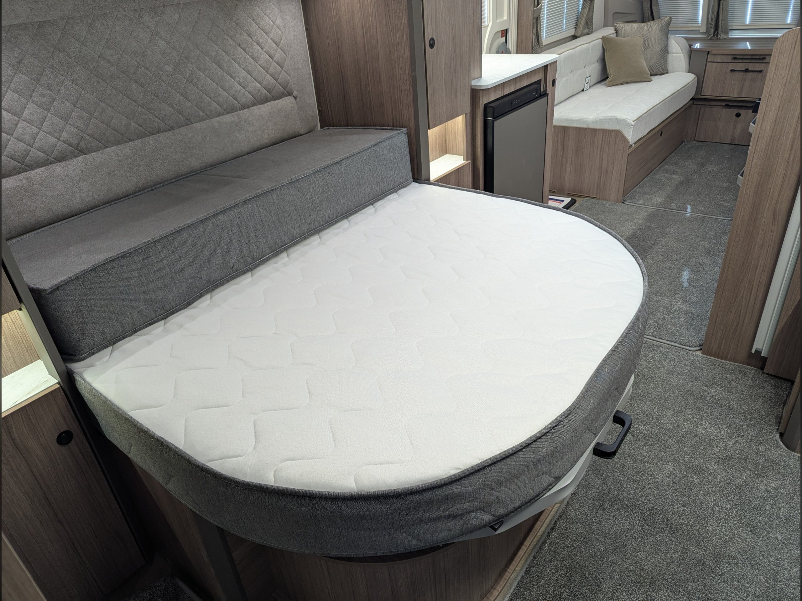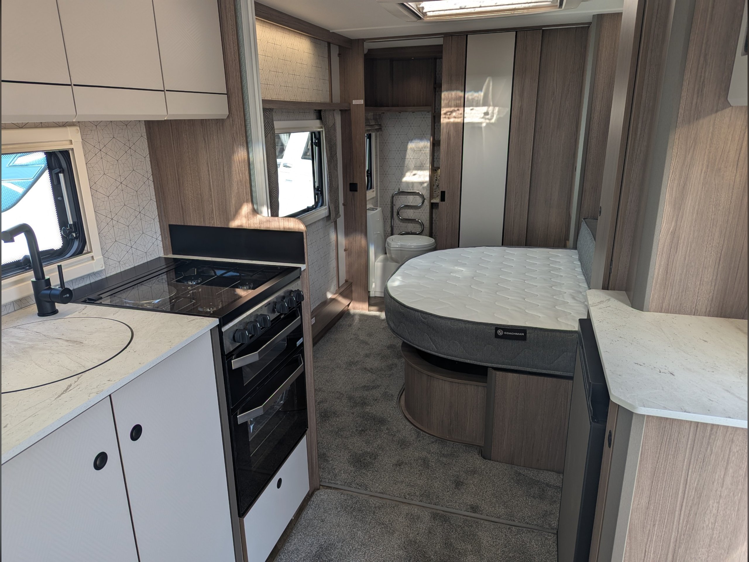4 berth, single axle, transverse island bed layout with rear washroom.