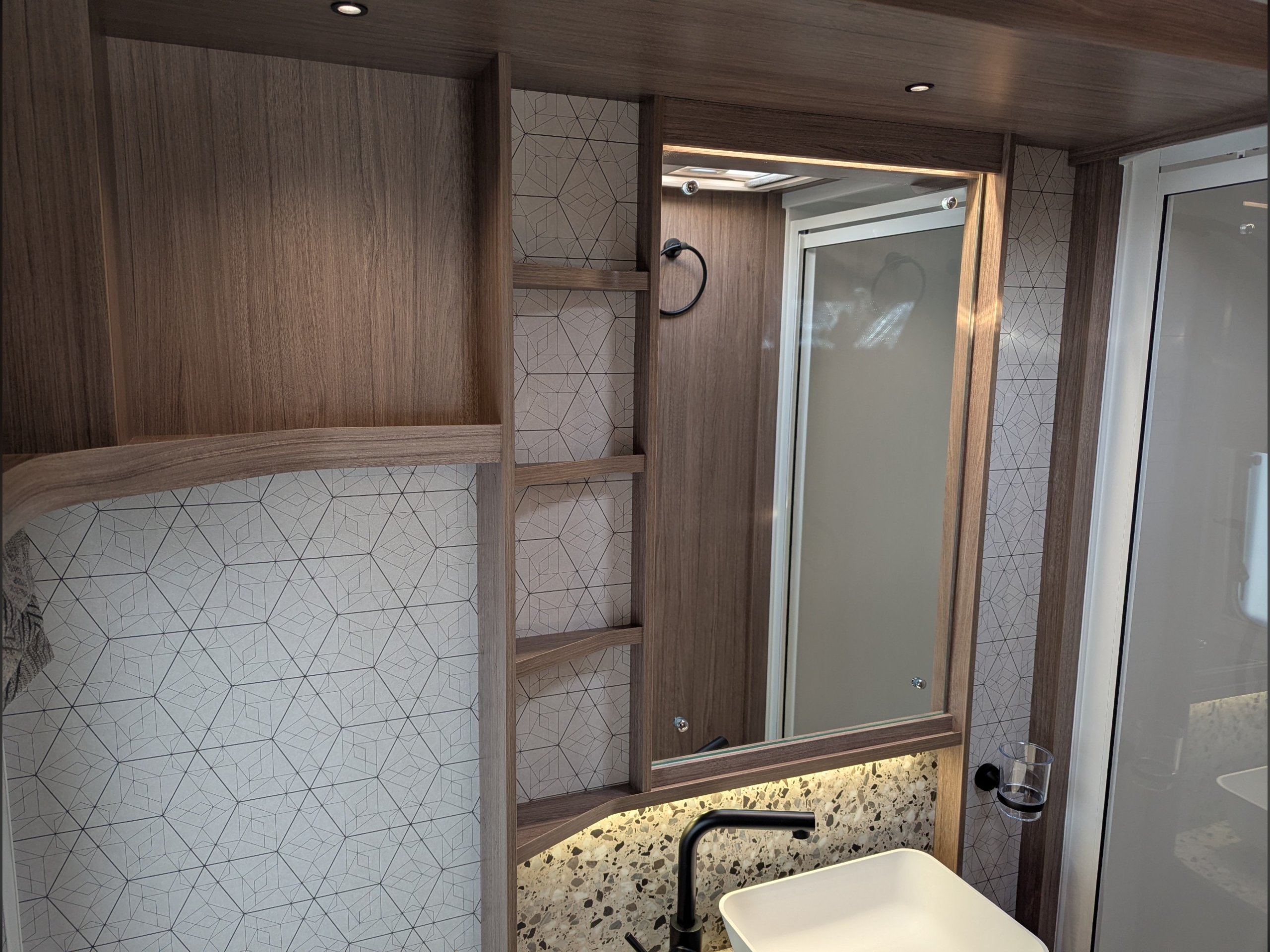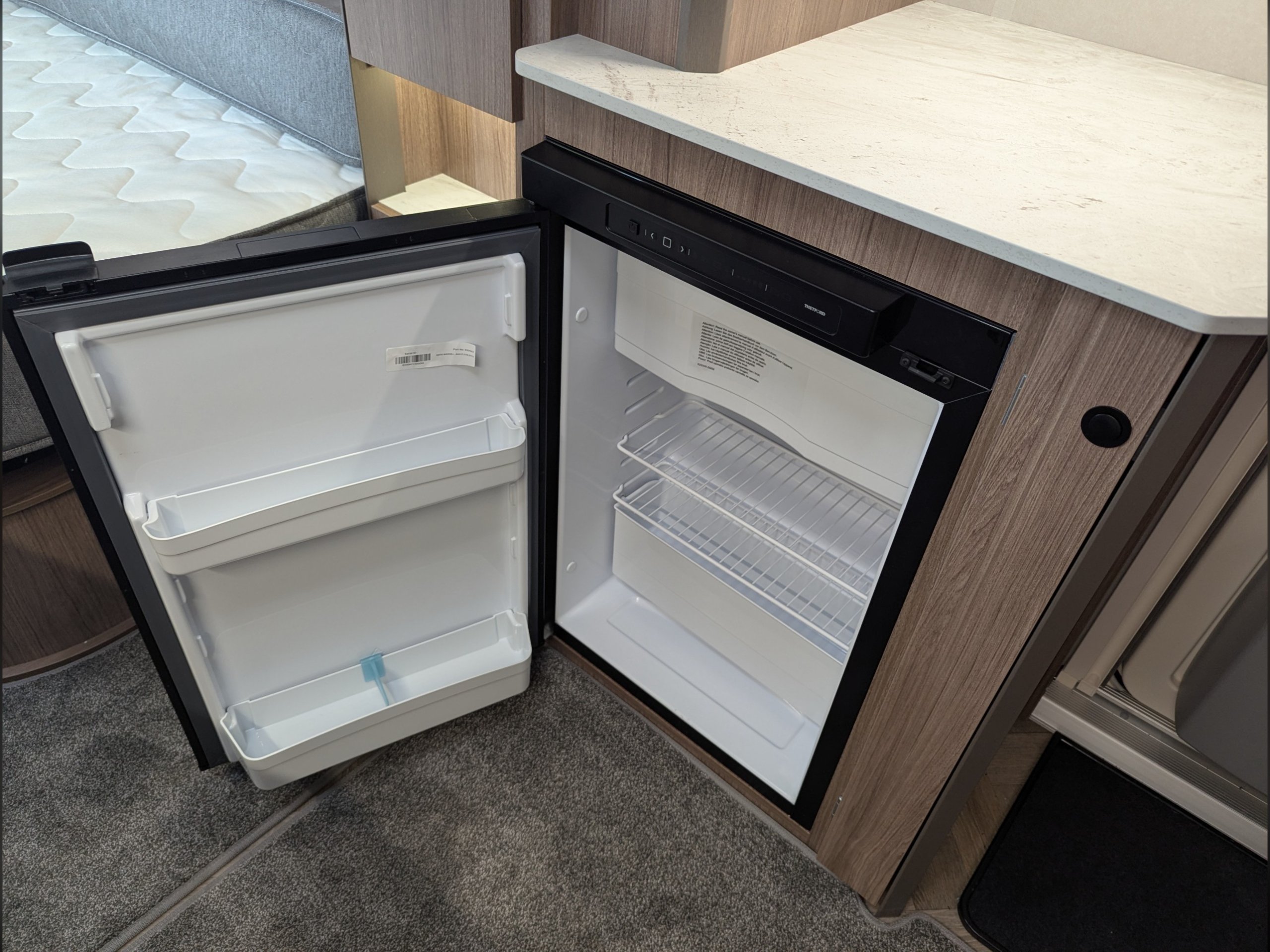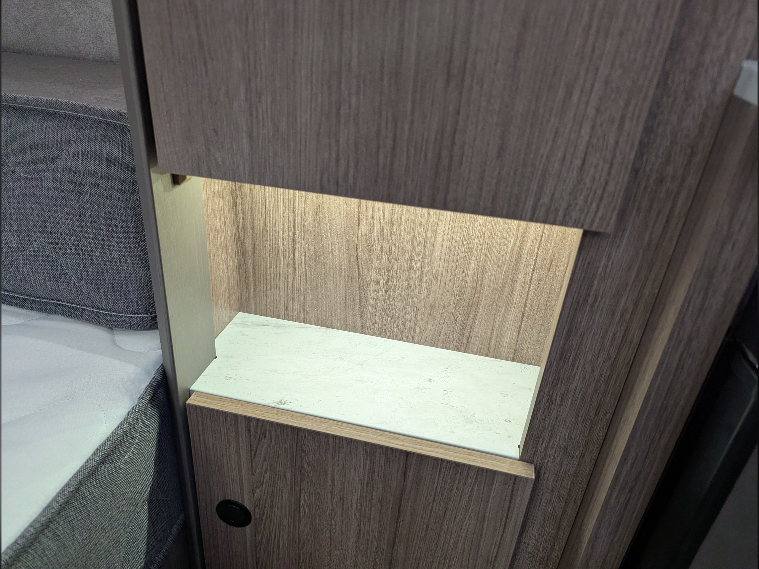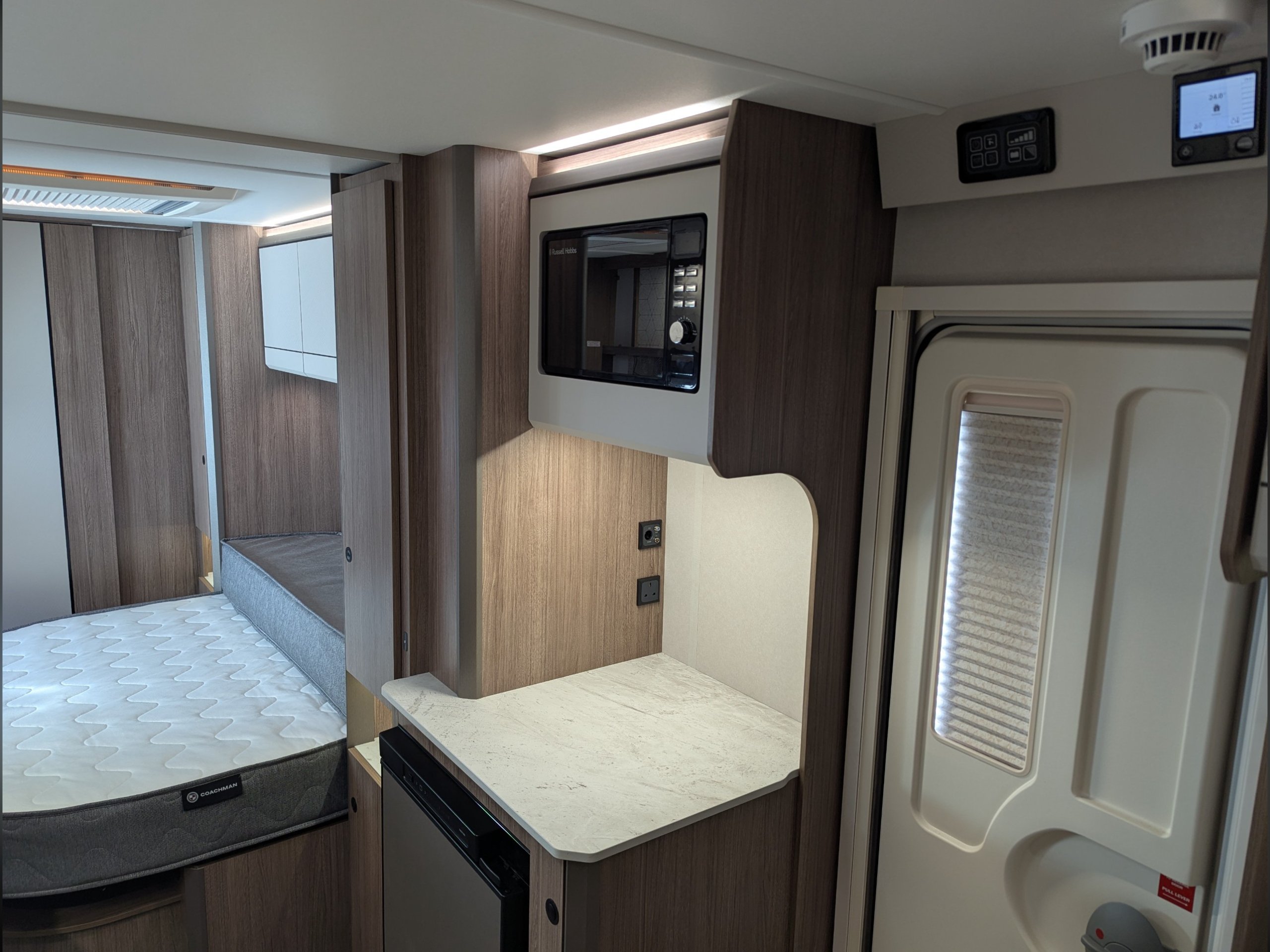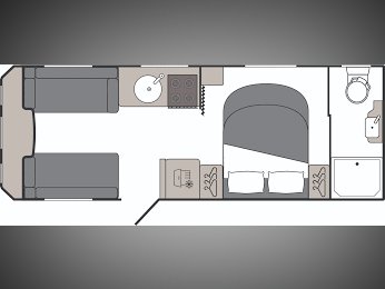 4 berth, single axle, transverse island bed layout with rear washroom.