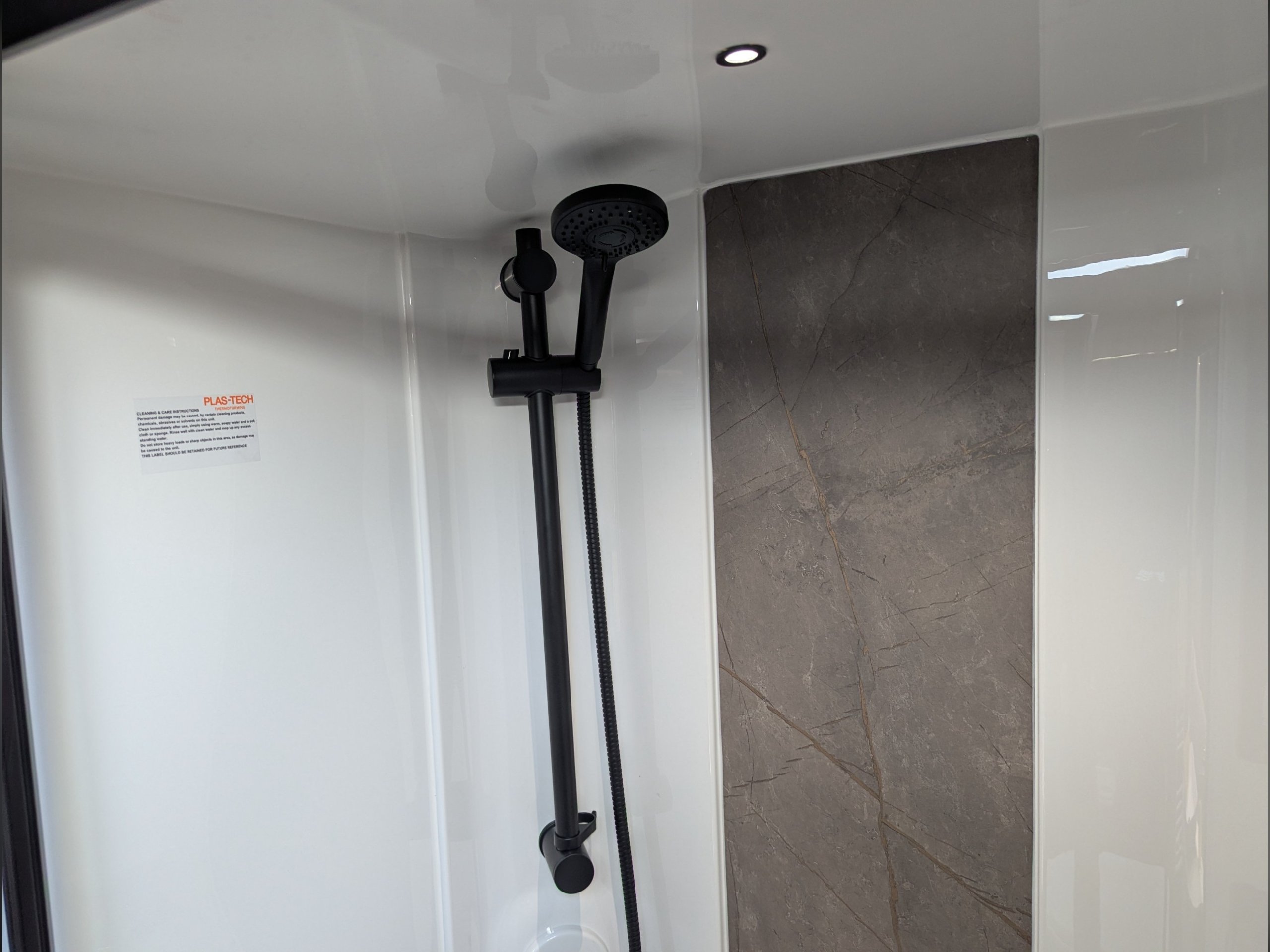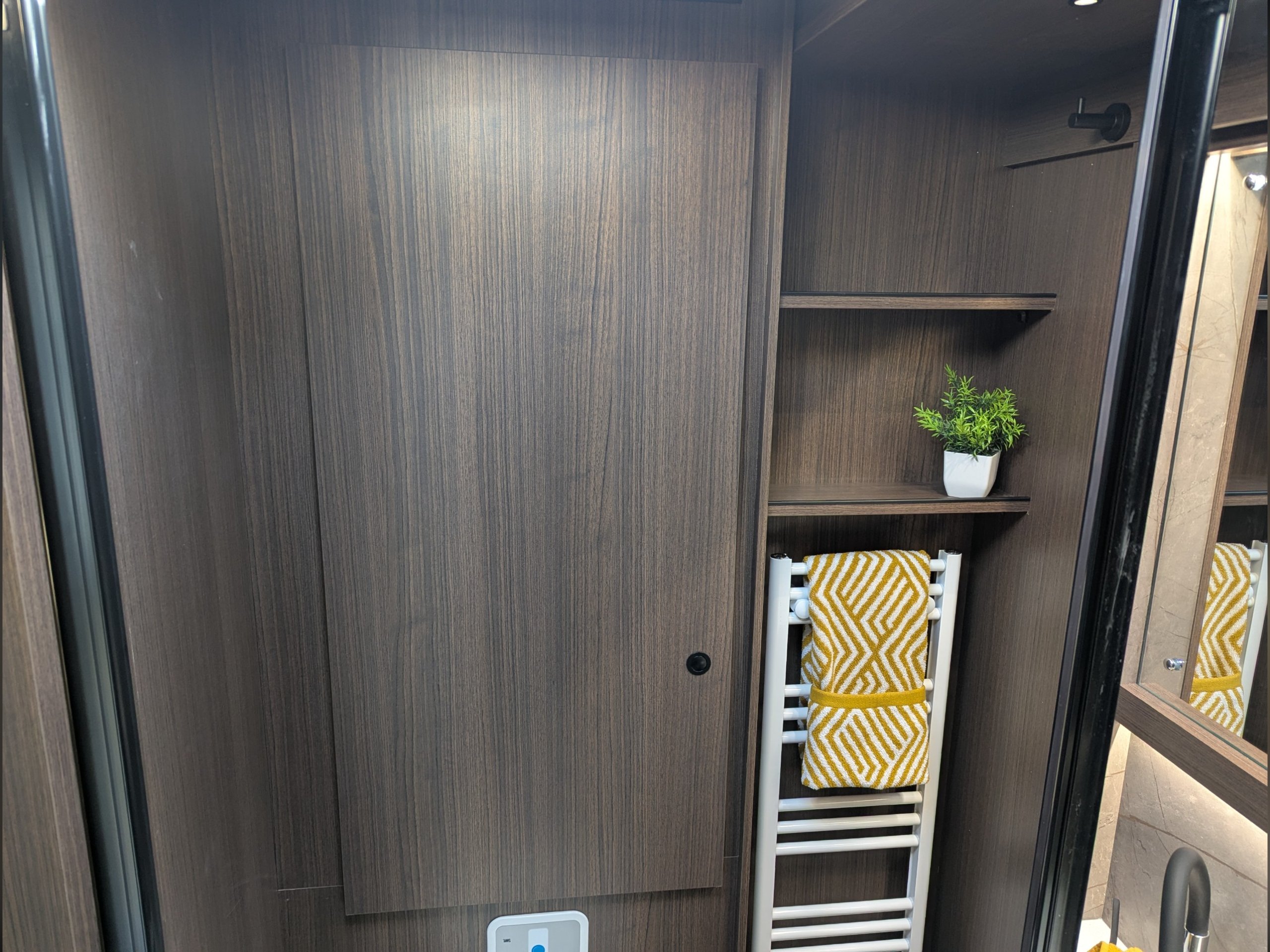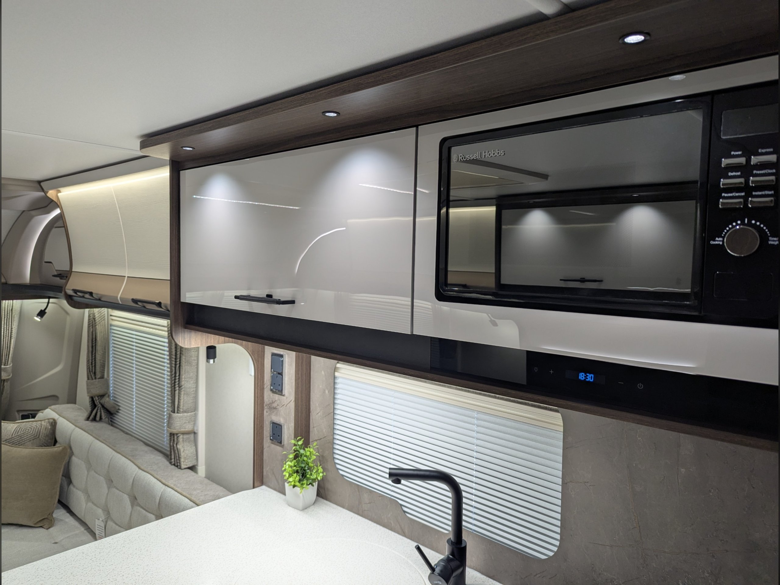 It features an Alde wet central heating system, matt black handles and fittings, a dedicated TV area in the lounge, a central kitchen with premium appliances, a luxurious end washroom with a square shower cubicle, and a Bluetooth speaker system
