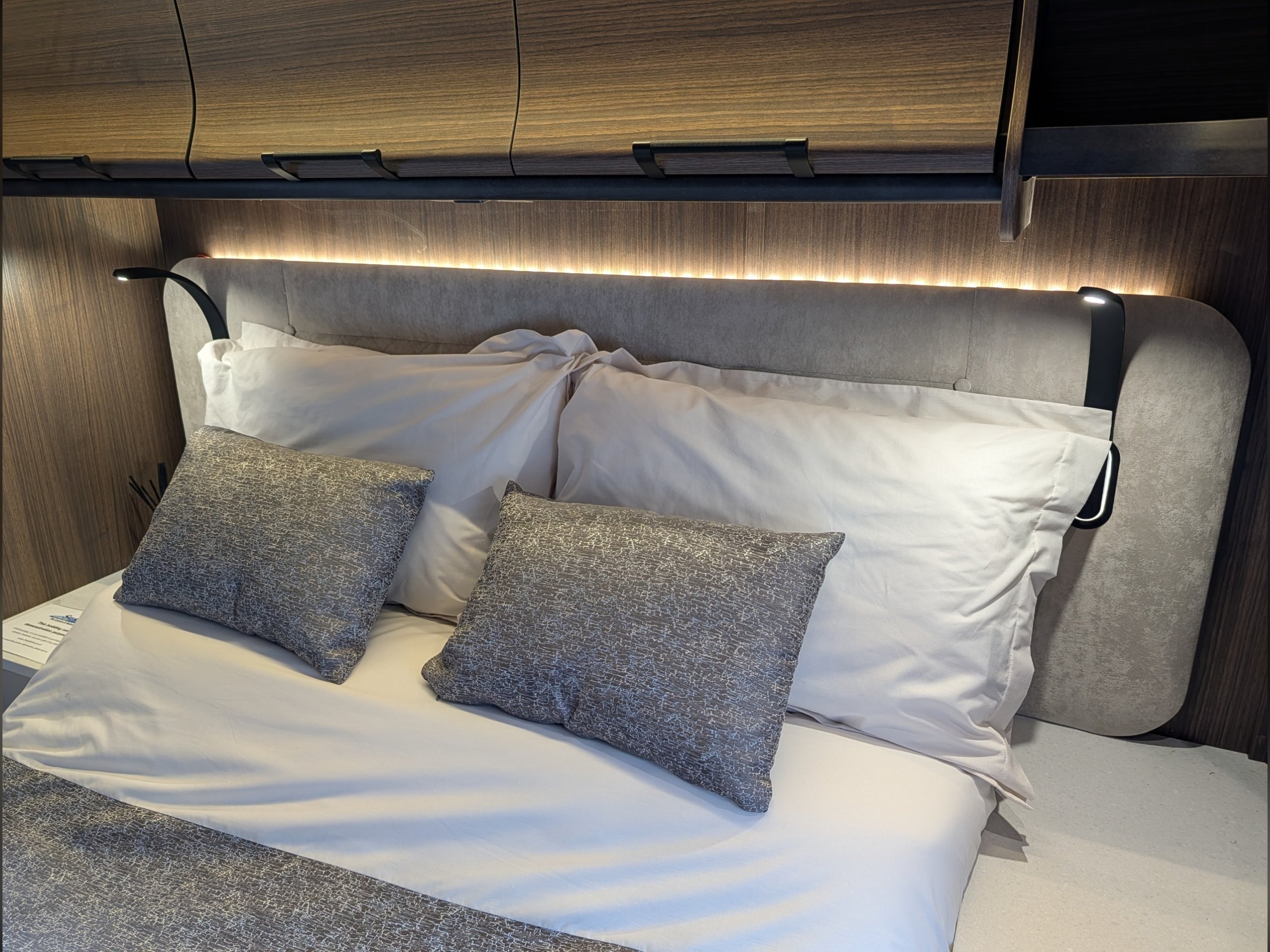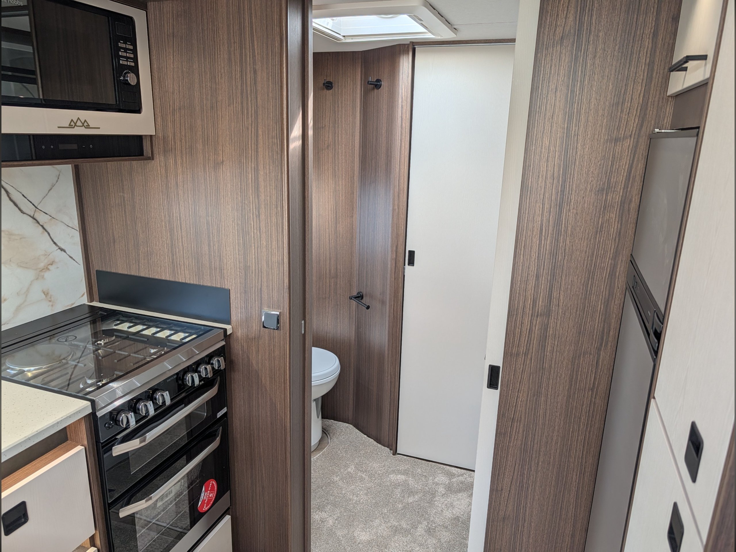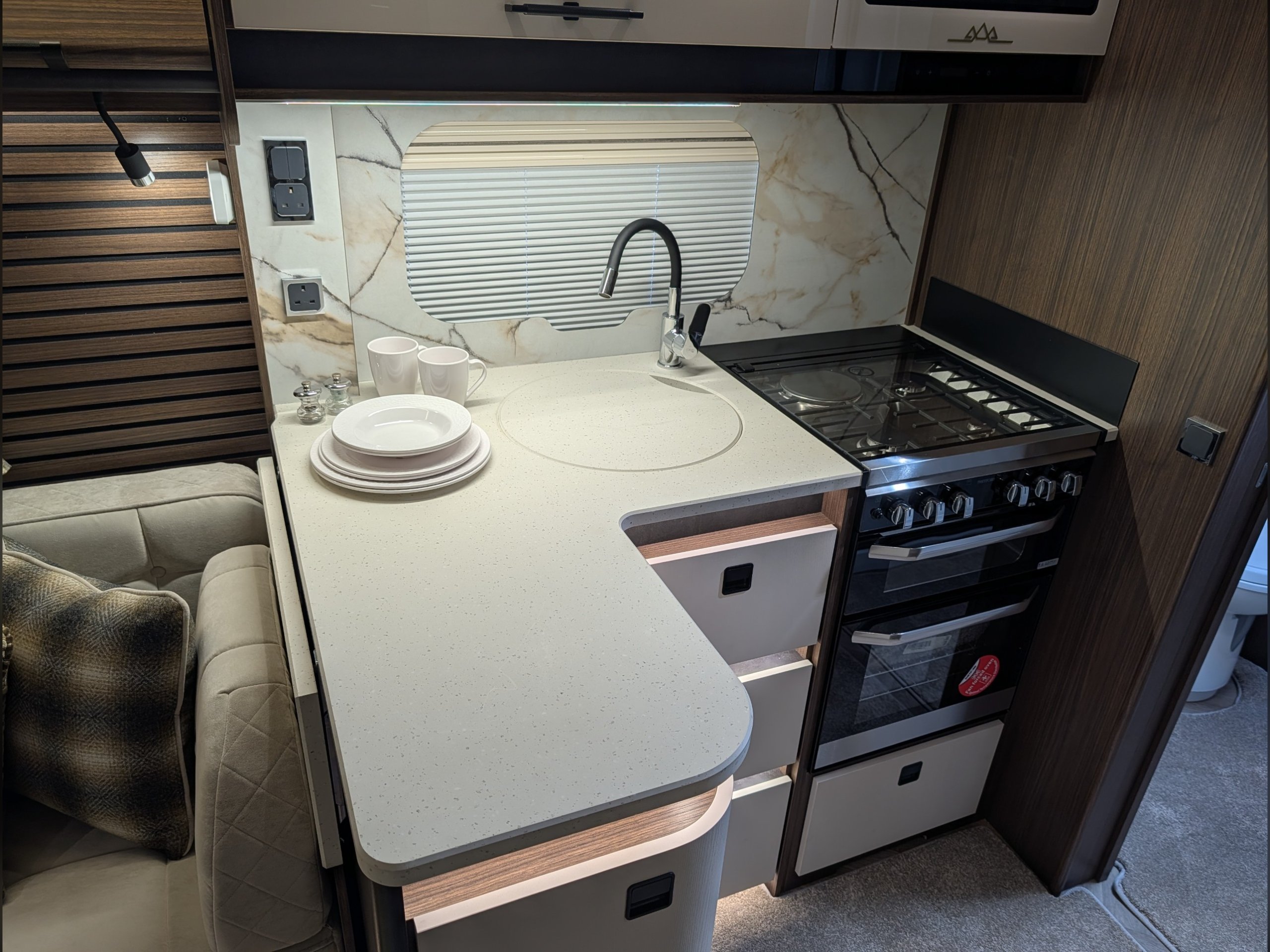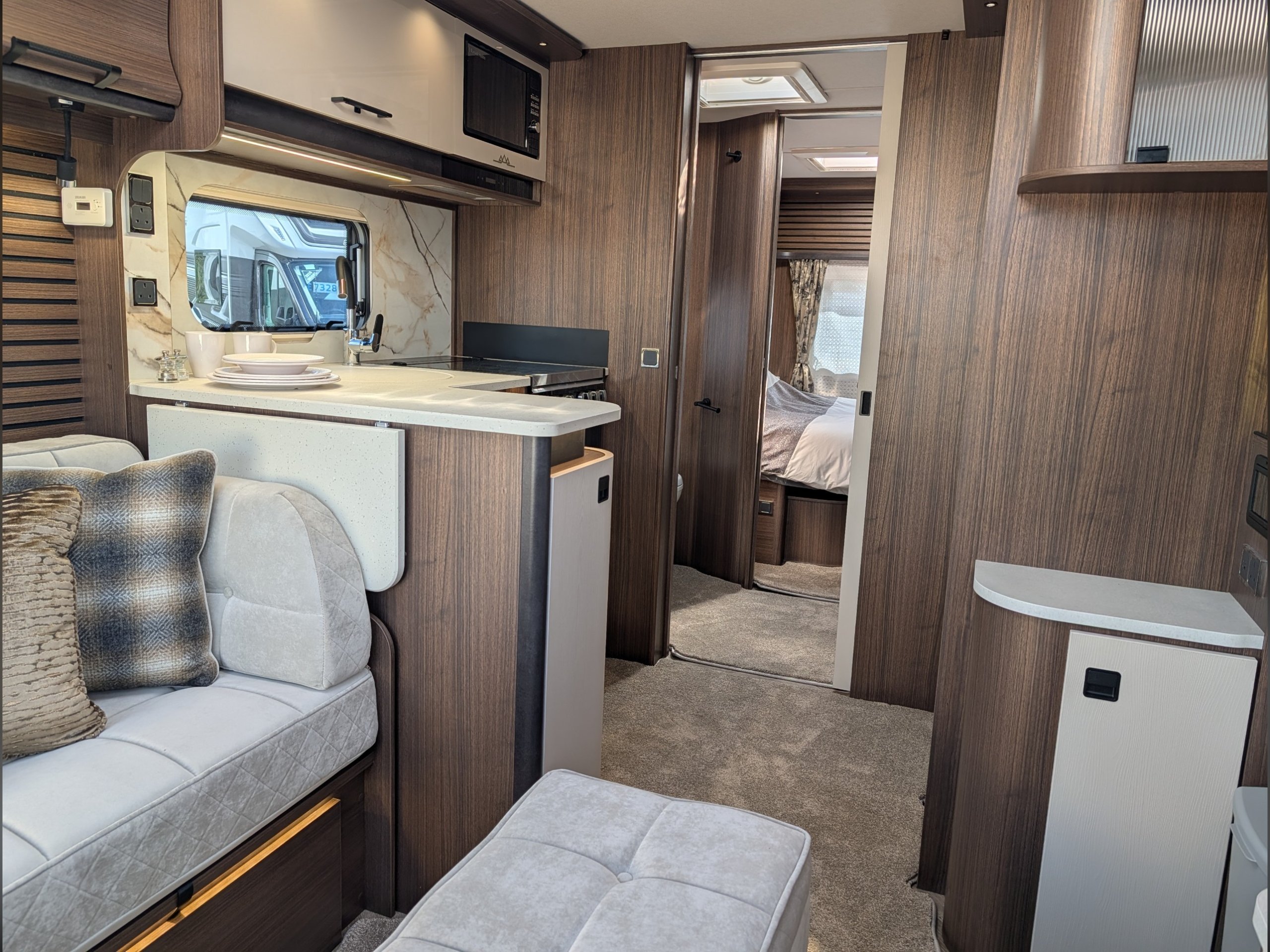 4 berth, rear transverse island bed, mid washroom, L shaped lounge layout.