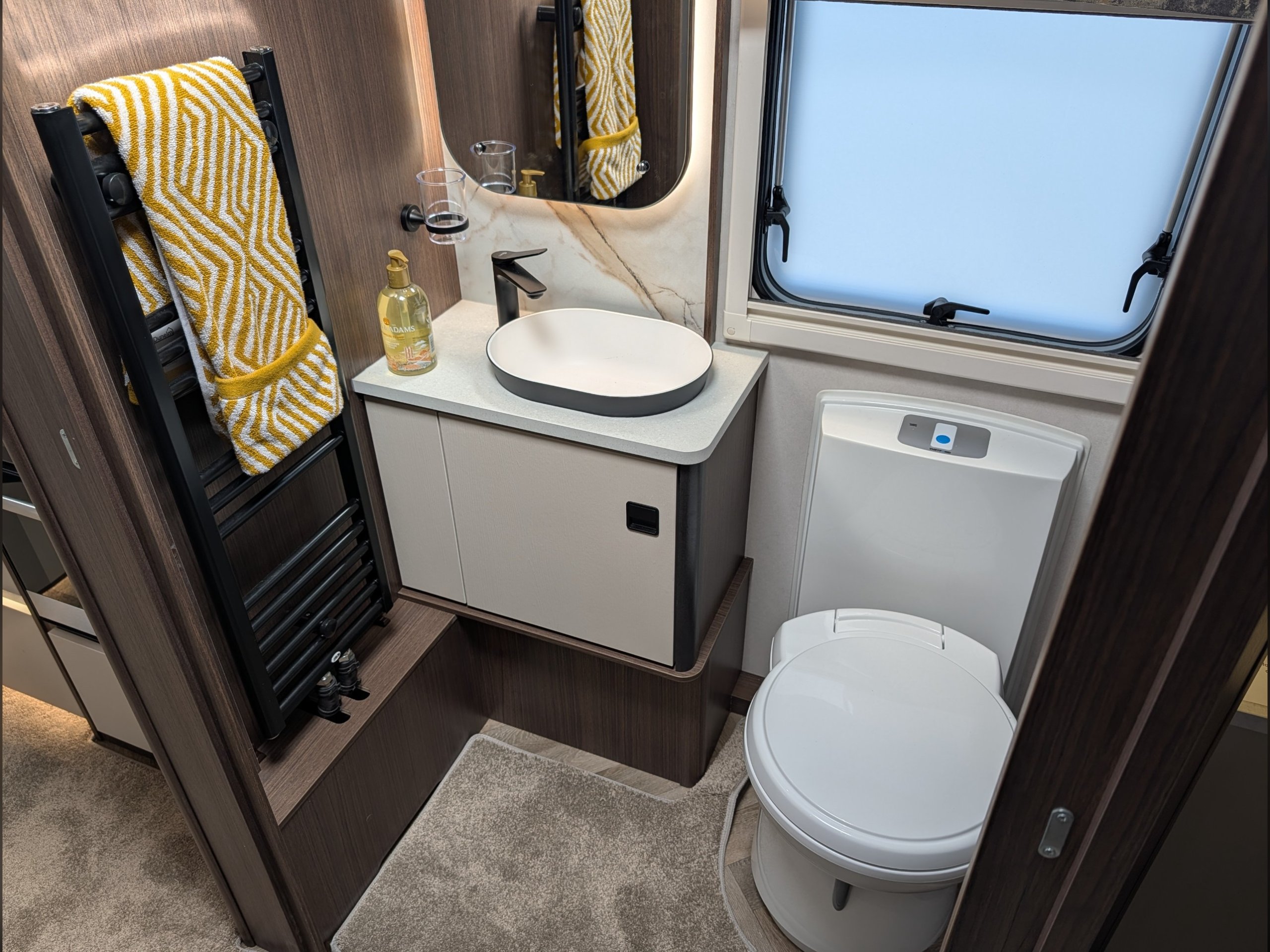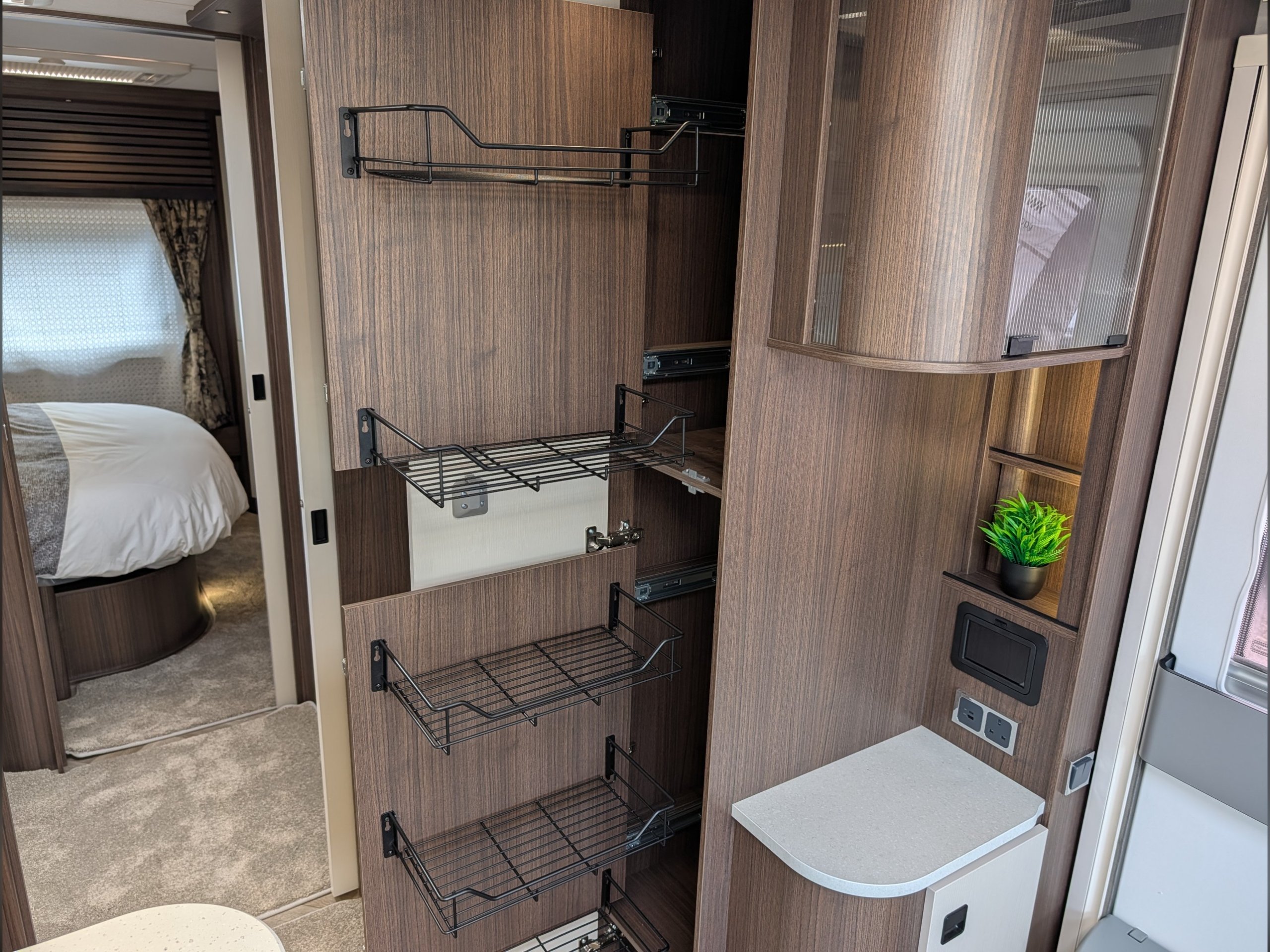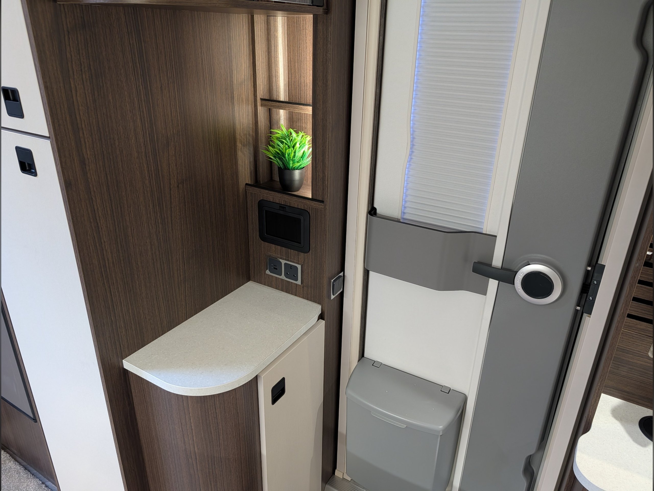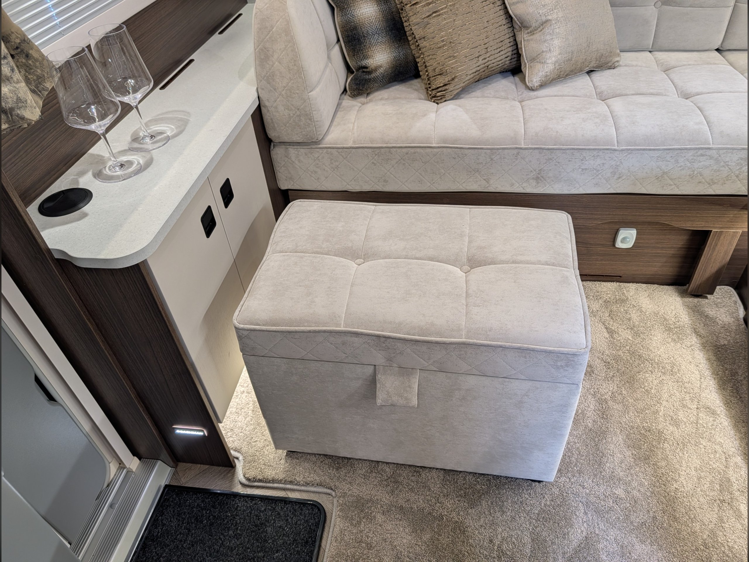 4 berth, rear transverse island bed, mid washroom, L shaped lounge layout.