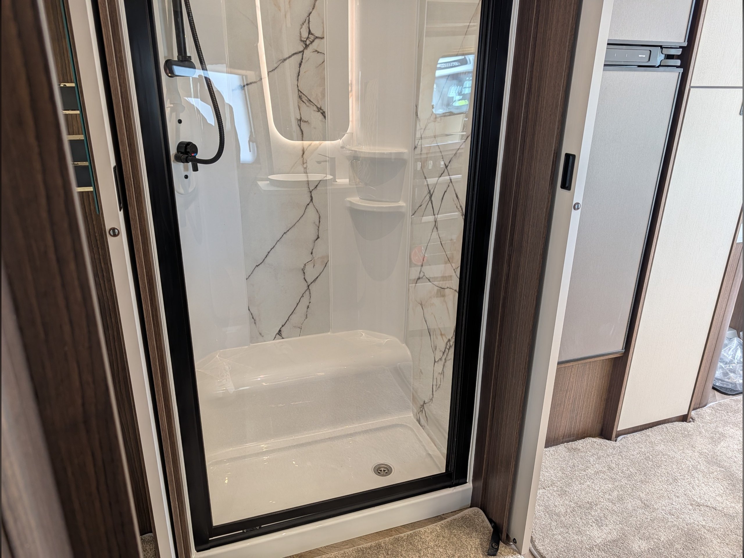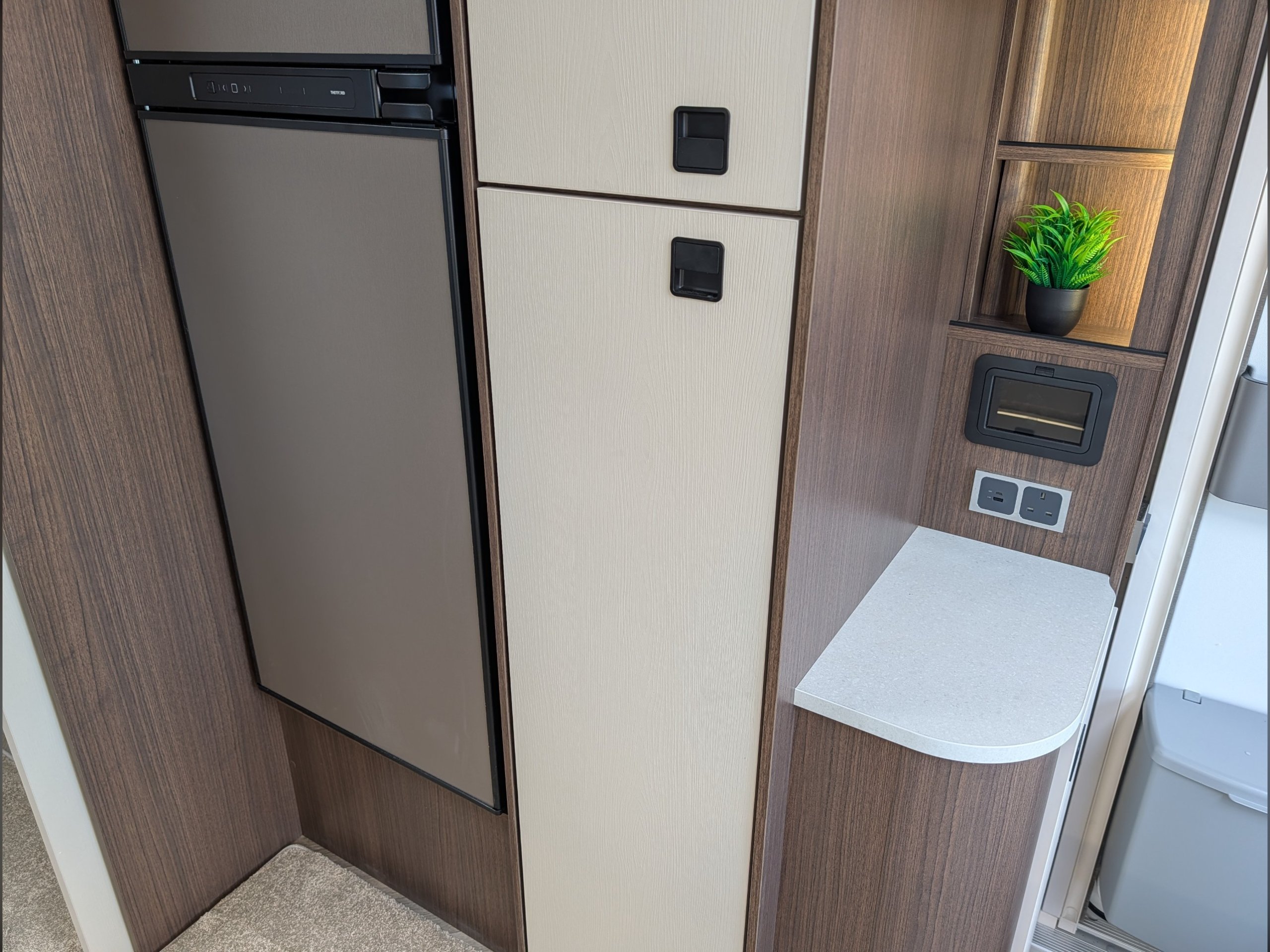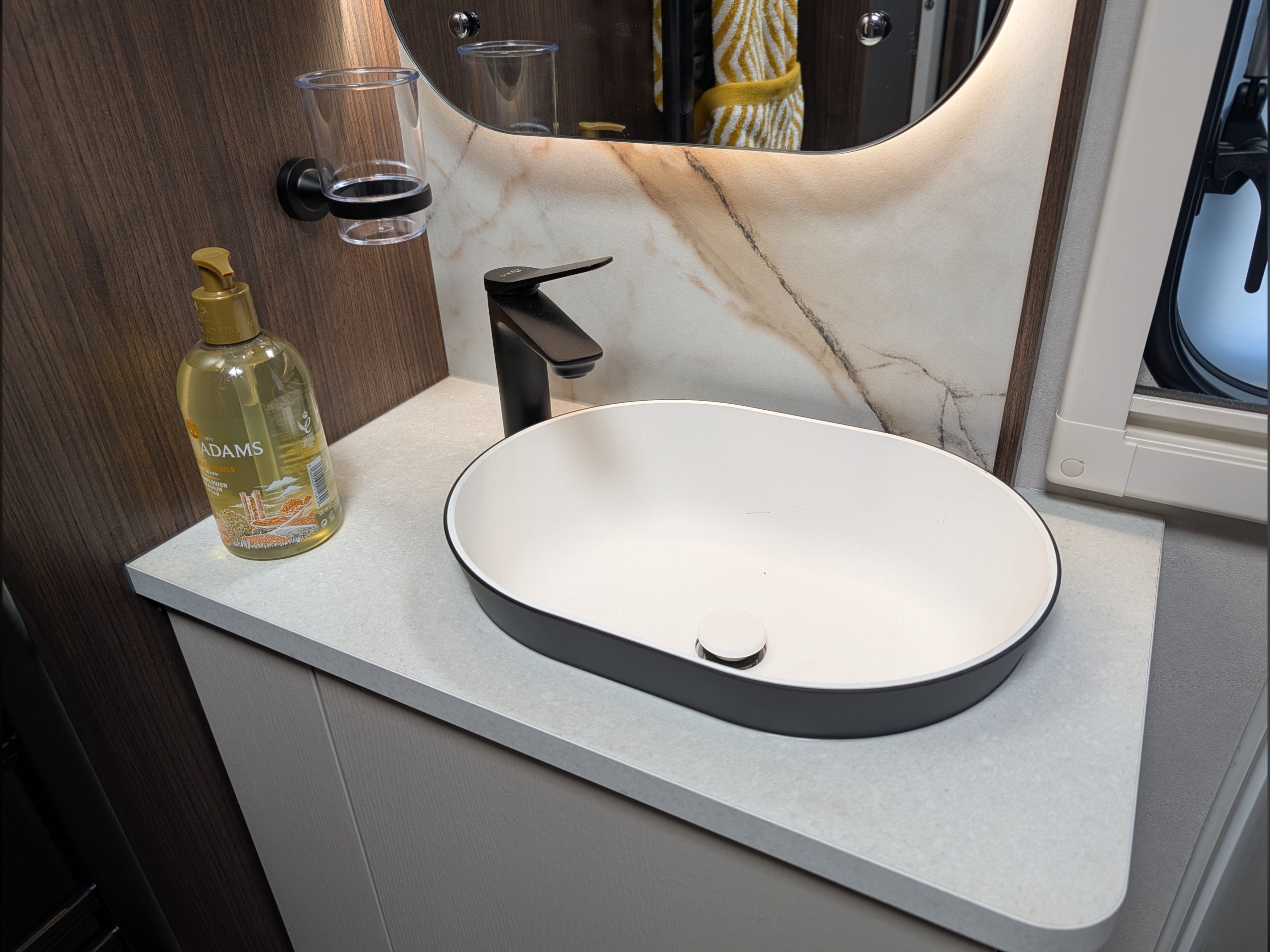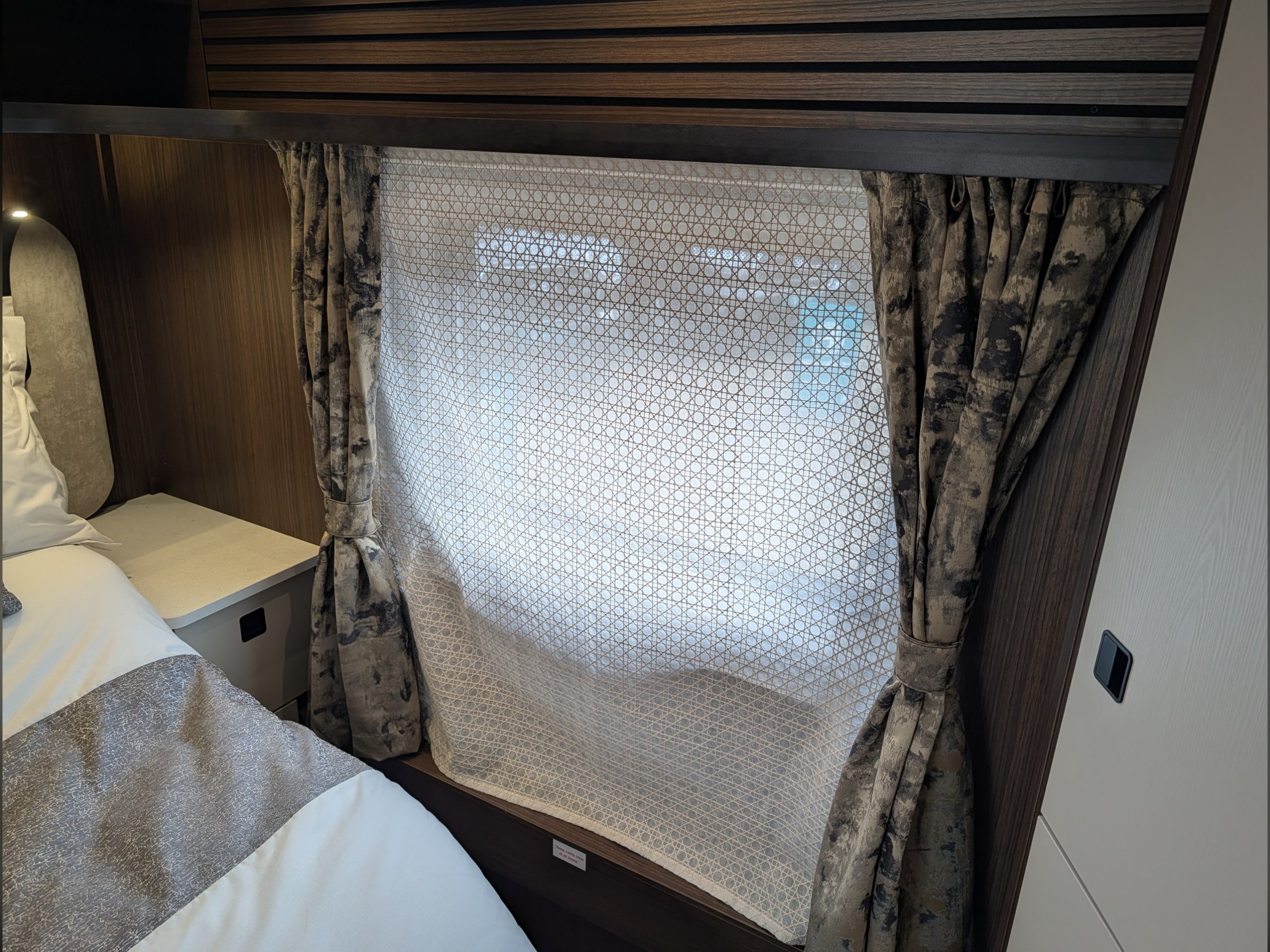 4 berth, rear transverse island bed, mid washroom, L shaped lounge layout.