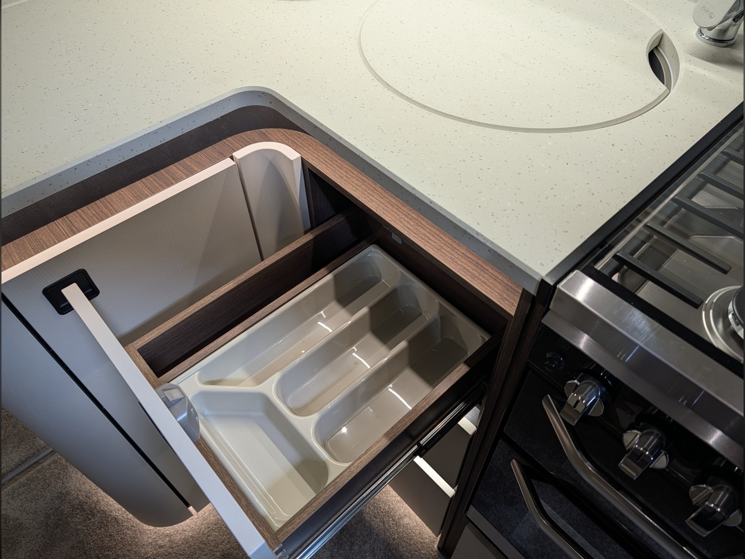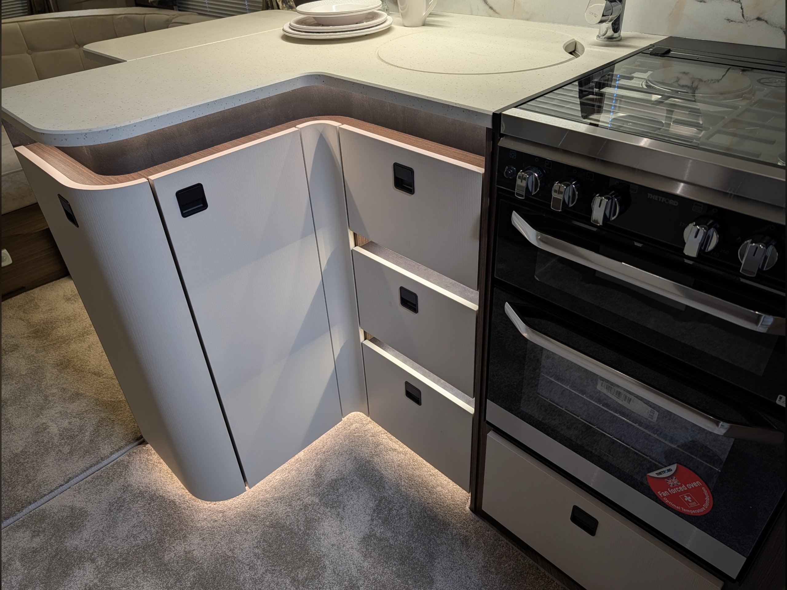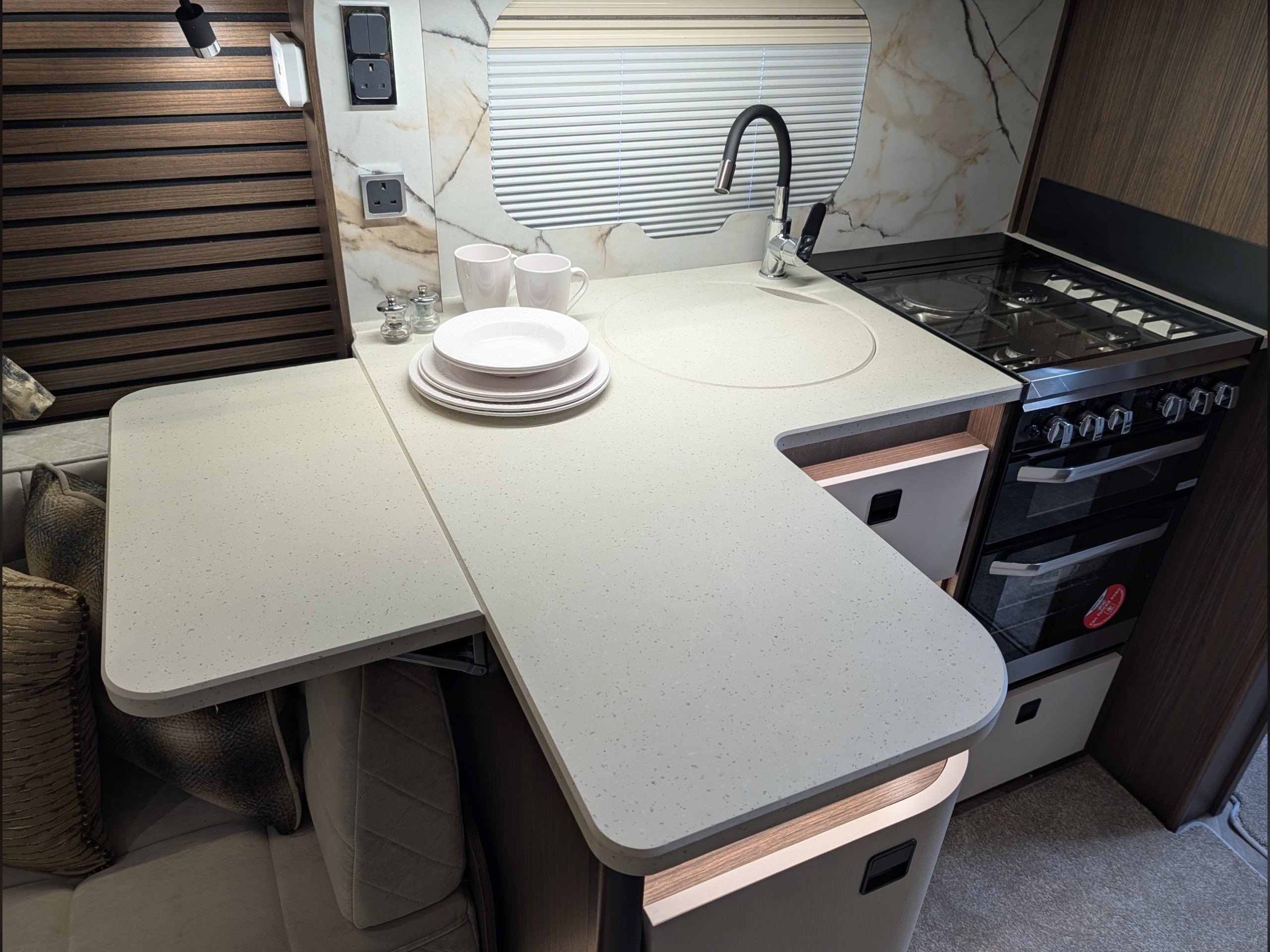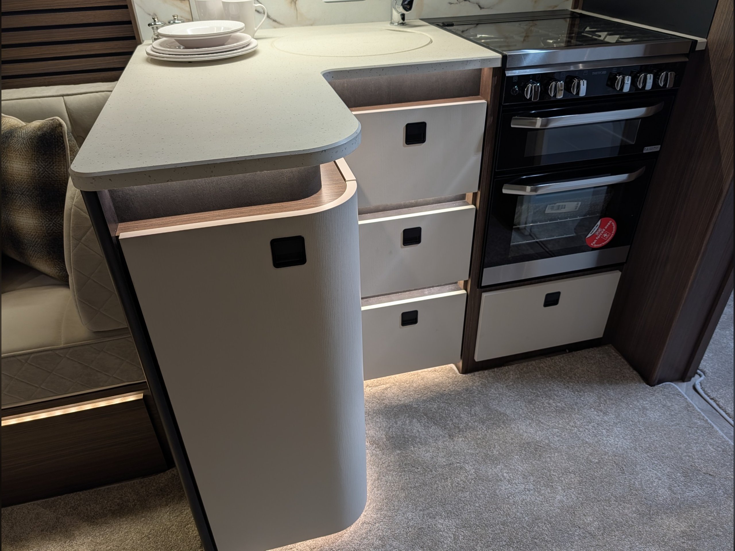 - NEW Curved L-shape designed kitchen with increased workspace and deeper cupboards