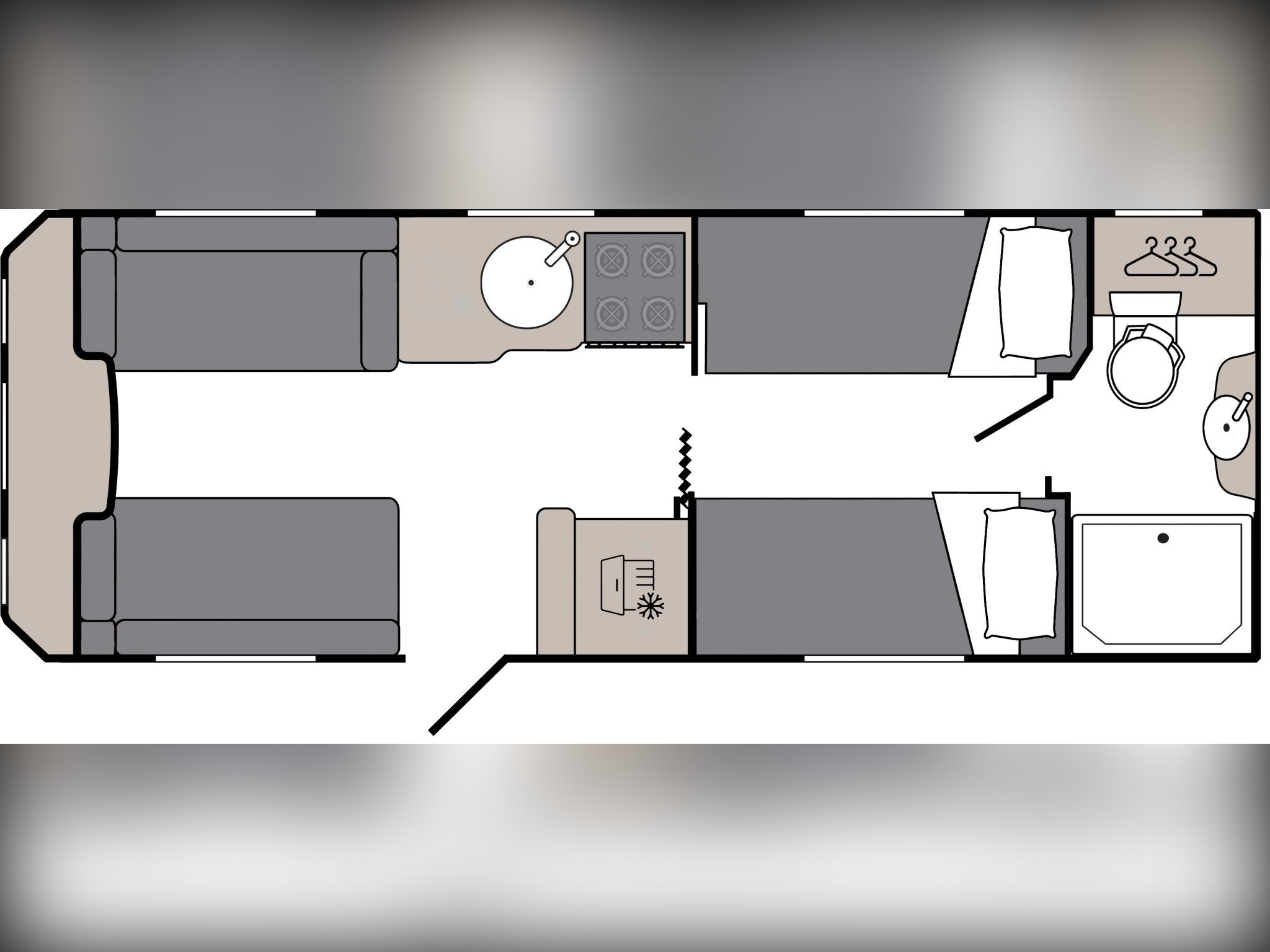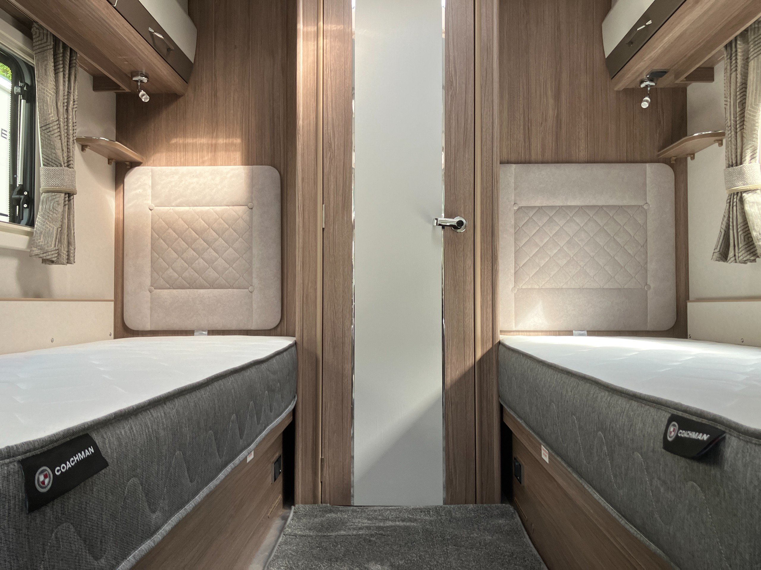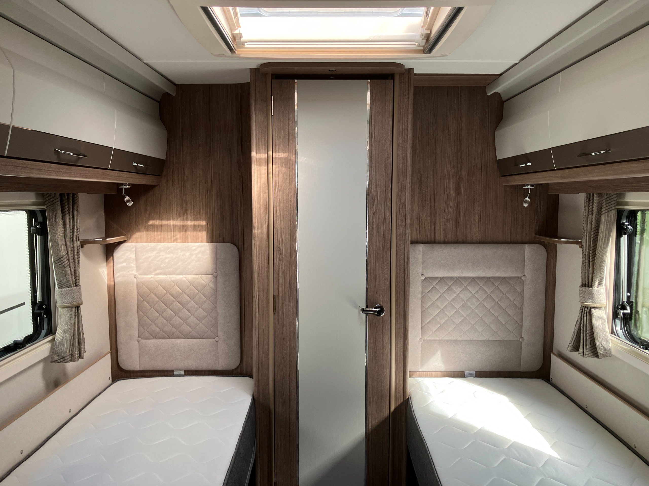 4 berth, single axle, fixed single beds layout with rear washroom.
