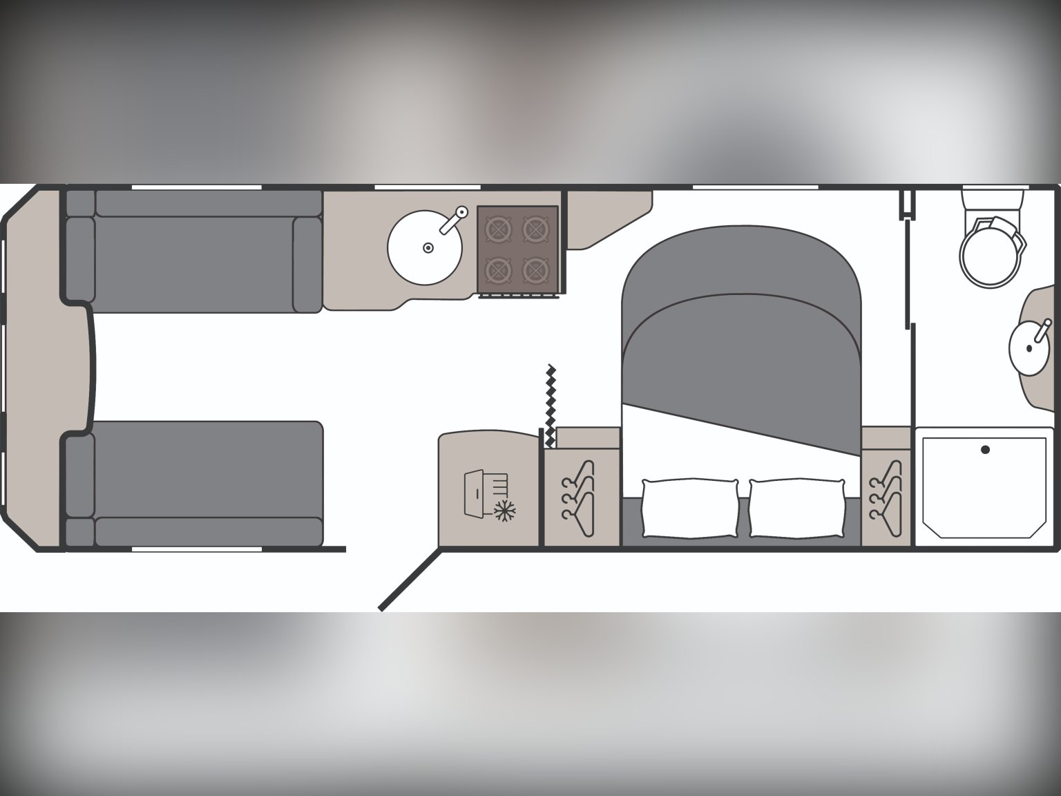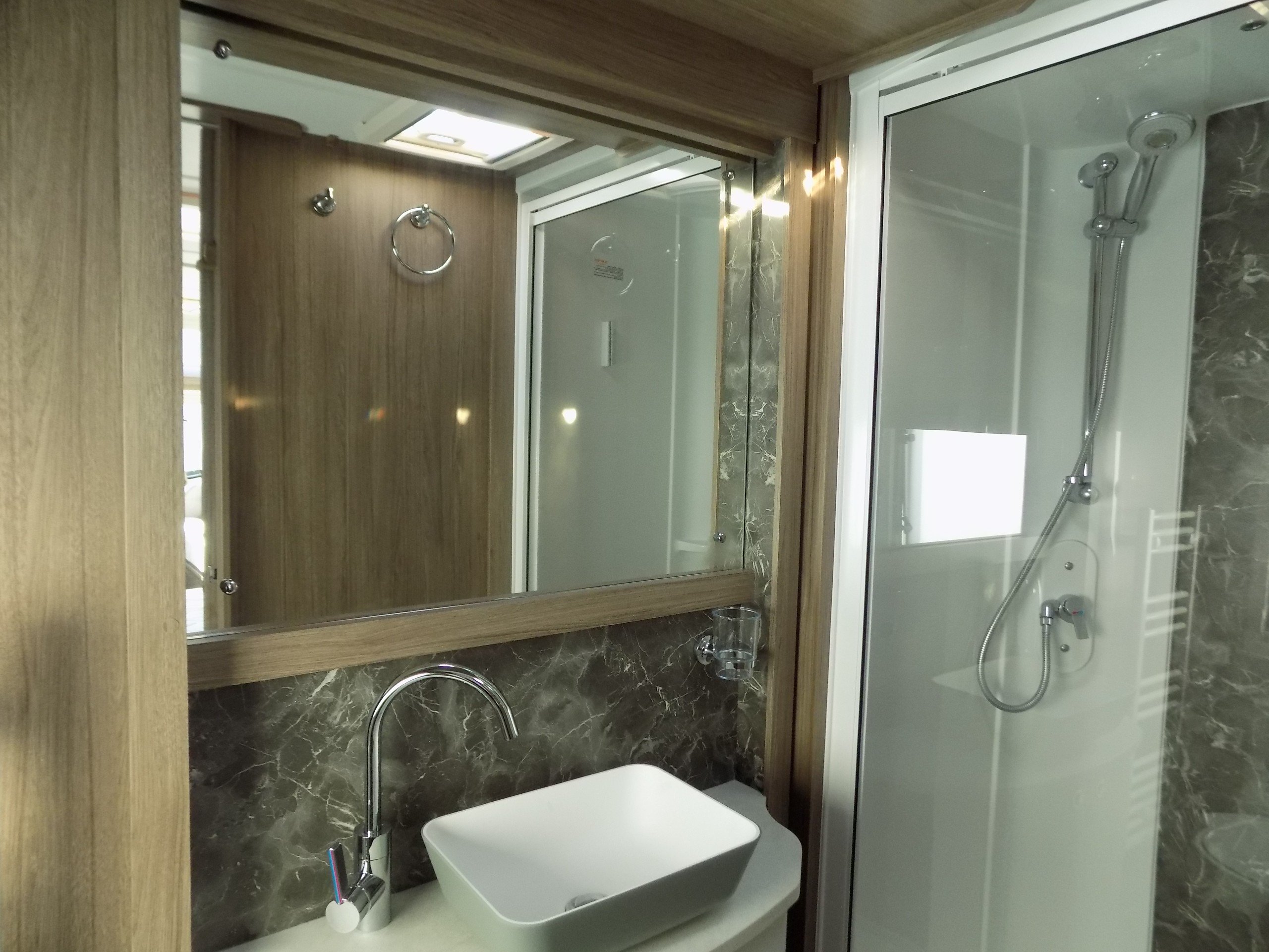 4 berth, single axle, transverse island bed layout with rear washroom.