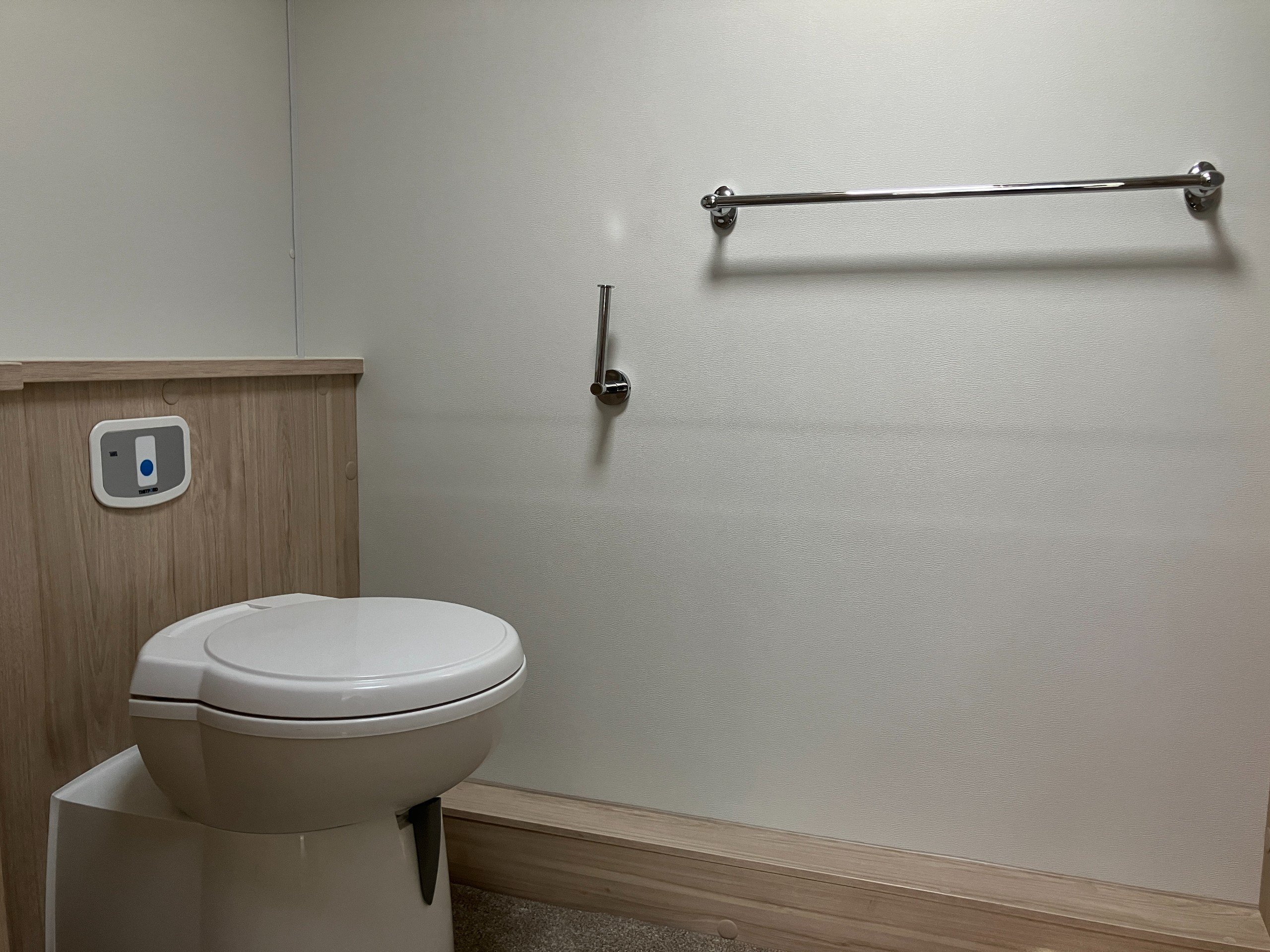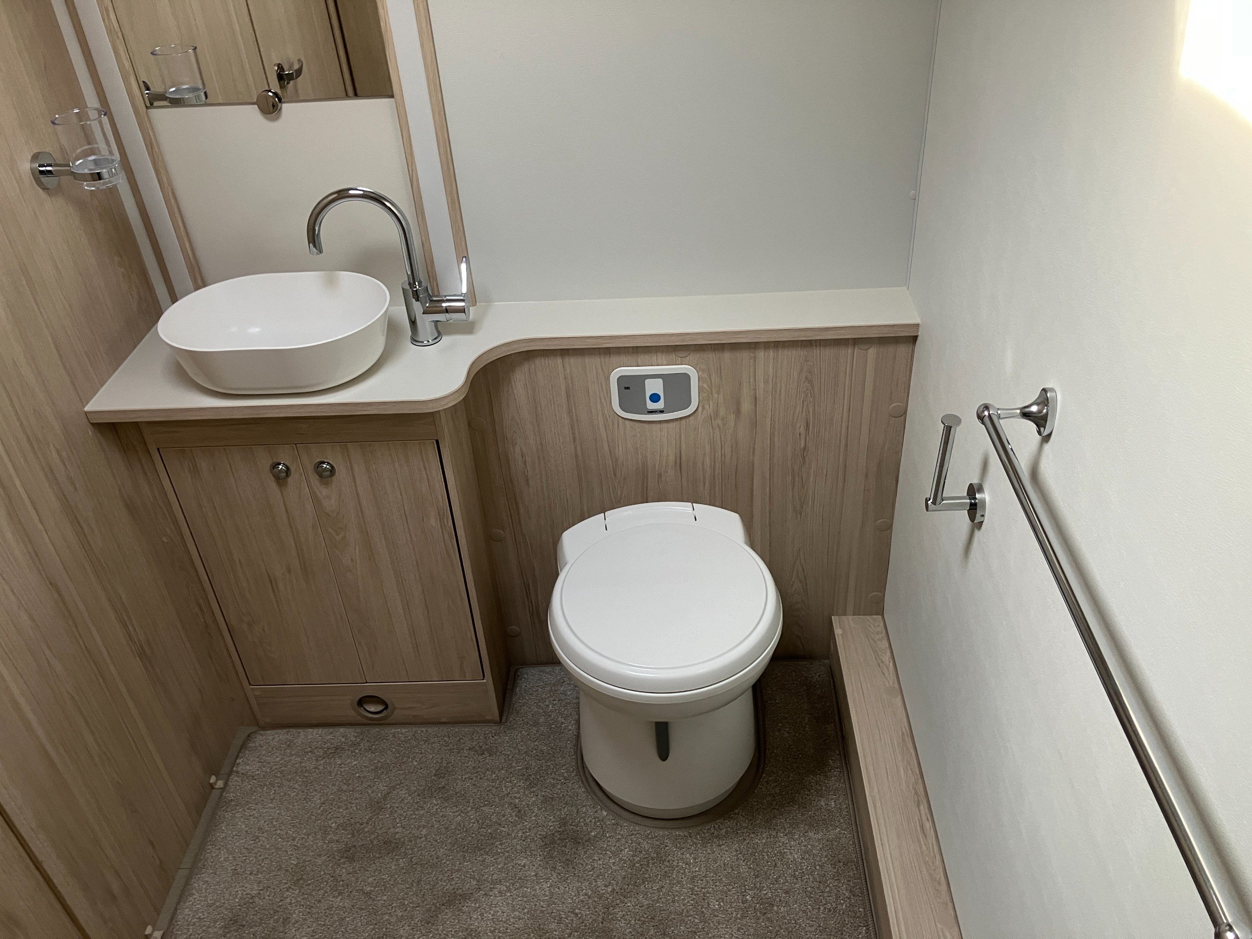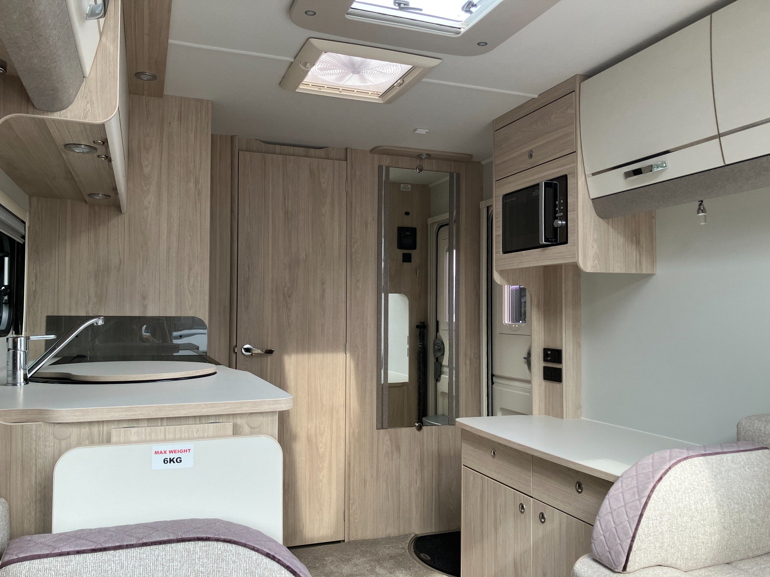 2 berth, single axle, front lounge, end washroom layout.