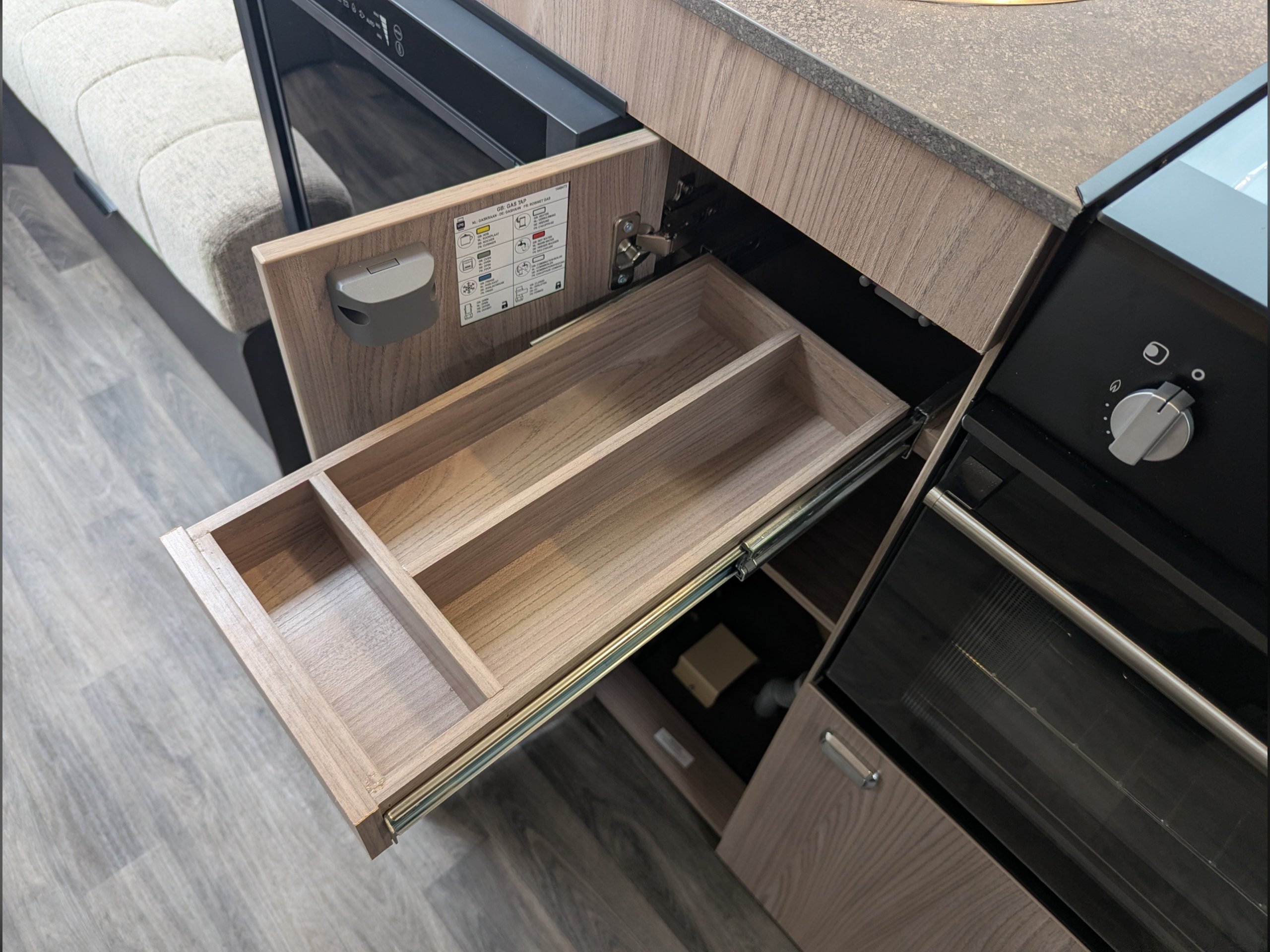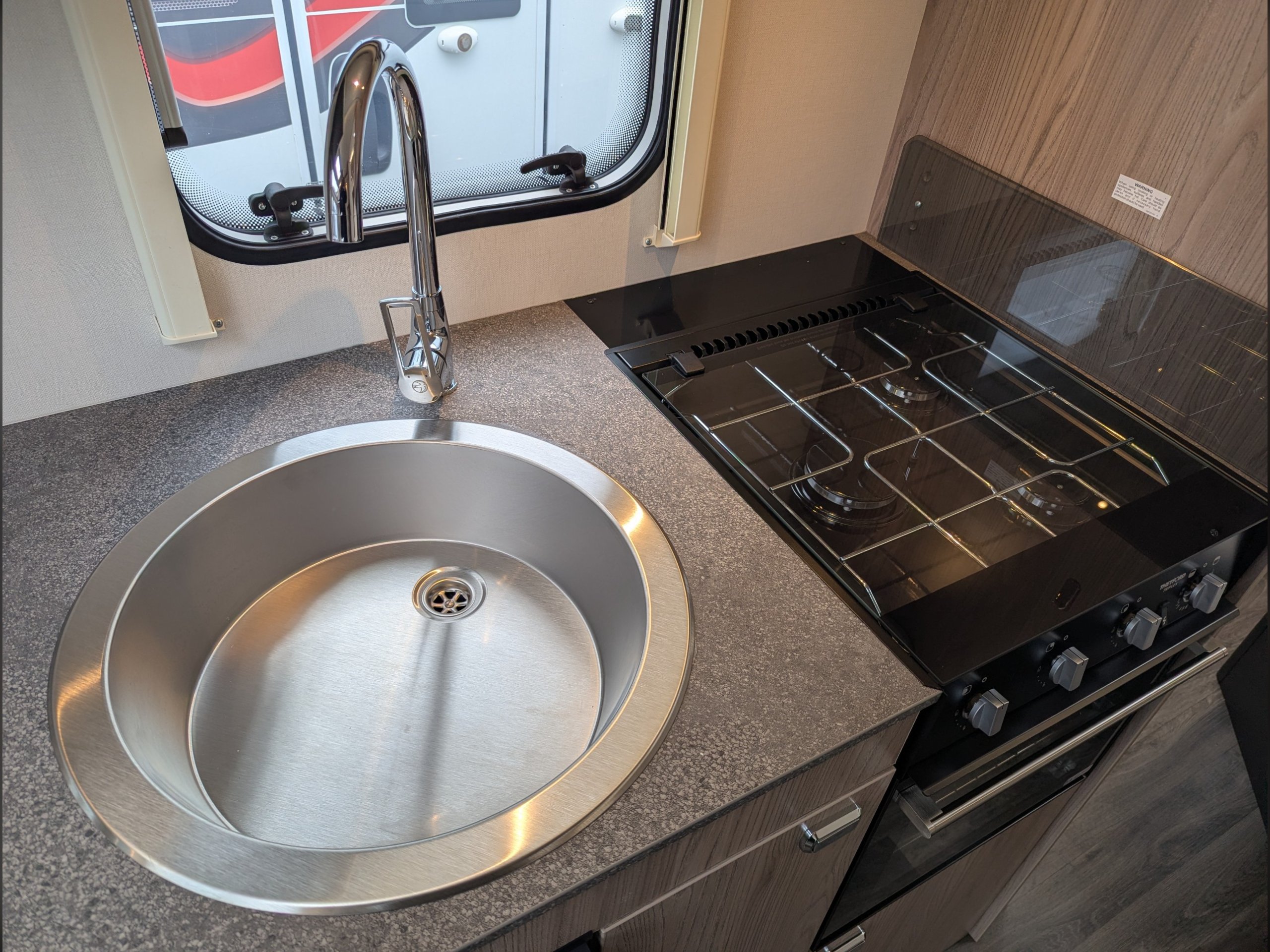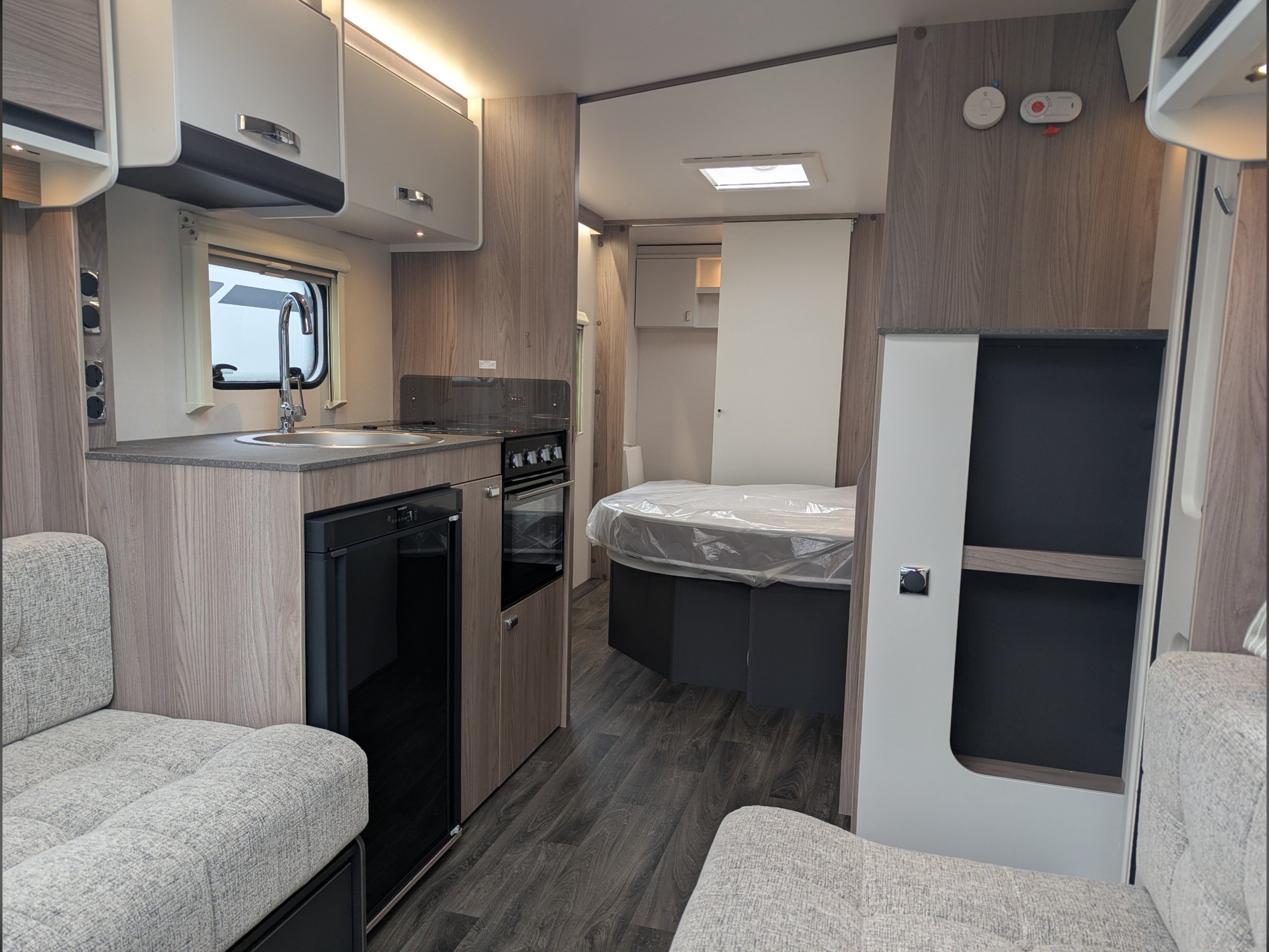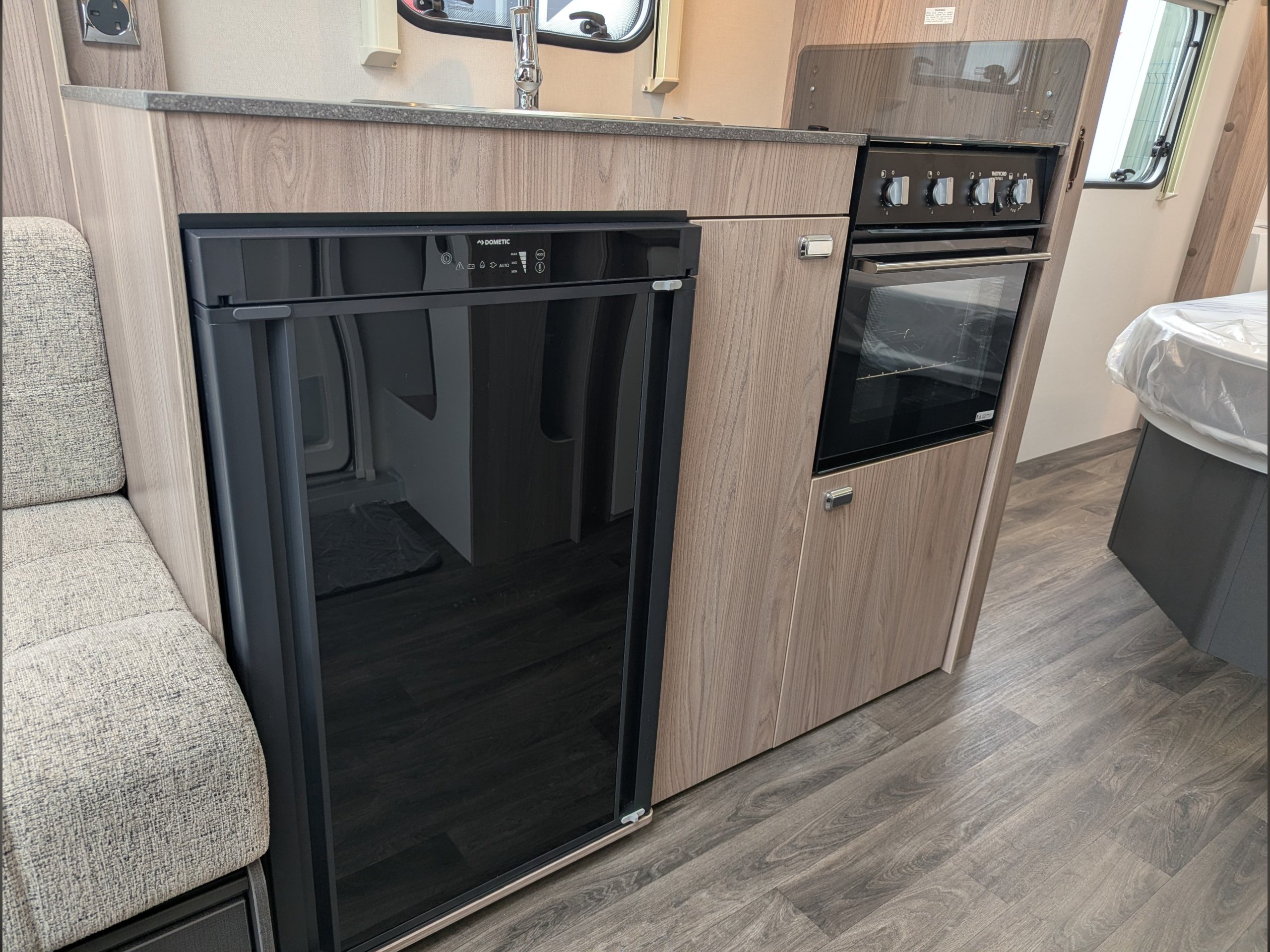 The kitchen area has a 3-burner gas hob with electronic ignition, oven, grill, and a 12V/240V/gas fridge.