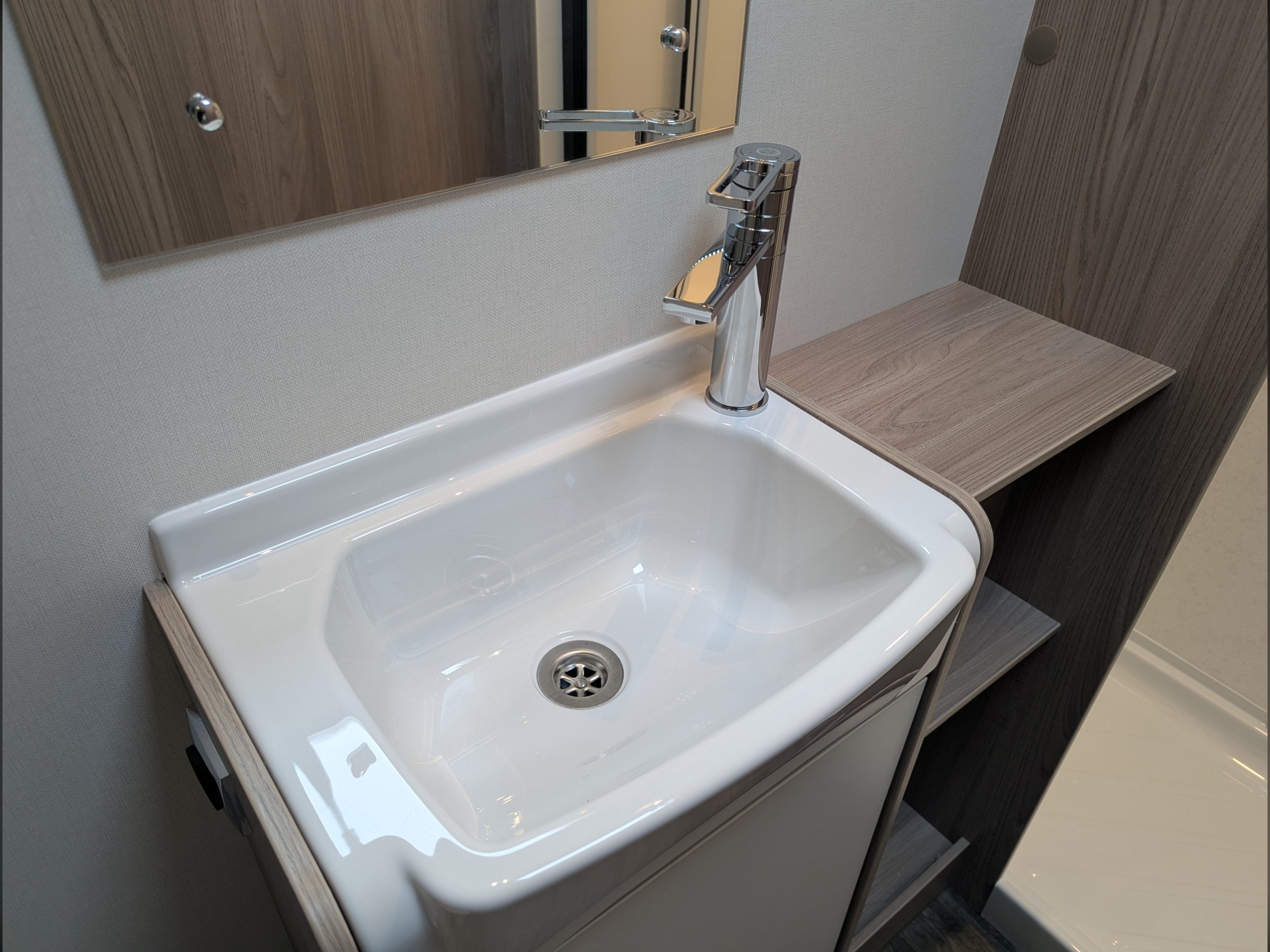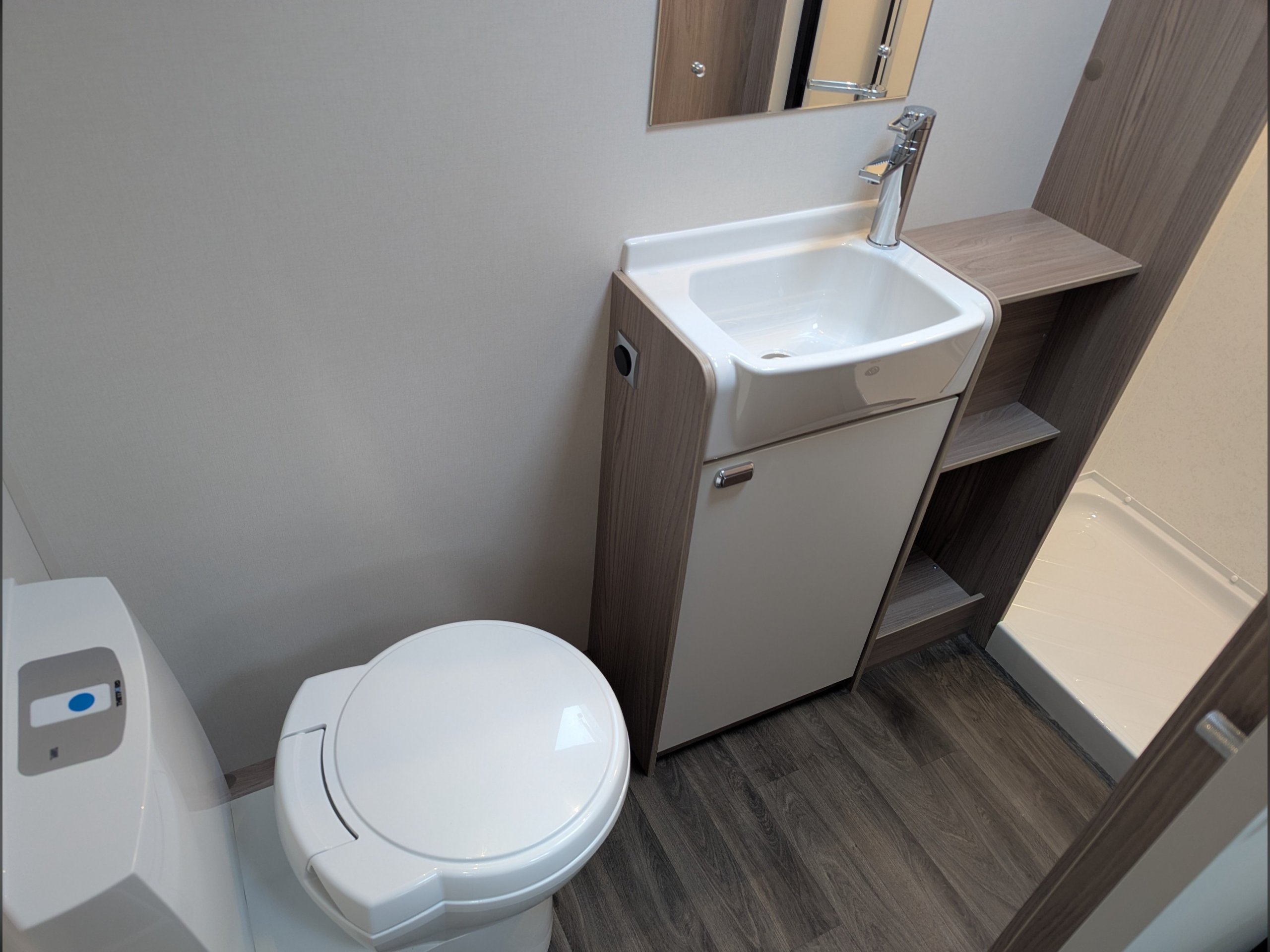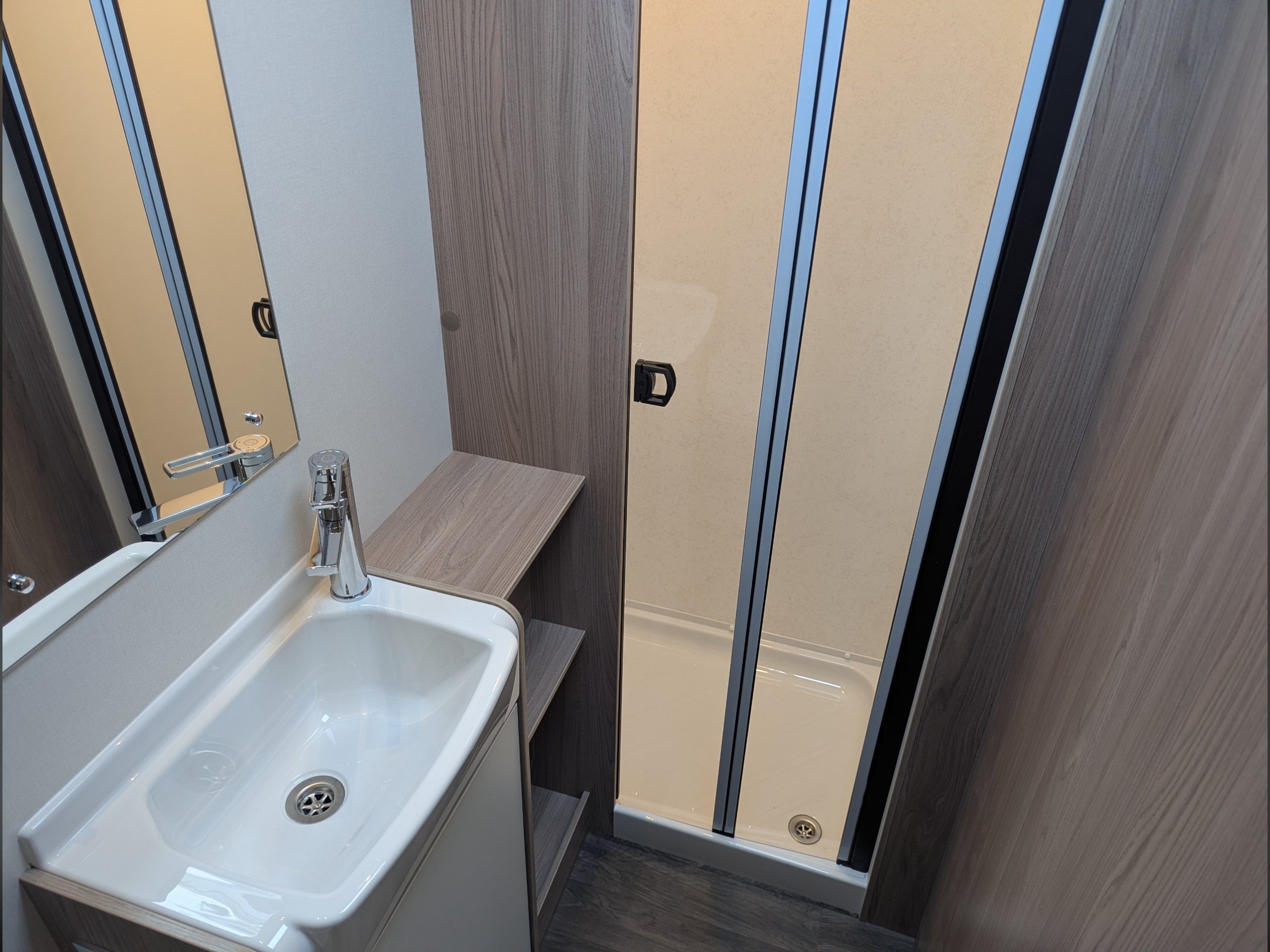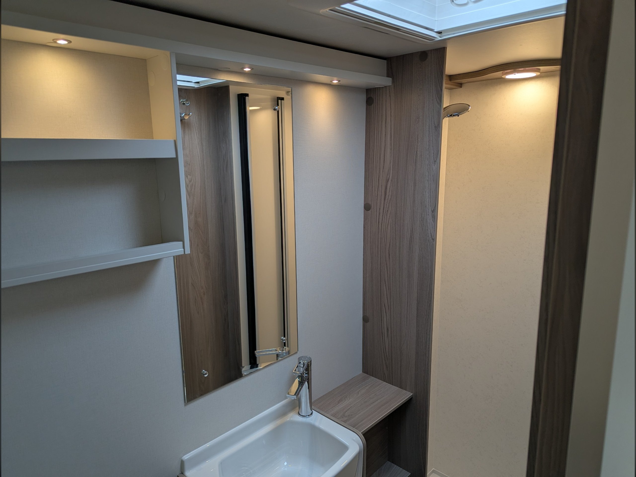 The full-sized end washroom has a Thetford toilet with an electric flush and a large separate shower cubicle.