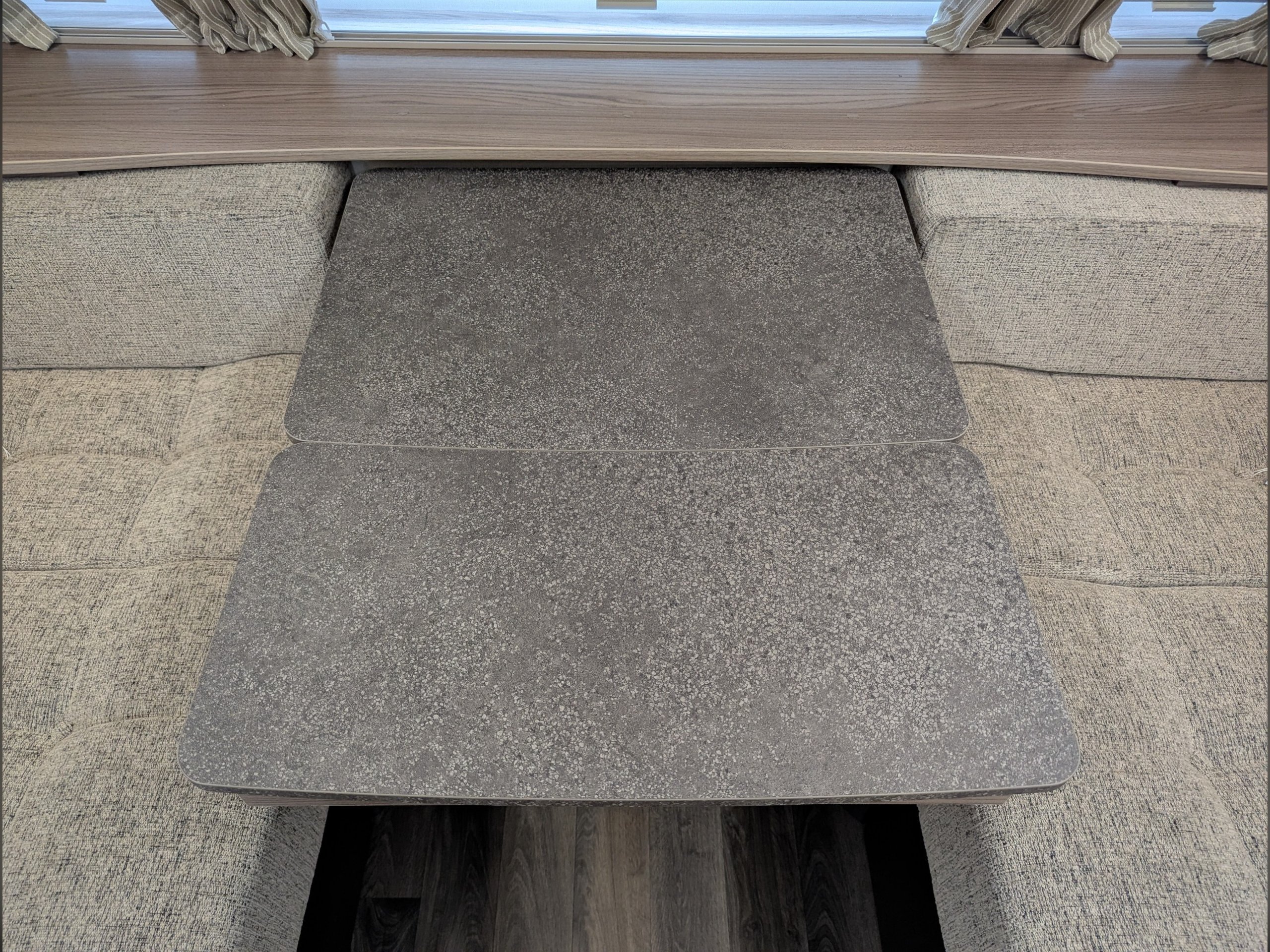 There is a pull-out fixed island bed with an extendable section, along with a convertible front seating area that forms another double bed.