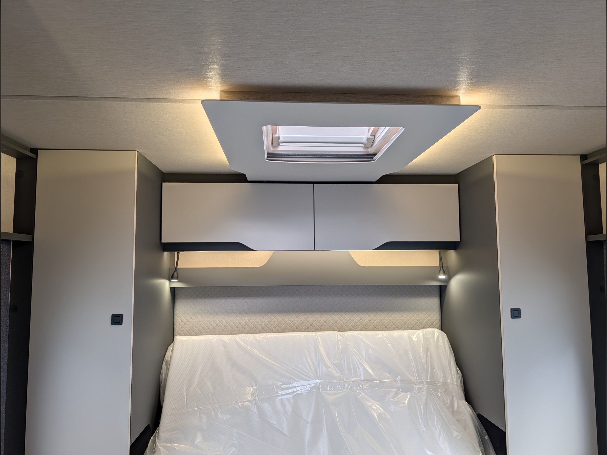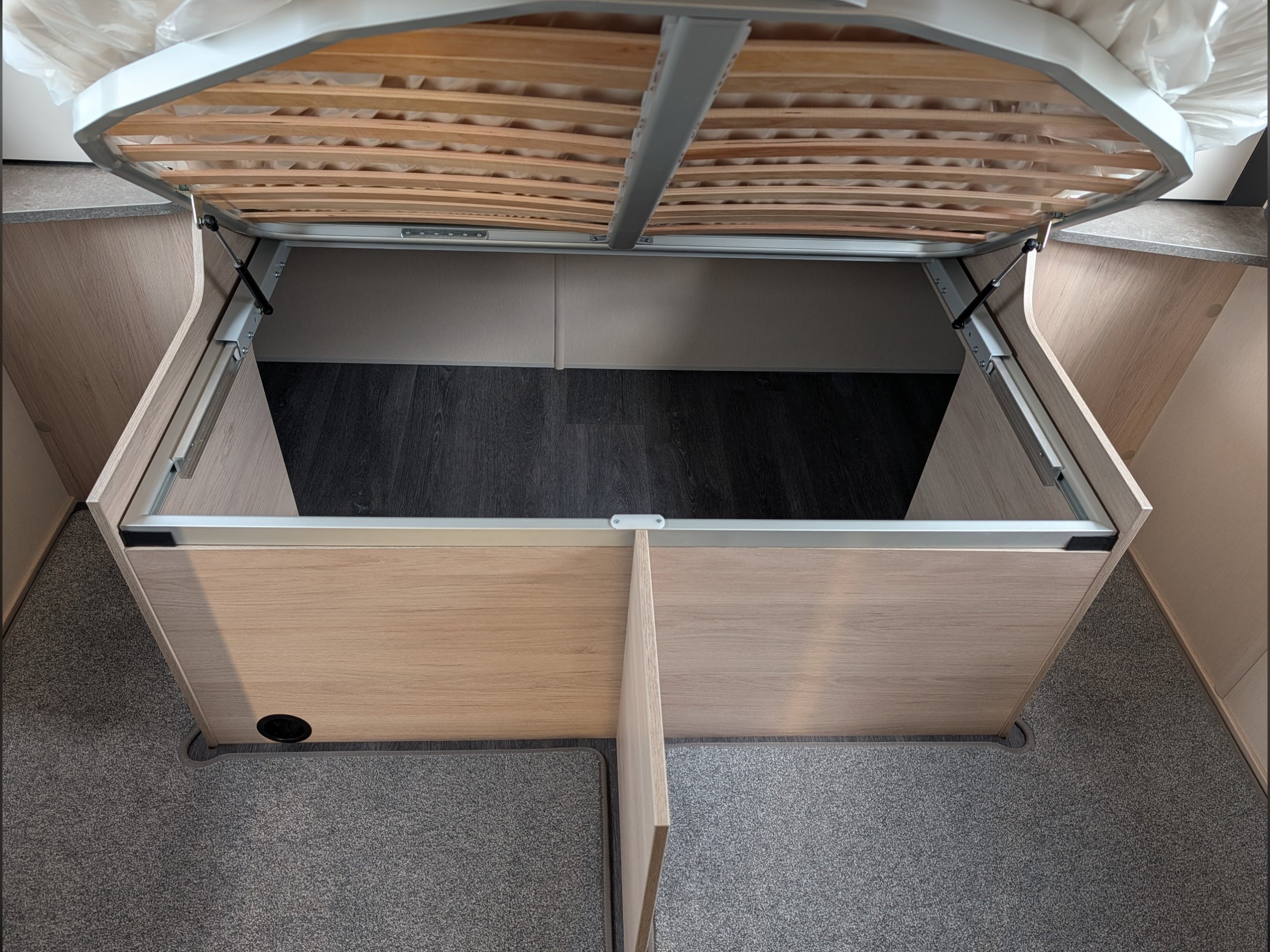 The Auto-Trail F-Line F74 motorhome, built on the popular Ford chassis with manual or automatic gearbox options available. This layout offers a spacious front living area and large island bed at the rear above a garage storage area. An option to add a drop-down electric bed over the front lounge area is also available.