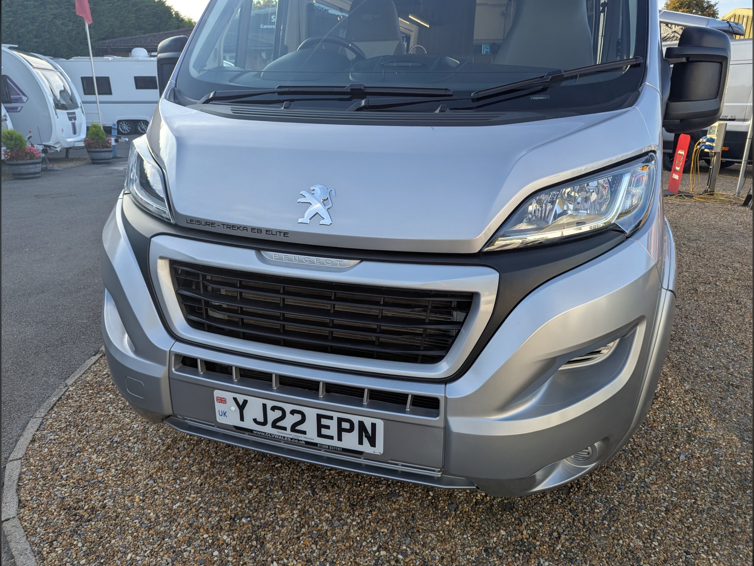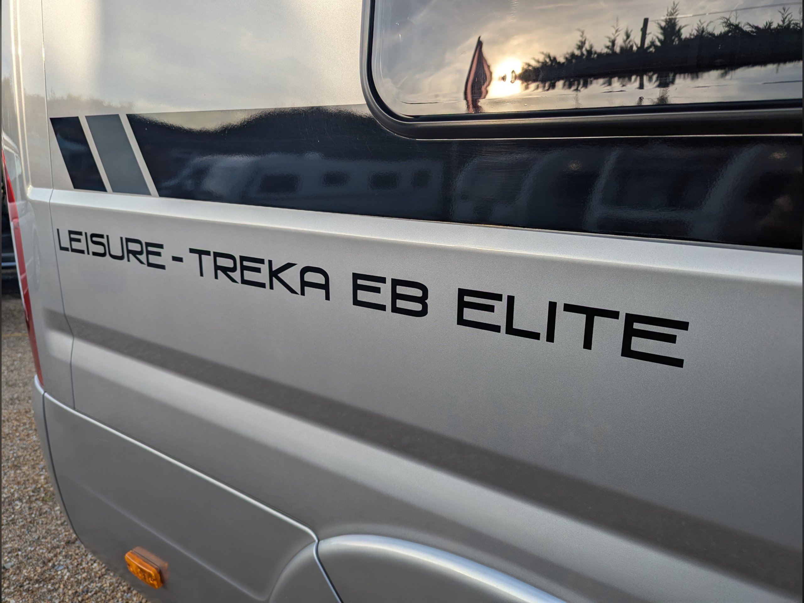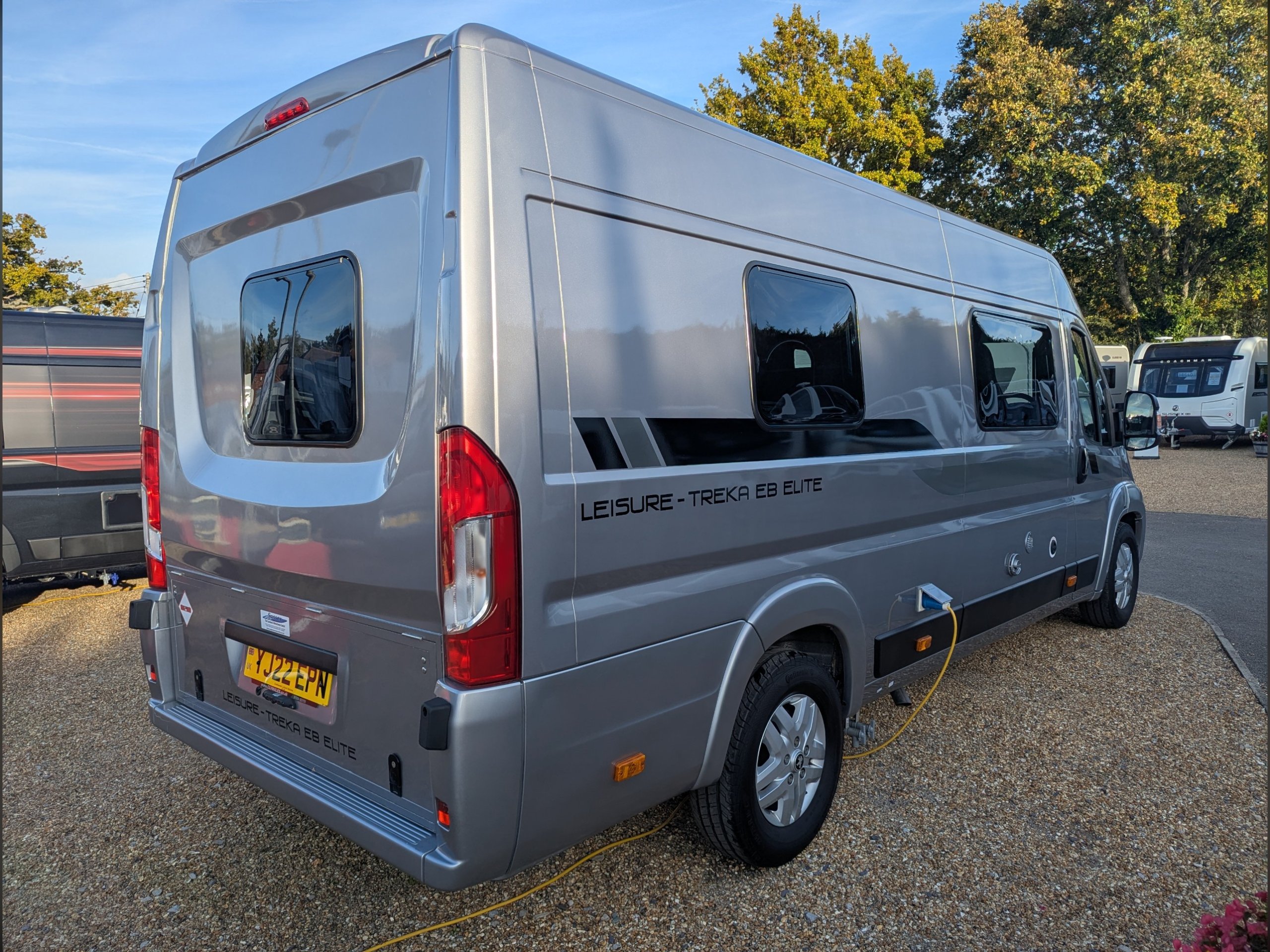 This 2022 Moto-Trek Leisure-Treka EB Elite has a side L-shaped lounge that converts to a double bed, a mid kitchen with a gas hob, oven, and fridge, and a rear end-bathroom with a toilet, shower, and wash basin.