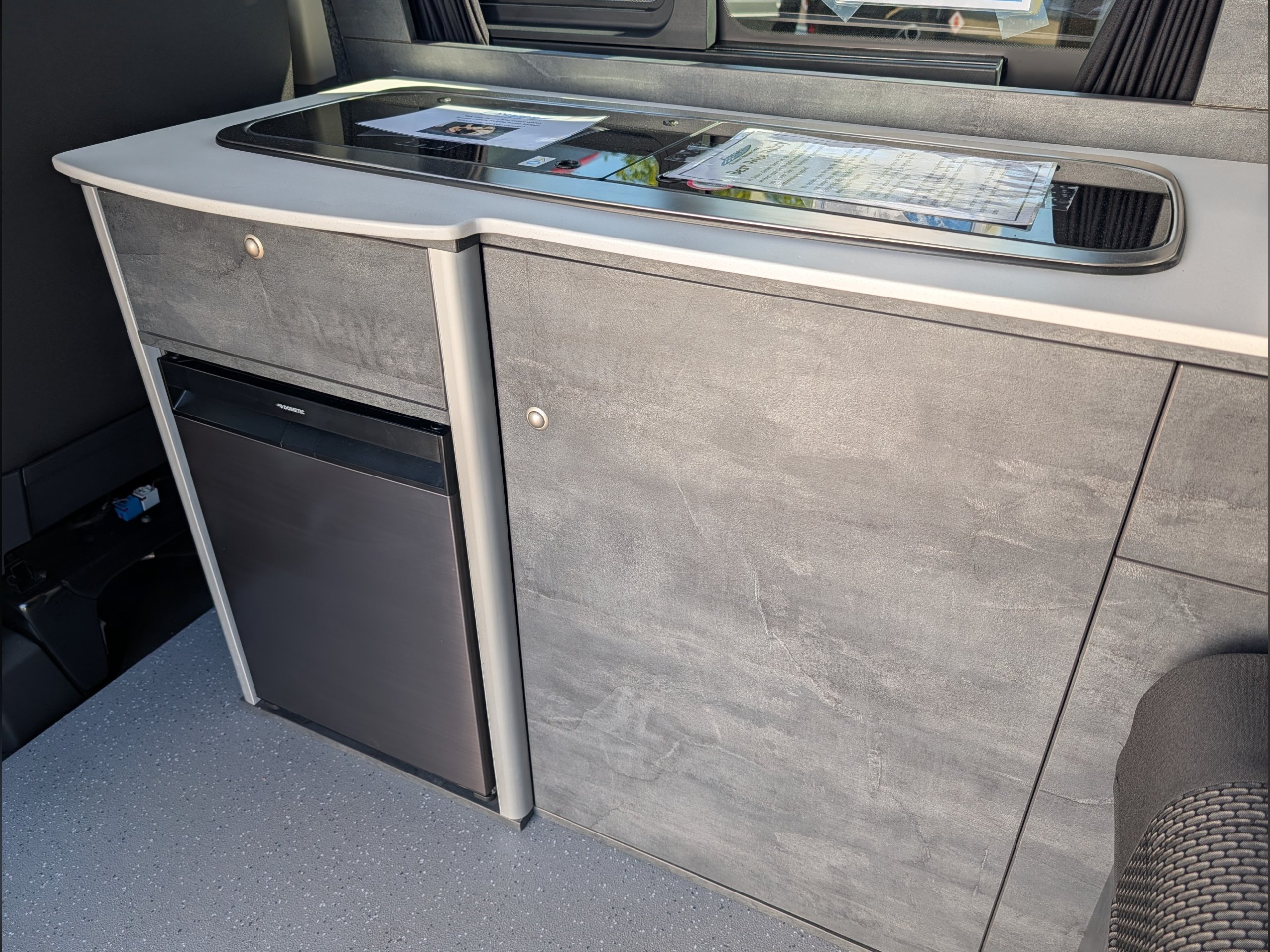 This 2024 Volkswagen Transporter T28 Highline is a Rolling Homes Conversion, and is a high-quality 4-berth / 5 belt campervan with a side kitchen layout, a 50lt fridge freezer, sink, 2 burner hob. premium lightweight wood furniture and a pop-top roof.