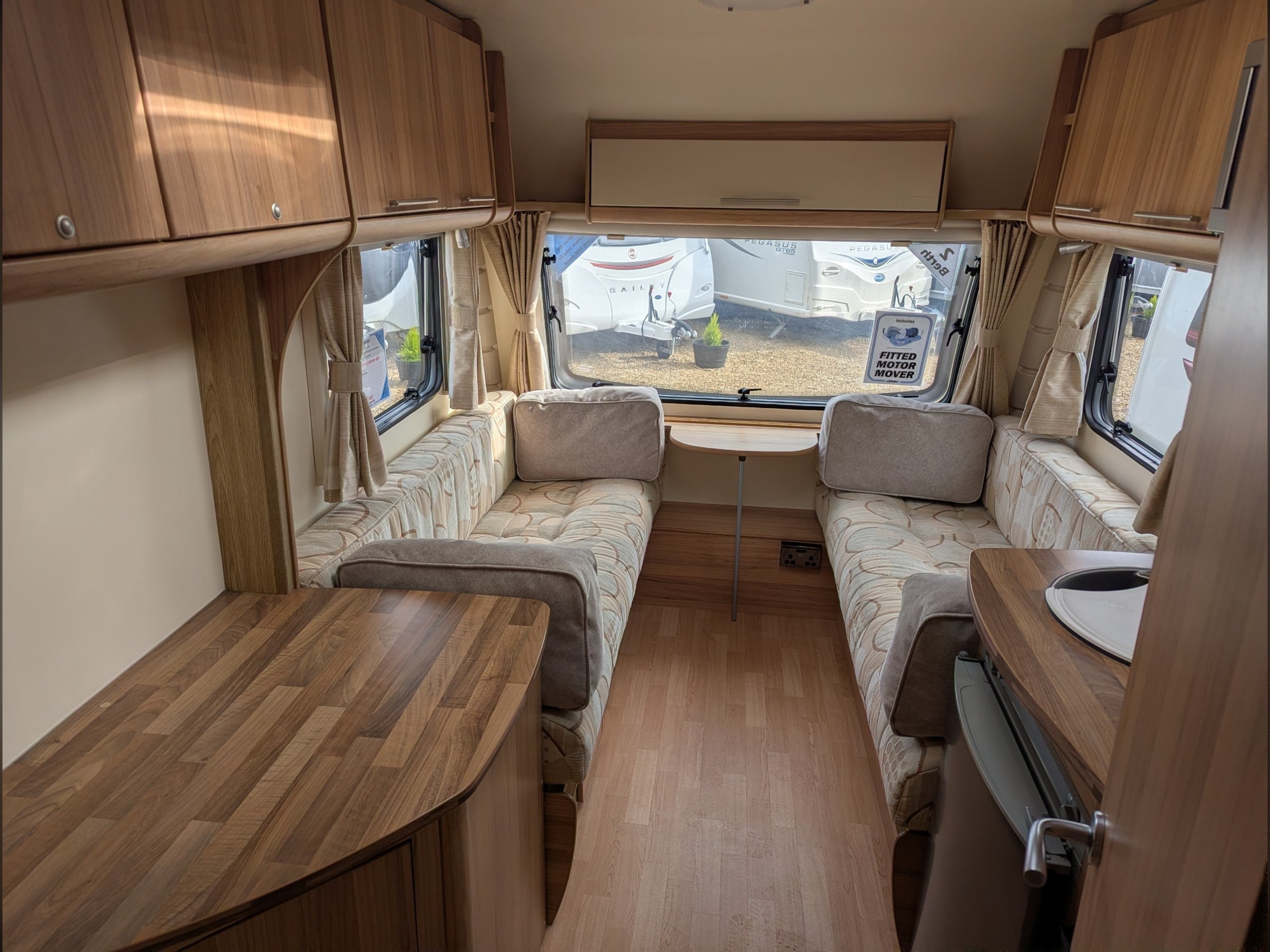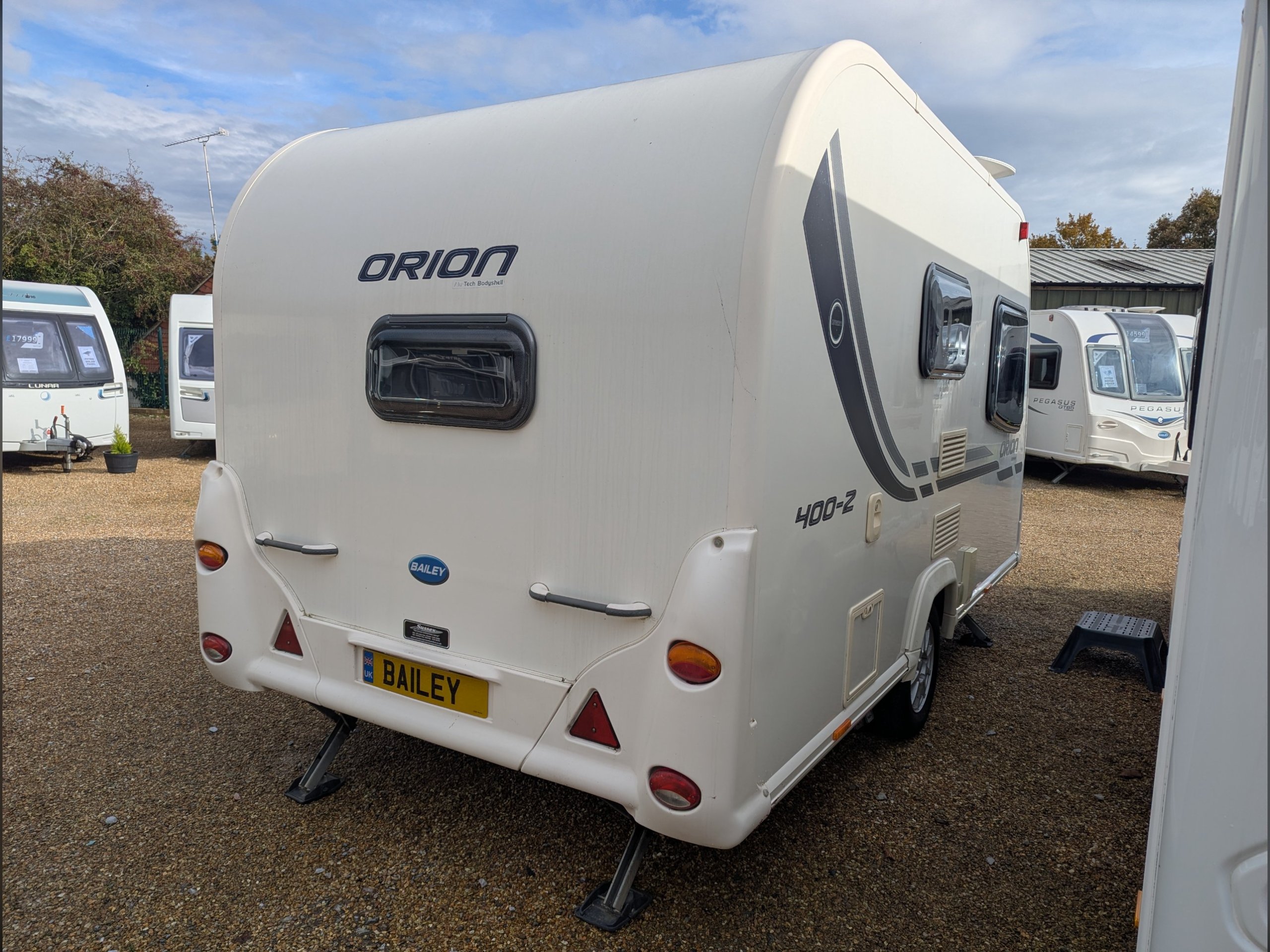 The 2011 Bailey Orion 400/2 is a 2-berth caravan with a spacious front lounge, a side kitchen, and a large end washroom.