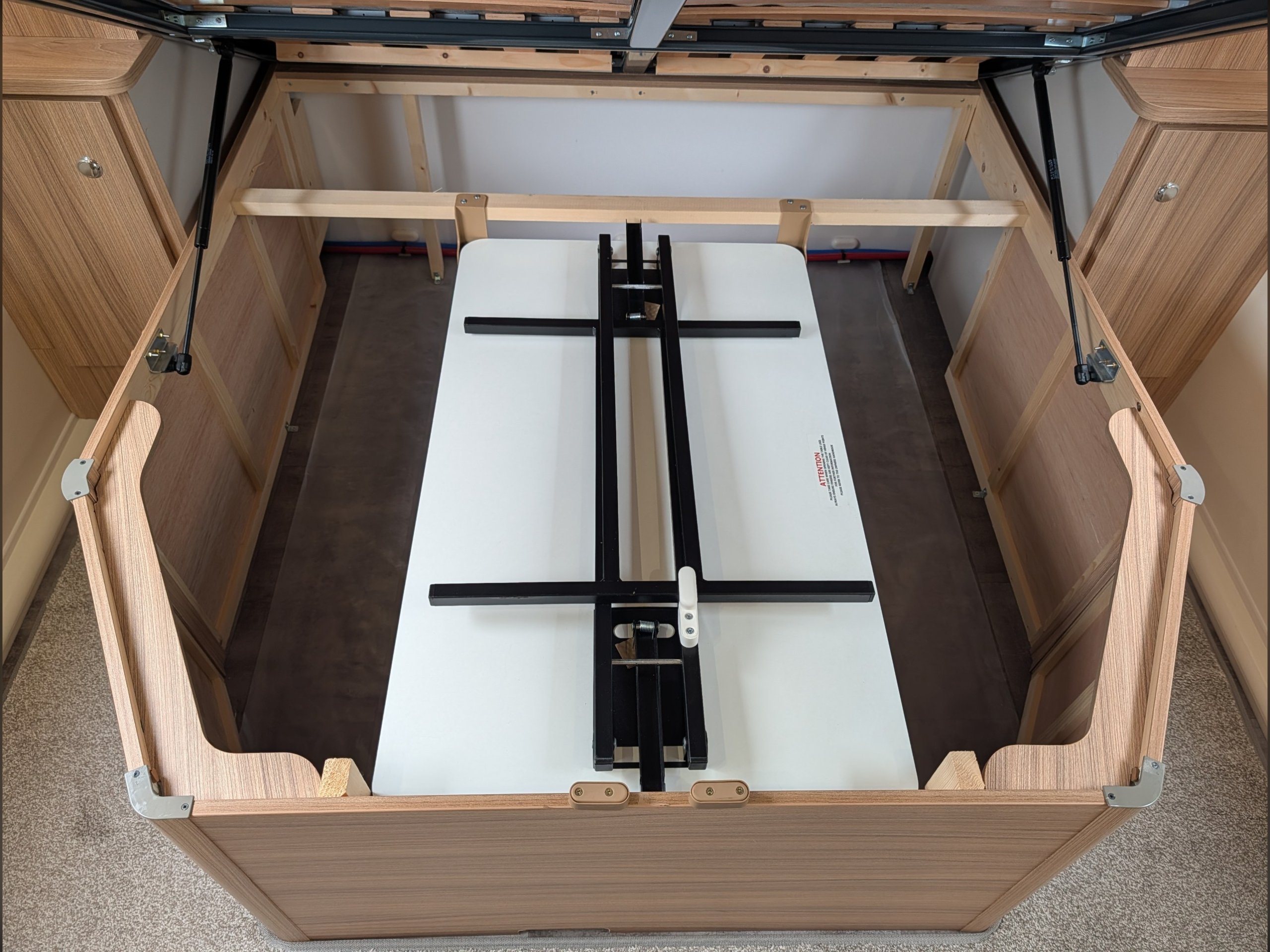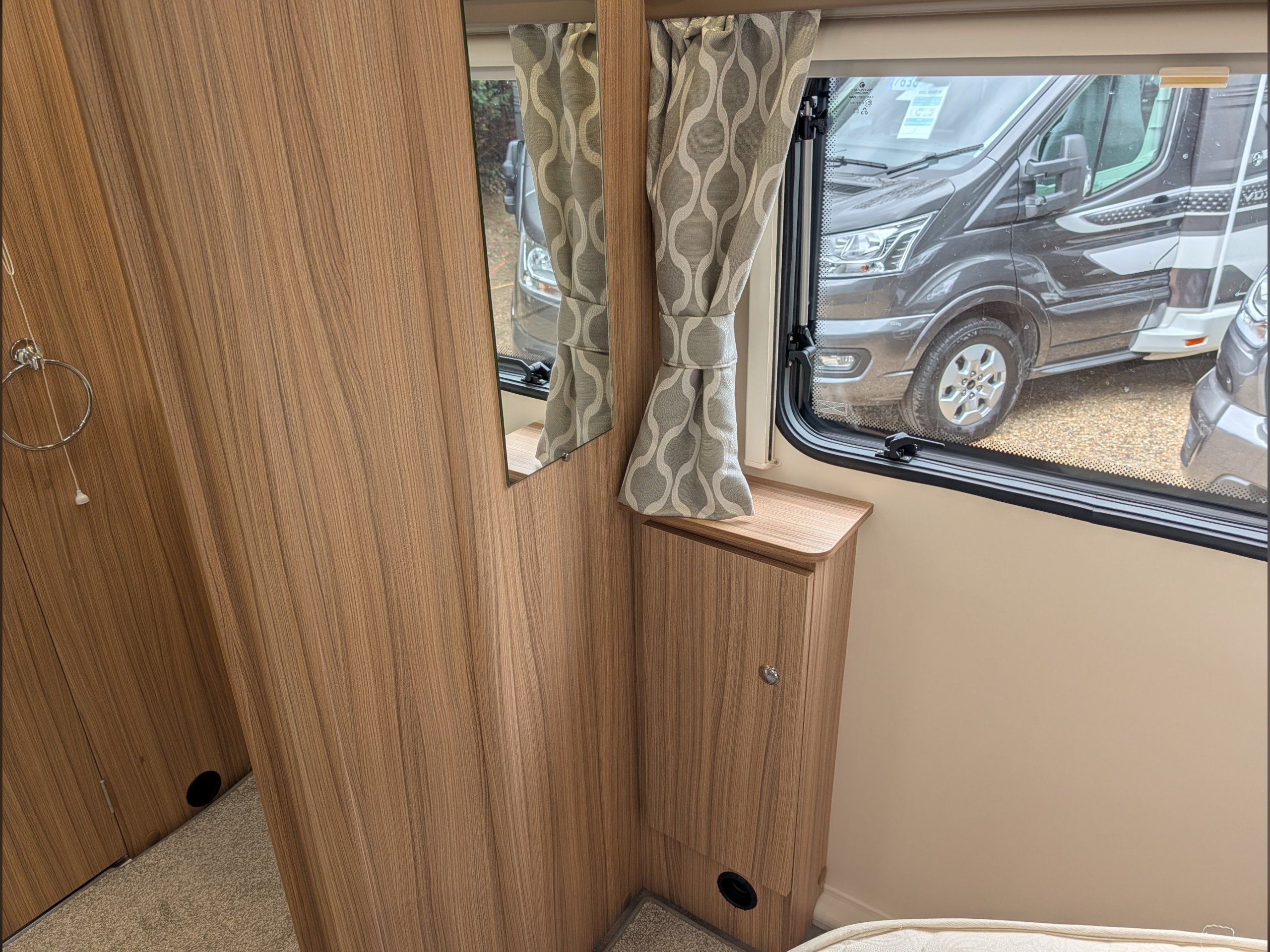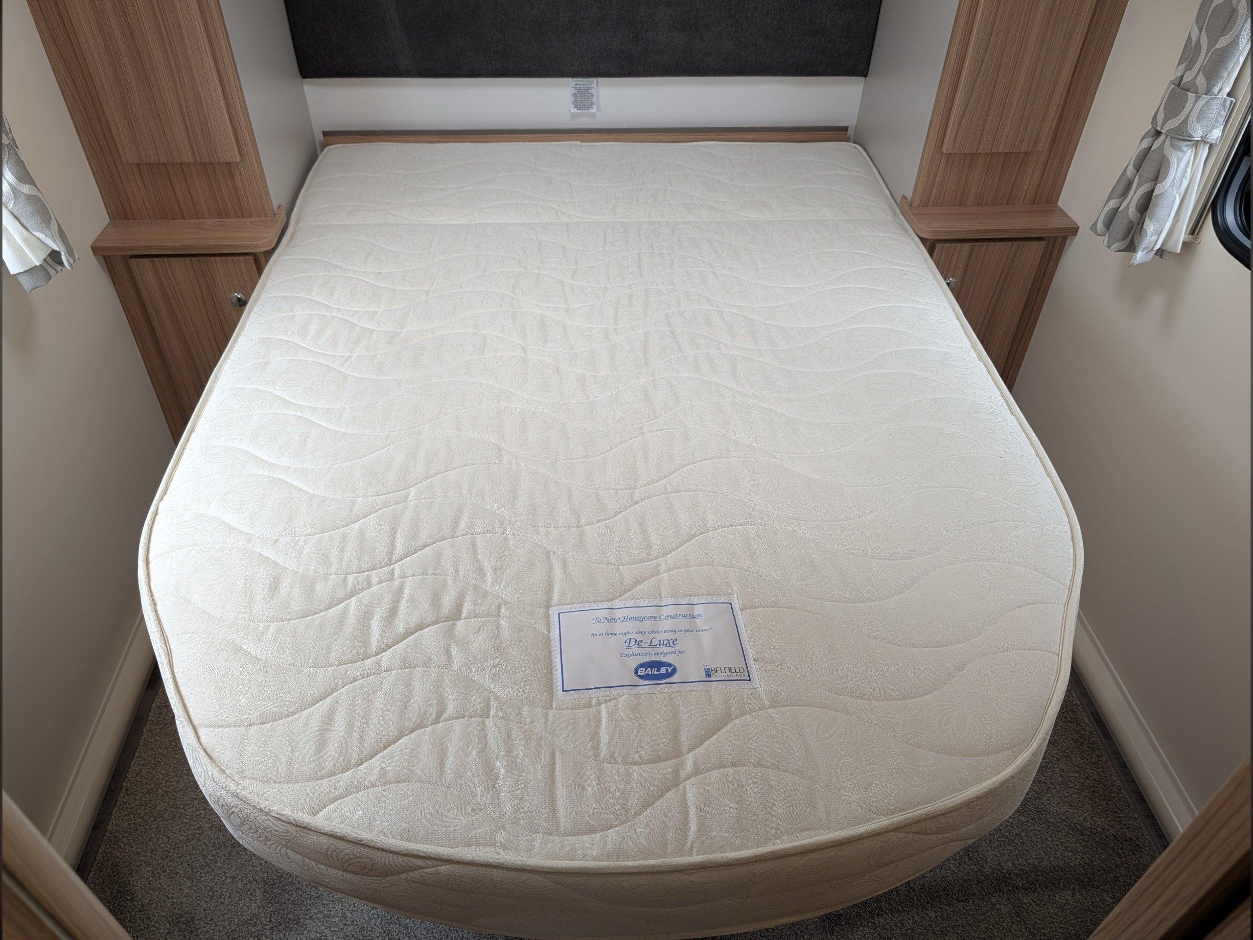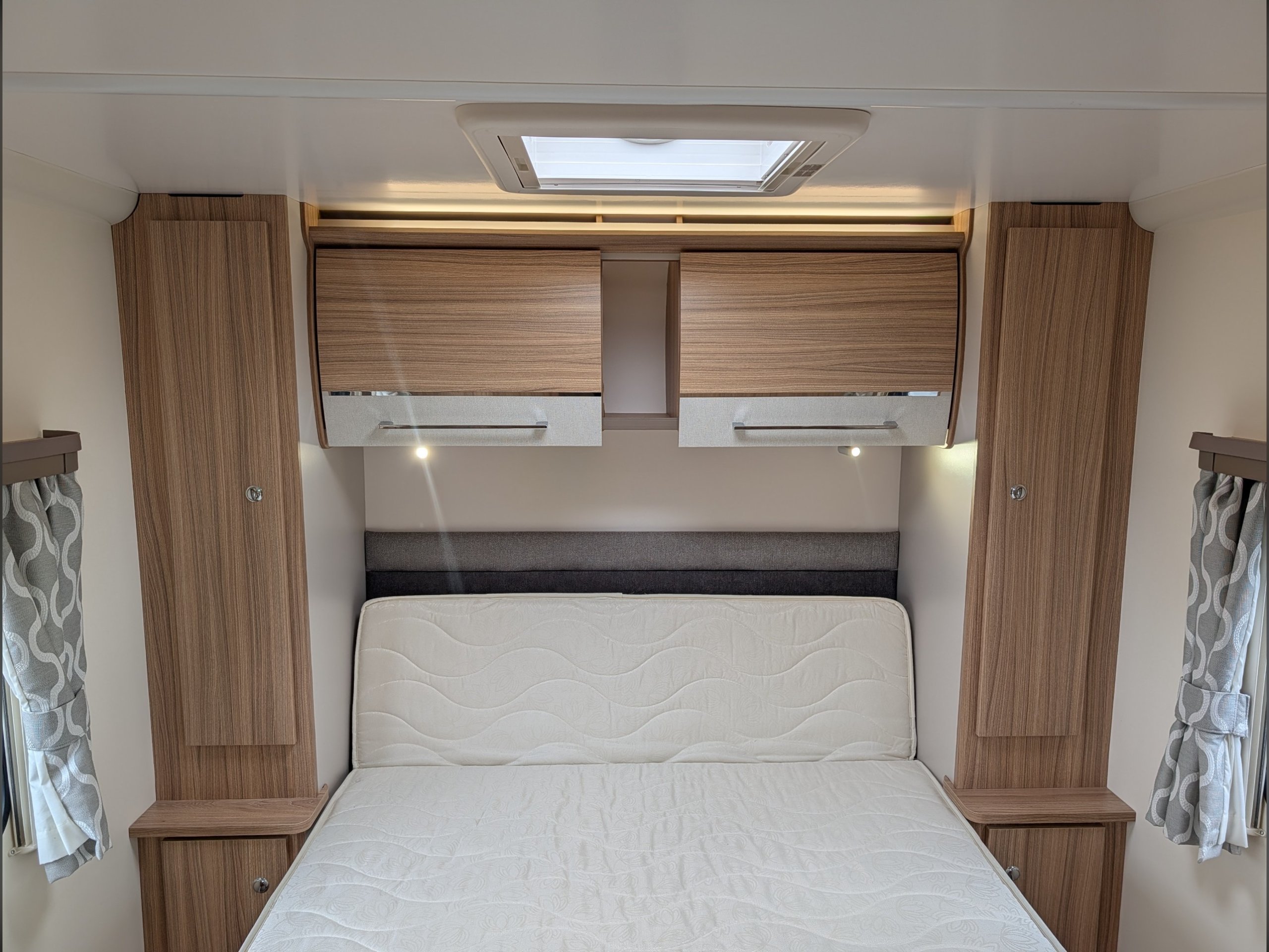 The rear bedroom features a fixed double island bed that can be pushed back to provide more daytime floor space.