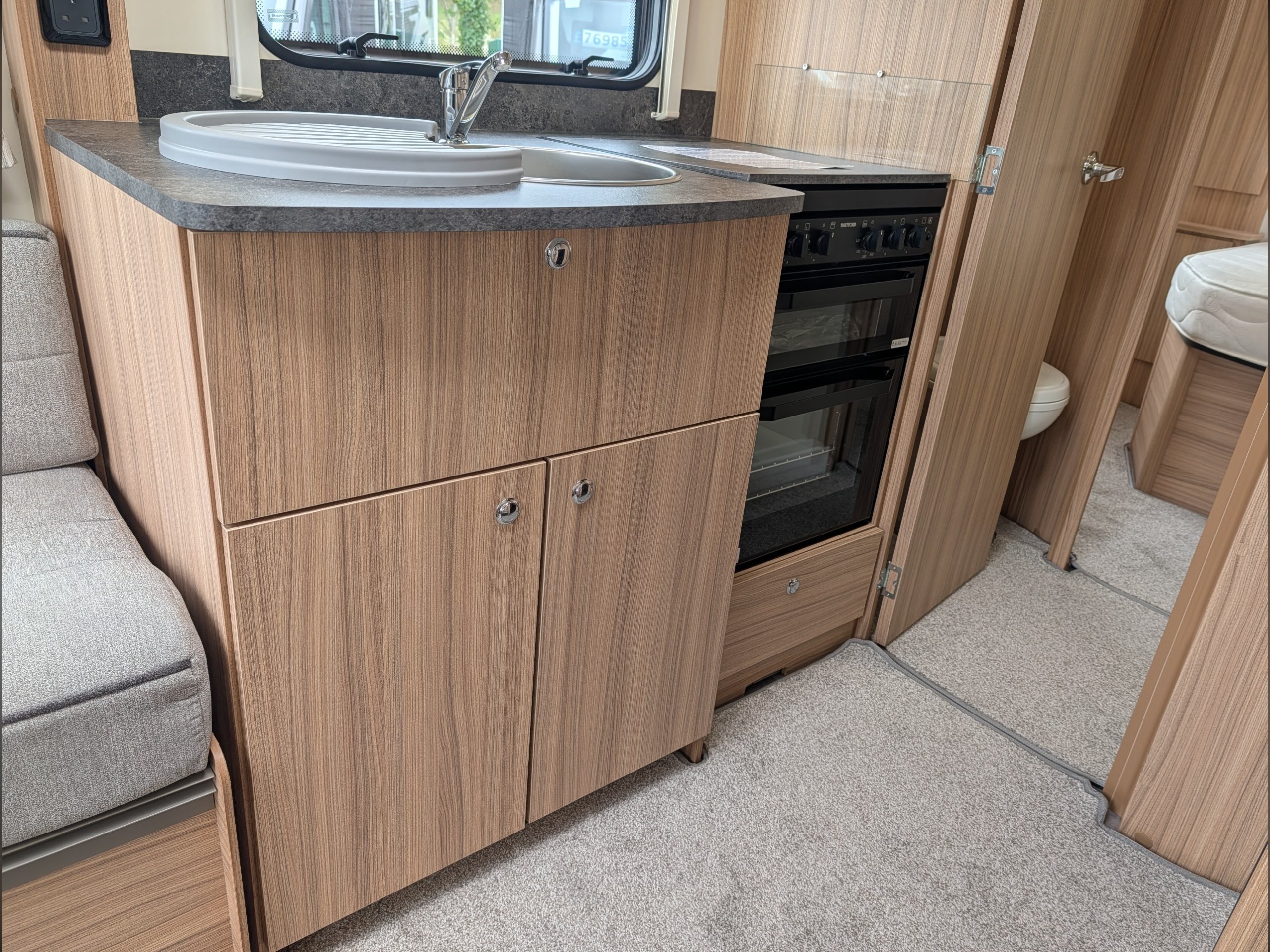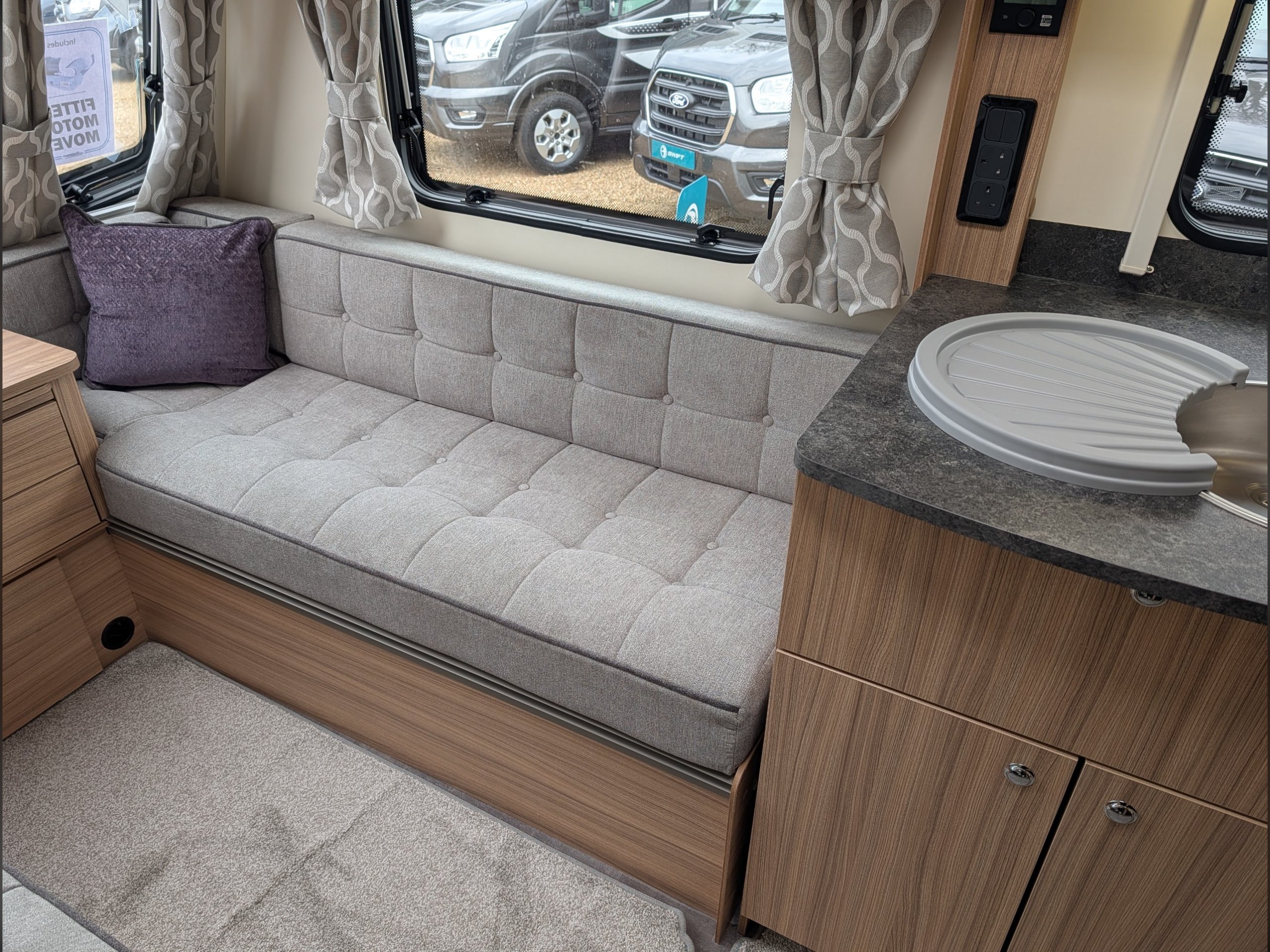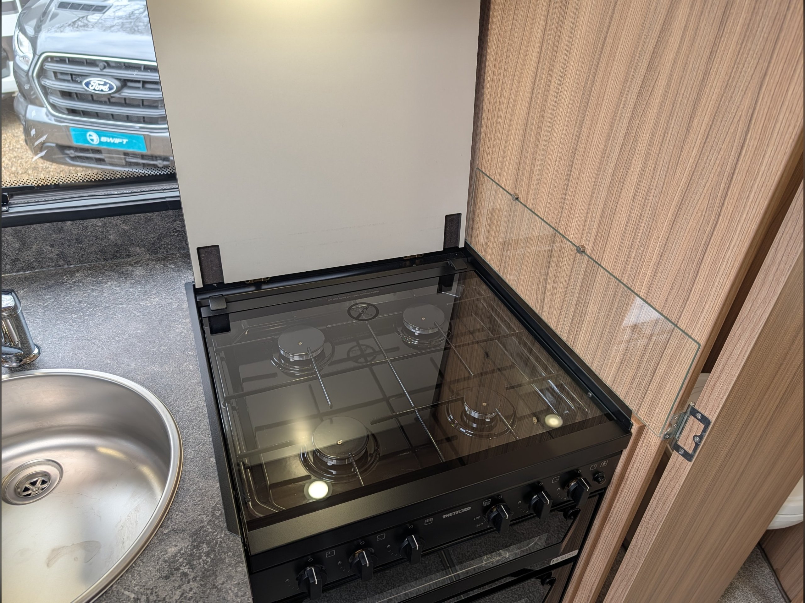 At the front , the lounge has two large bench seats that convert into a double bed or two single beds, and the kitchen is equipped with a Thetford 4-burner hob, grill, oven, and a Dometic fridge.