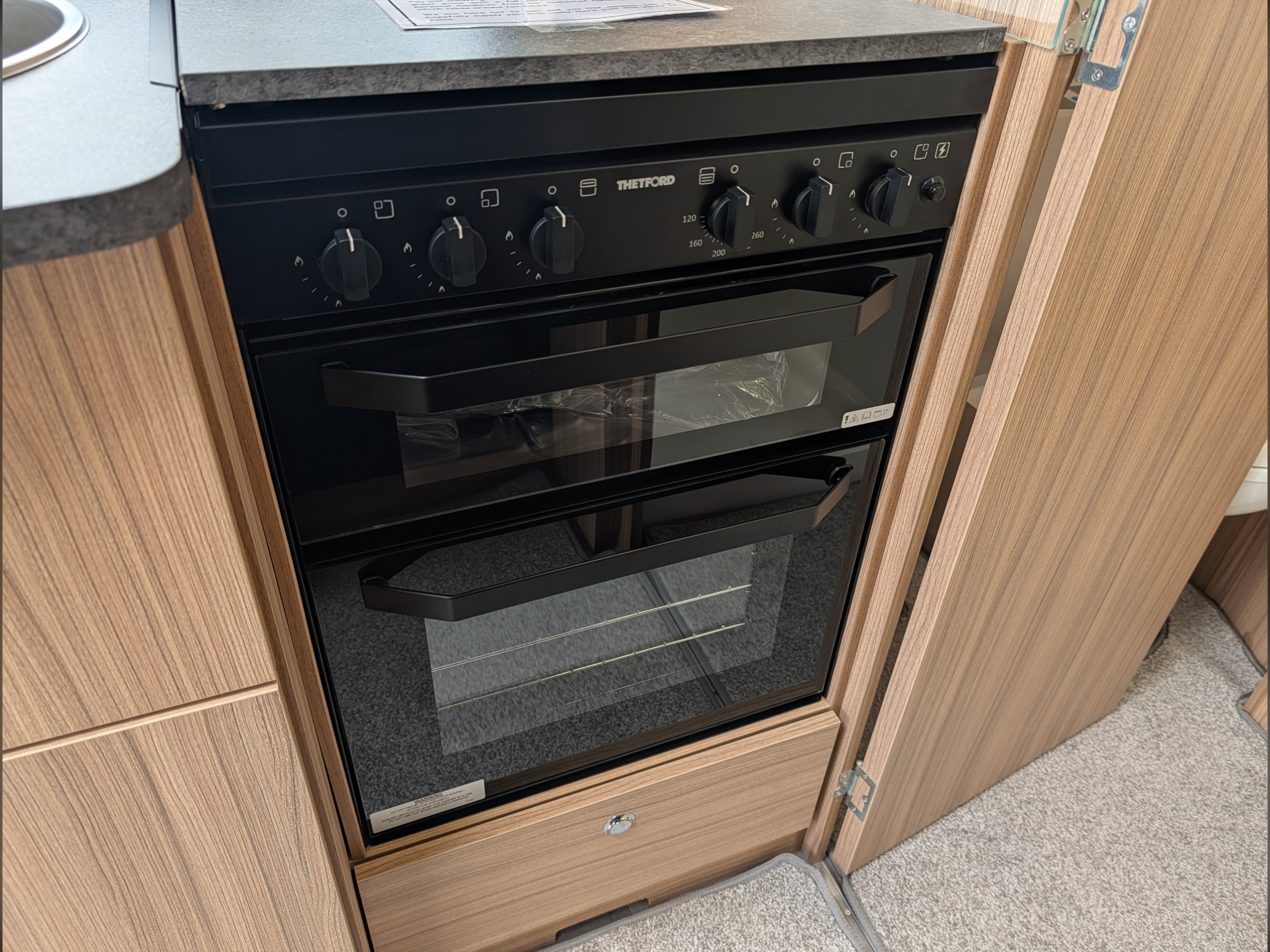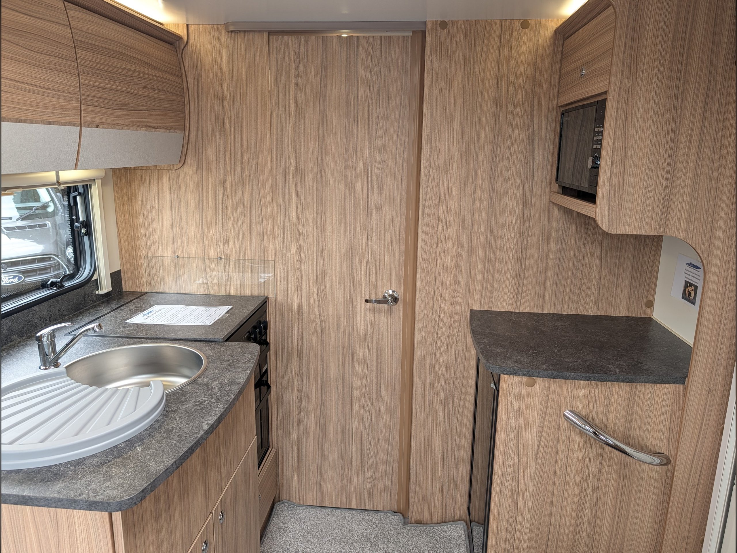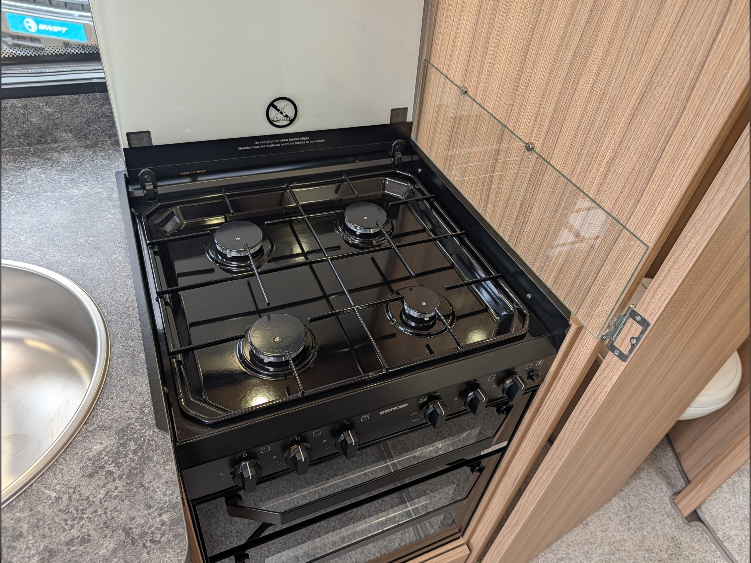 At the front , the lounge has two large bench seats that convert into a double bed or two single beds, and the kitchen is equipped with a Thetford 4-burner hob, grill, oven, and a Dometic fridge.