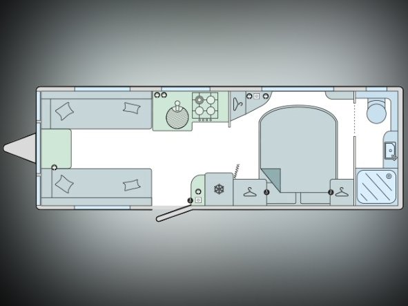 Twin Axle, 4 berth, transverse island bed, end washroom layout. Load margin: 159kg.