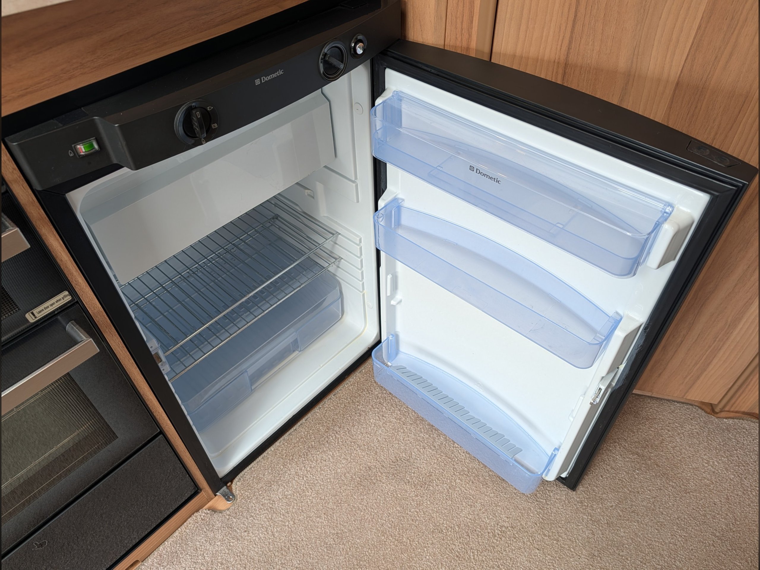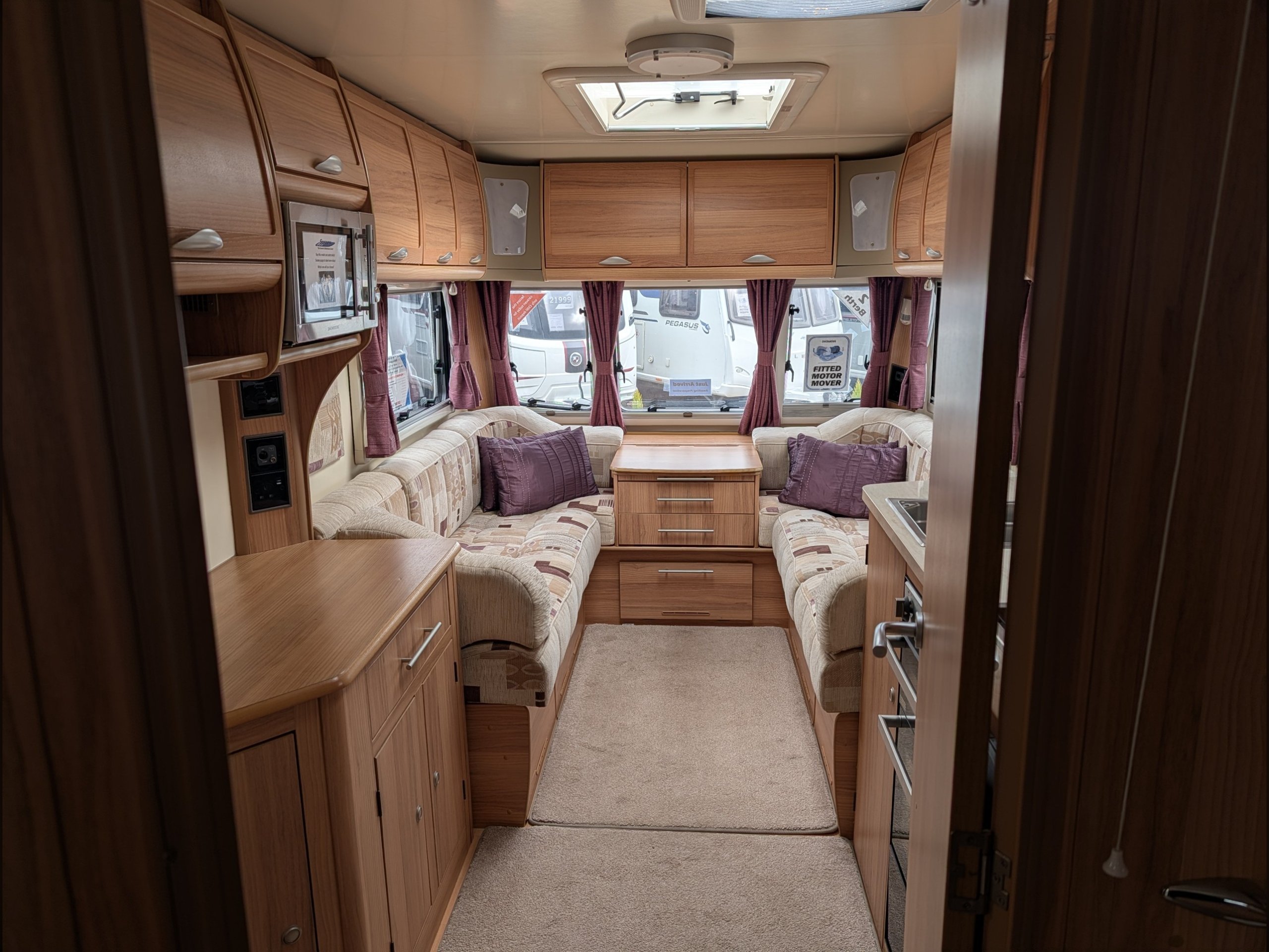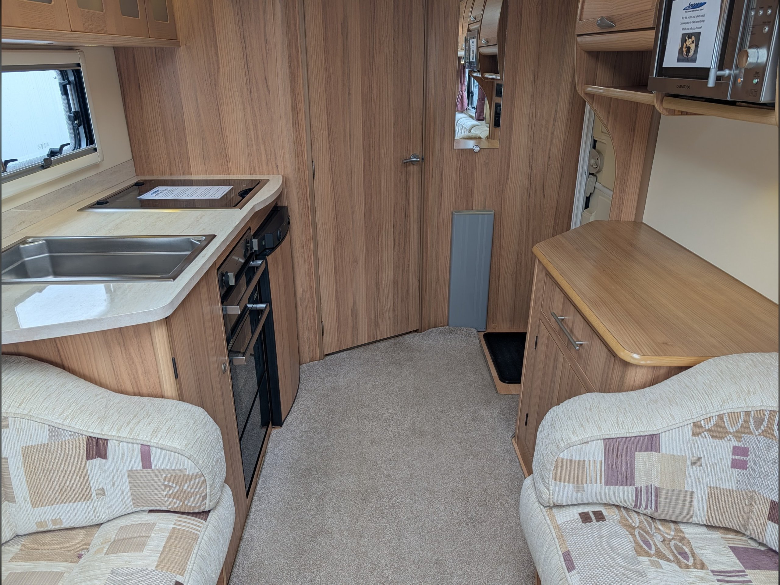 The central kitchen is situated between the lounge and rear washroom, and includes a 4-burner gas hob, separate oven and grill, a Dometic 3-way fridge with freezer, and a 240v microwave.