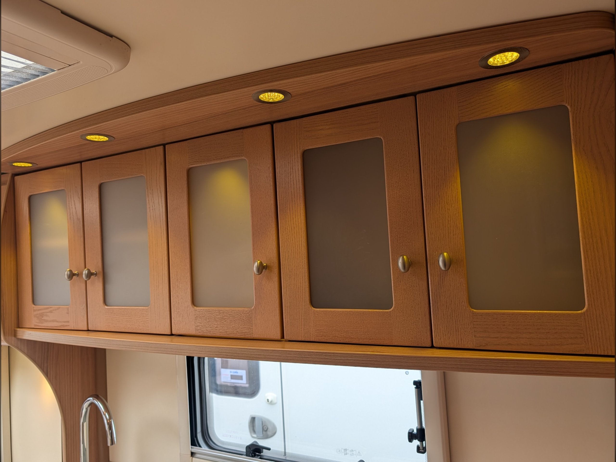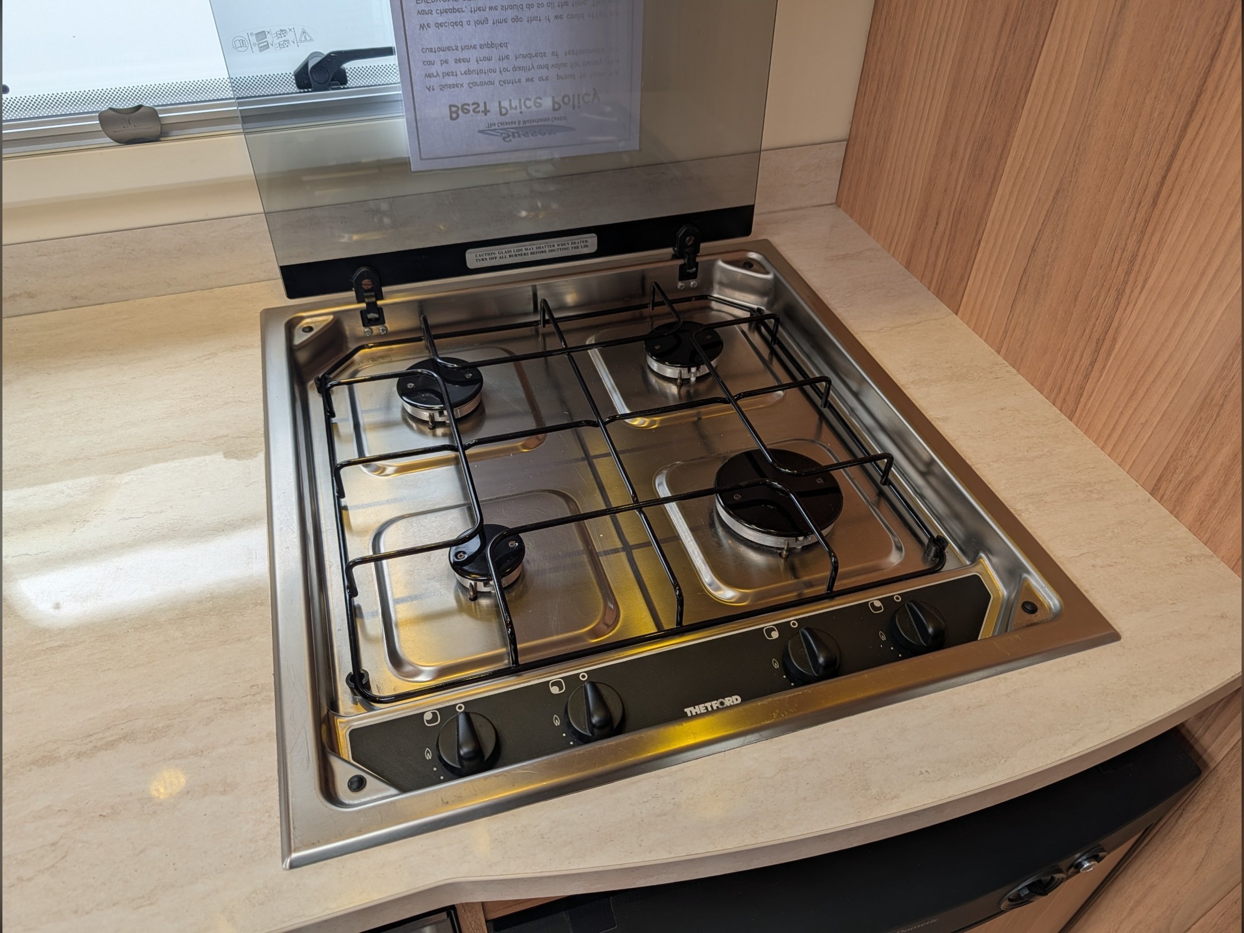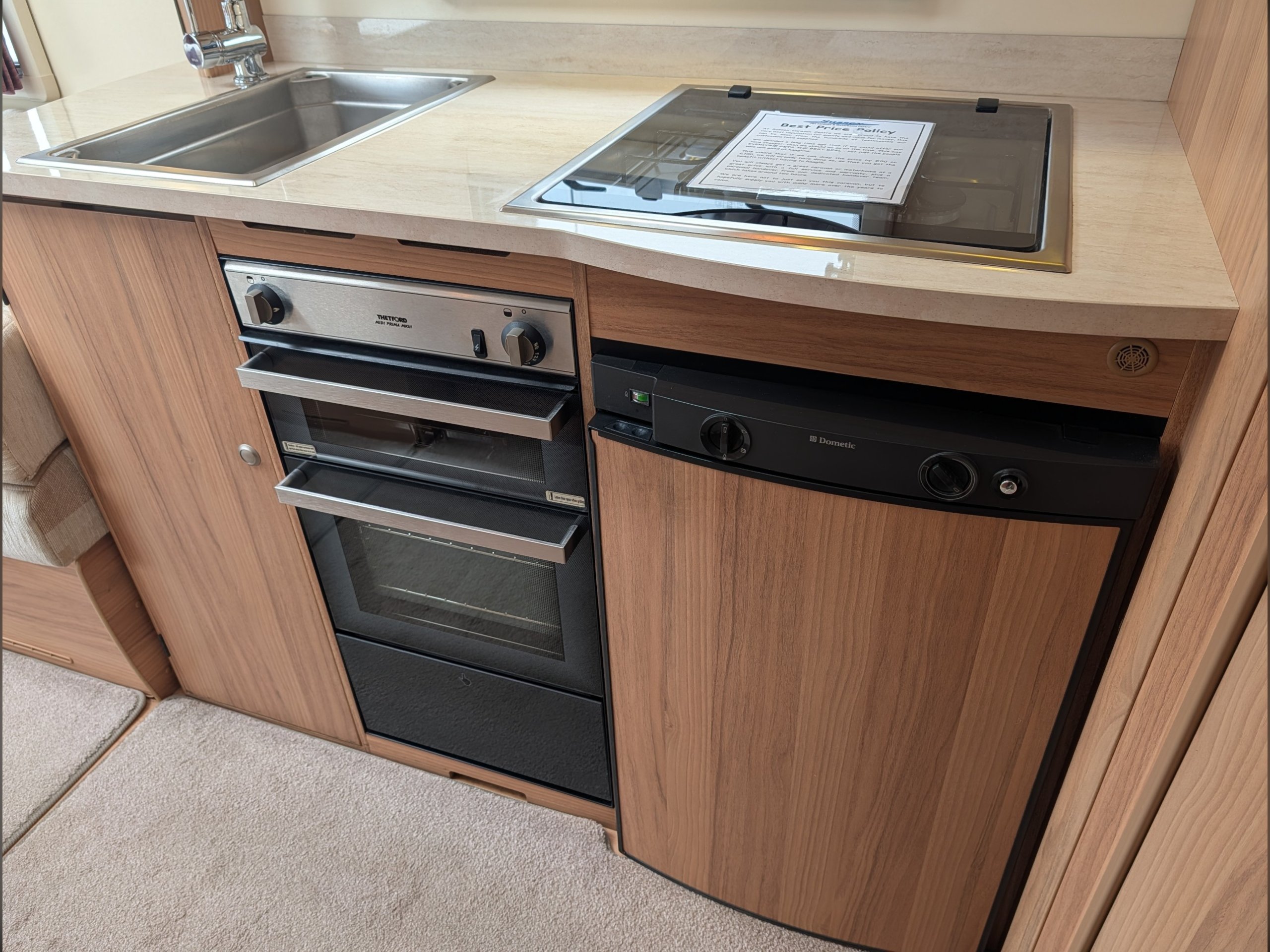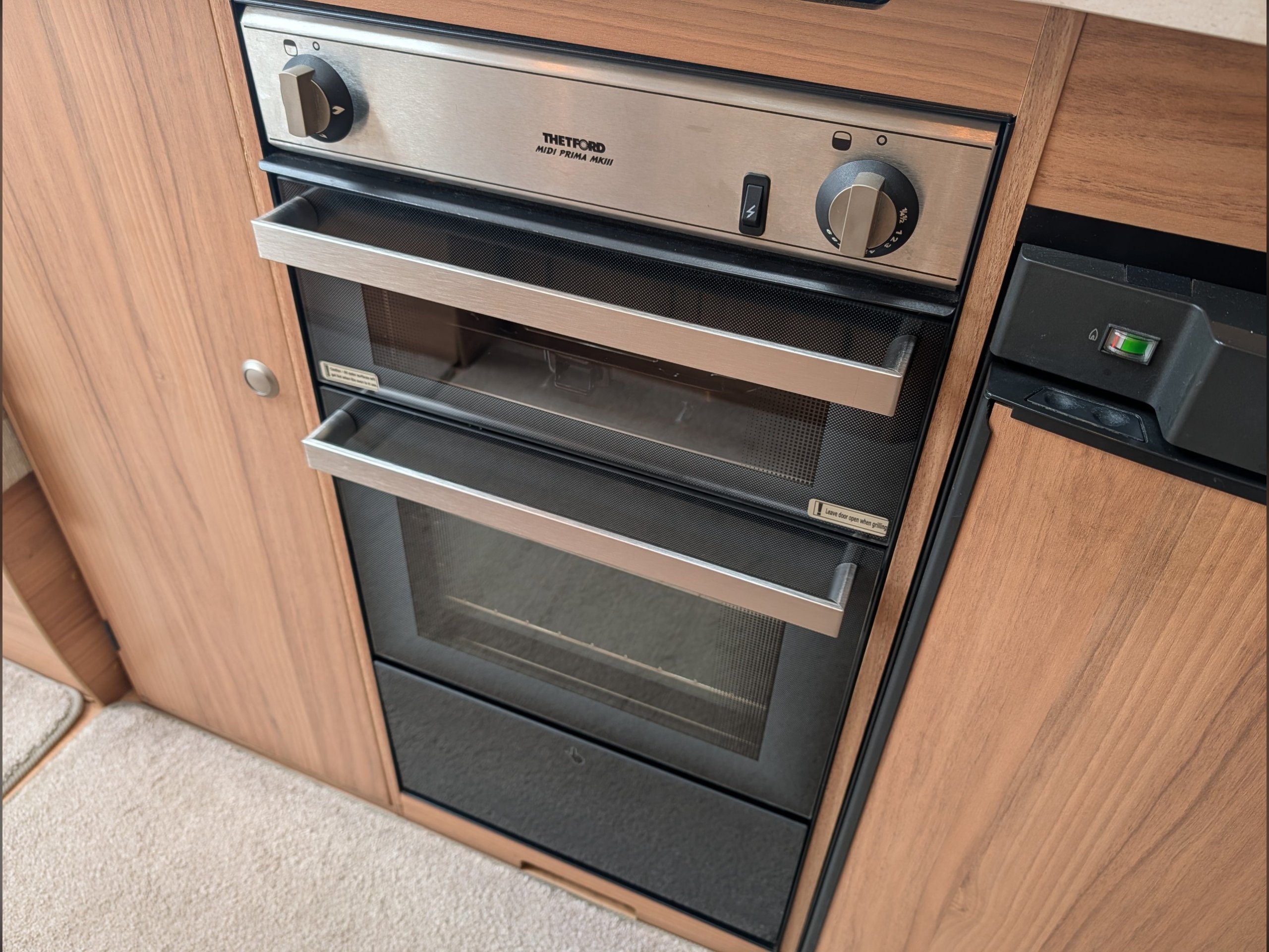 The central kitchen is situated between the lounge and rear washroom, and includes a 4-burner gas hob, separate oven and grill, a Dometic 3-way fridge with freezer, and a 240v microwave.