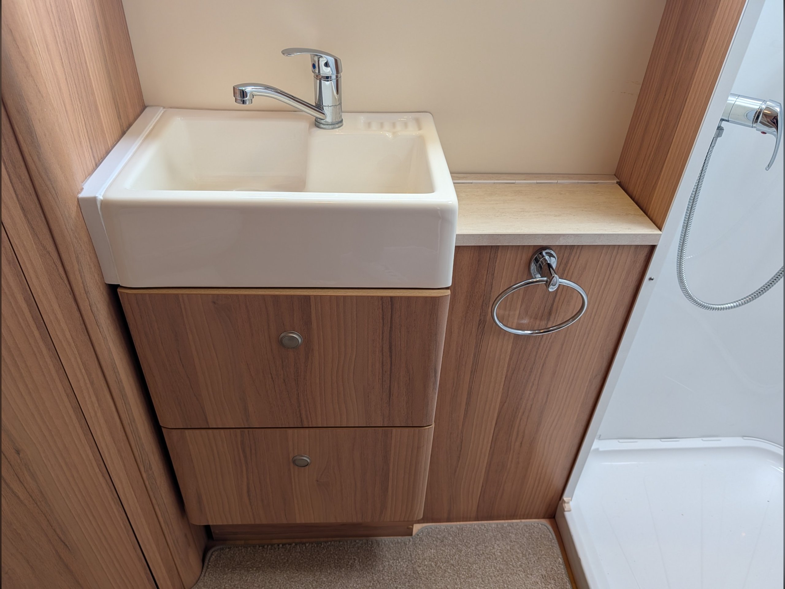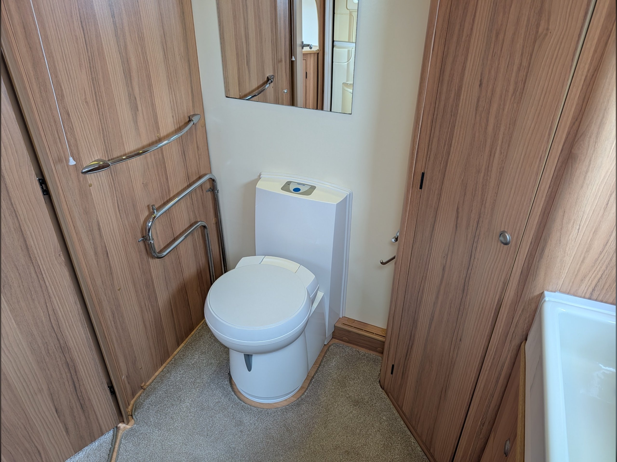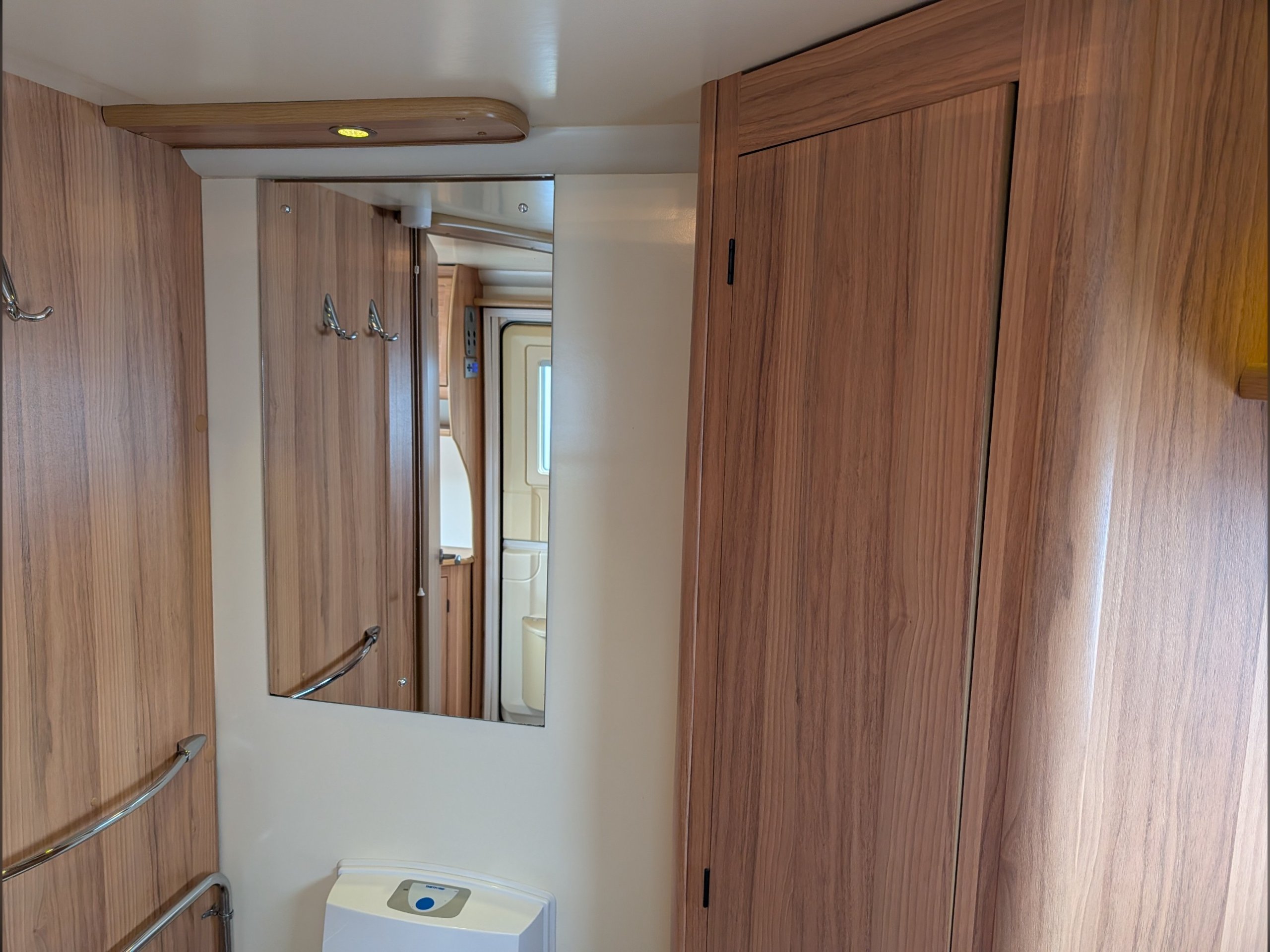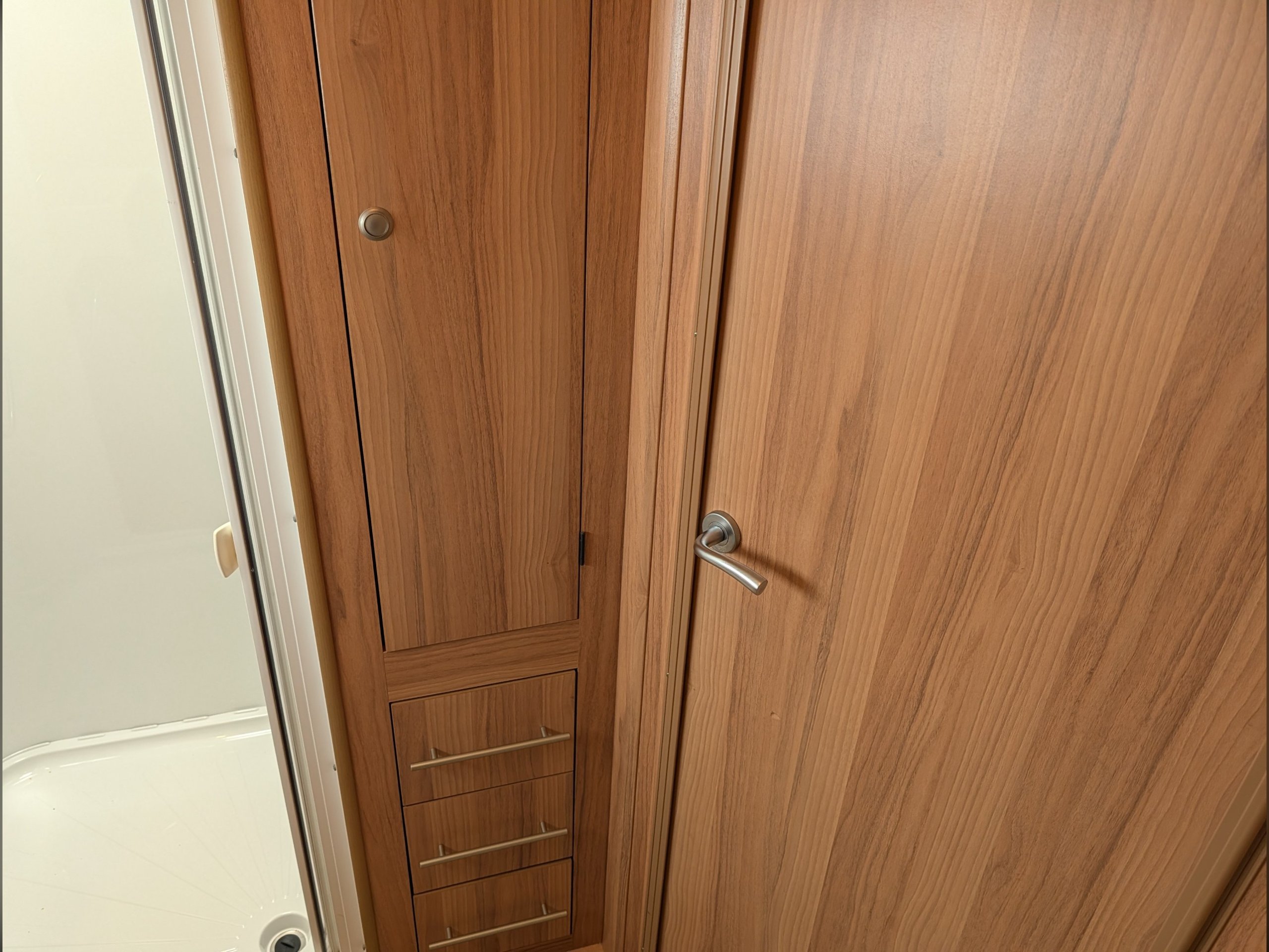 There is a fully lined shower cubicle, Thetford electric flush toilet, washbasin and a full-length wardrobe with additional drawers/cupboards