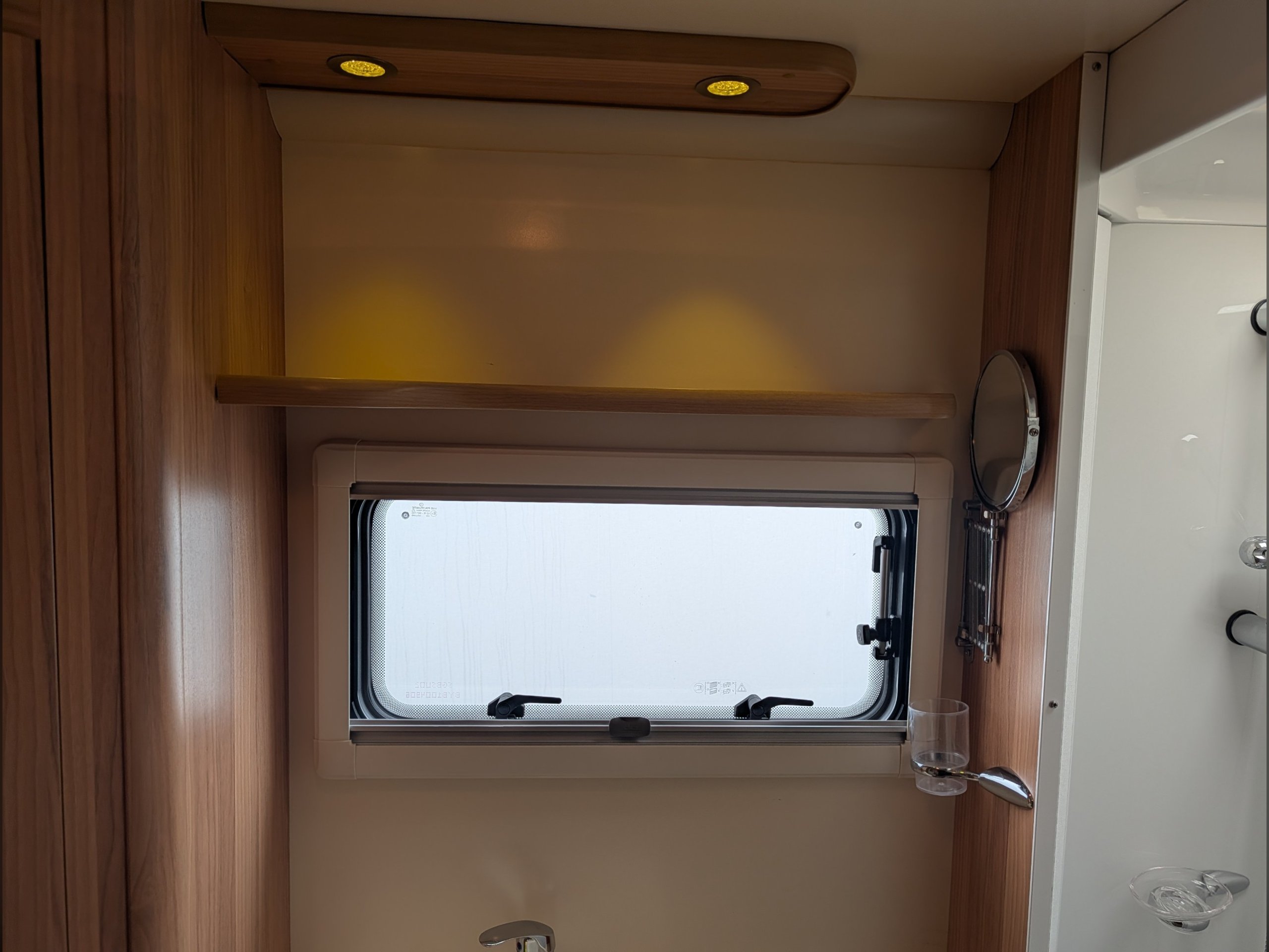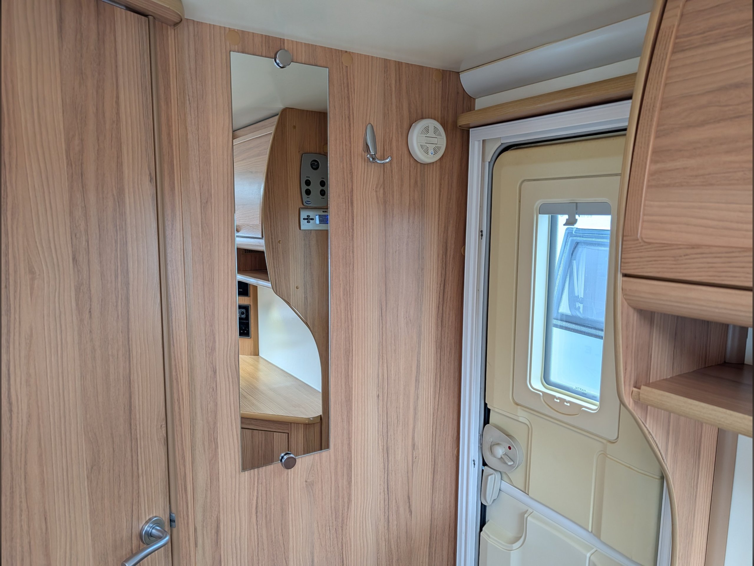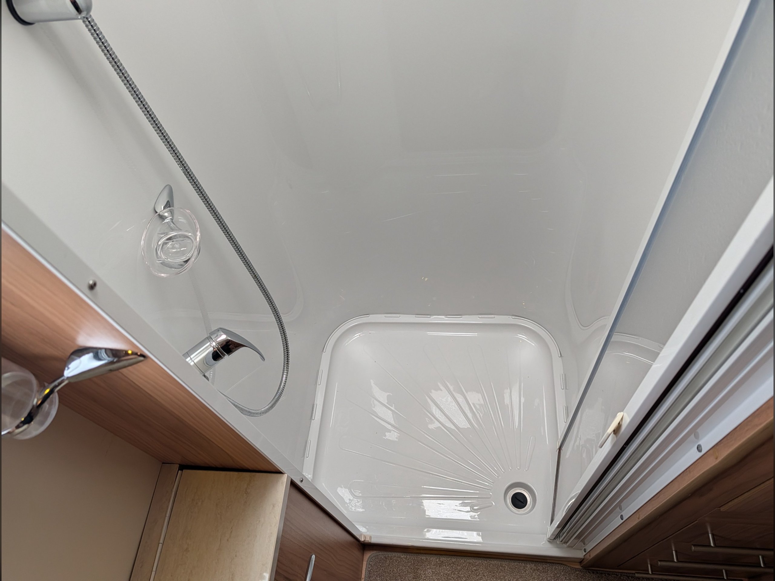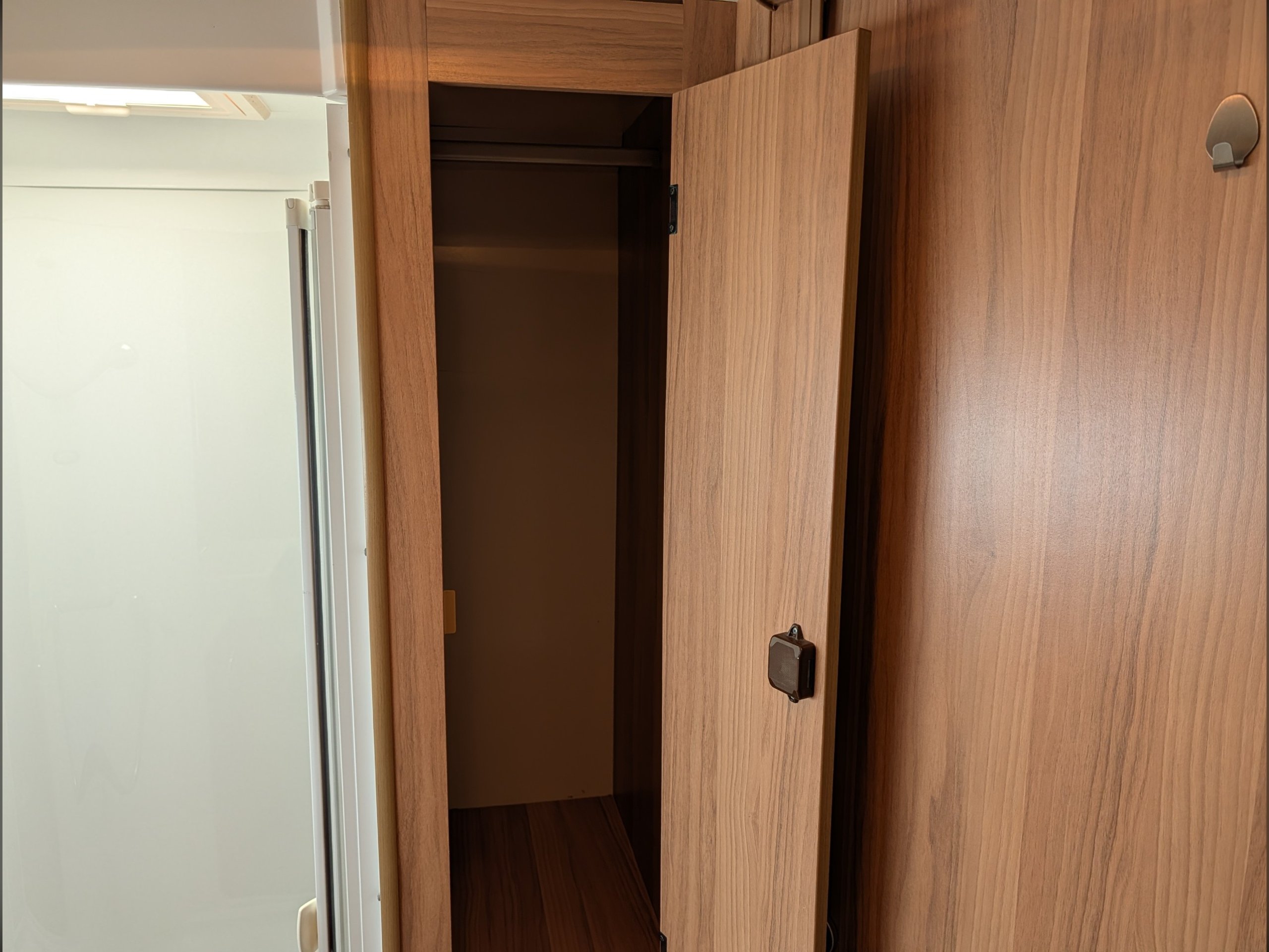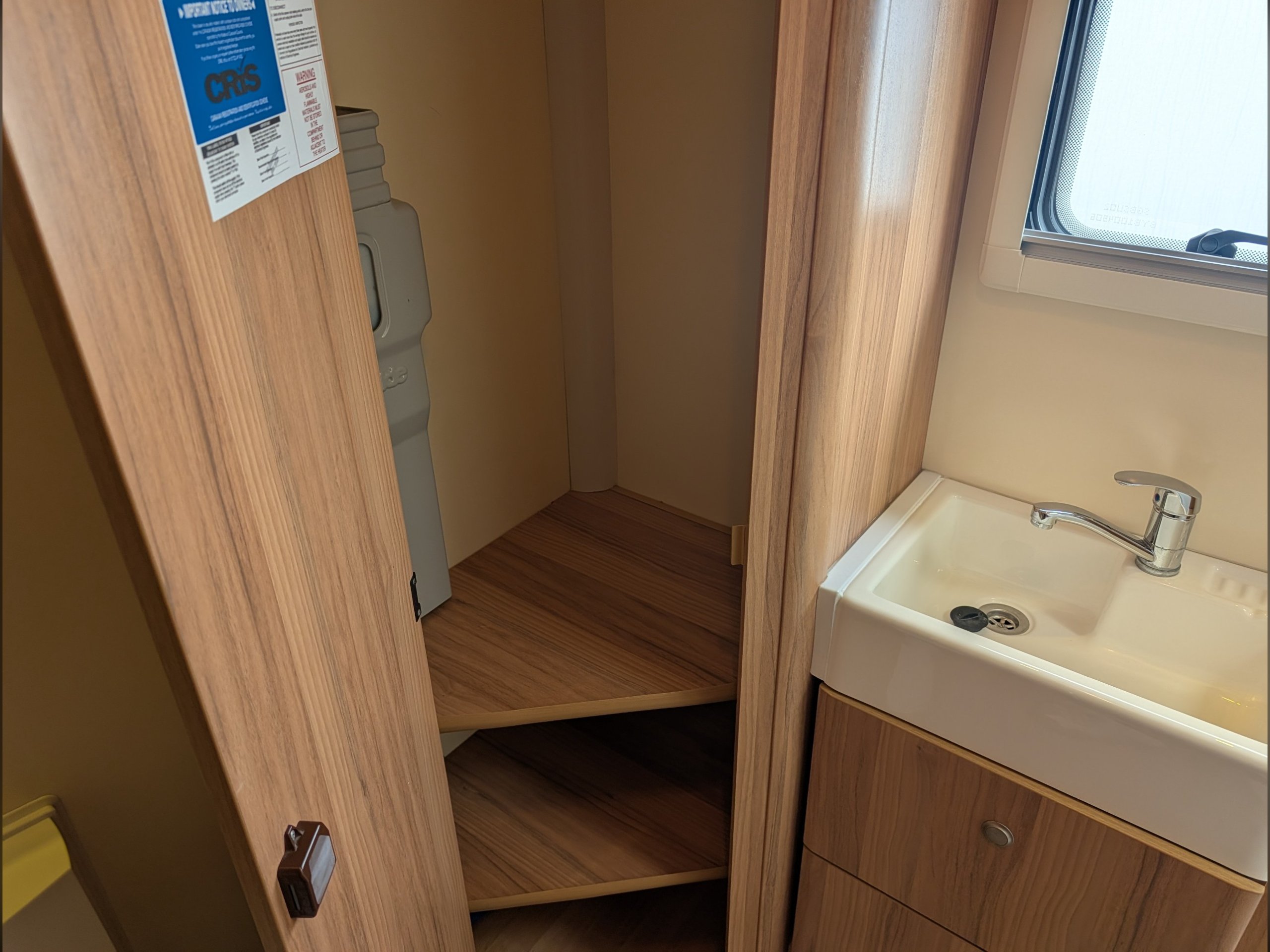 There is a fully lined shower cubicle, Thetford electric flush toilet, washbasin and a full-length wardrobe with additional drawers/cupboards