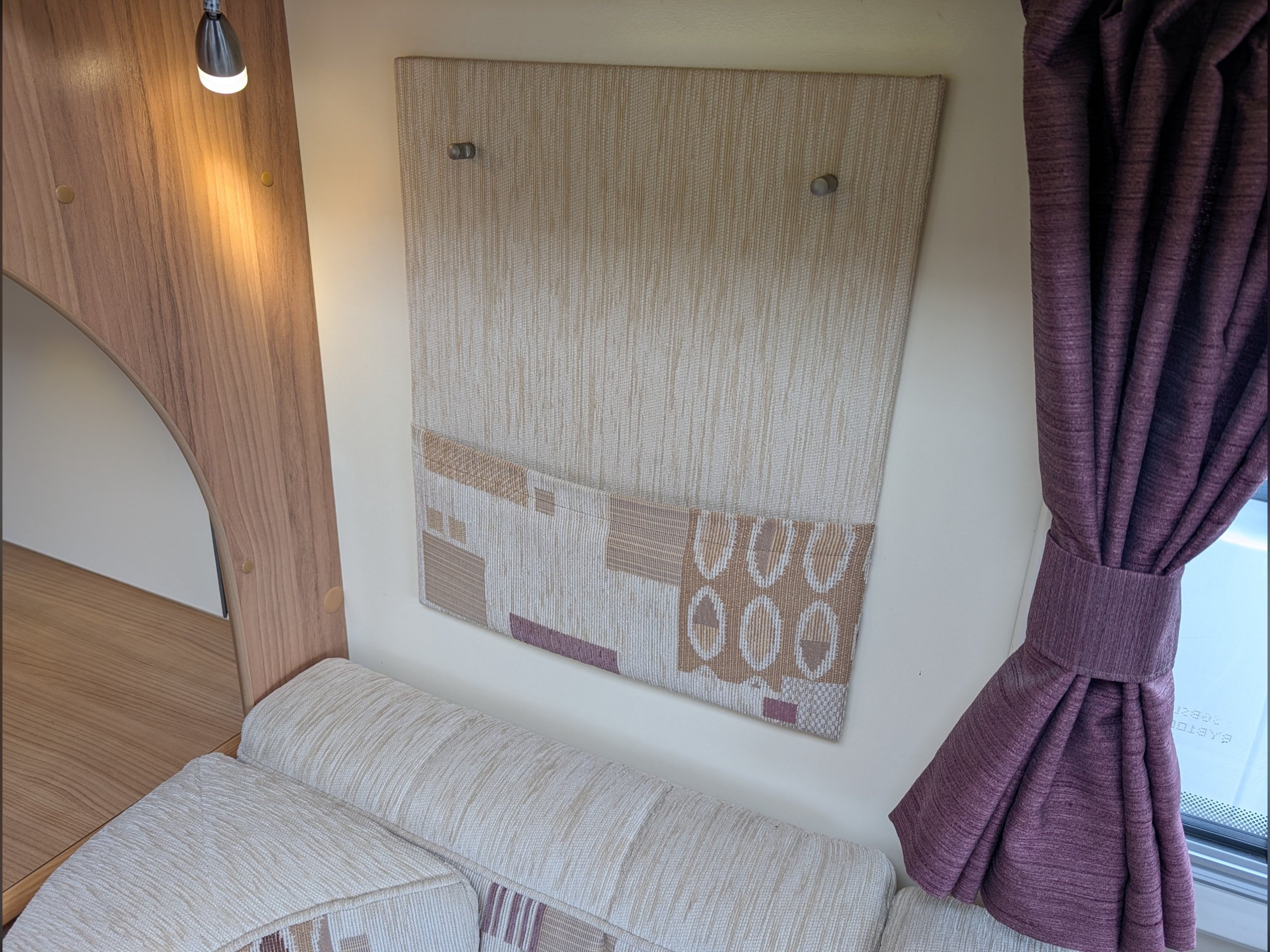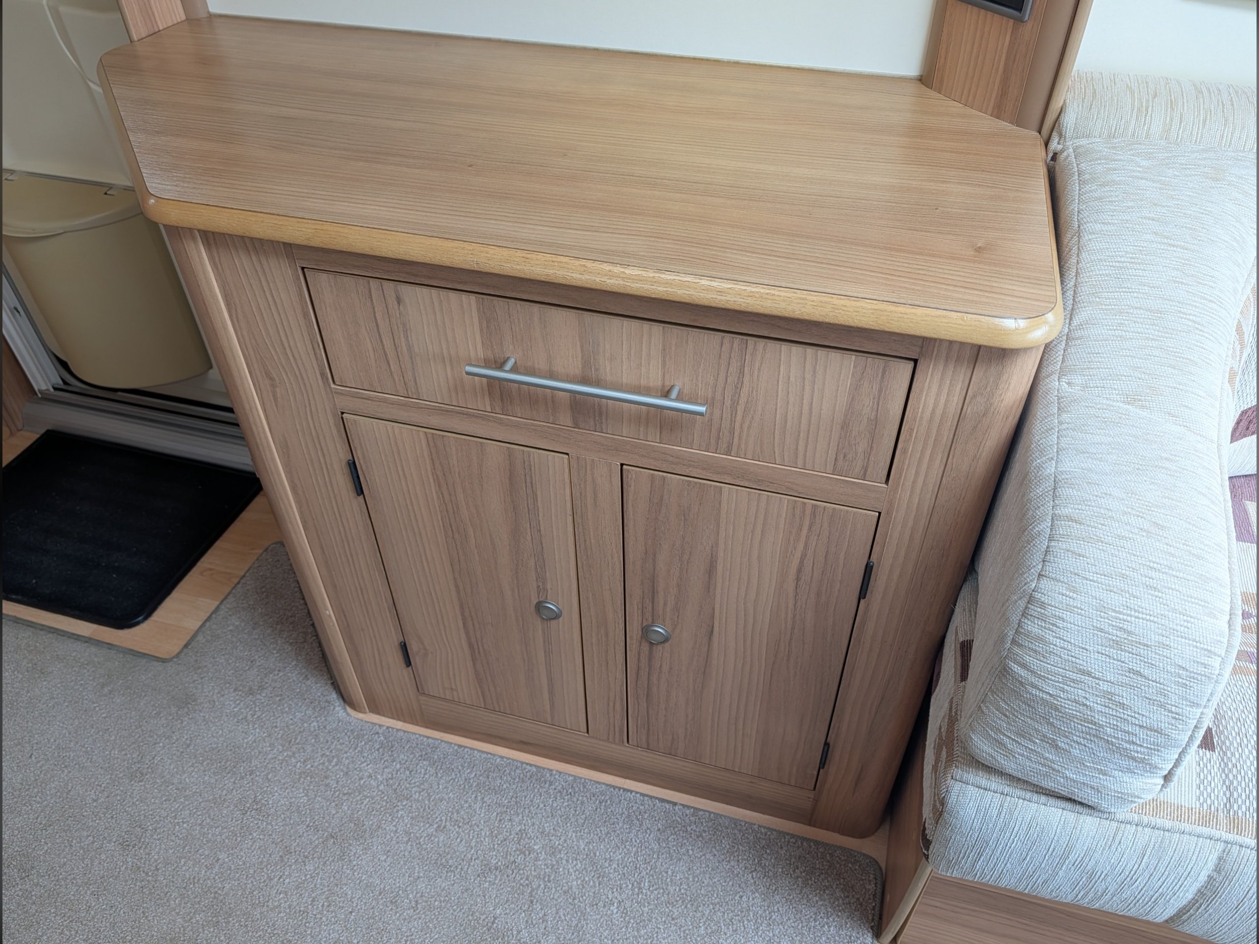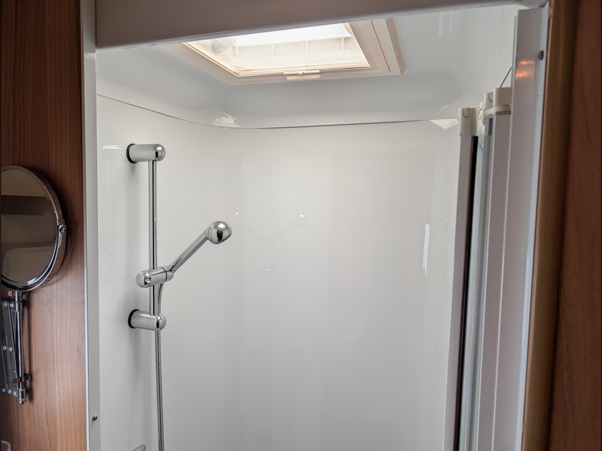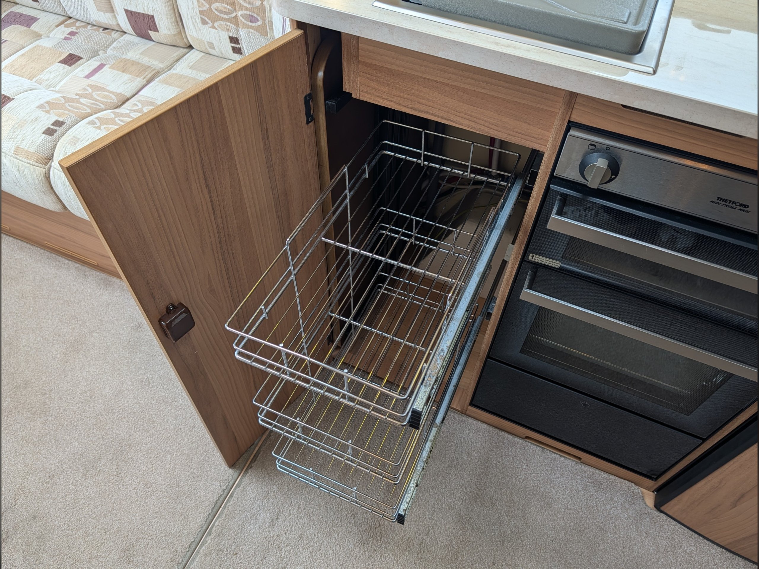 There is a fully lined shower cubicle, Thetford electric flush toilet, washbasin and a full-length wardrobe with additional drawers/cupboards