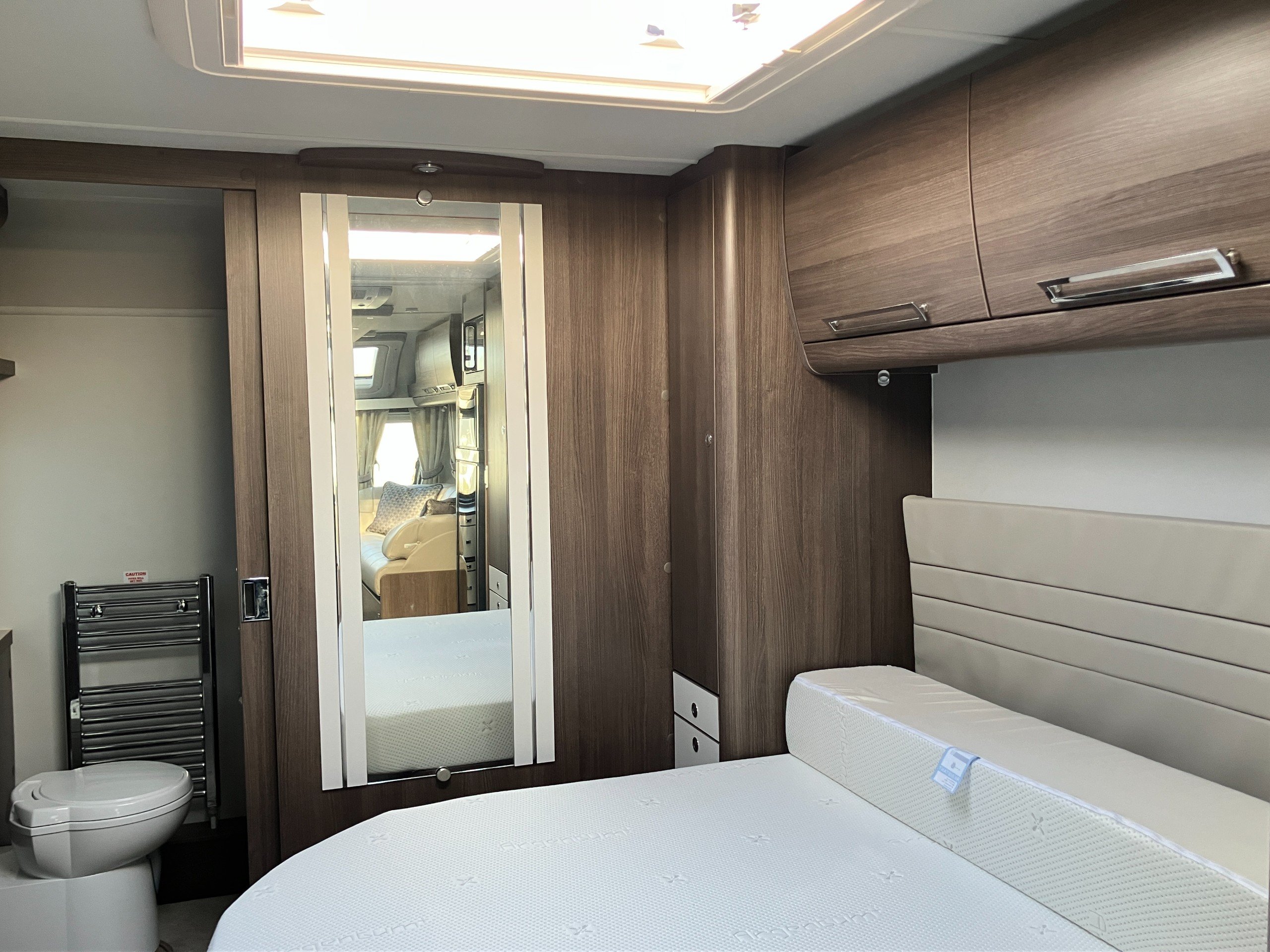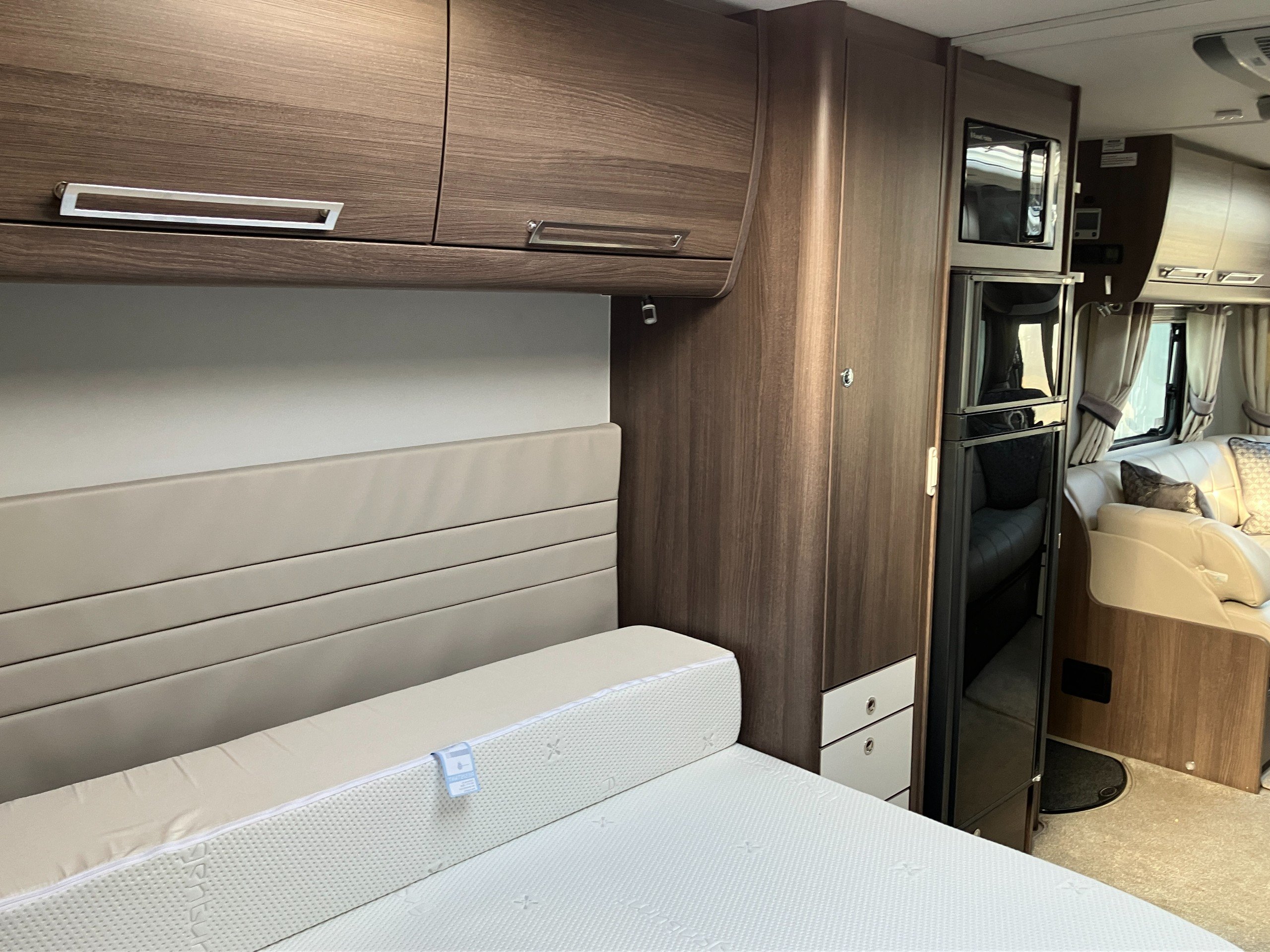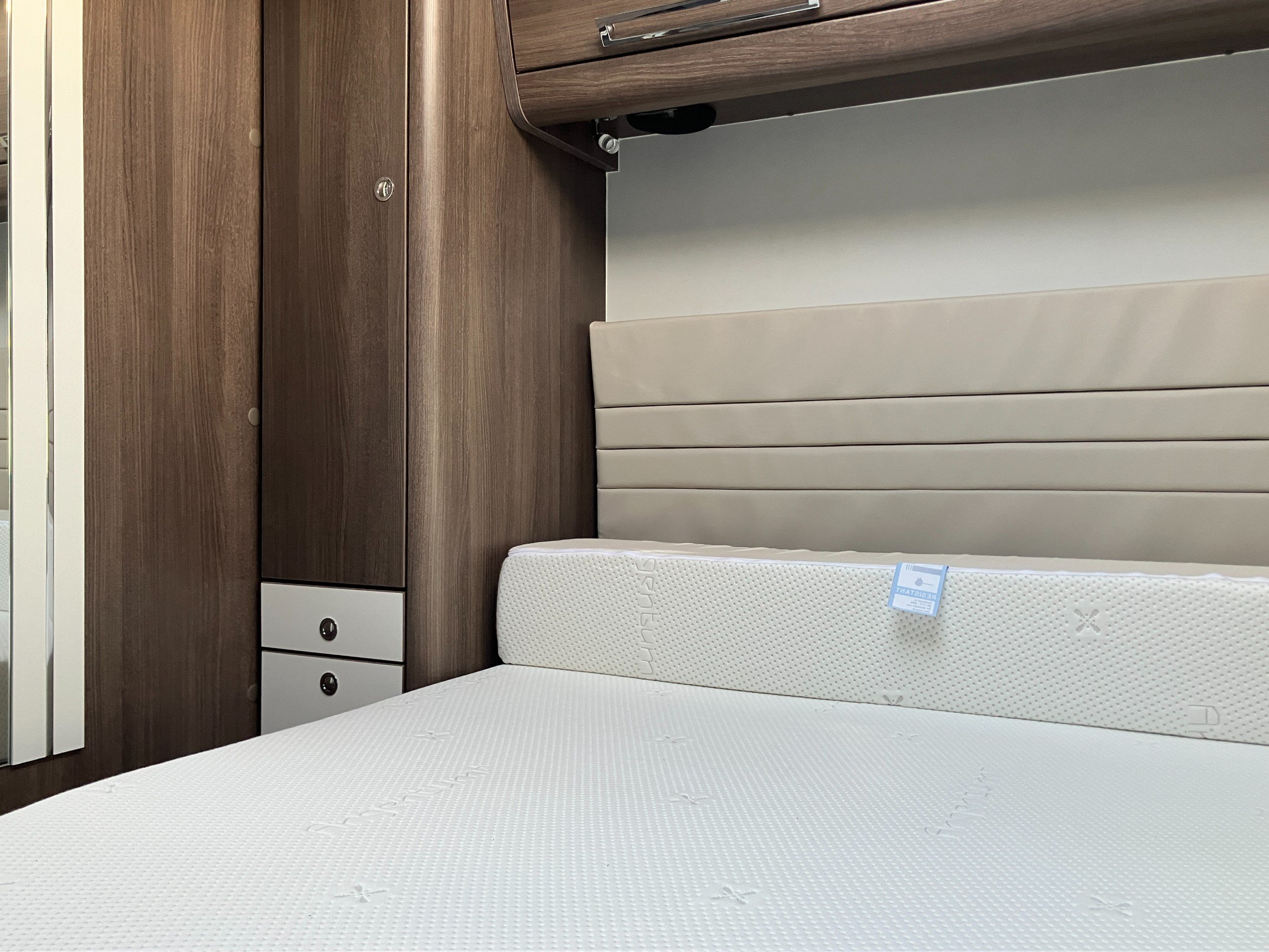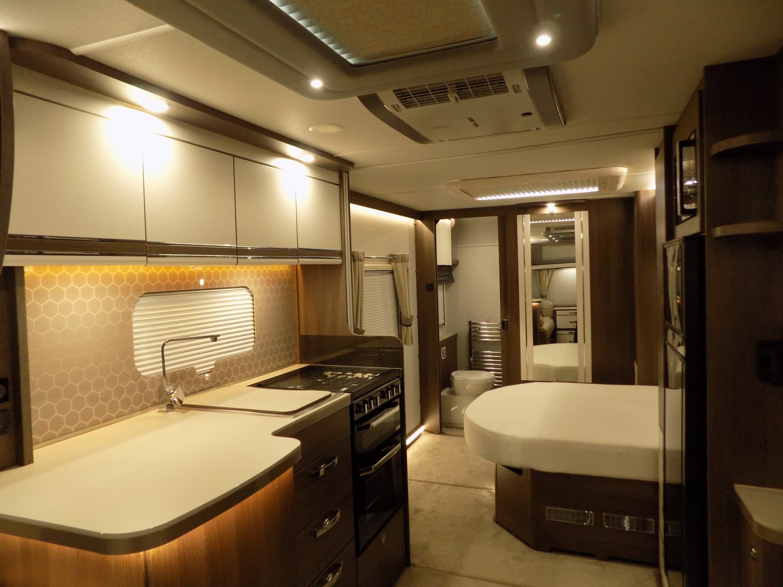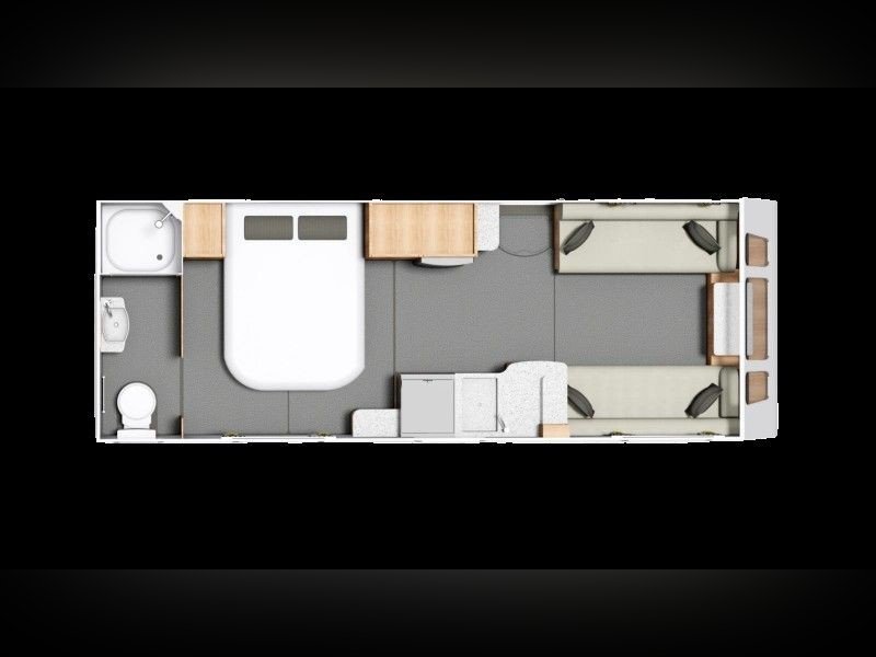 Twin axle, 8ft Wide, 4 berth, transverse bed, rear washroom layout. Load margin: 234kg.