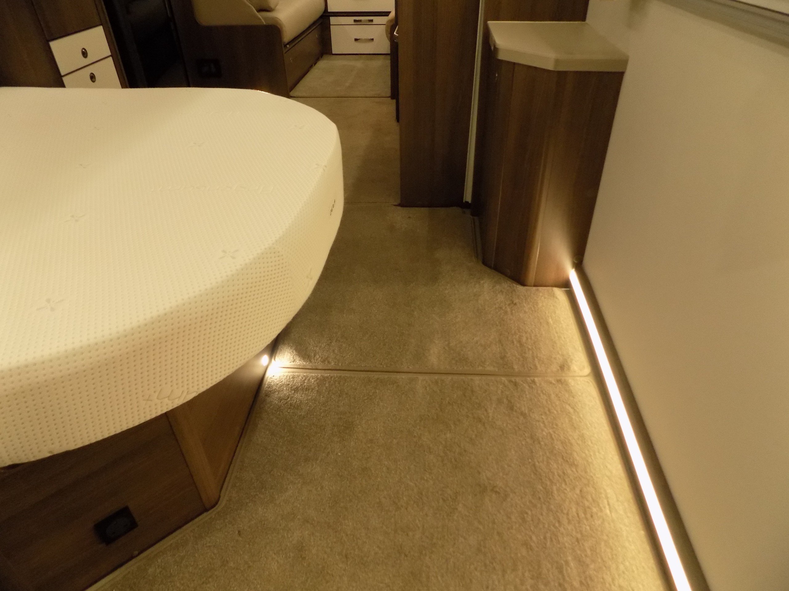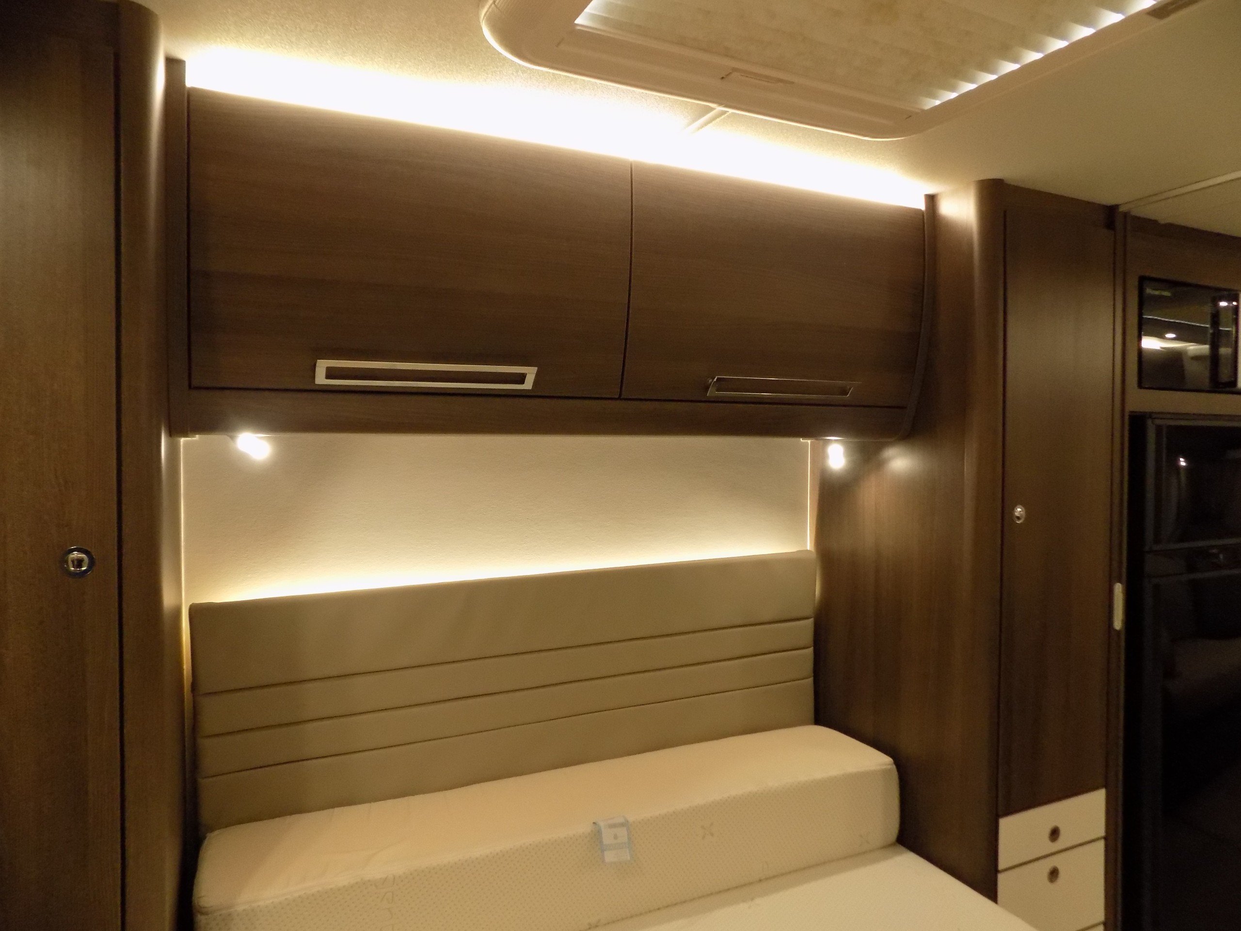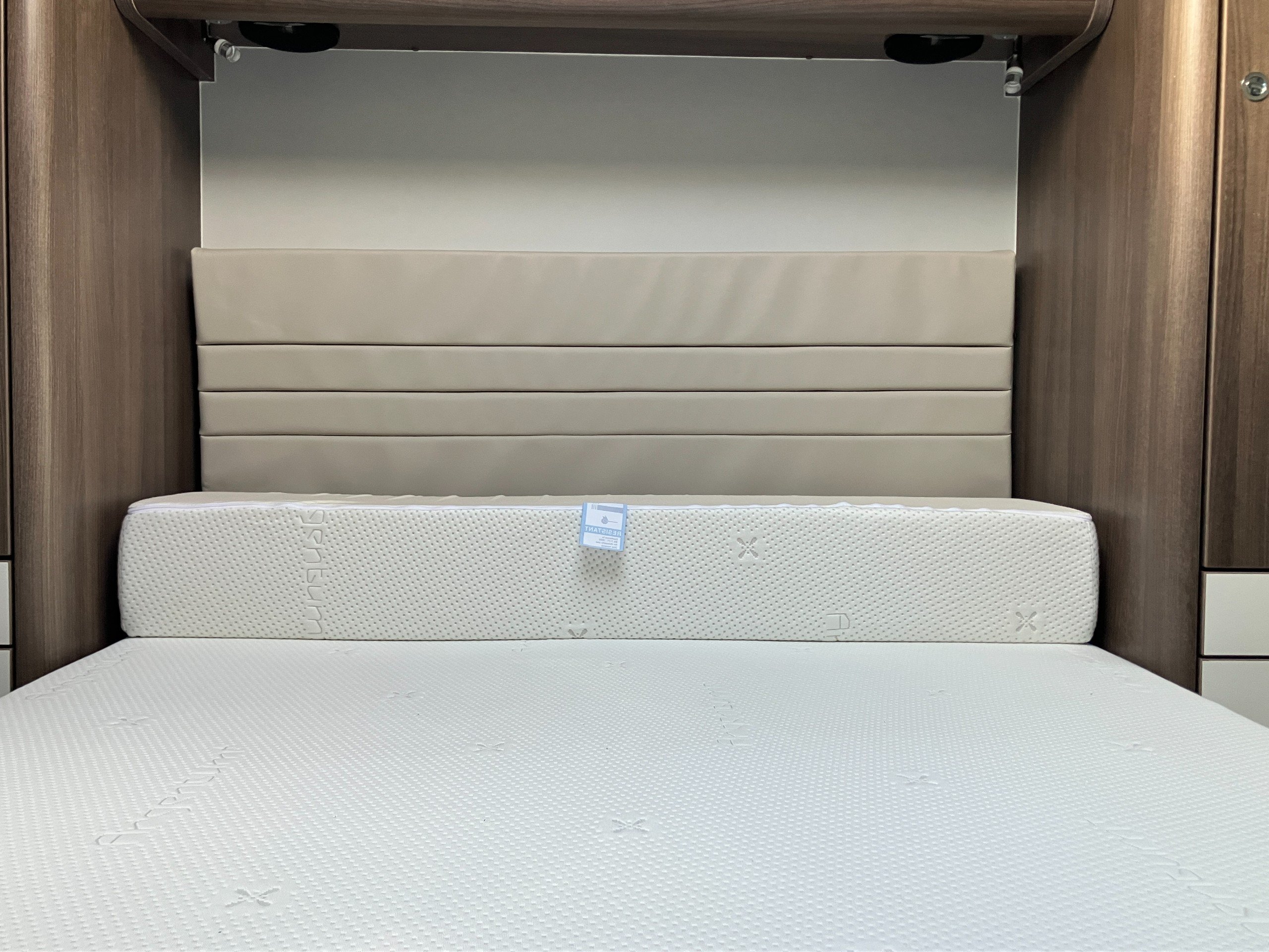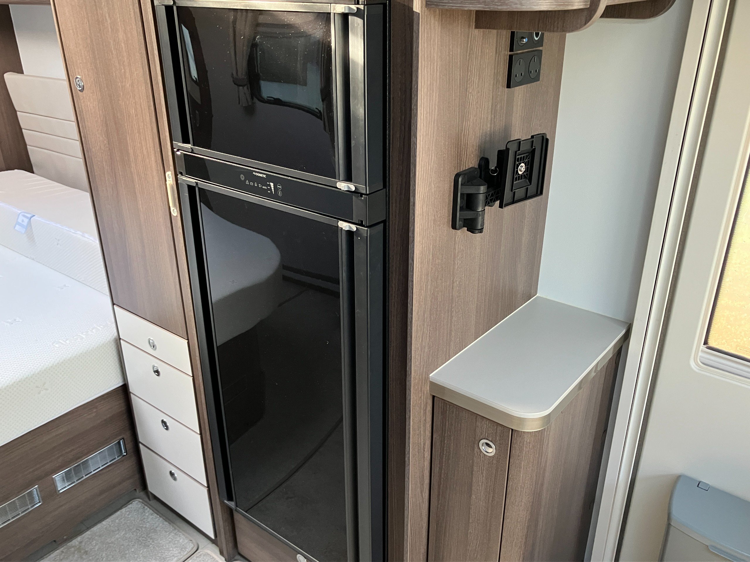Twin axle, 8ft Wide, 4 berth, transverse bed, rear washroom layout. Load margin: 234kg.