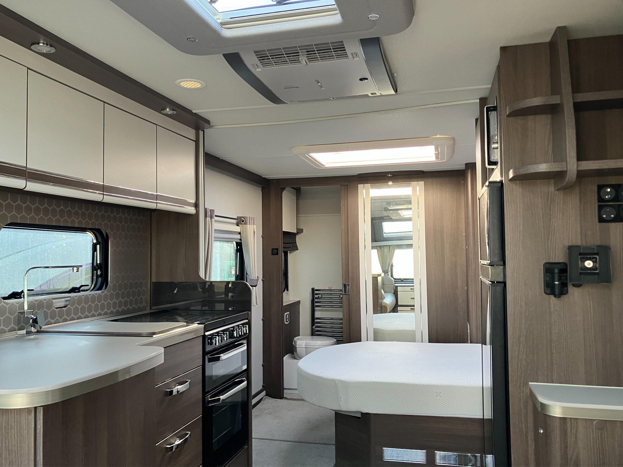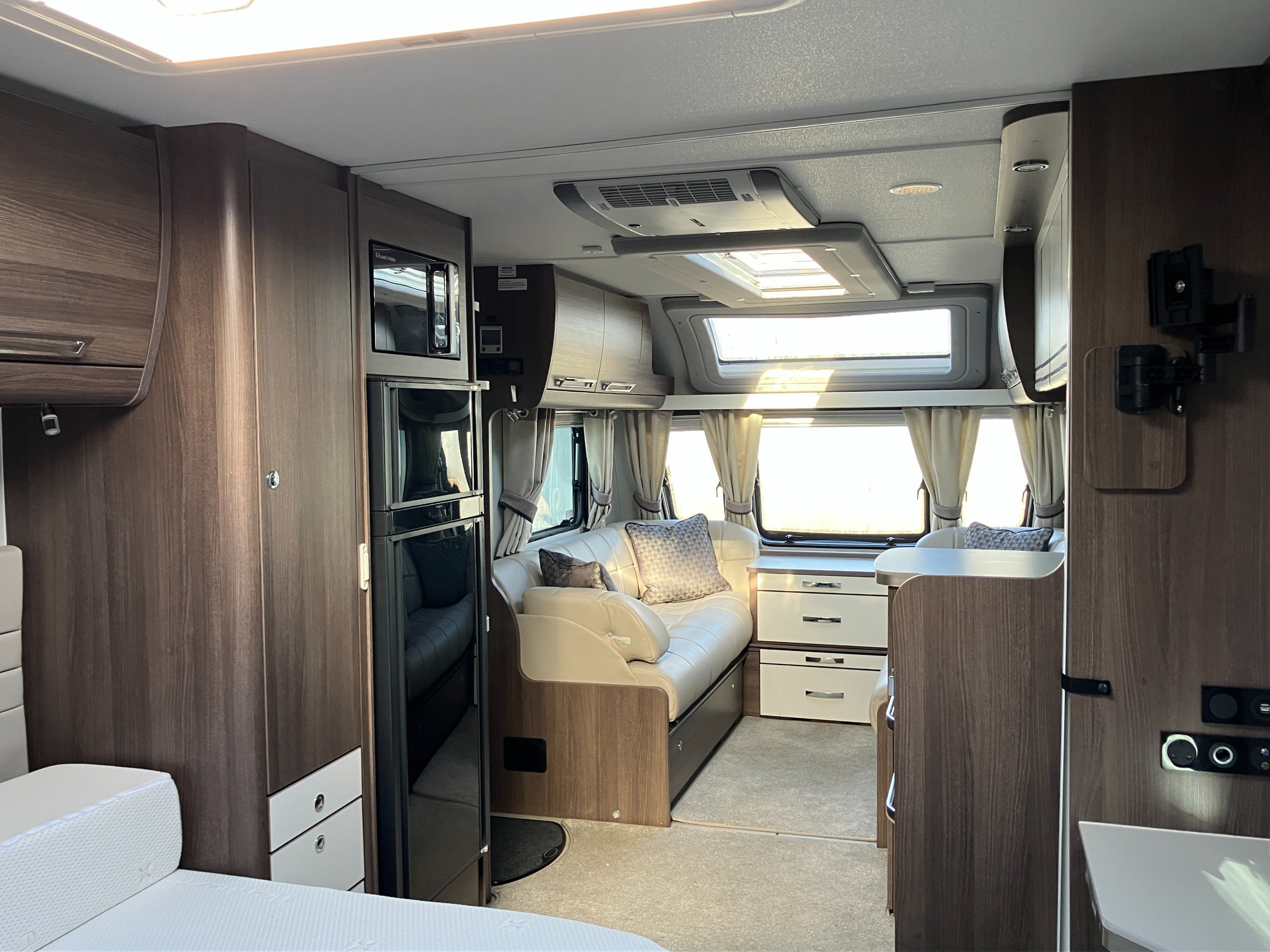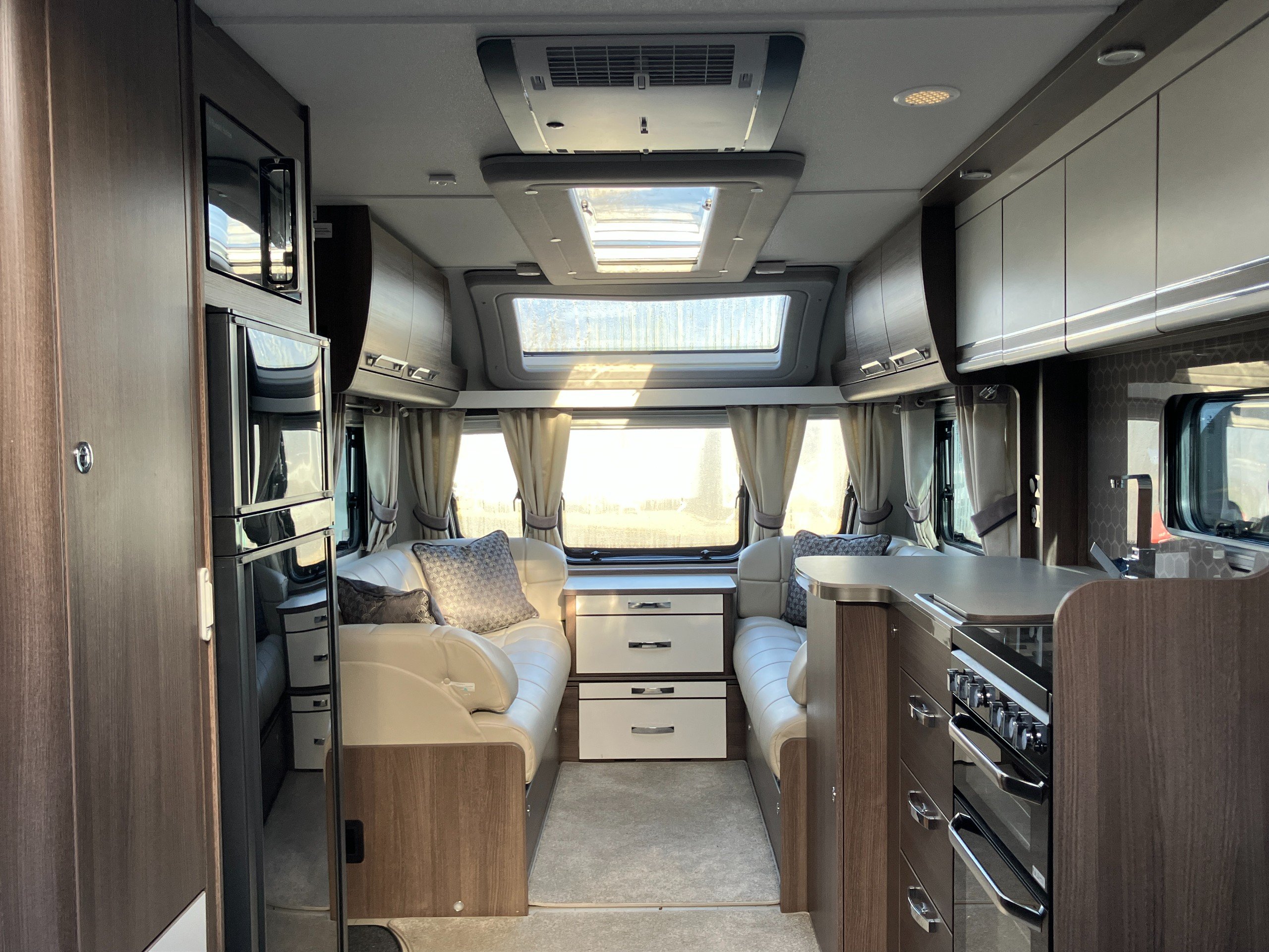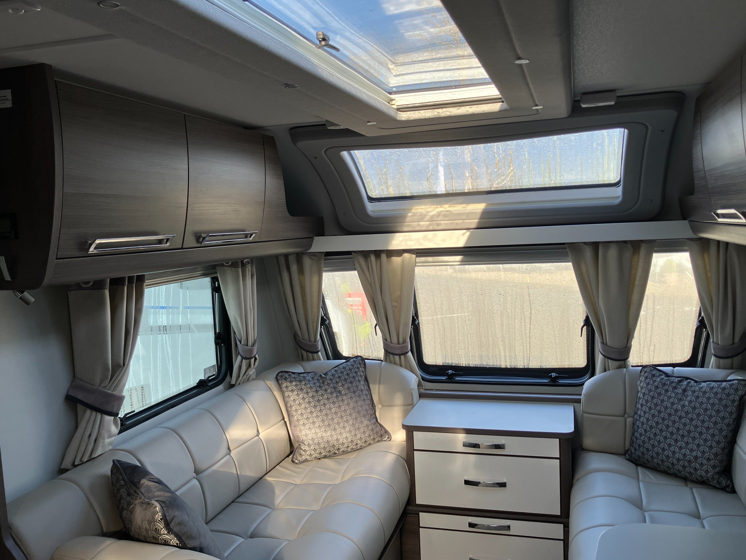 Luxury touring caravan with opulent design, the Cruiser is a statement of touring elegance with an expansive layout, grand interior flow, hotel inspired rear washroom facilities, and striking exterior finish. This high specification model offers premium performance and elevated comfort with ALDE wet central and underfloor heating, roof mounted air conditioning, E&P self levelling , sumptuous leather upholstery and AWD motor mover.