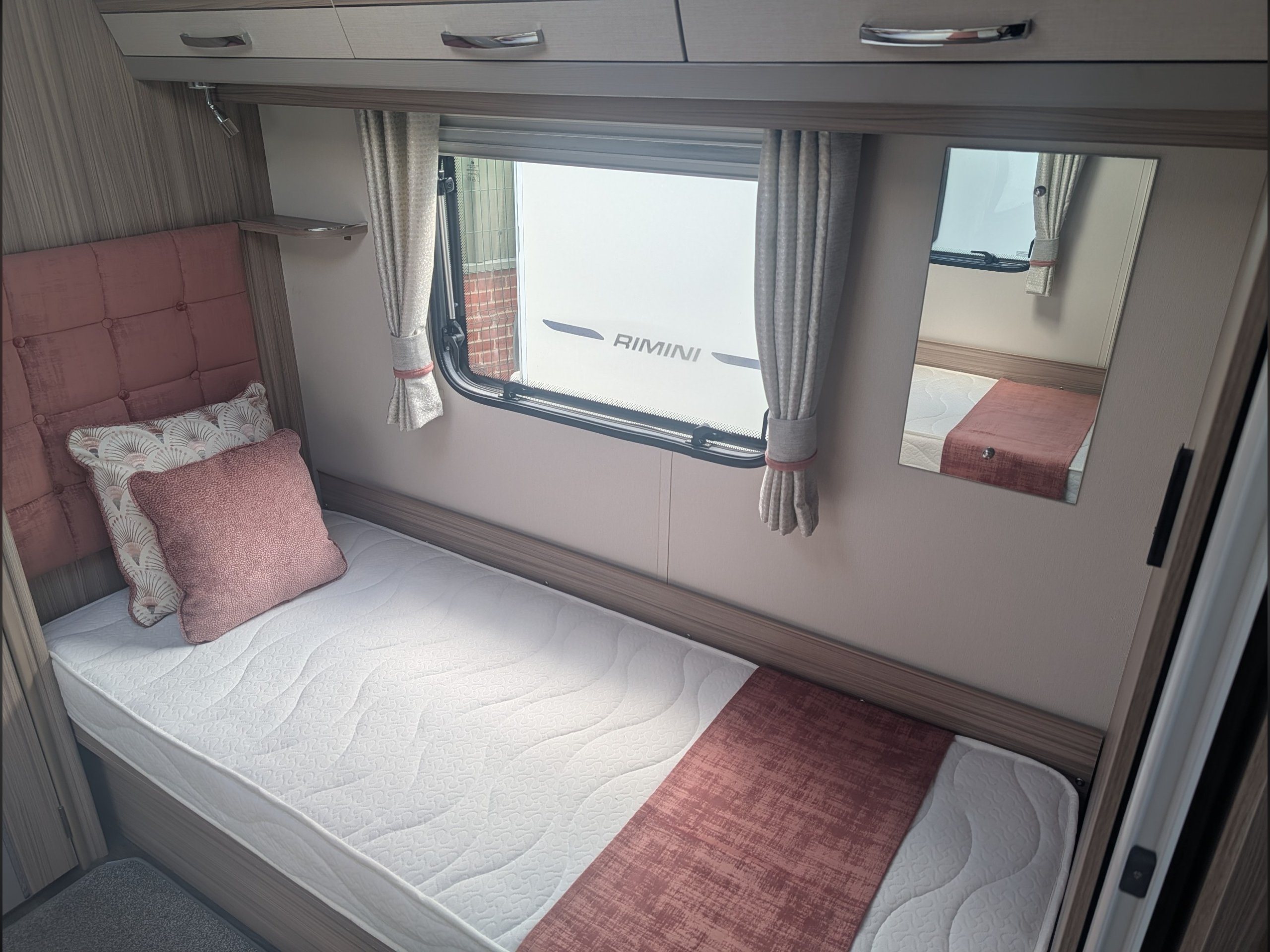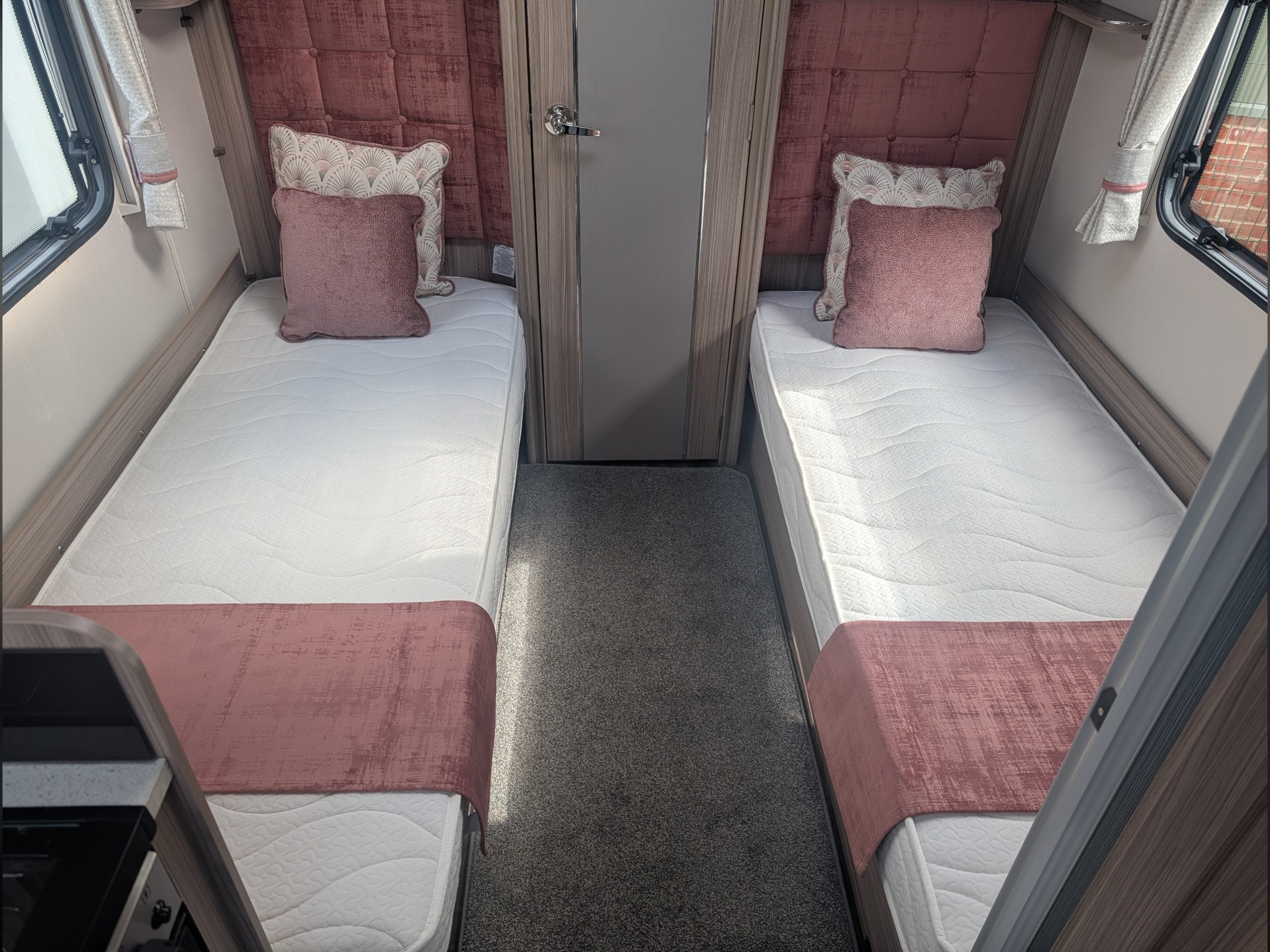 It is a four-berth, single-axle caravan featuring a popular layout with front lounge seating (convertible to a double bed), a central kitchen, two rear fixed single beds, and a full-width rear washroom.