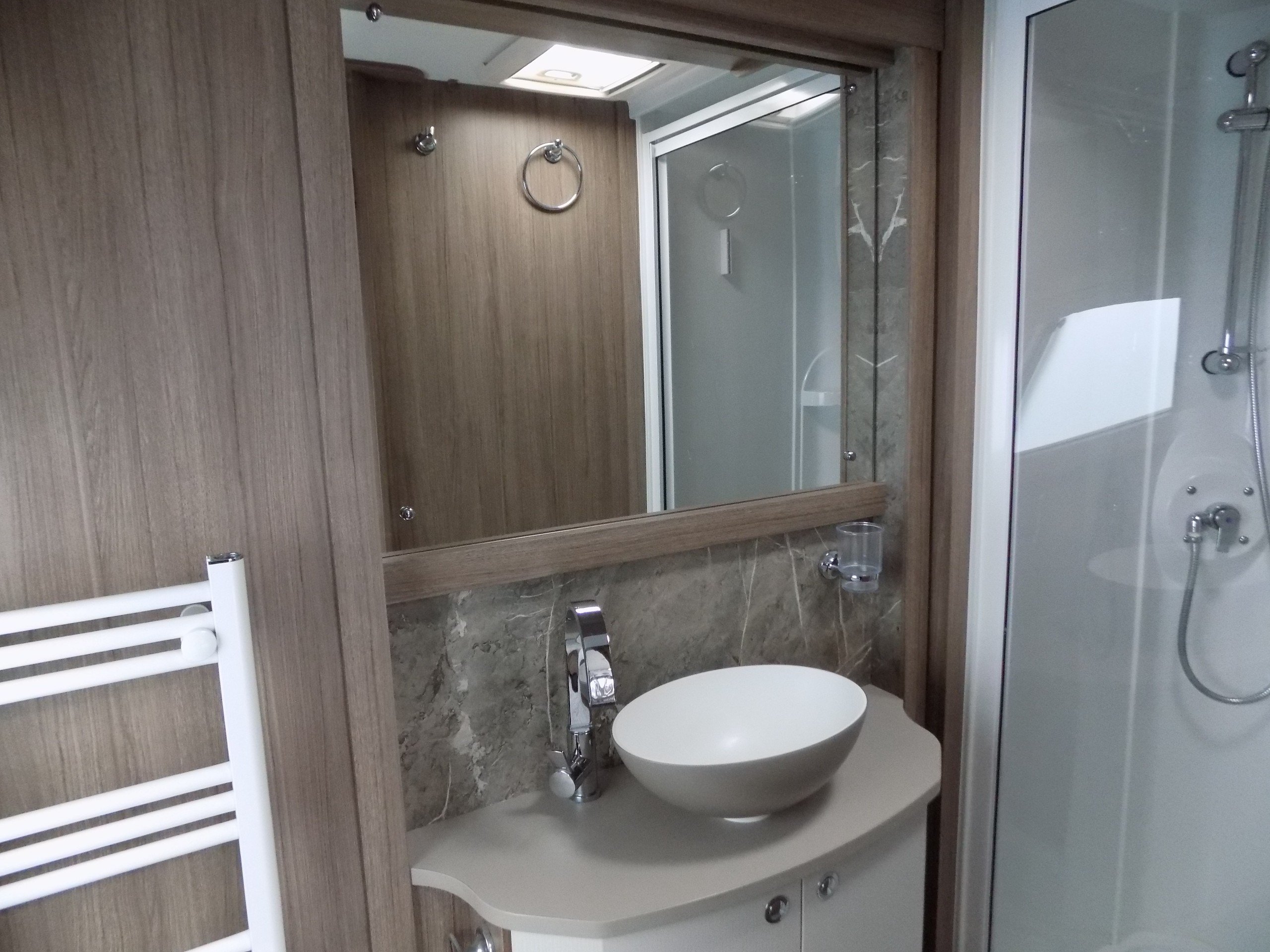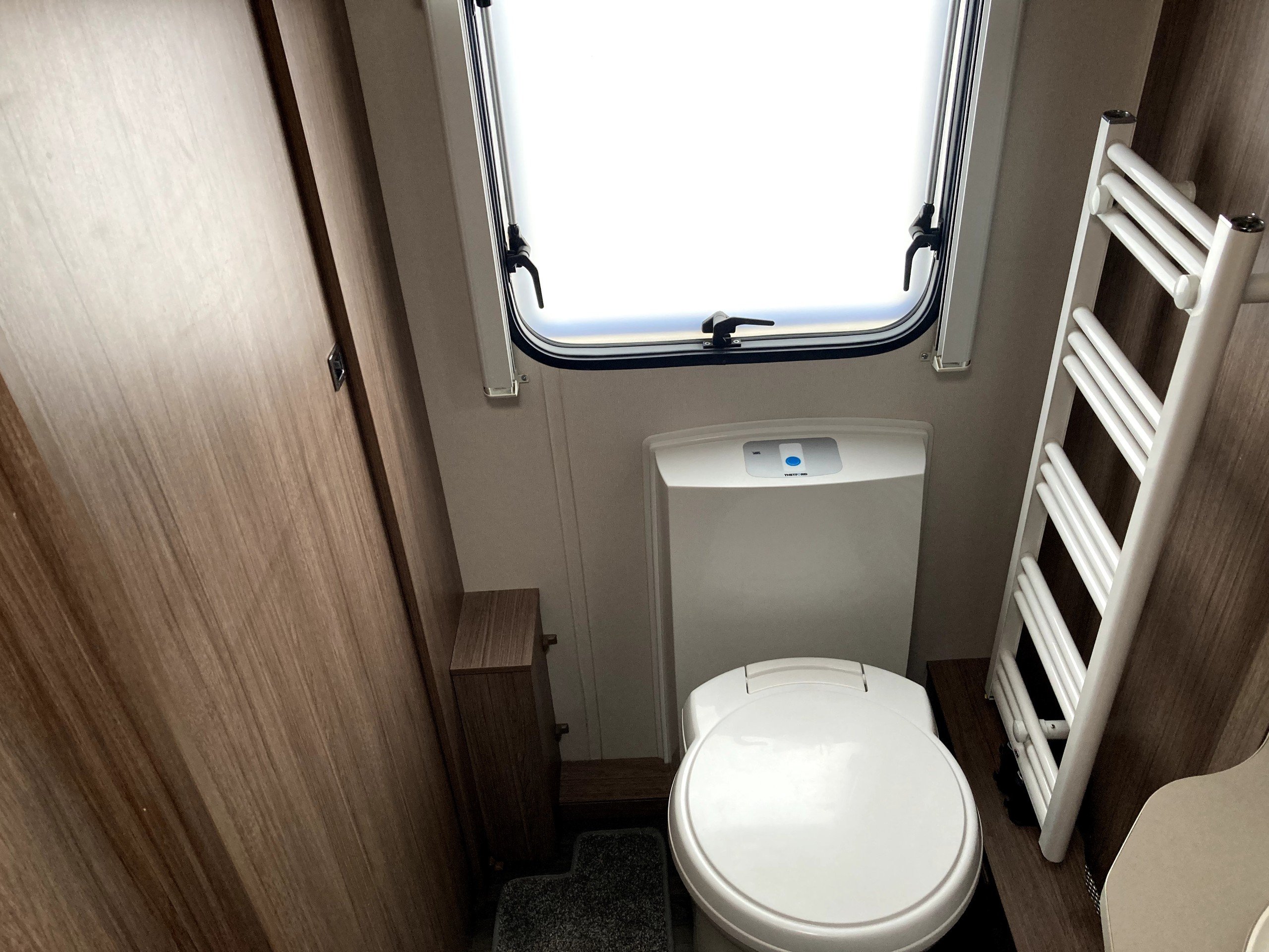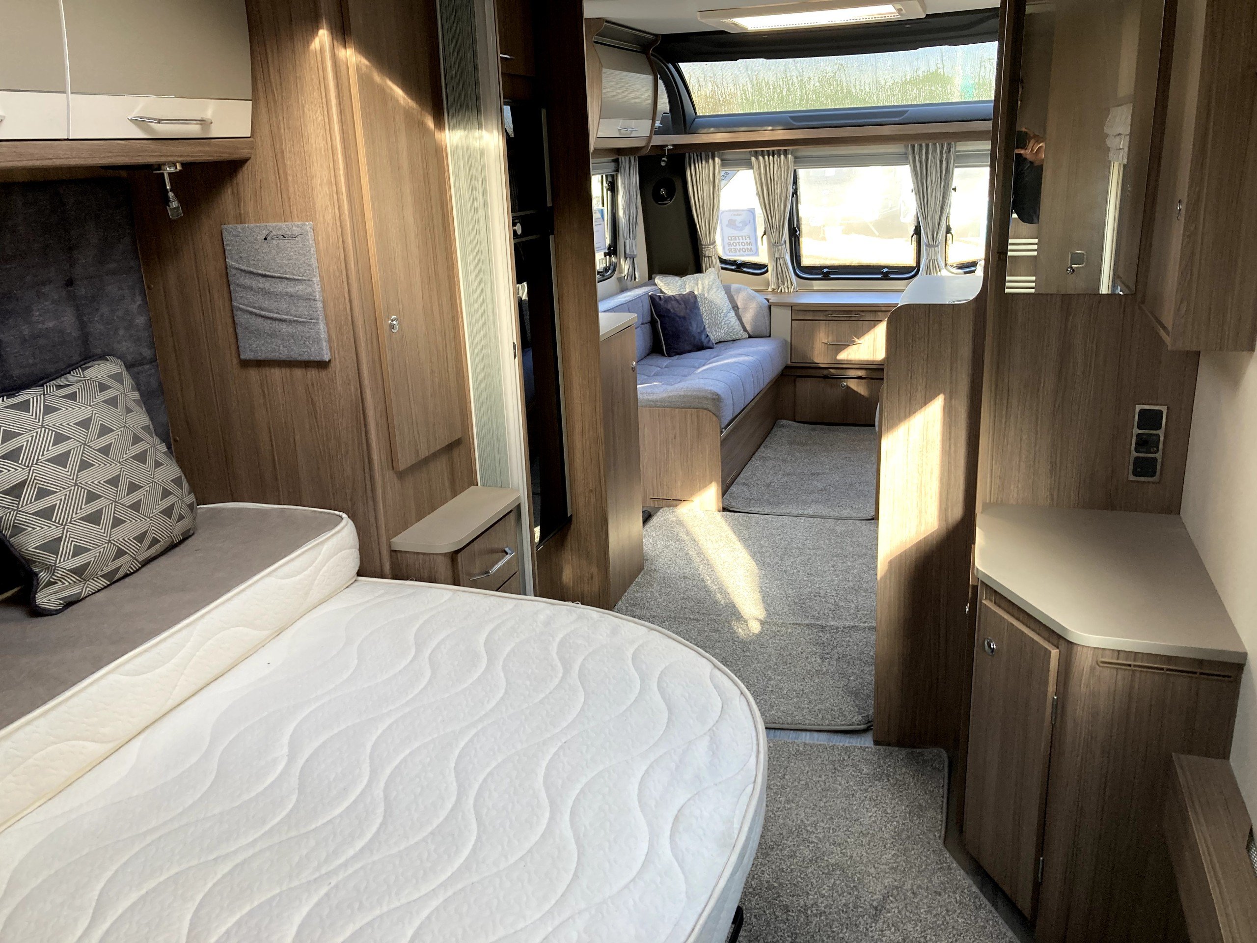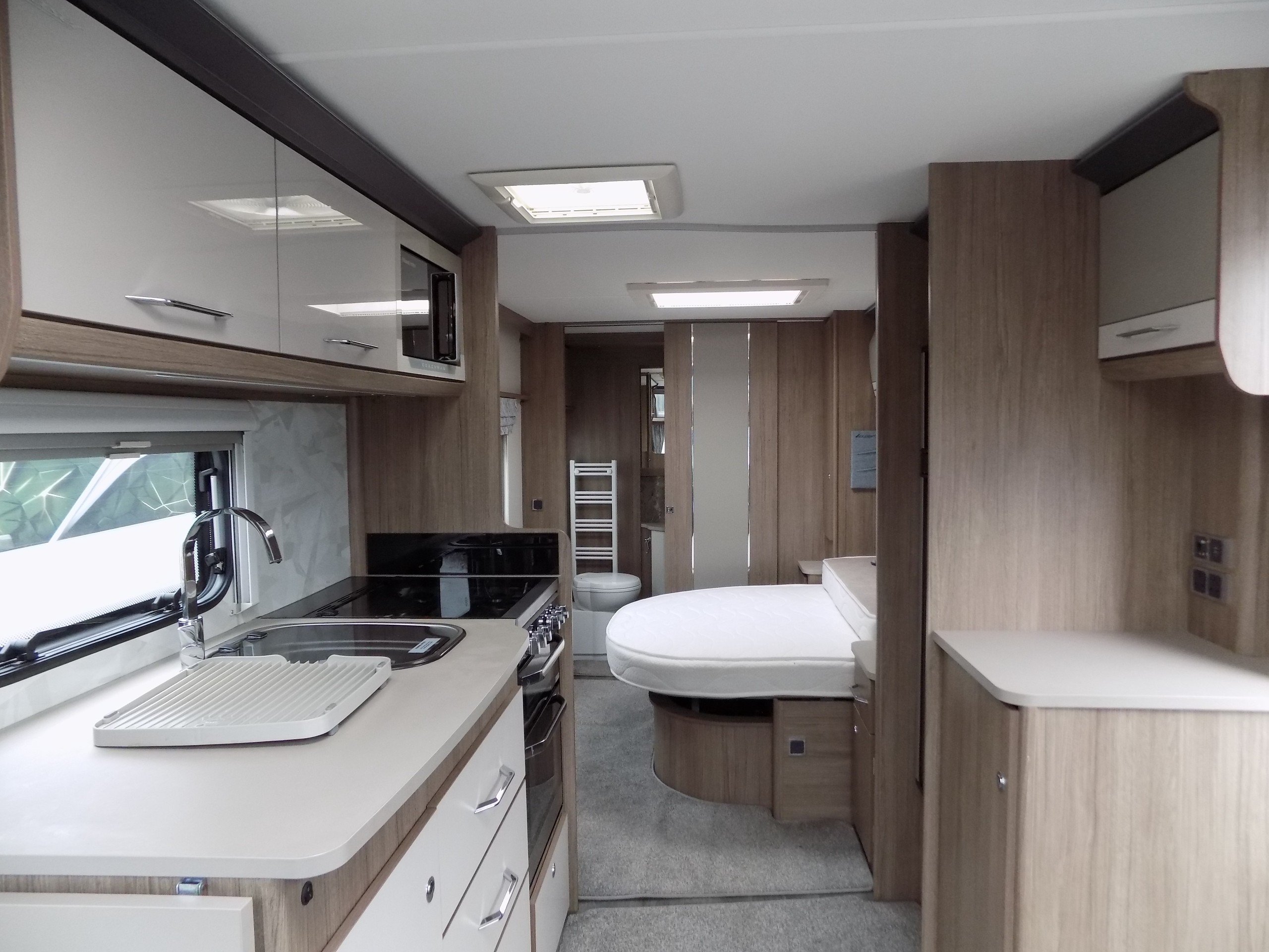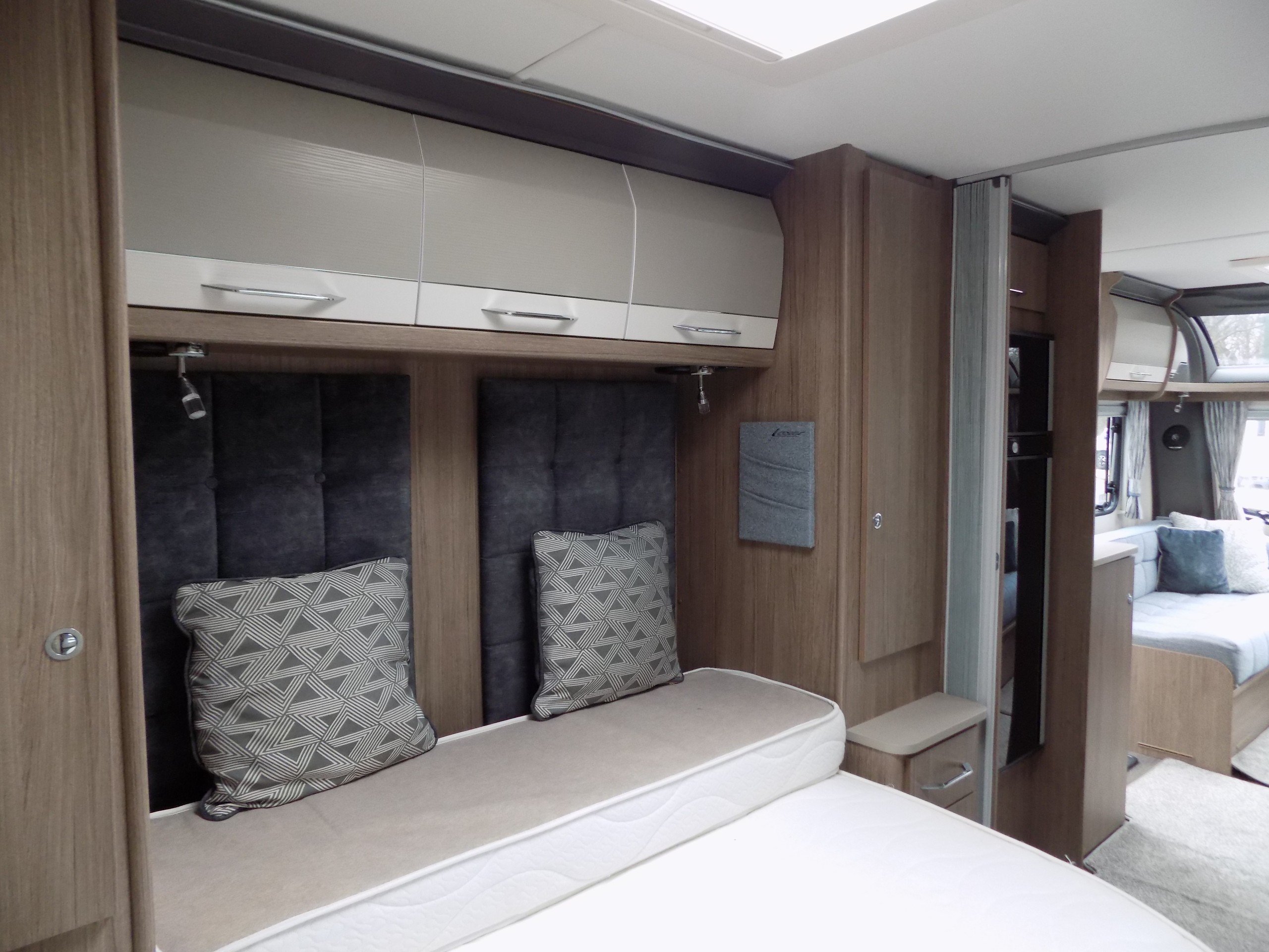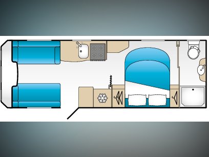 Twin axle, 4 berth, transverse bed, end washroom layout. Load margin: 160kg