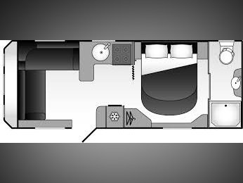 4 berth, single axle, transverse island bed layout with end washroom and L-shaped lounge.