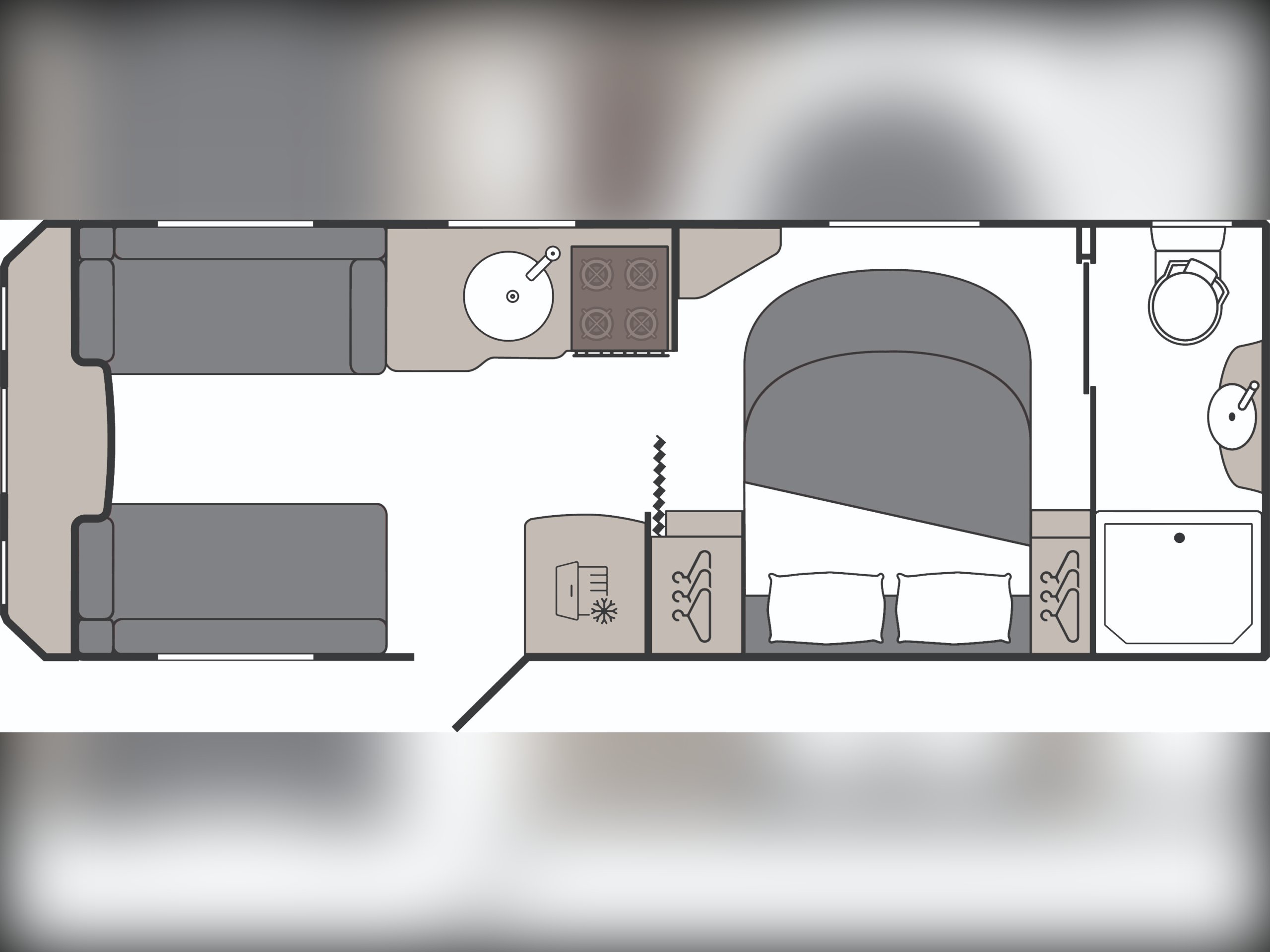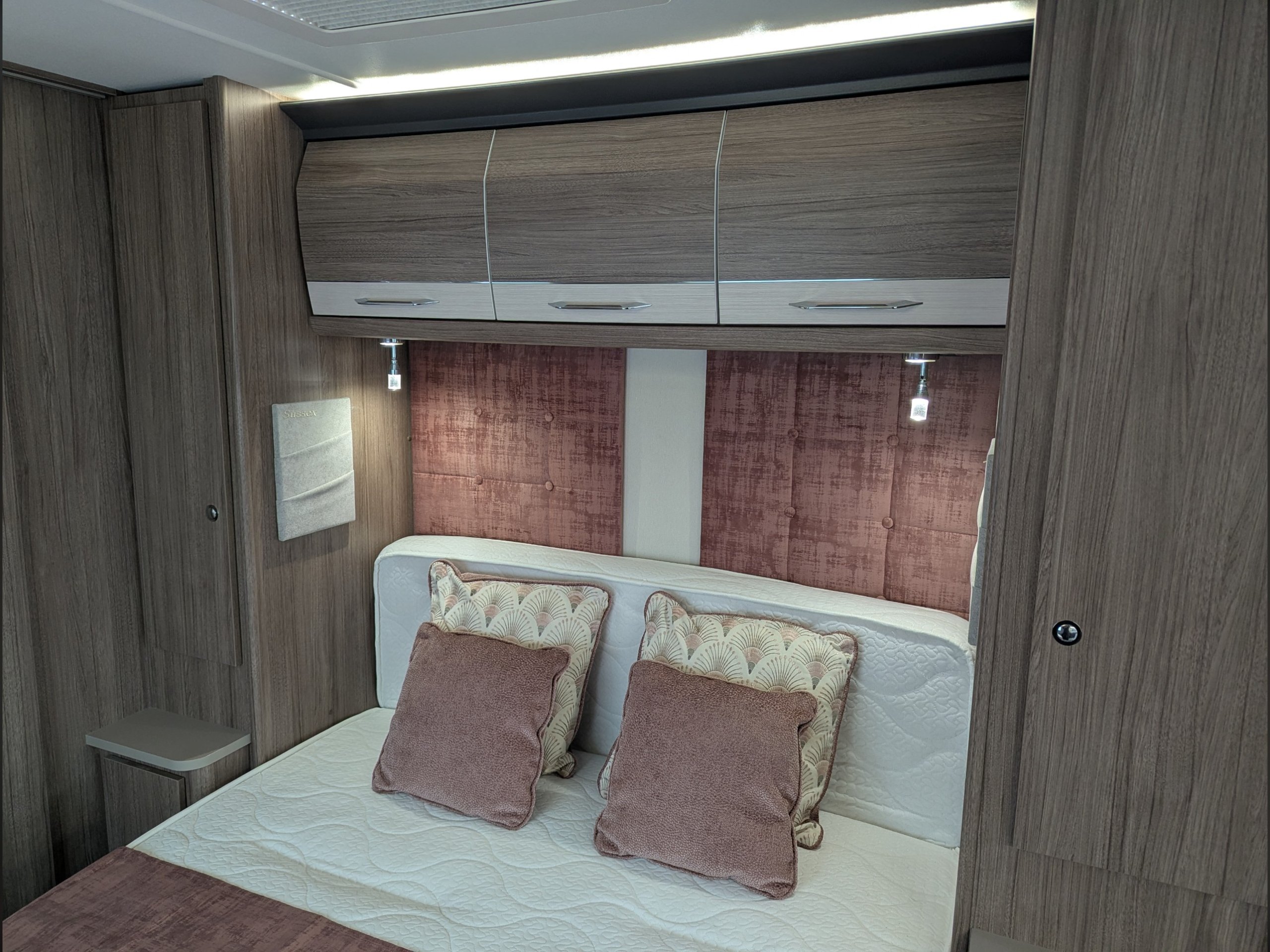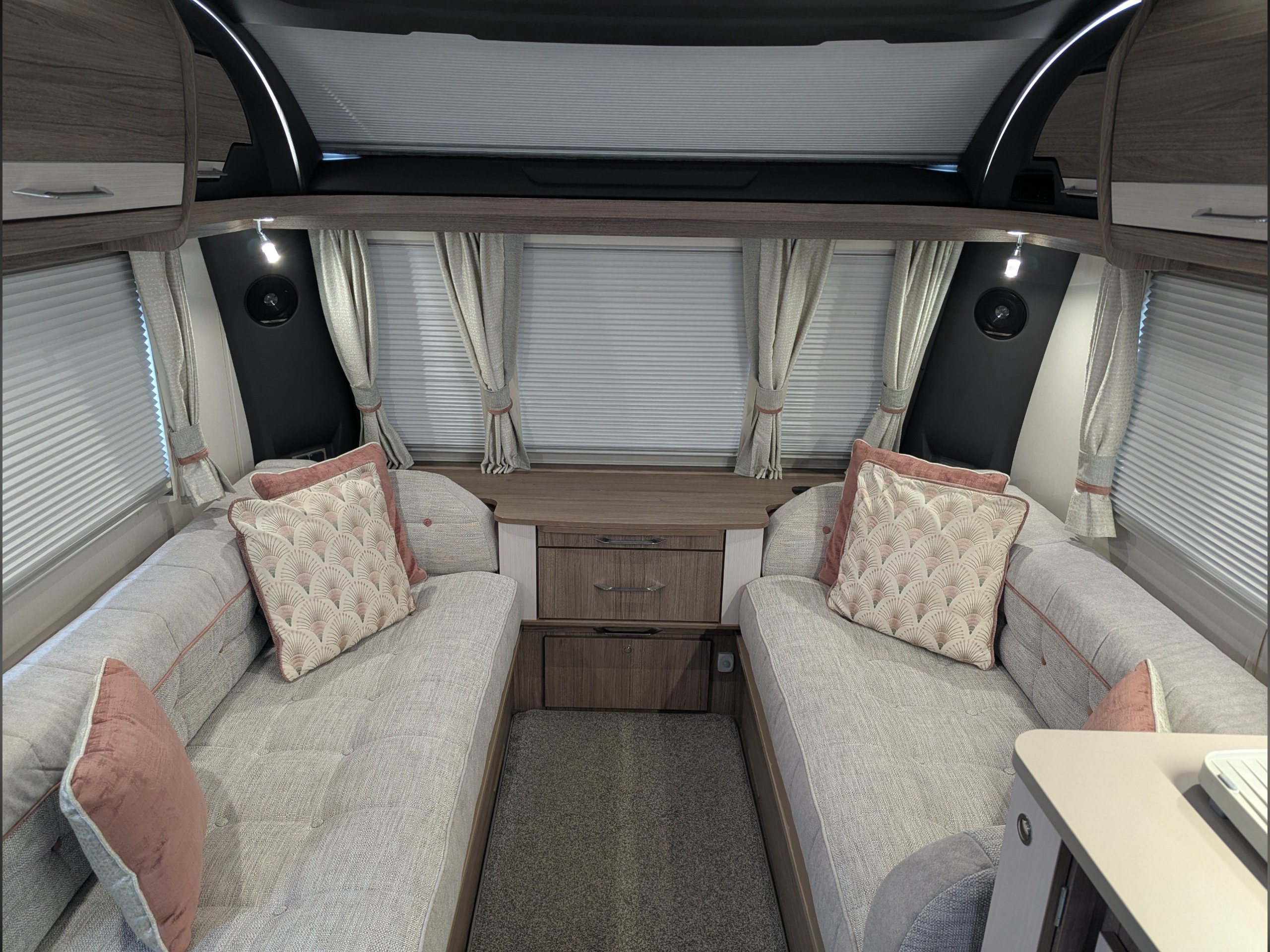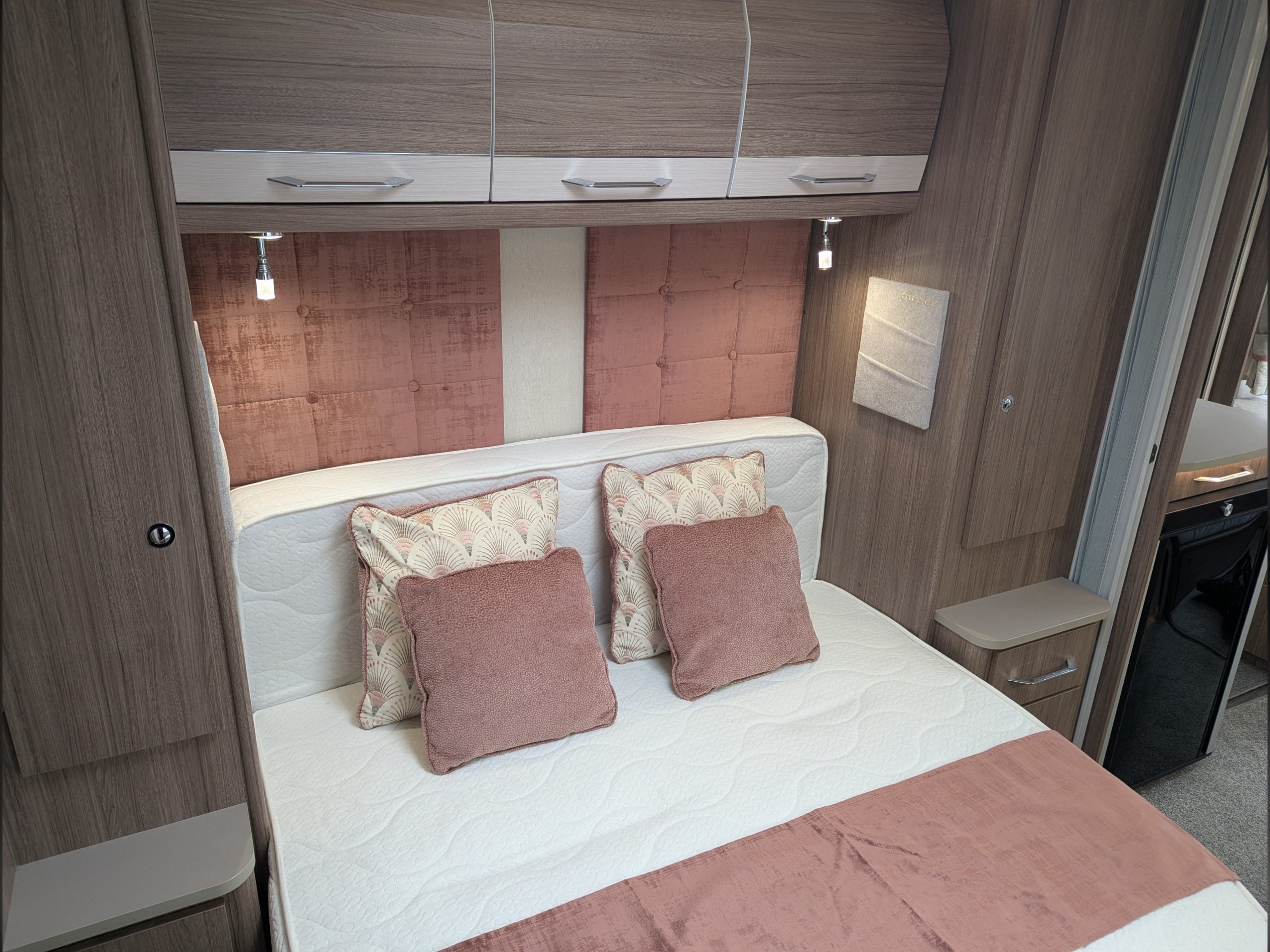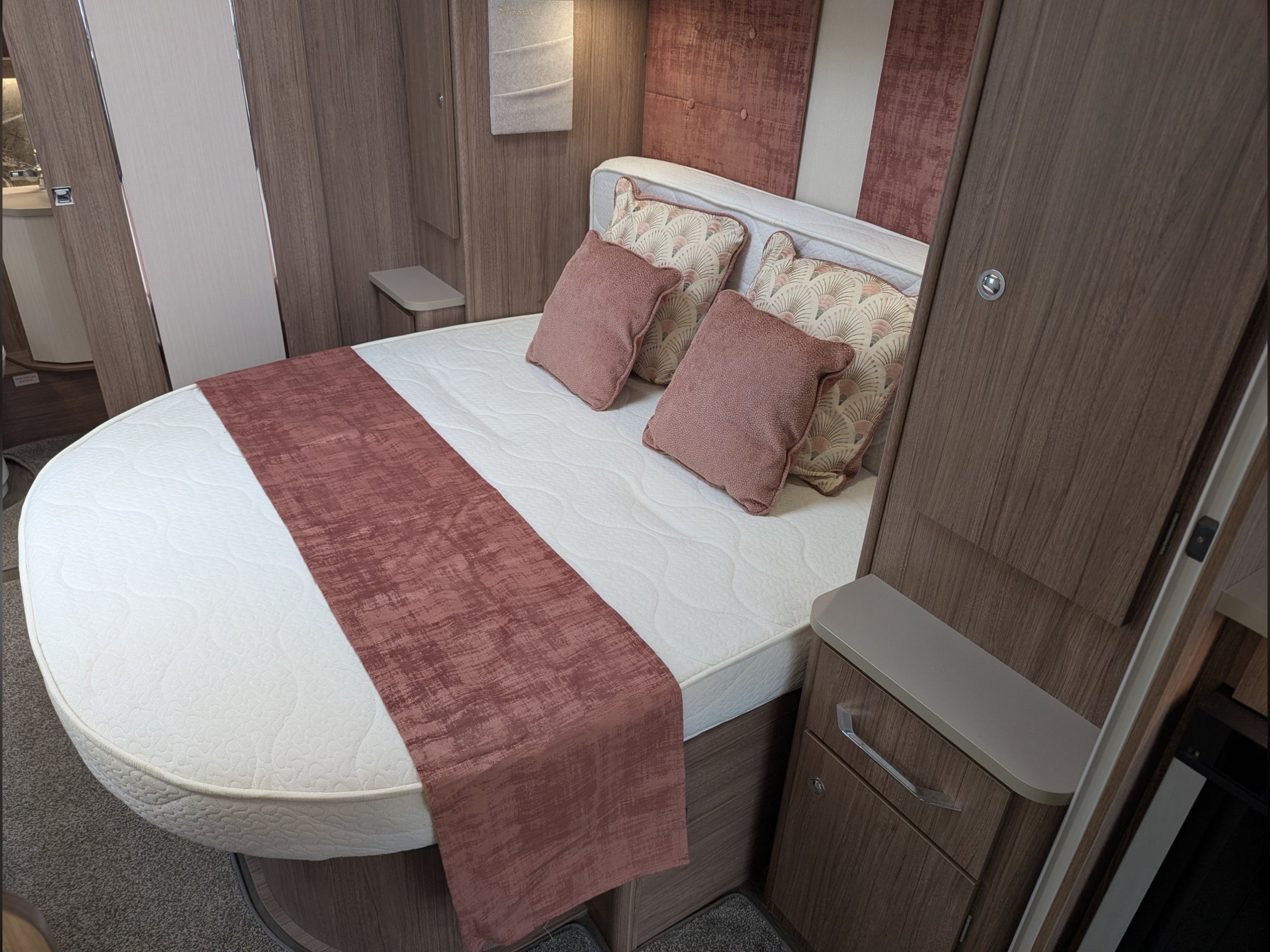 4 berth, single axle, fixed transverse island bed layout with rear washroom.