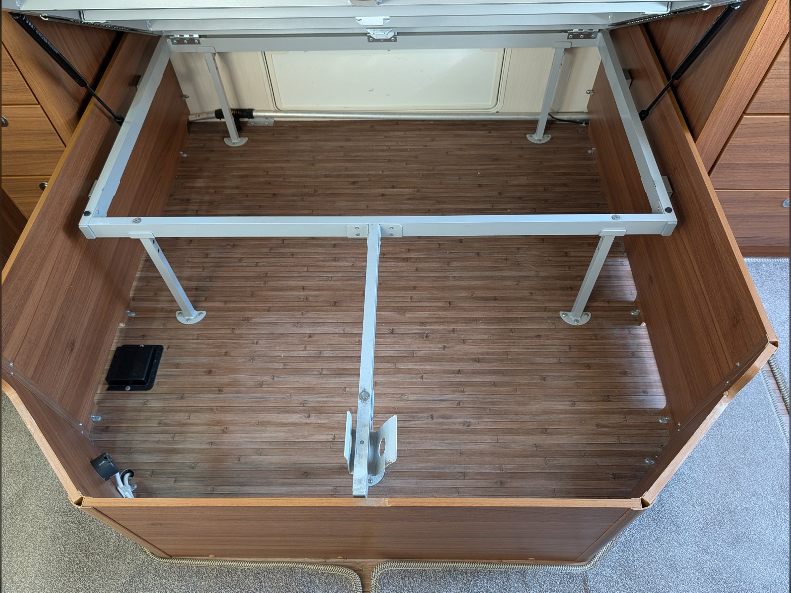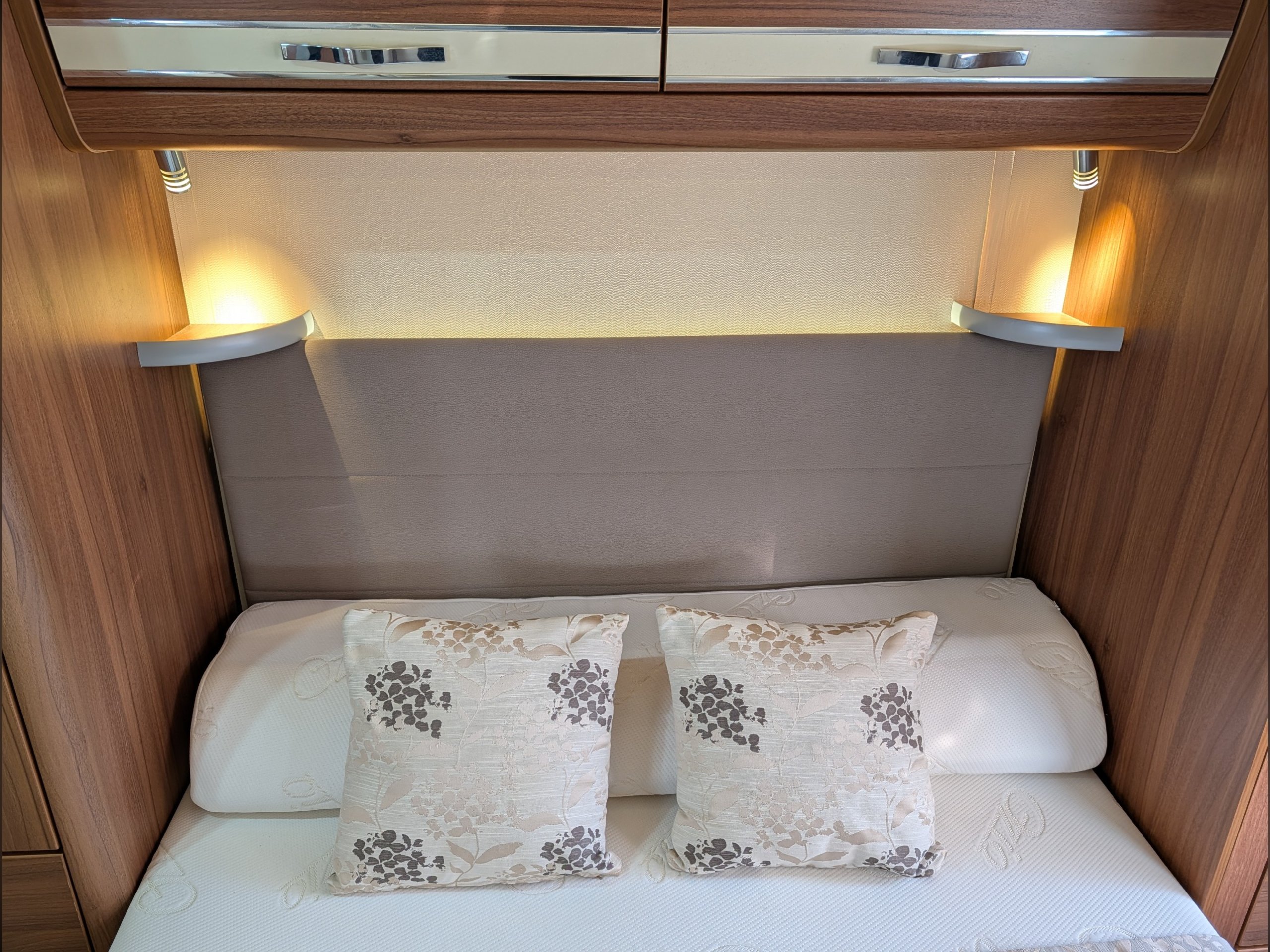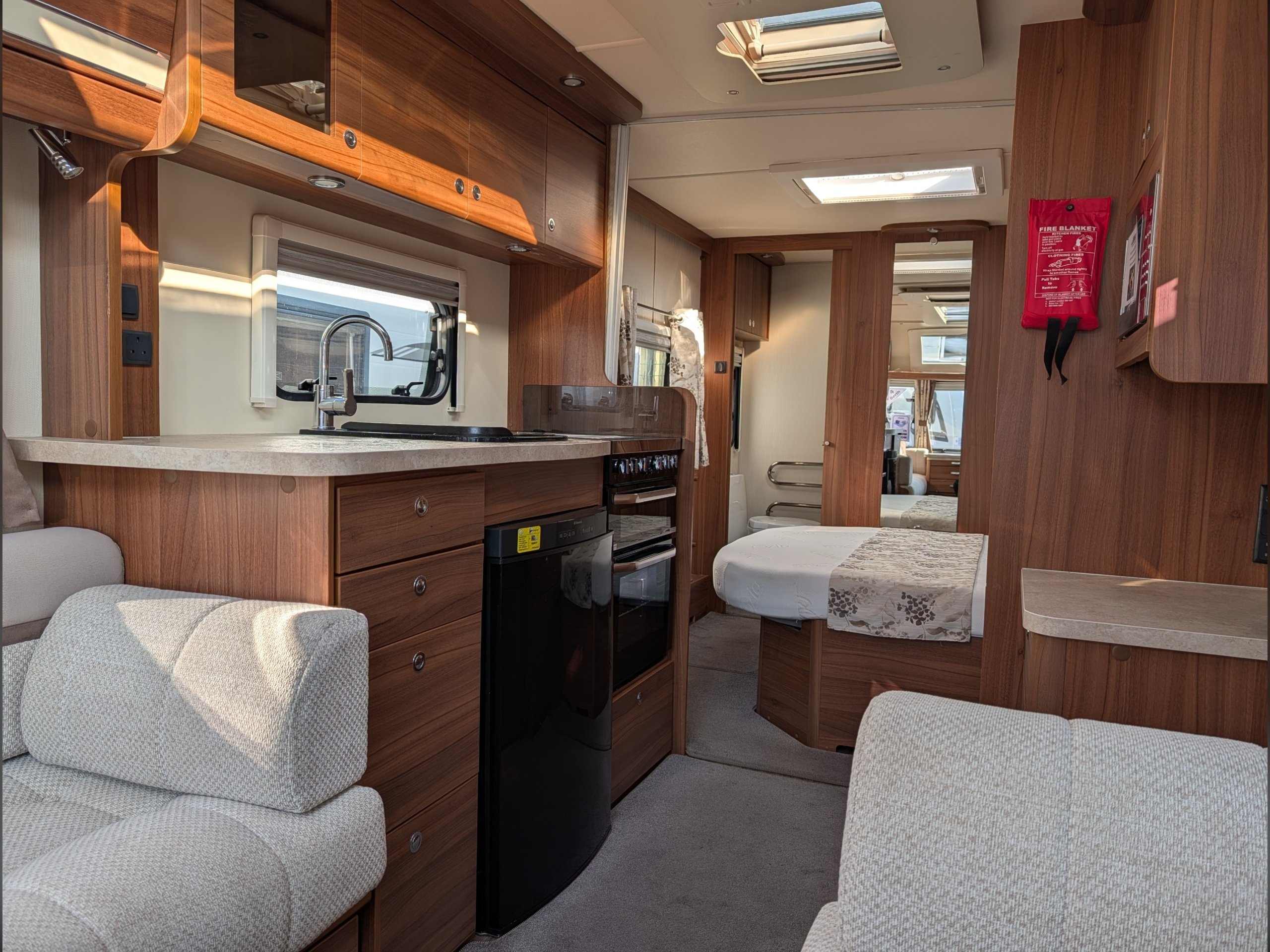 It includes a front lounge that converts to a double bed, central kitchen, Alde wet central heating, and a retractable mattress to maximize daytime floor space.
