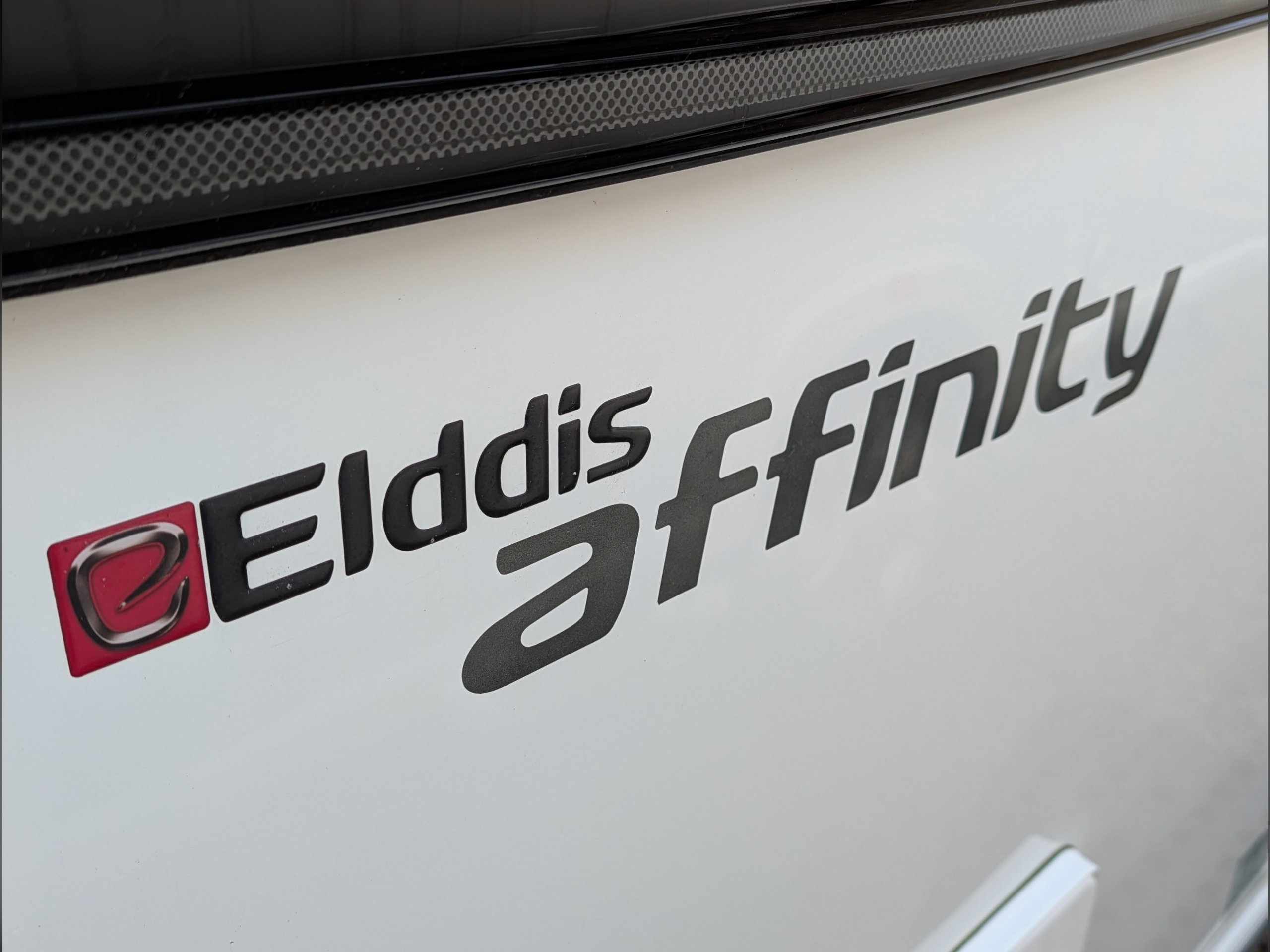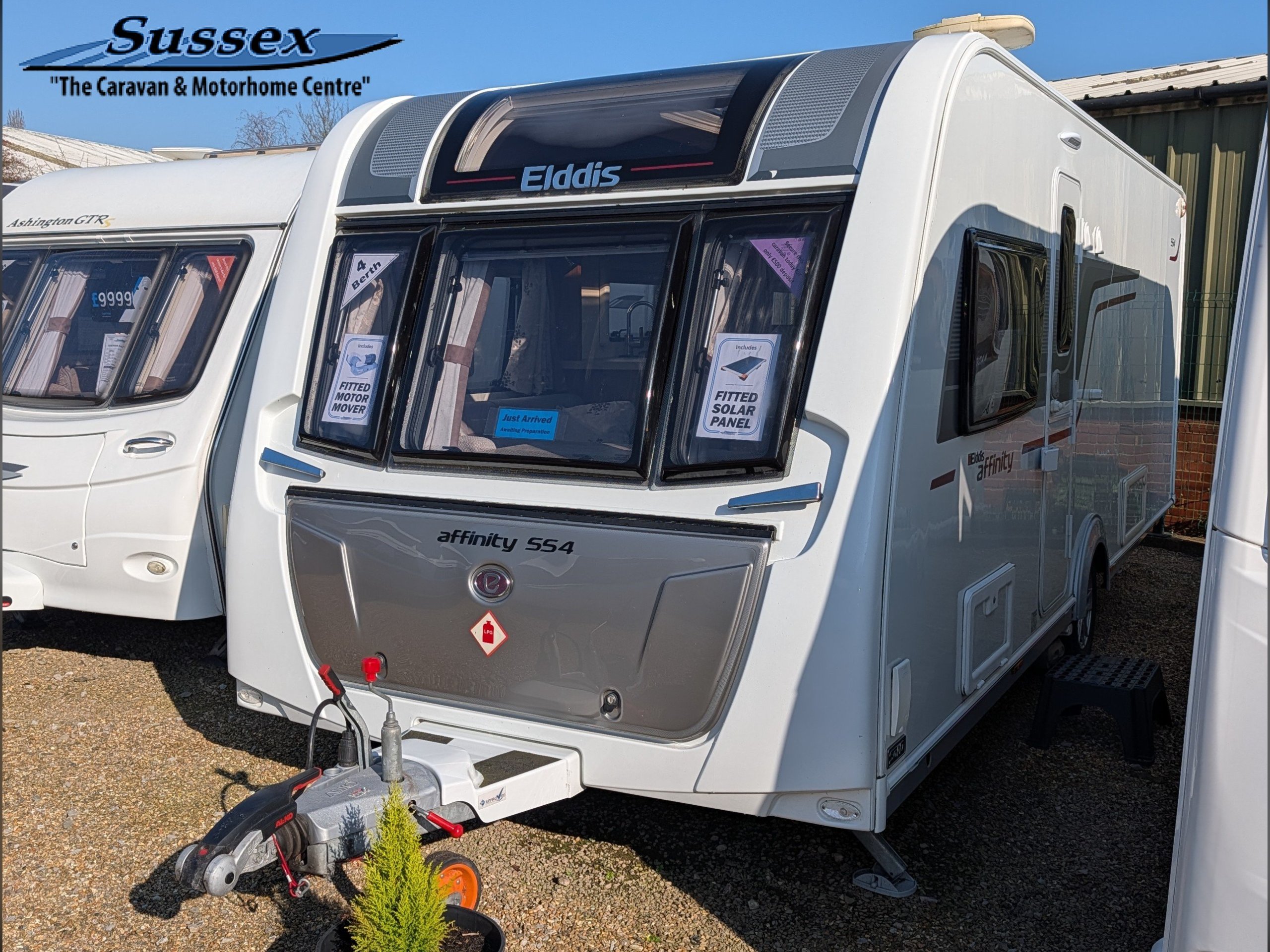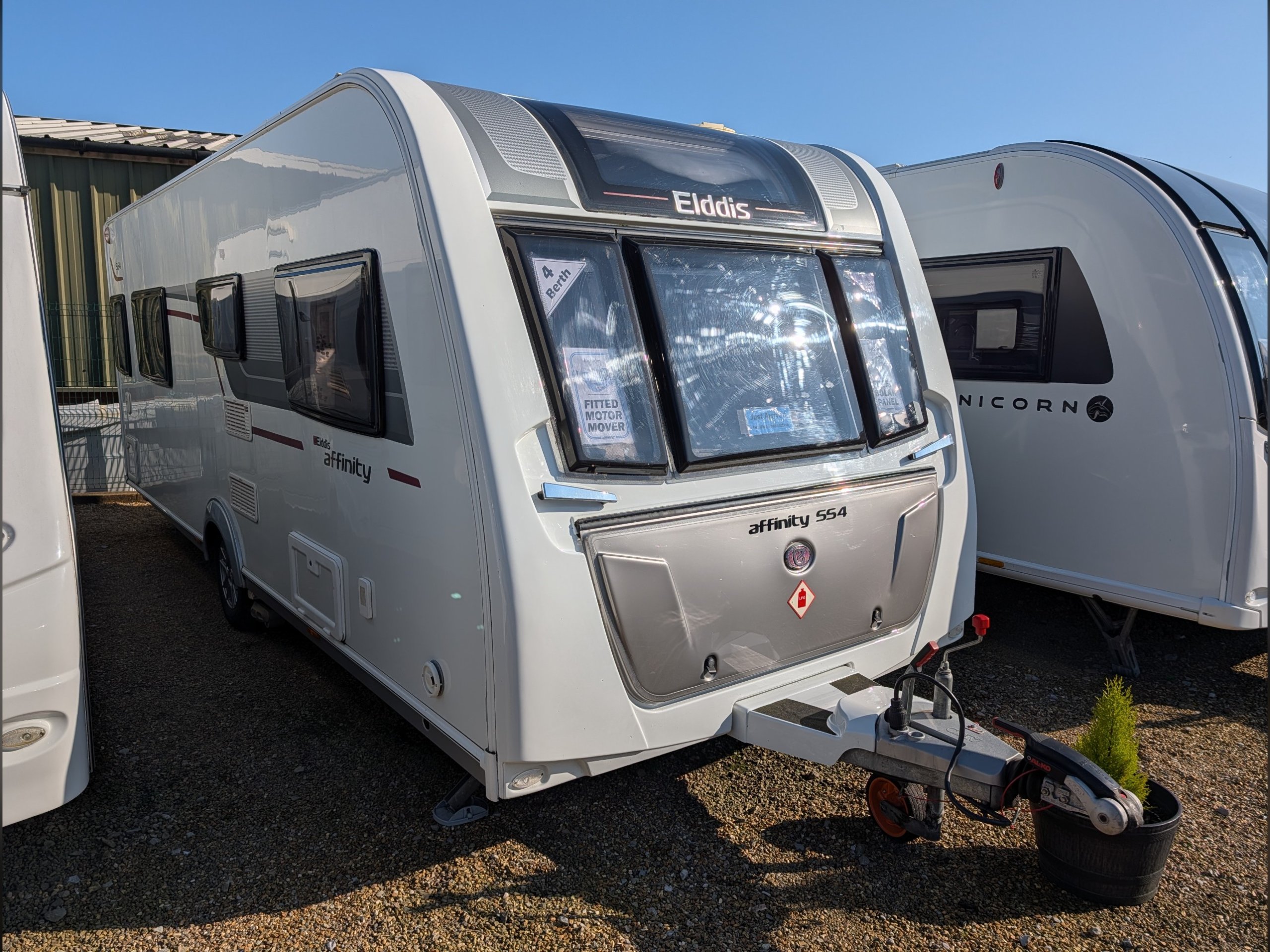 The 2016 Elddis Affinity 554 is a 4-berth, single-axle touring caravan featuring a popular island transverse bed and a full-width end washroom.