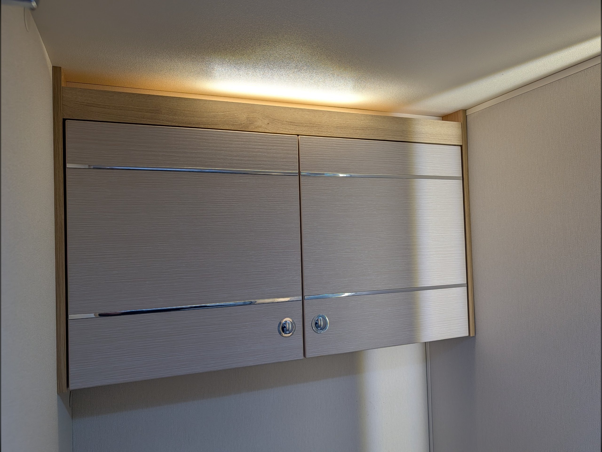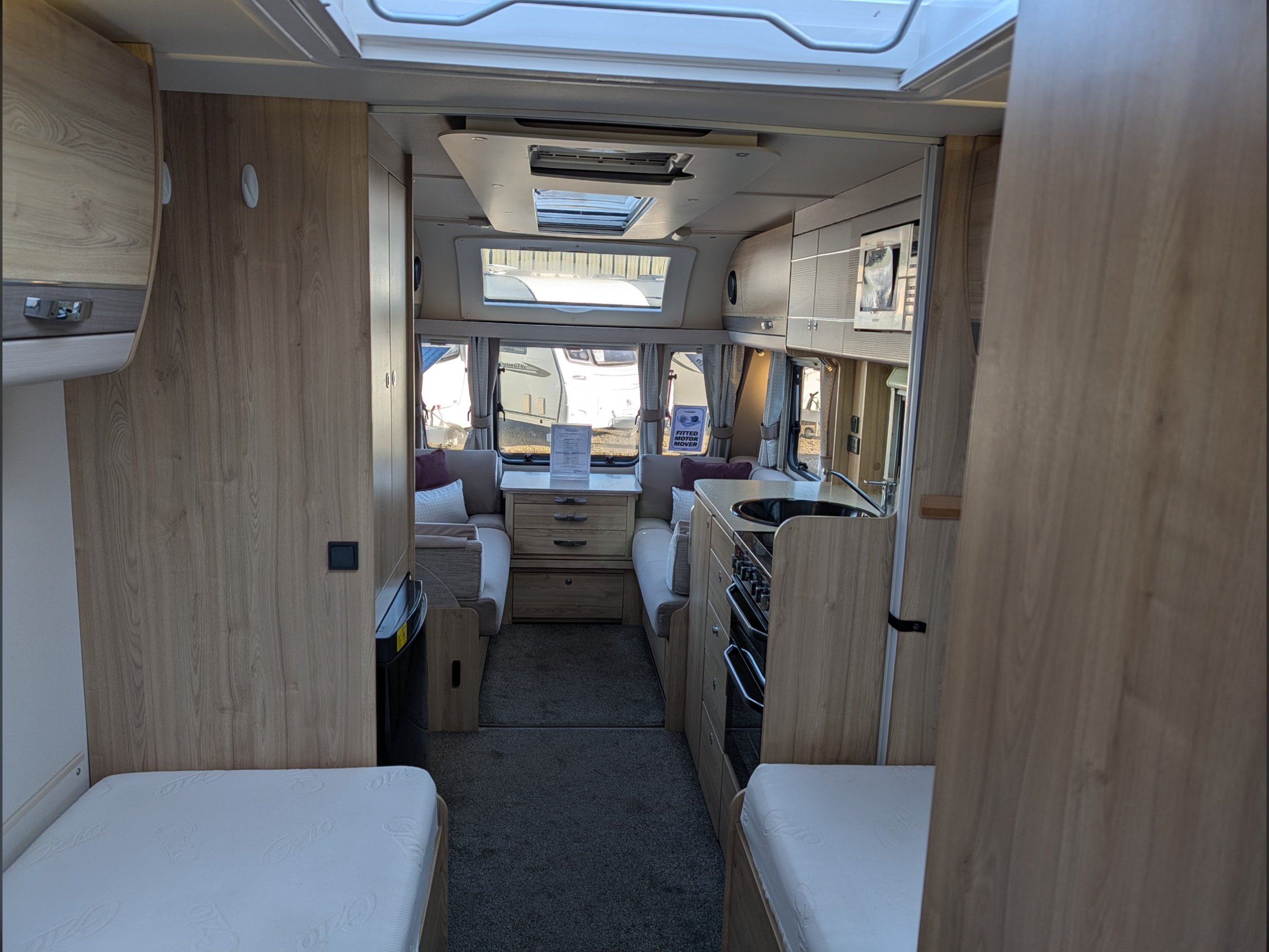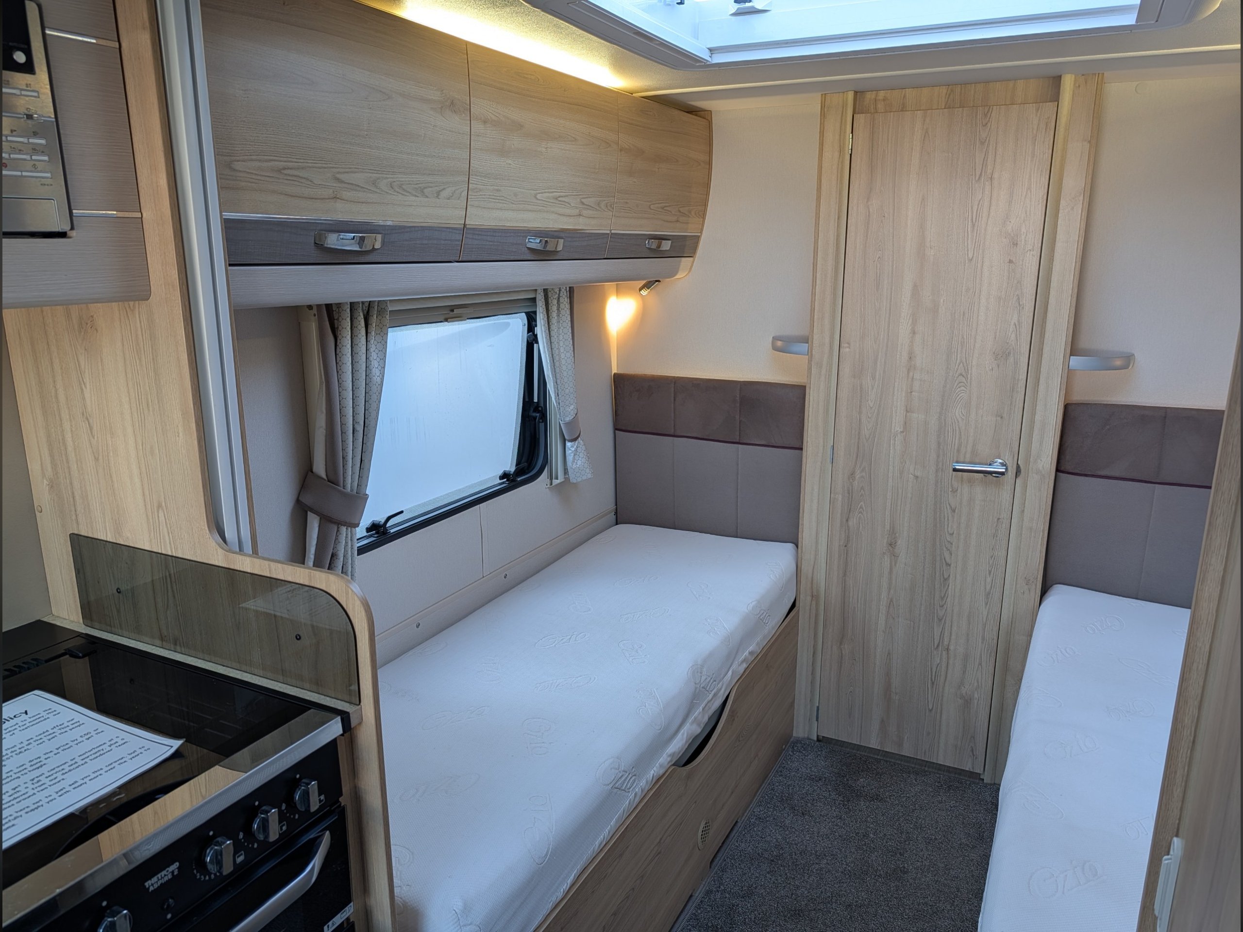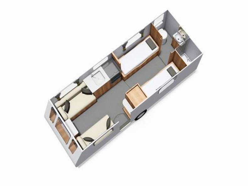 4 berth, single axle, fixed twin single beds layout with end washroom.