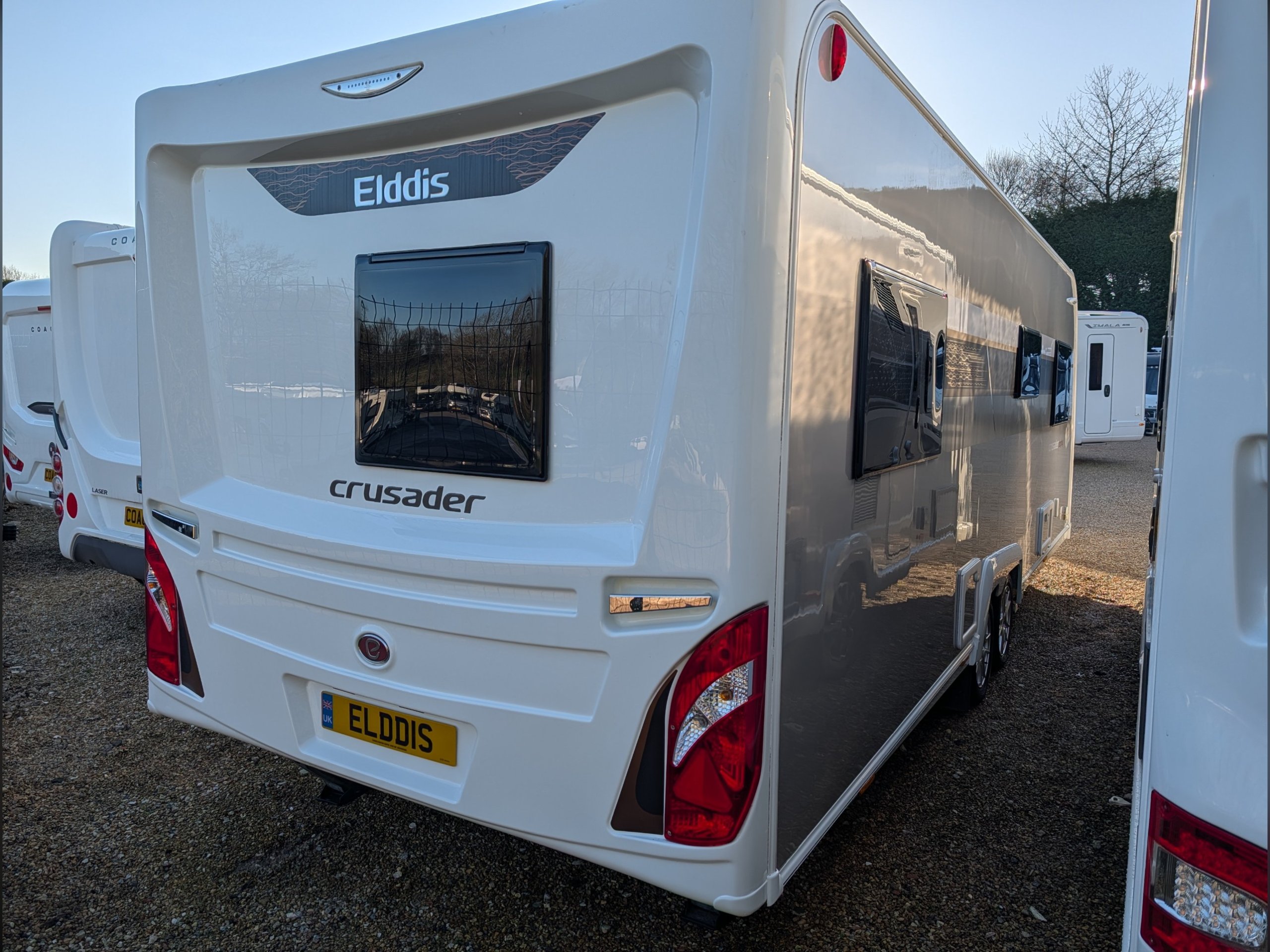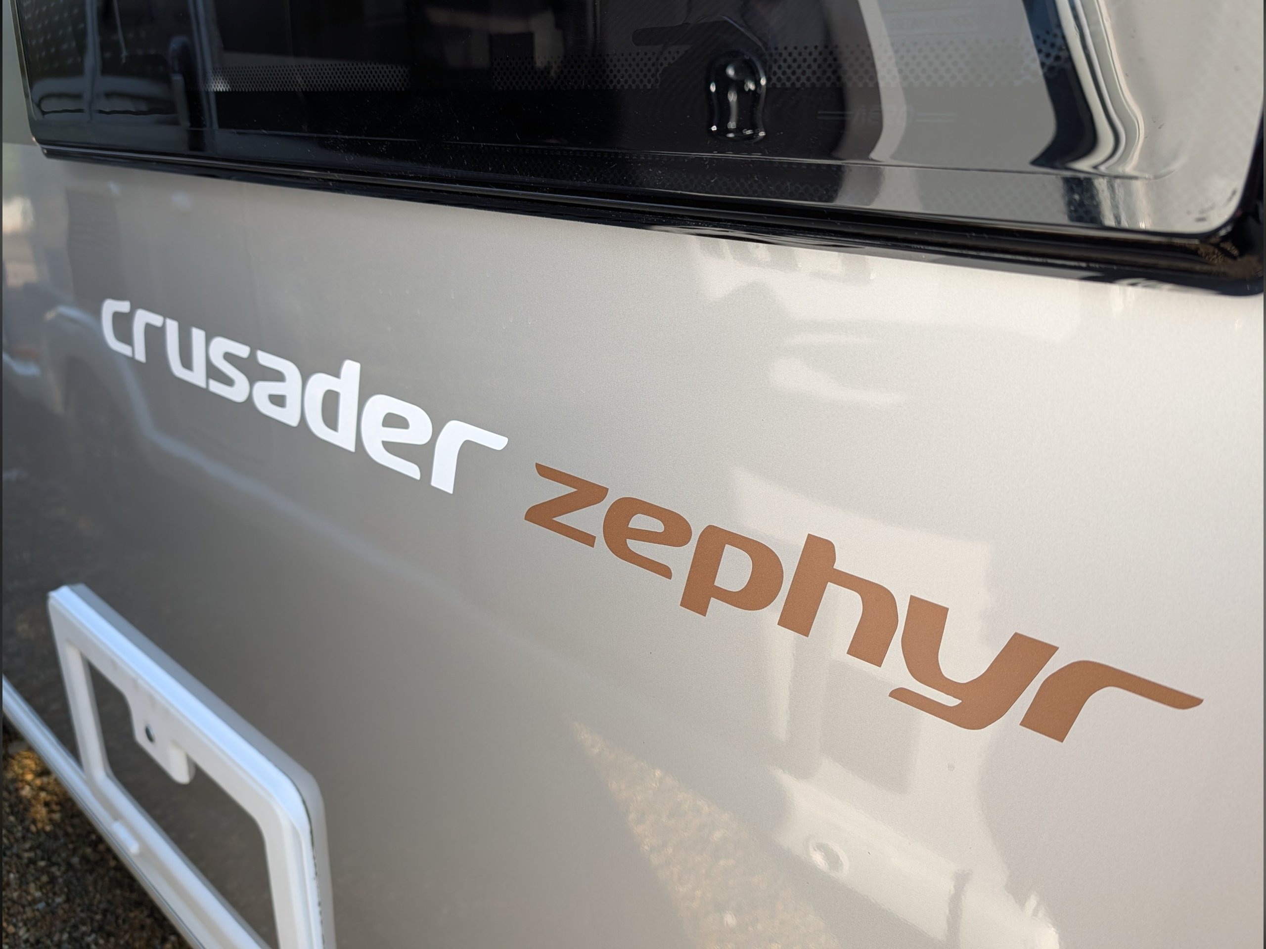 This 2019 Elddis Crusader Zephyr is a 4-berth, twin-axle touring caravan featuring a front lounge, central kitchen, and a rear master bedroom with a retractable transverse island bed.