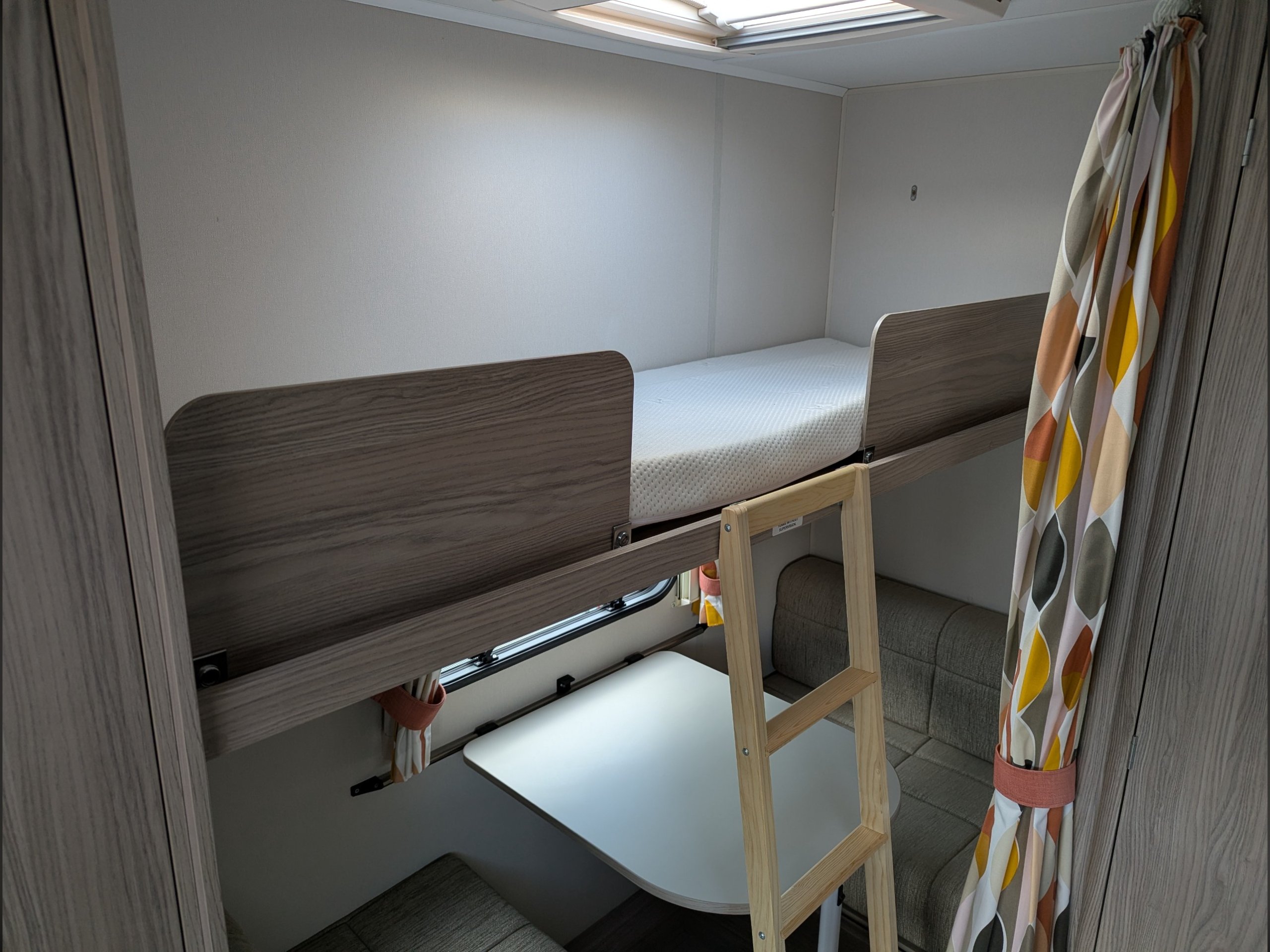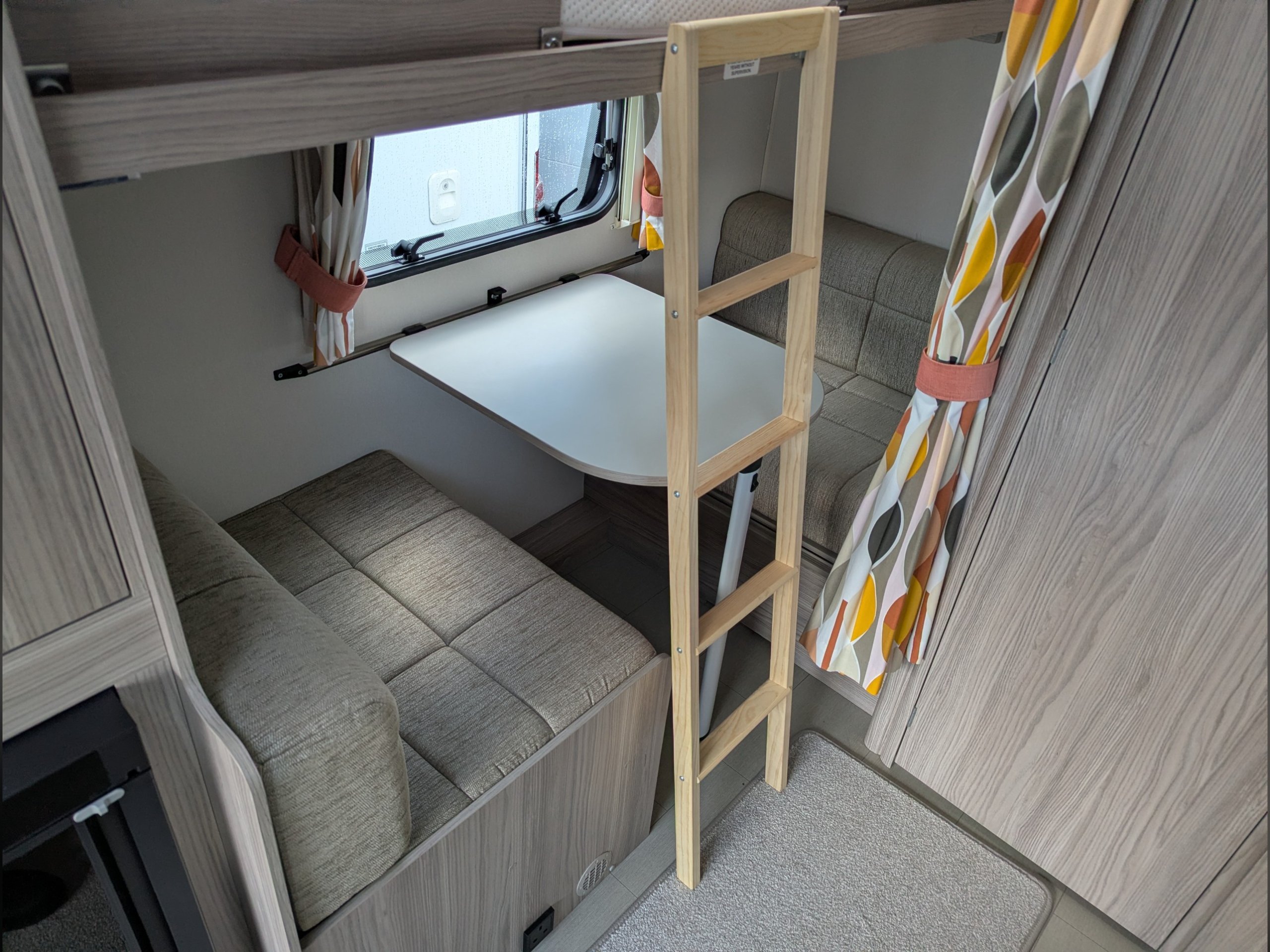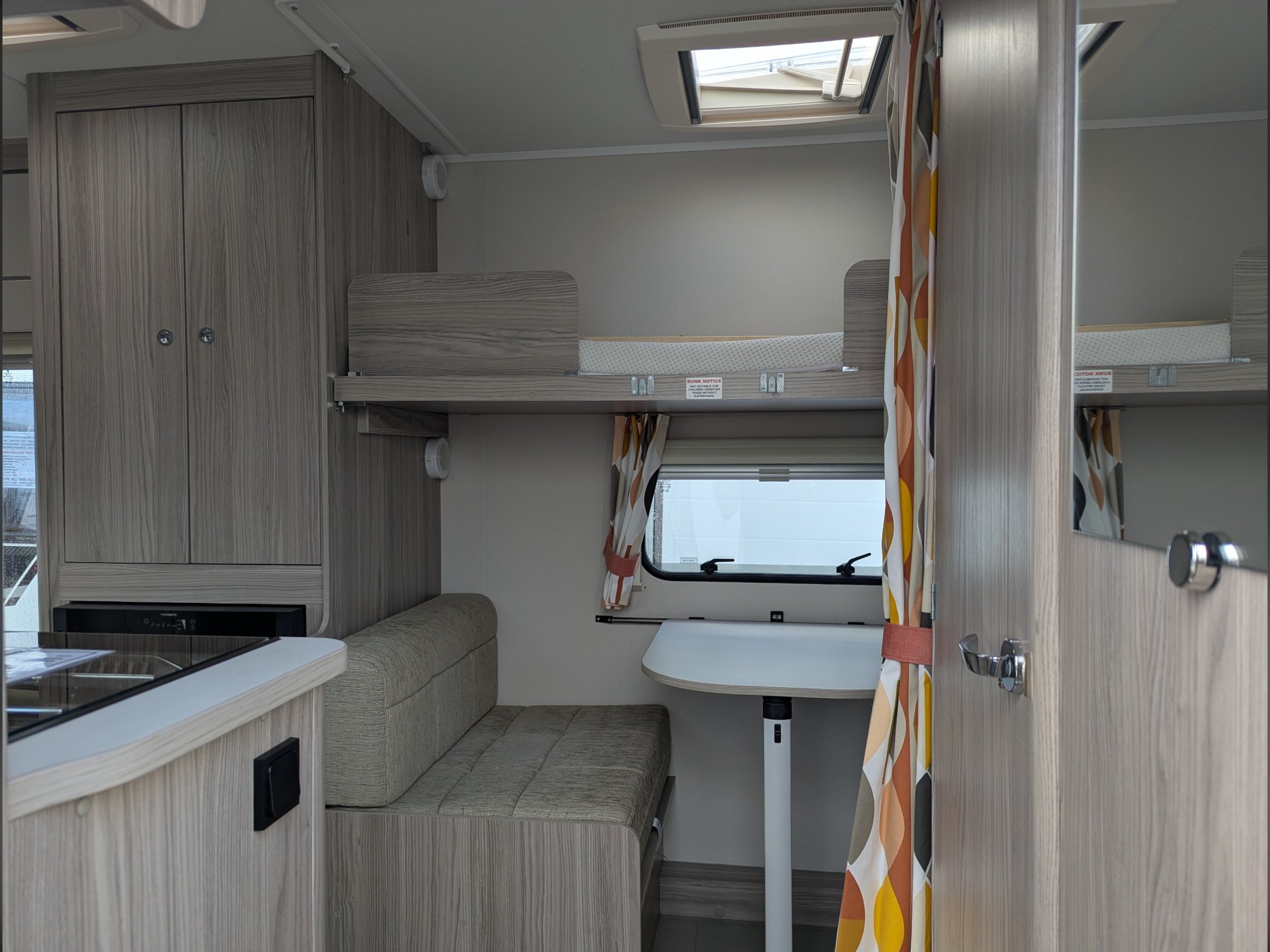 At the rear, there is a dinette area that converts into a single bed, and a bunk can be folded down above it to create two children's or smaller single beds.