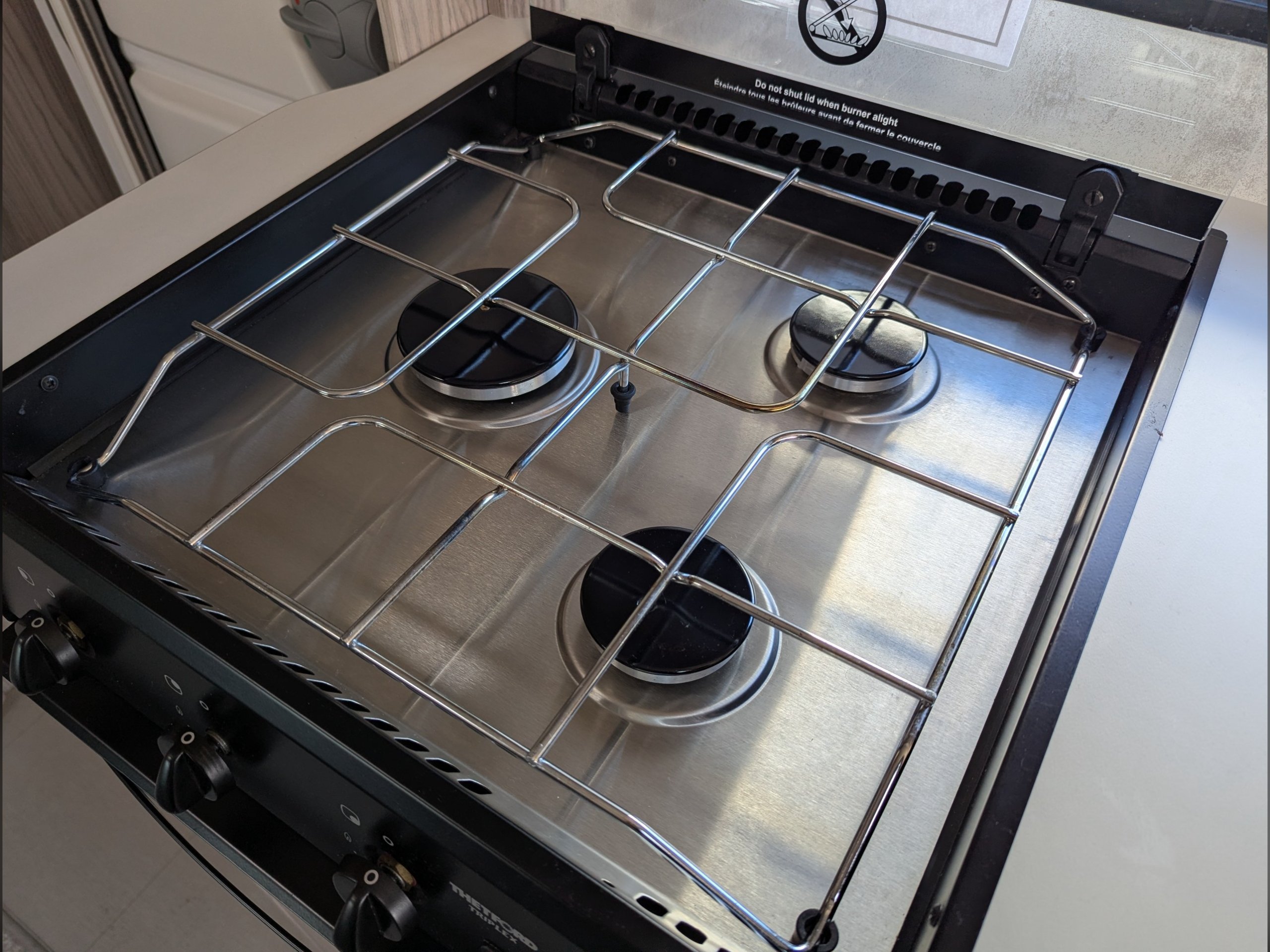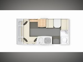 The layout also includes a corner washroom and a centre kitchen with a three-burner hob, grill, microwave, and a three-way fridge.