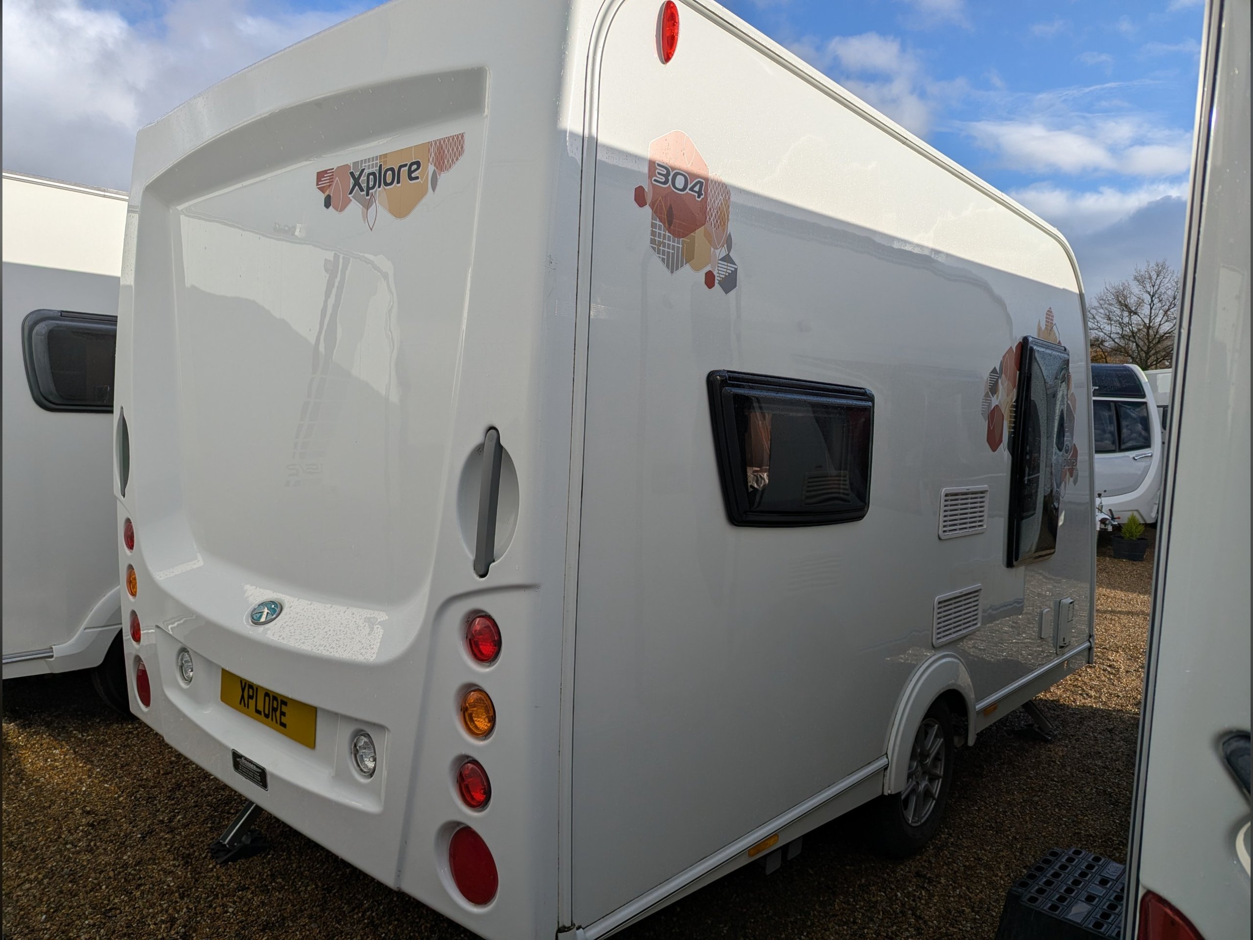 The 2023 Elddis Xplore 304 is a compact, four-berth caravan with an L-shaped lounge at the front that converts into a double bed.