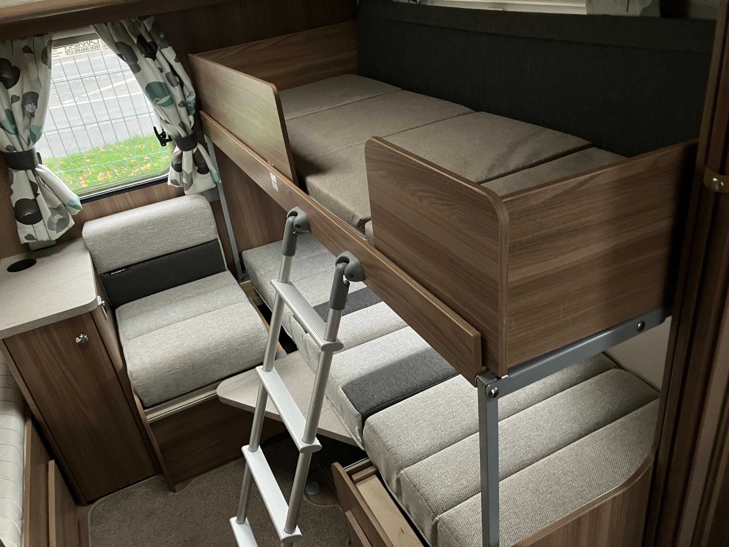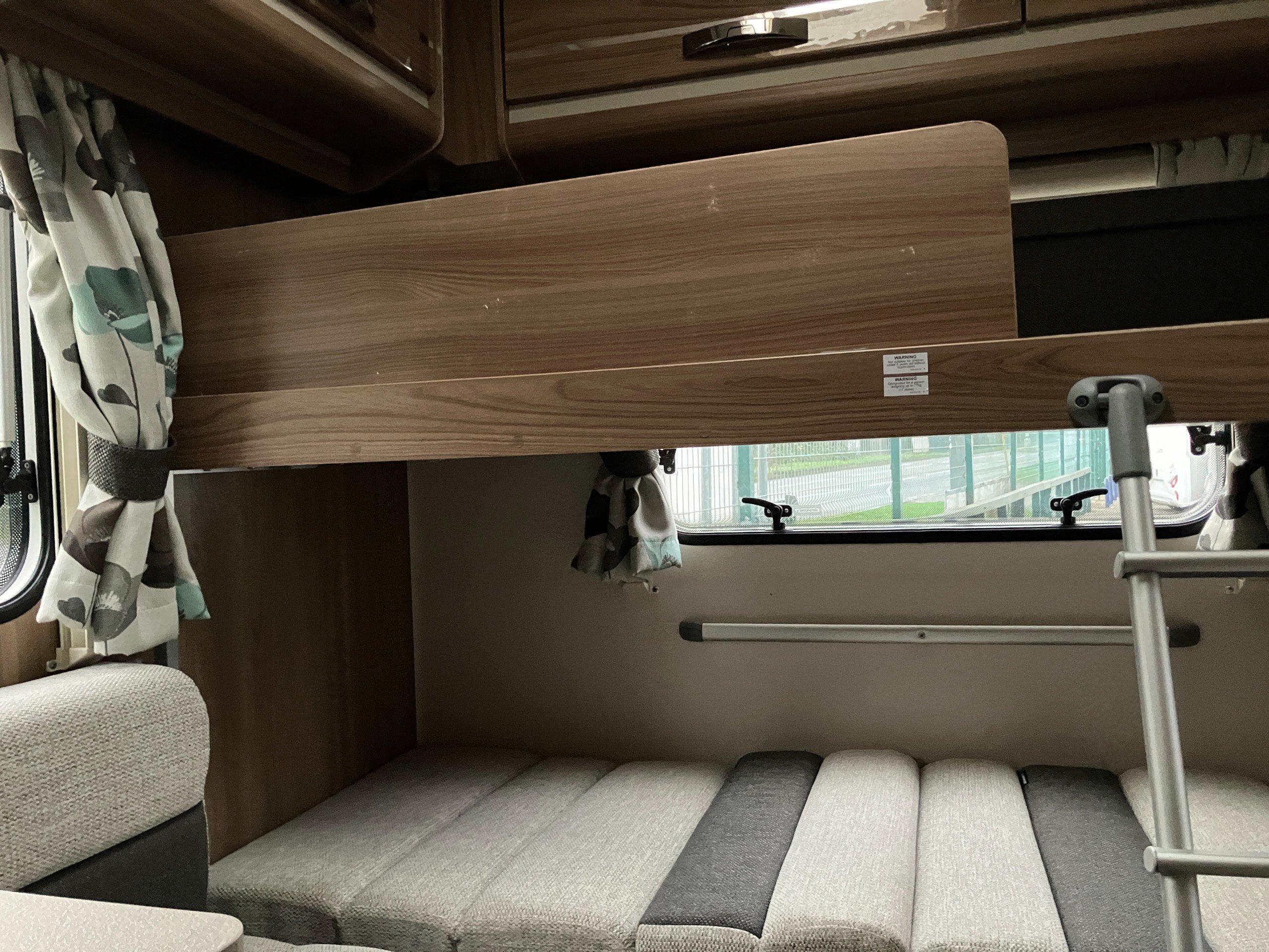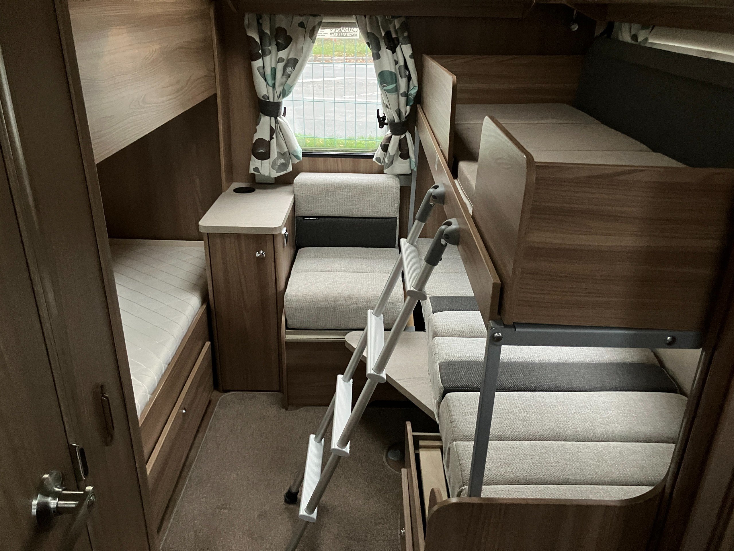 6 berth, lounge conversion, side washroom, end dinette with fixed bunk beds layout. Load margin: 176kg.