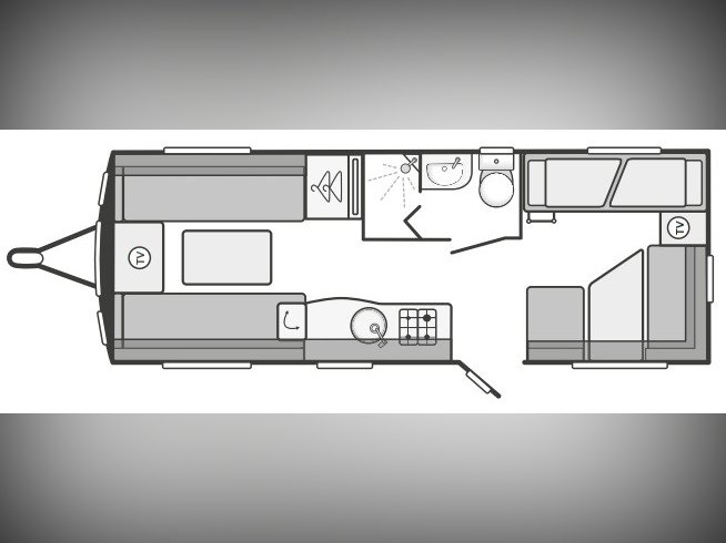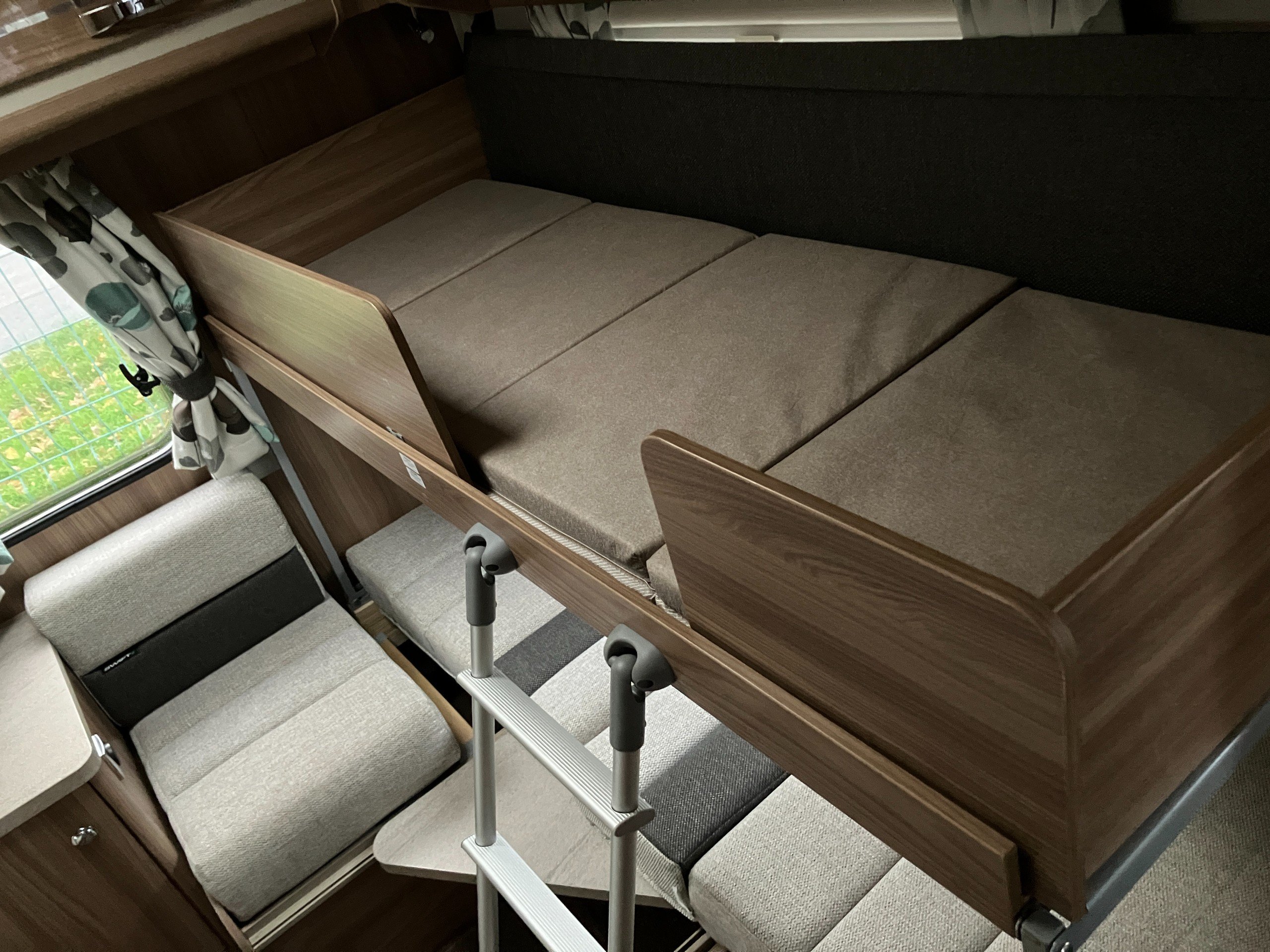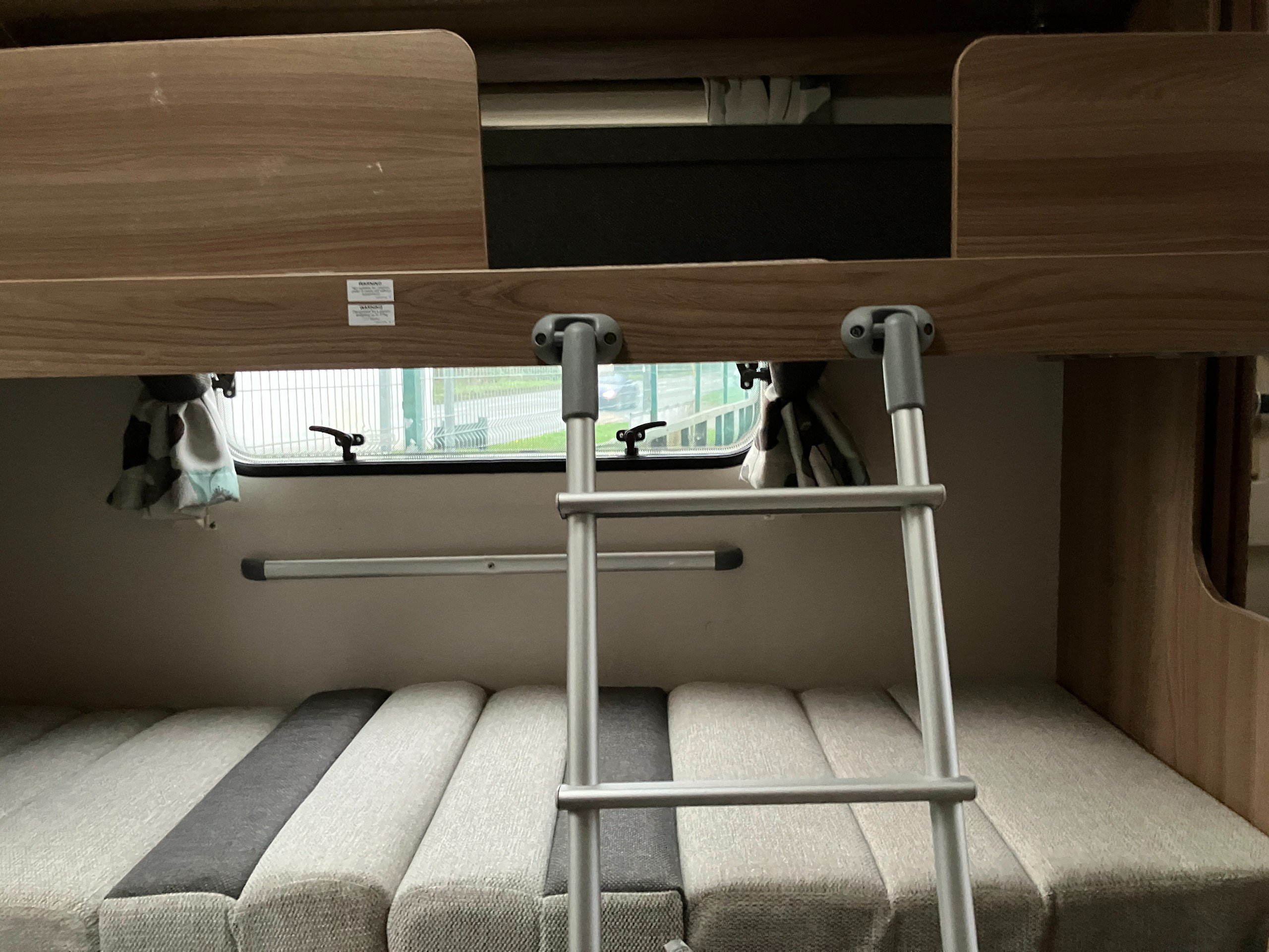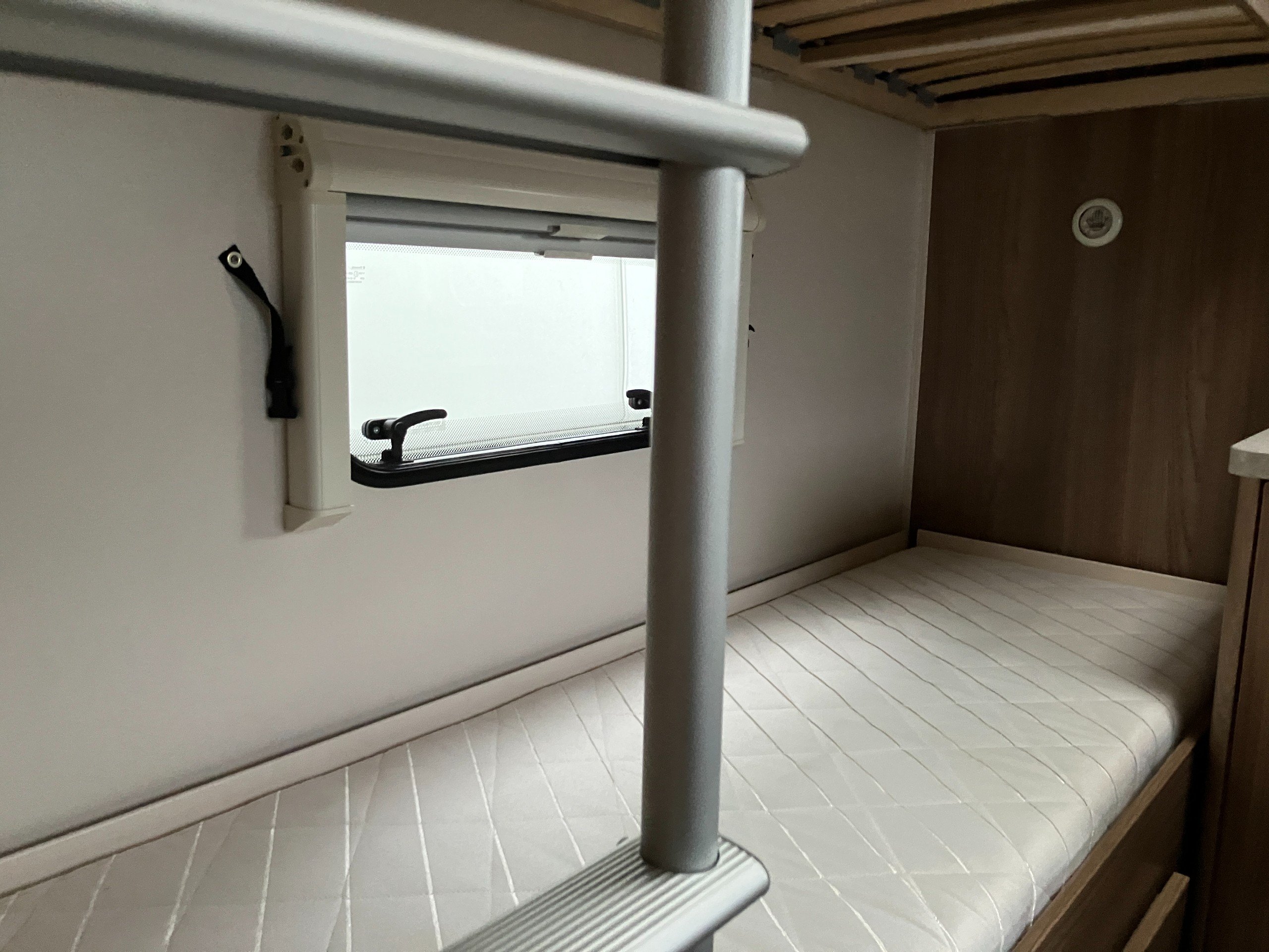 6 berth, lounge conversion, side washroom, end dinette with fixed bunk beds layout. Load margin: 176kg.