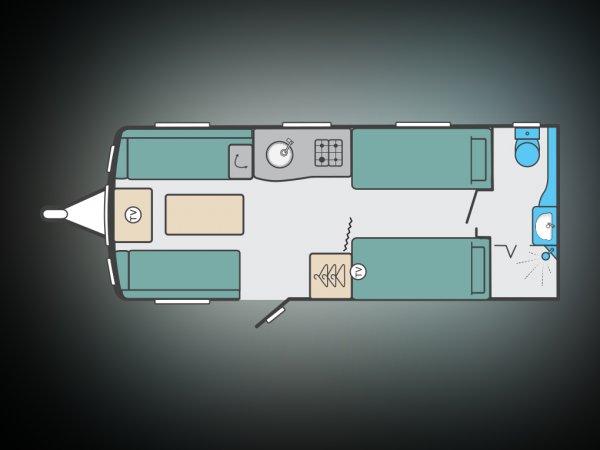 4 berth, fixed single beds, rear washroom. Load margin: 205kg. A great couple's layout, which can also accomodate a small family. Includes fitted Powrtouch auto motor mover, Solar Panel & Alde heating.