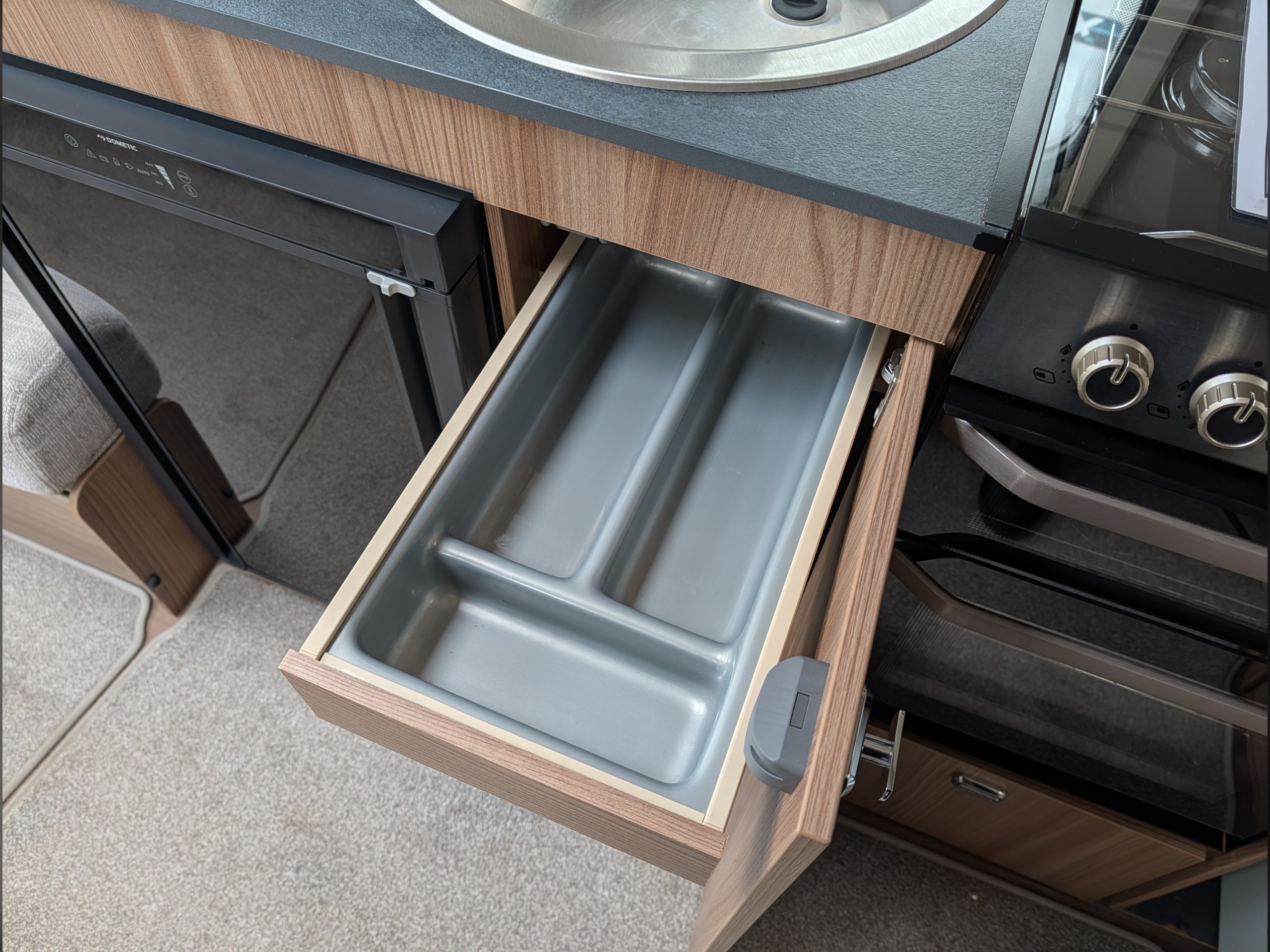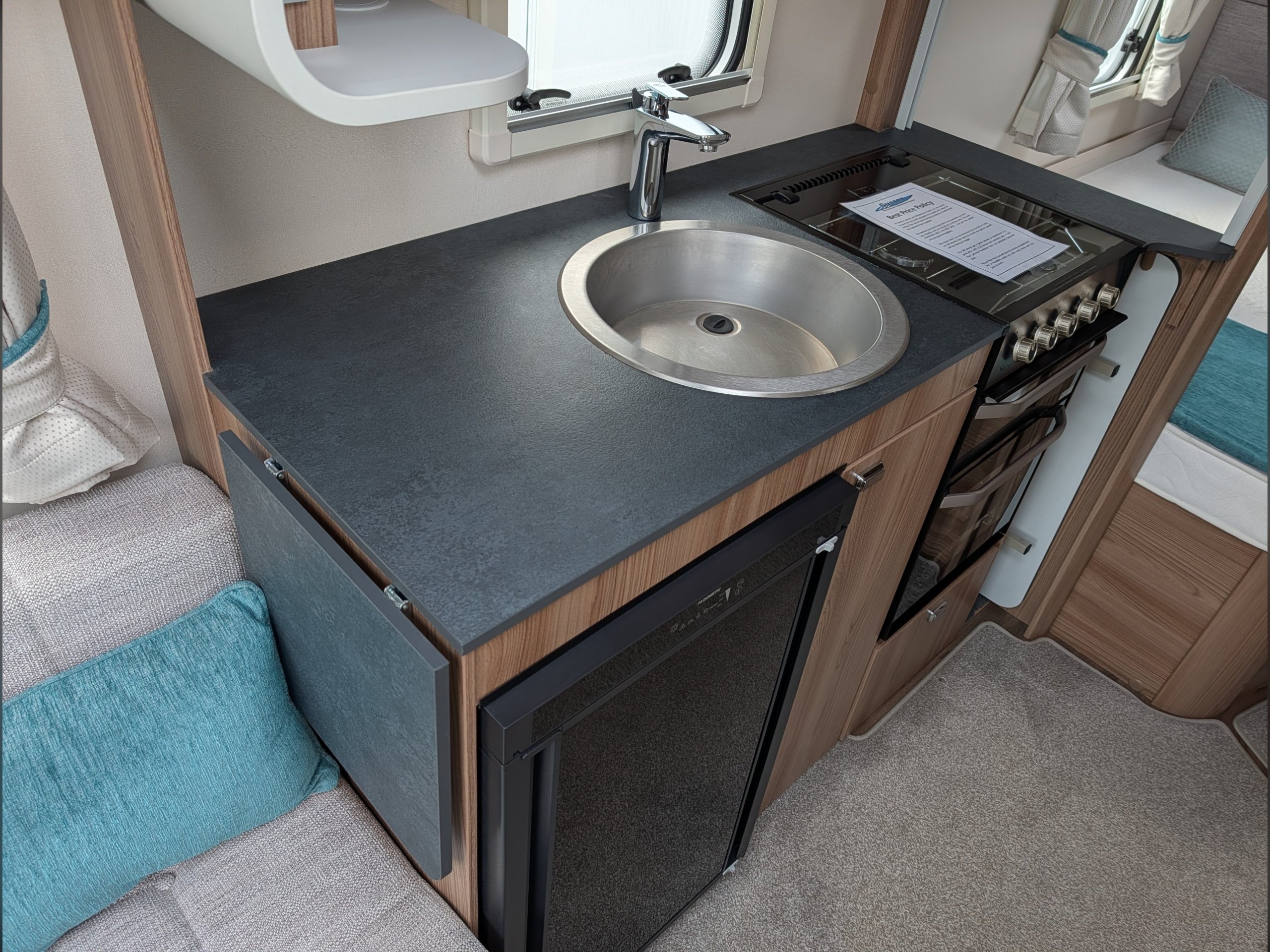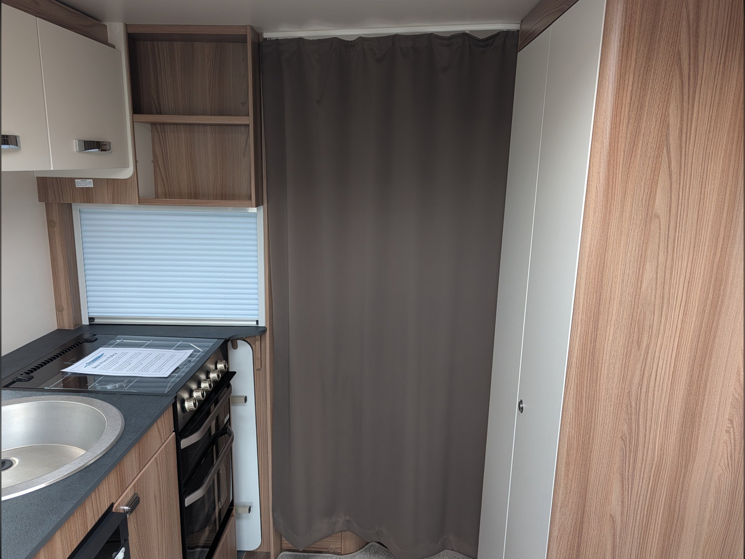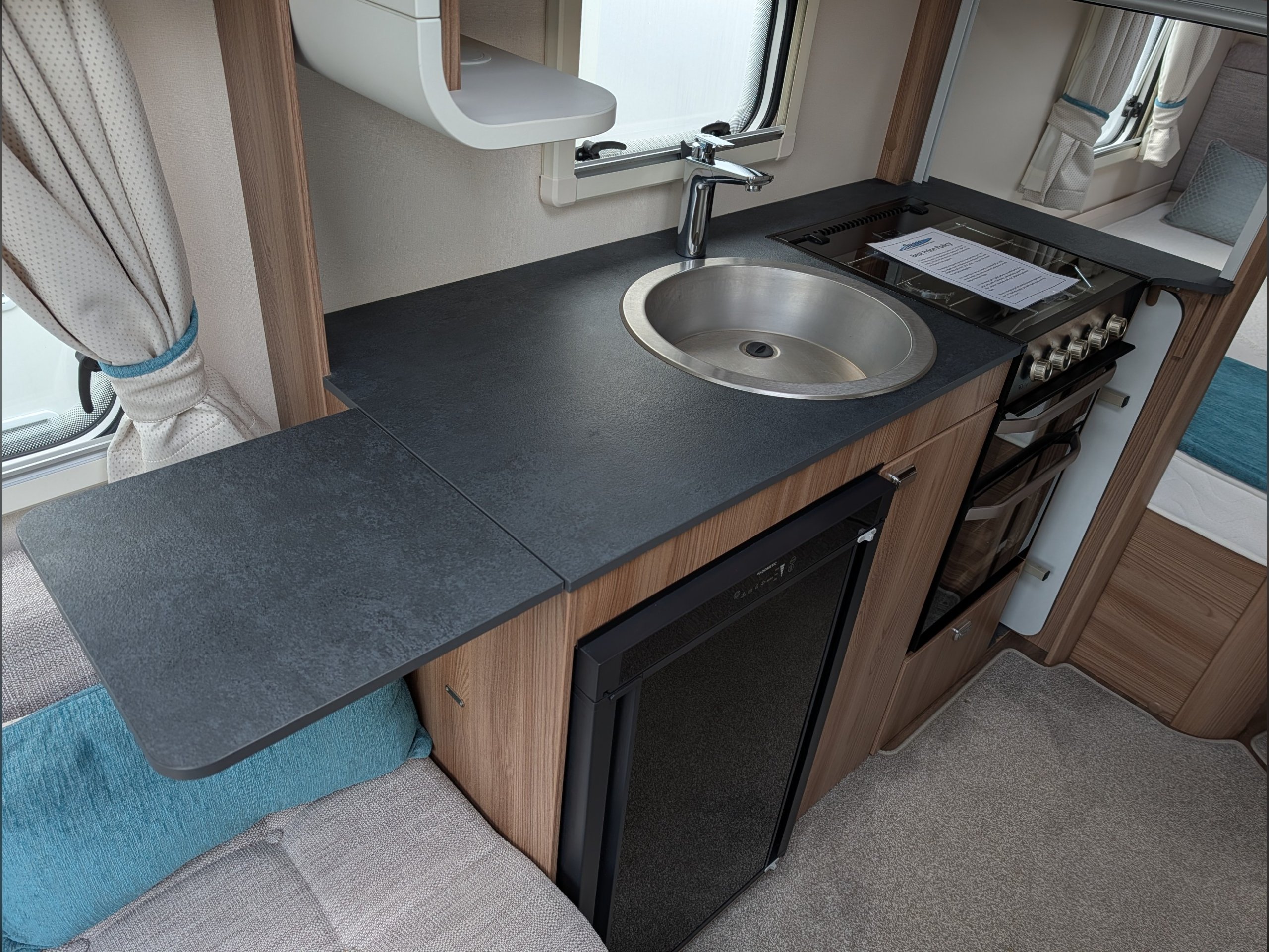 It includes a microwave, hob, oven, grill, and a Dometic fridge.