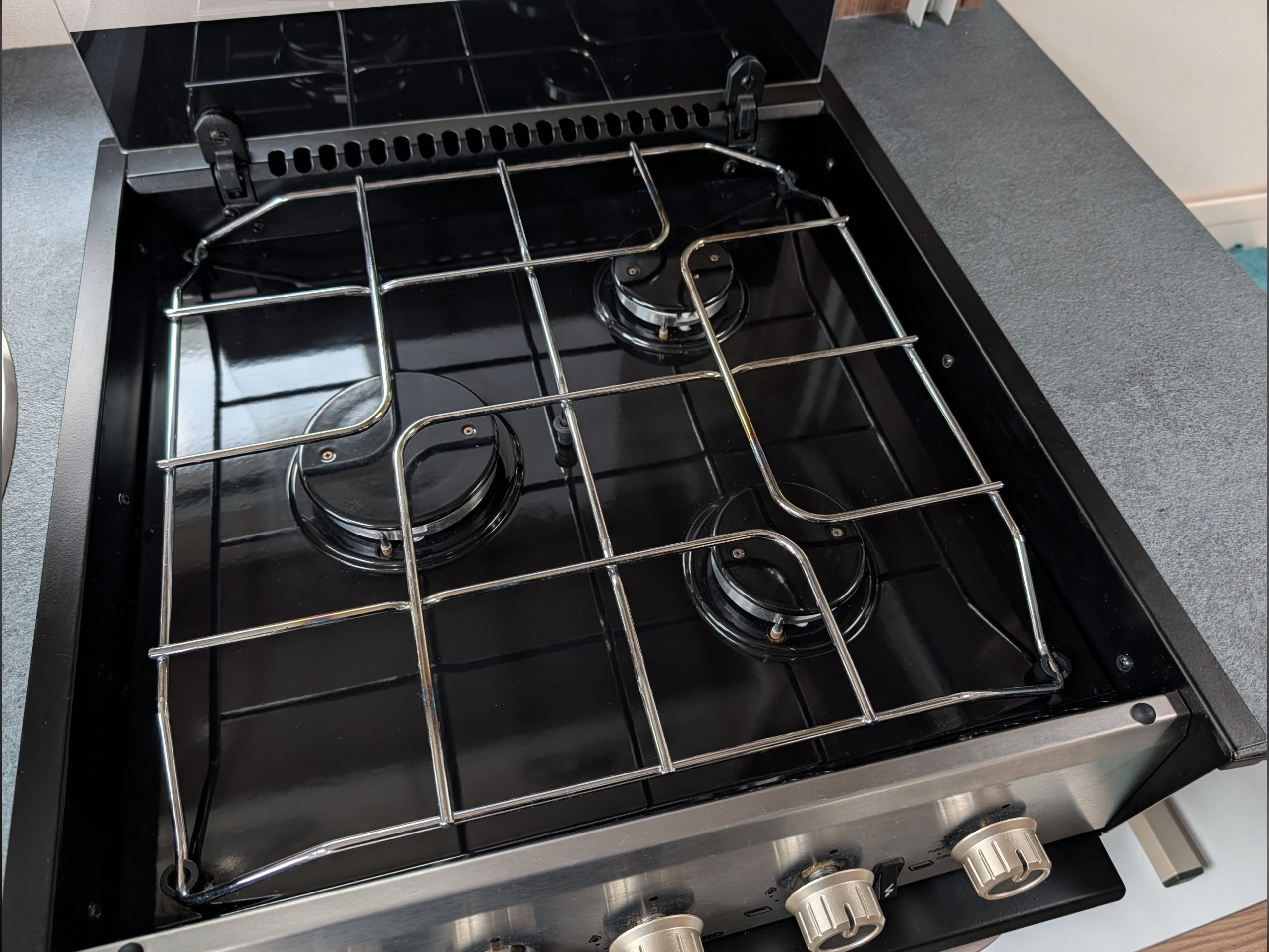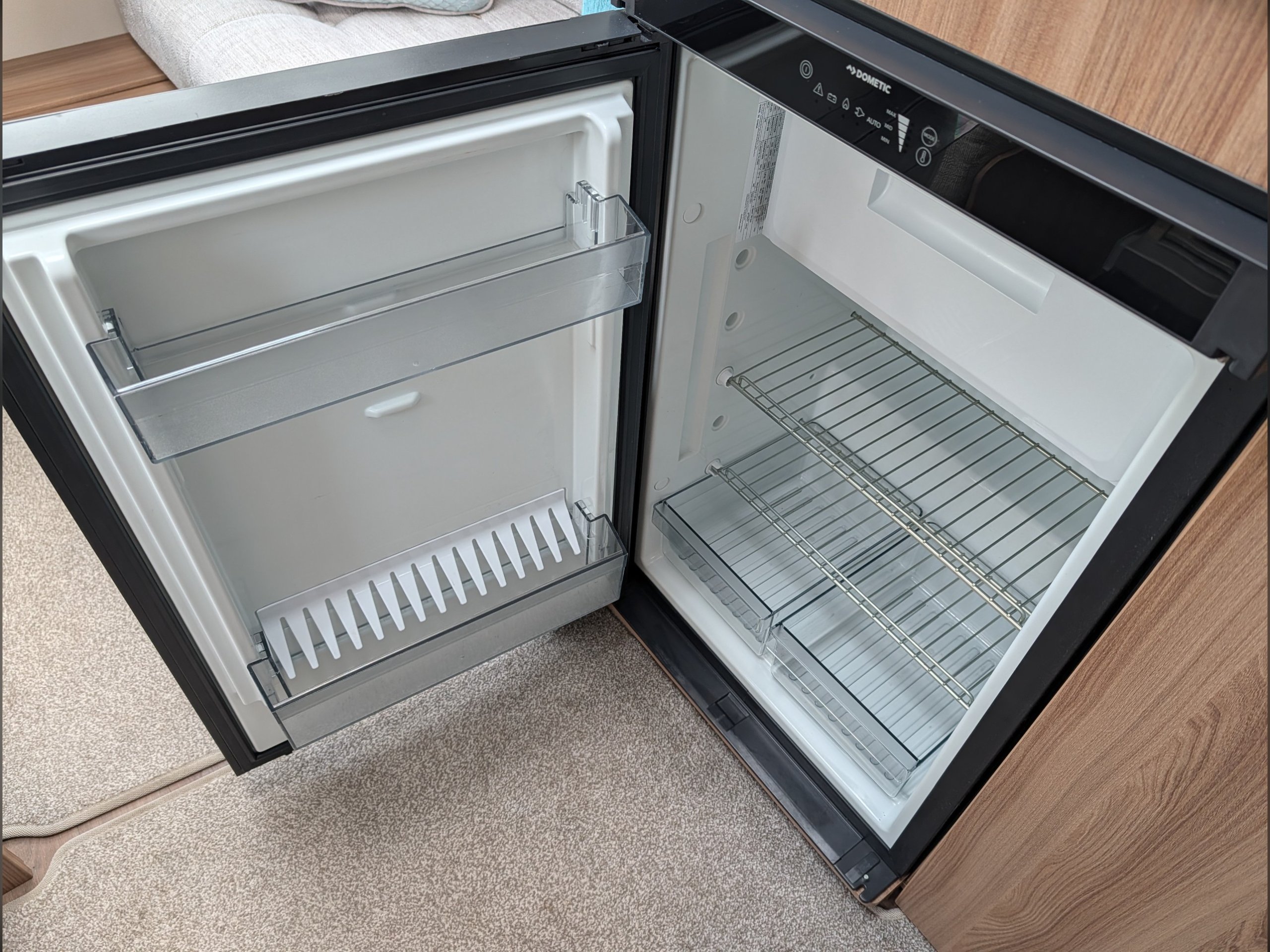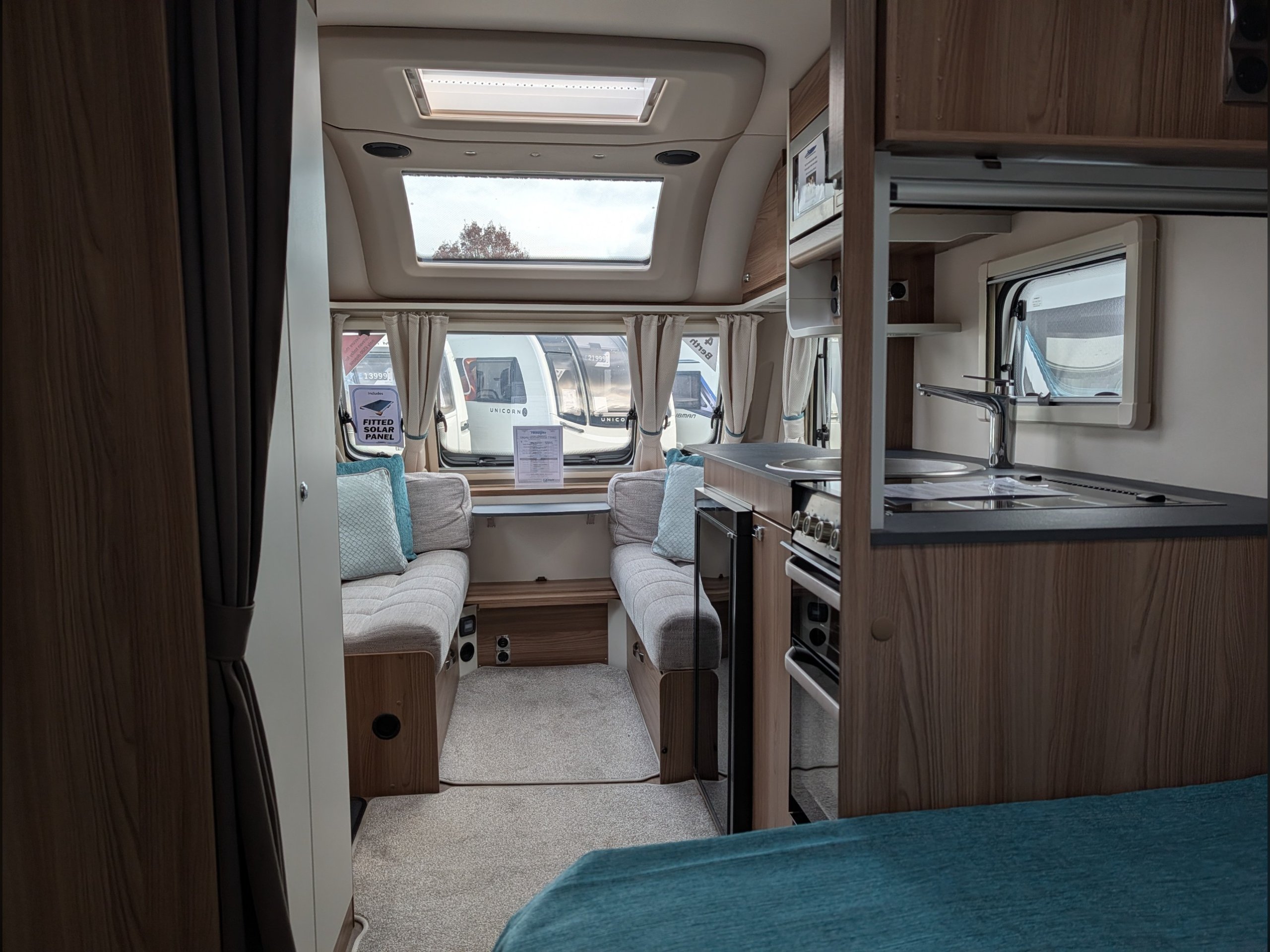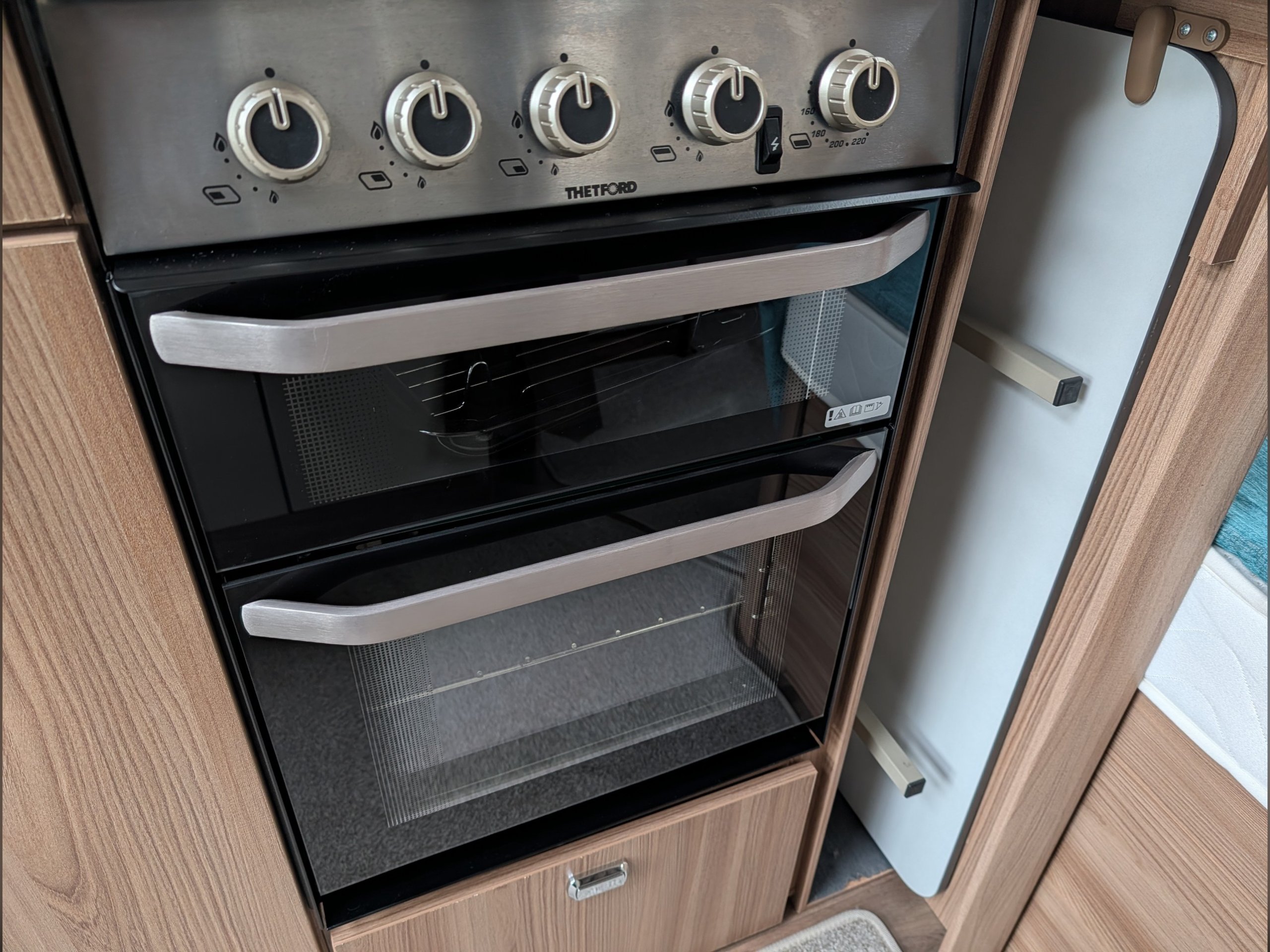 It includes a microwave, hob, oven, grill, and a Dometic fridge.