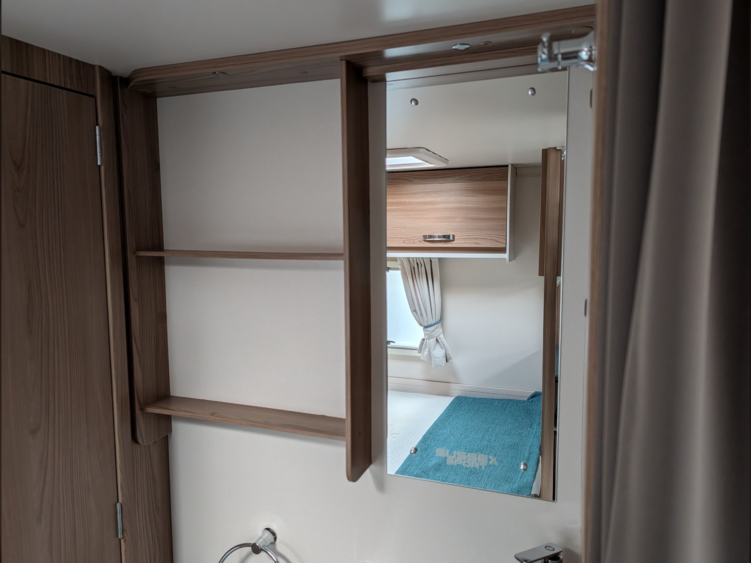 The rear section features a double bed with a toilet/shower room and a wash basin with vanity unit.
