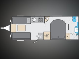 4 berth, single axle, transverse island bed layout with rear washroom.