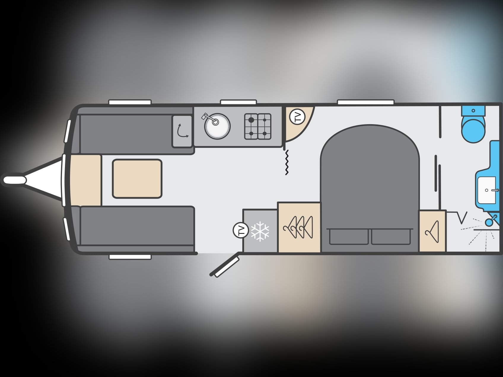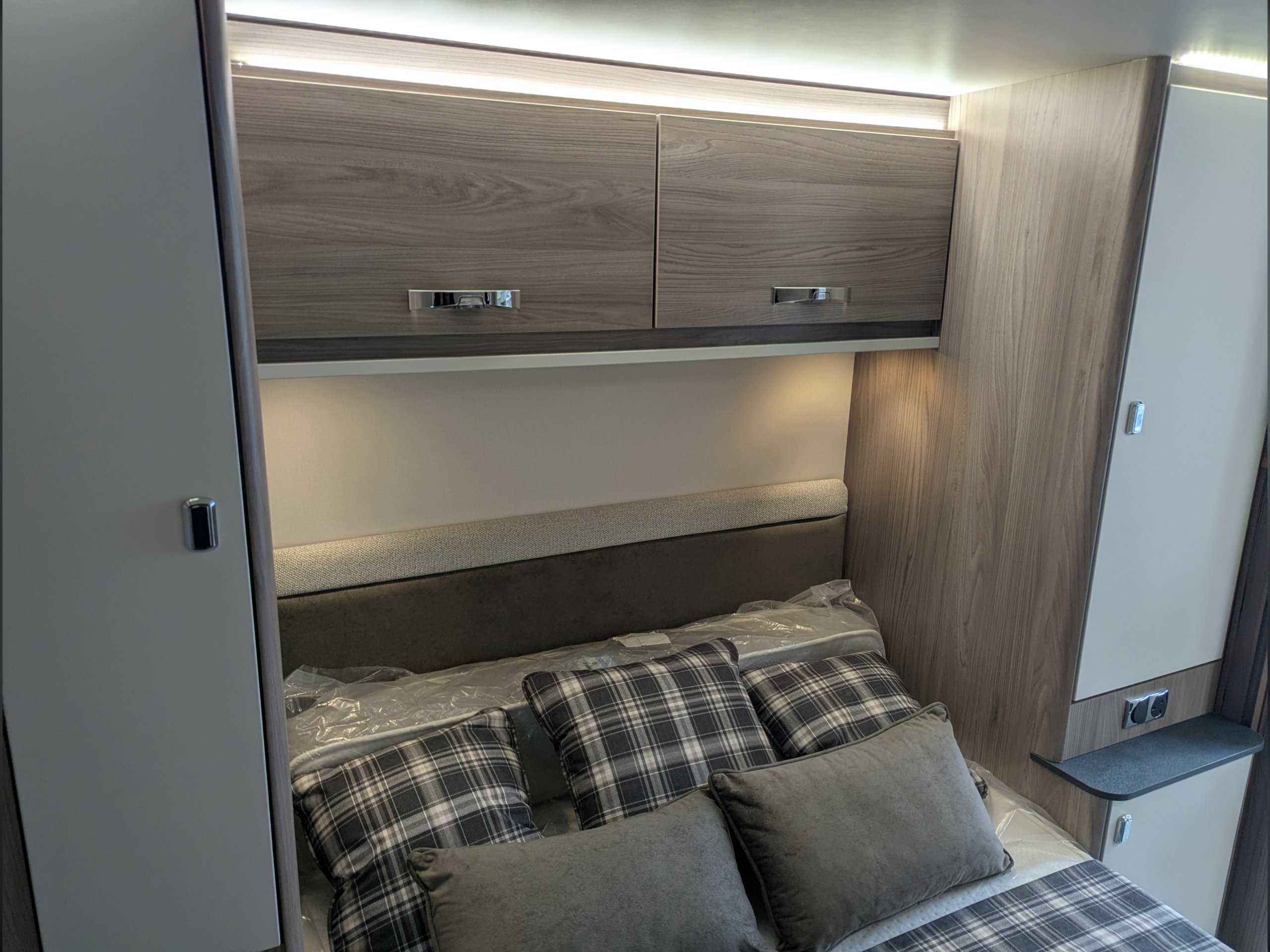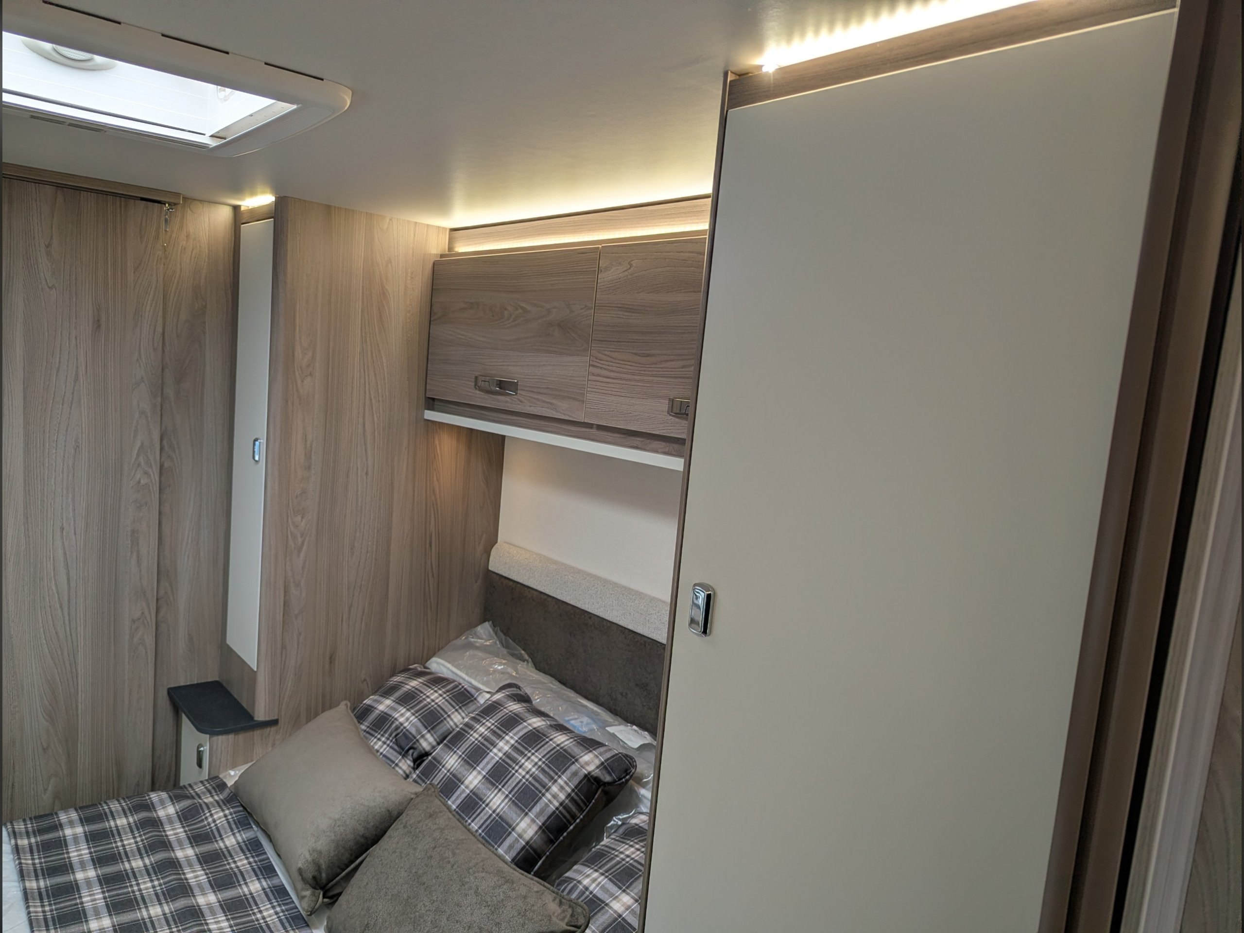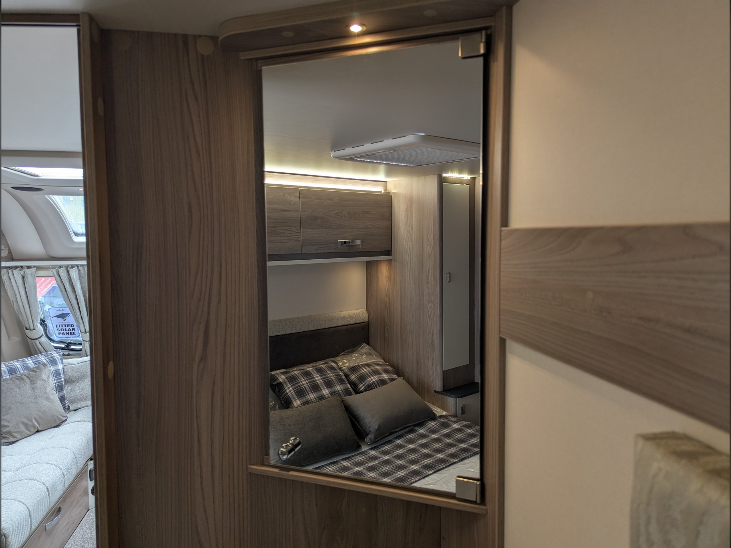 4 berth, single axle, transverse island bed layout with rear washroom.