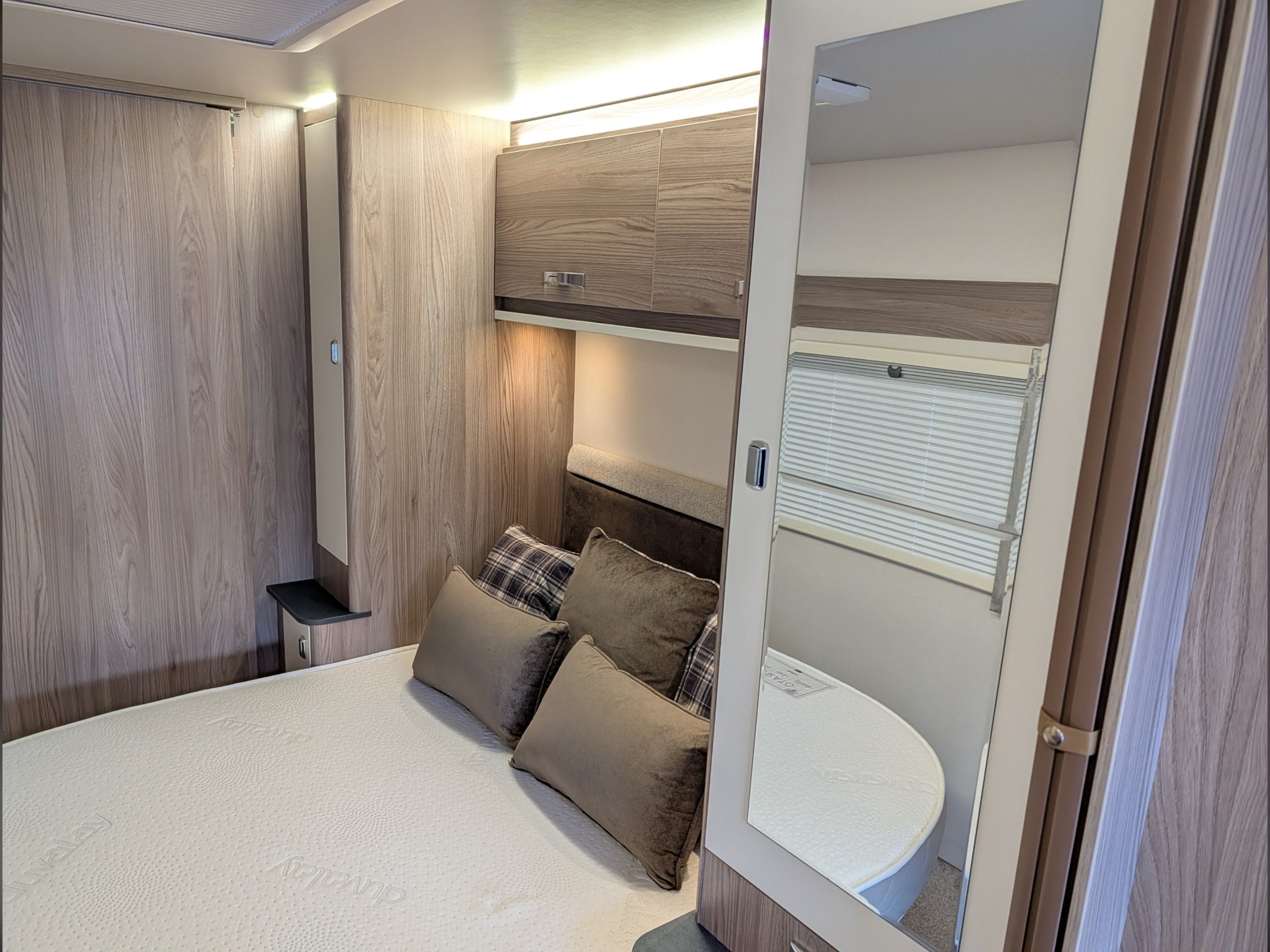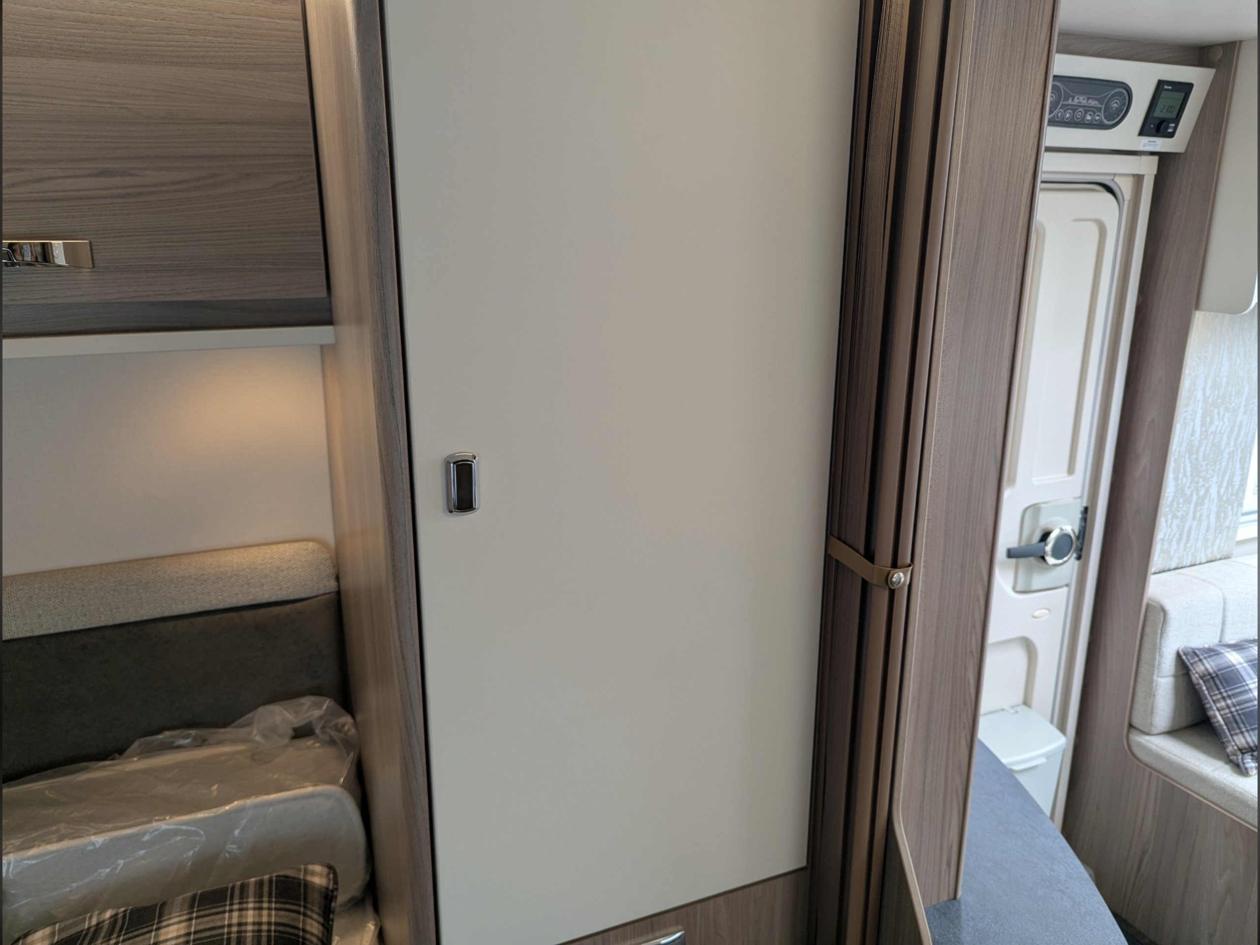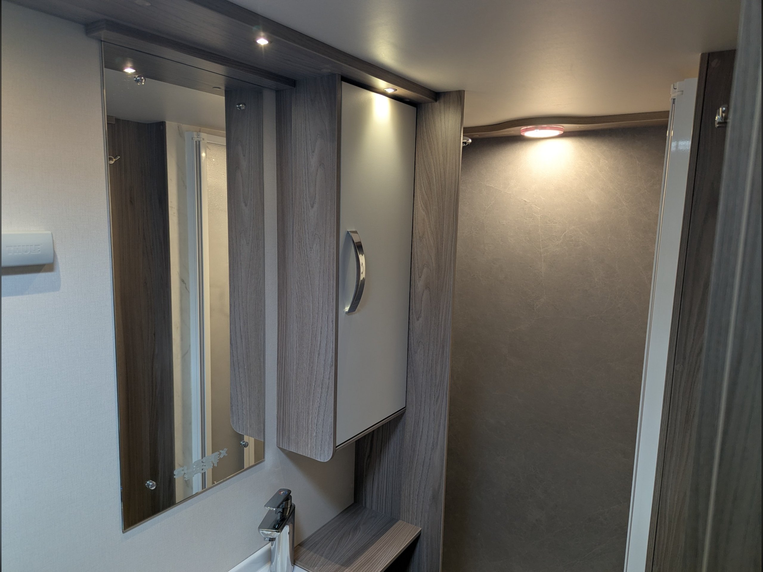 4 berth, single axle, transverse island bed layout with rear washroom.