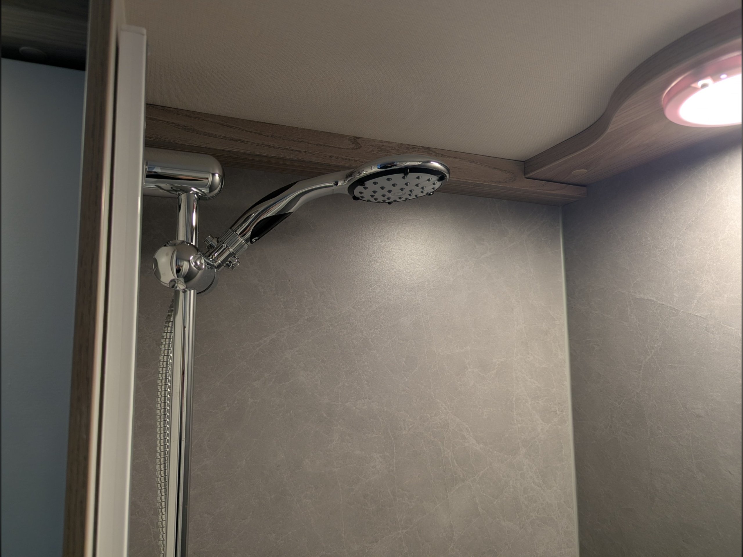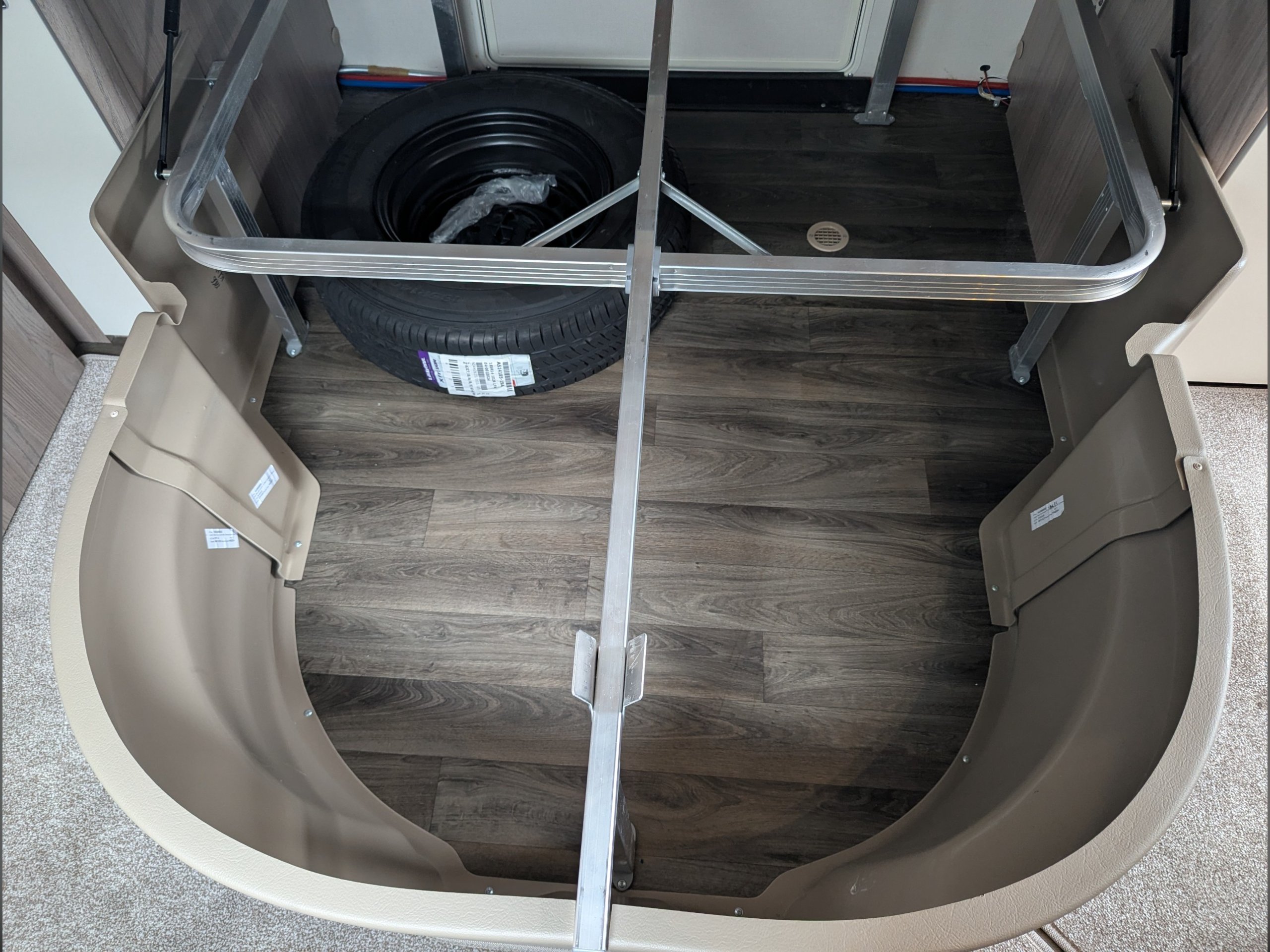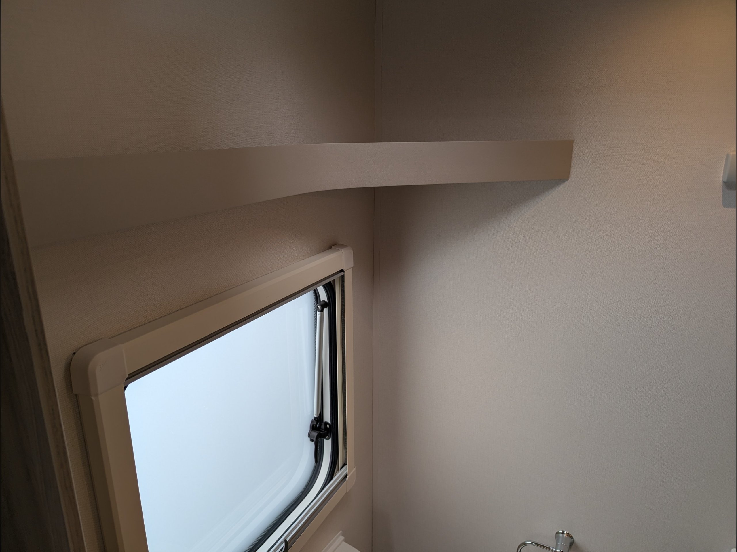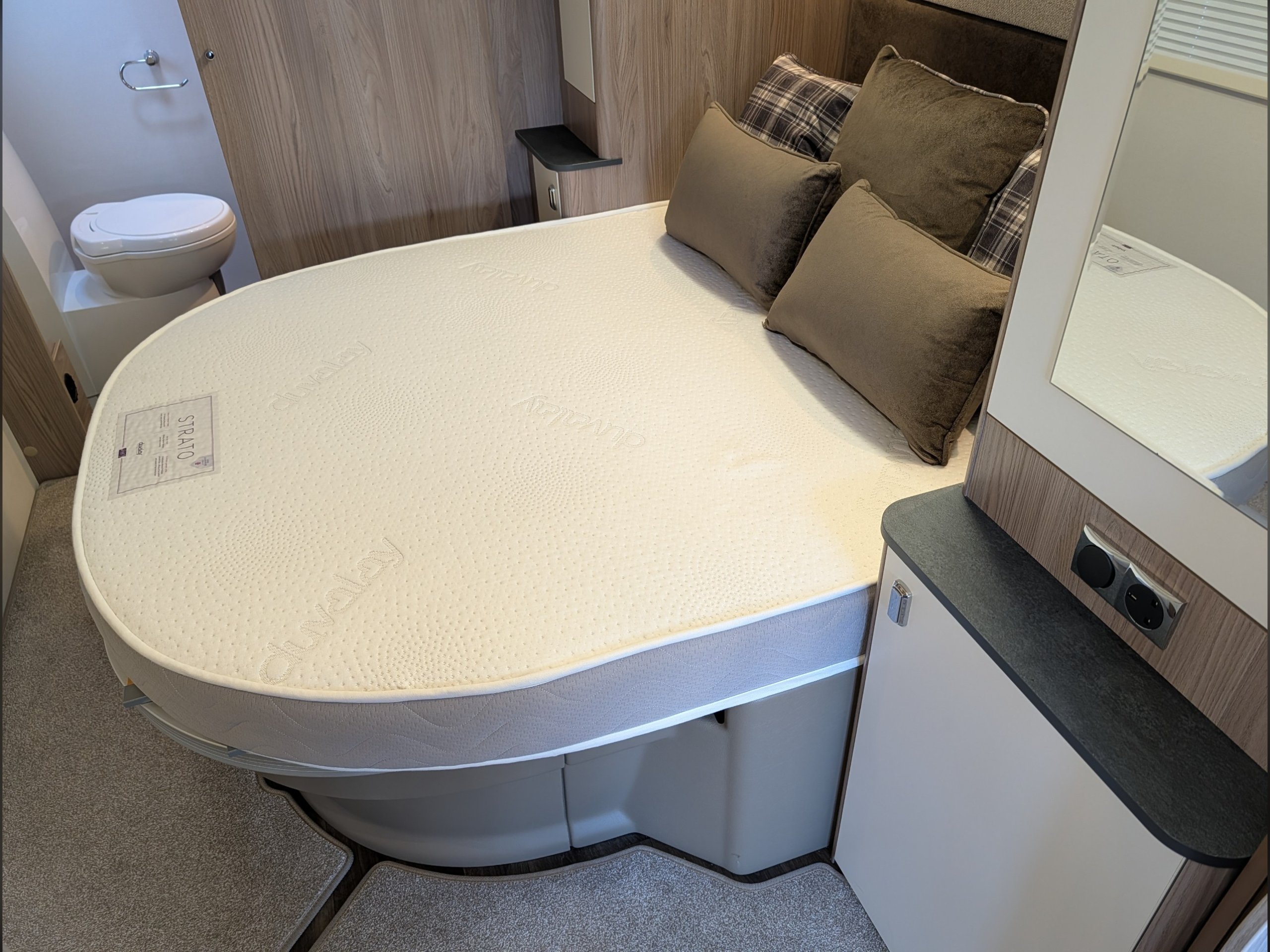 4 berth, single axle, transverse island bed layout with rear washroom.